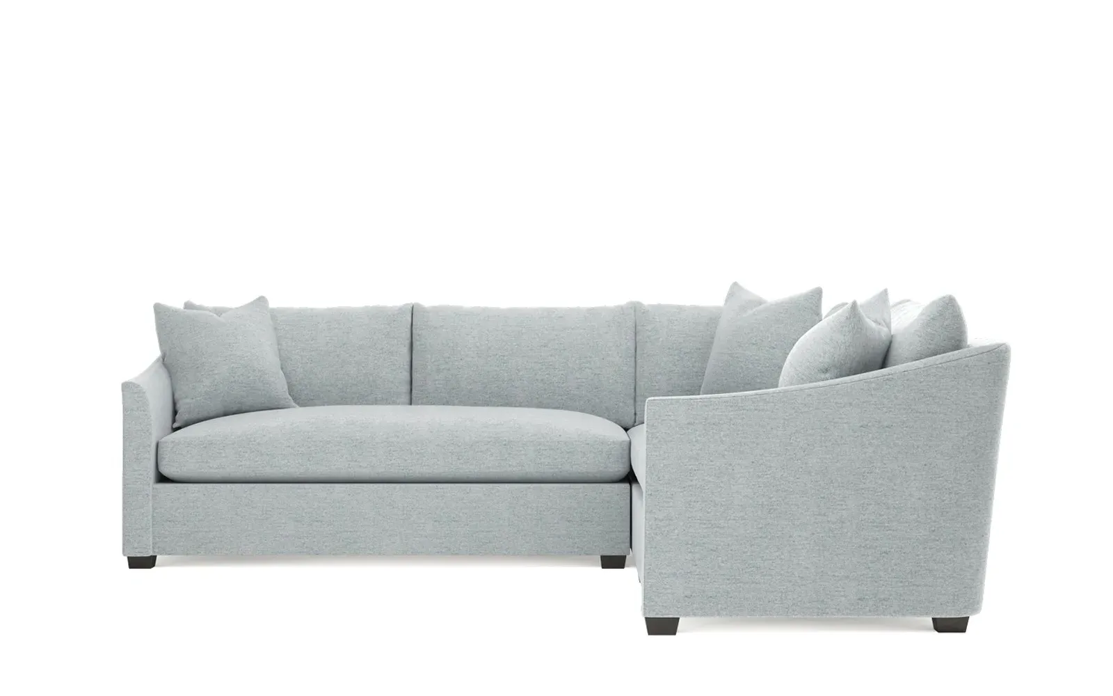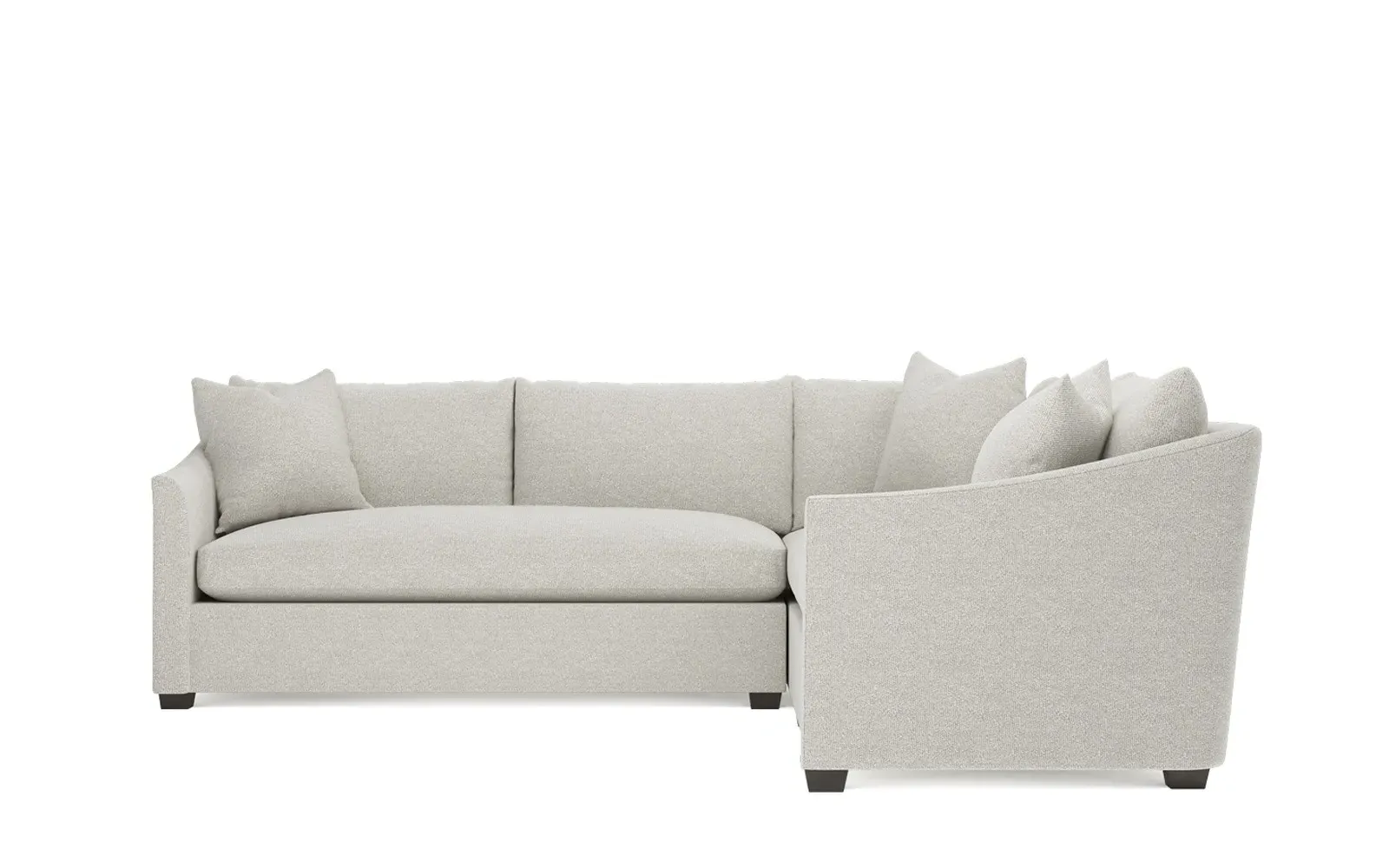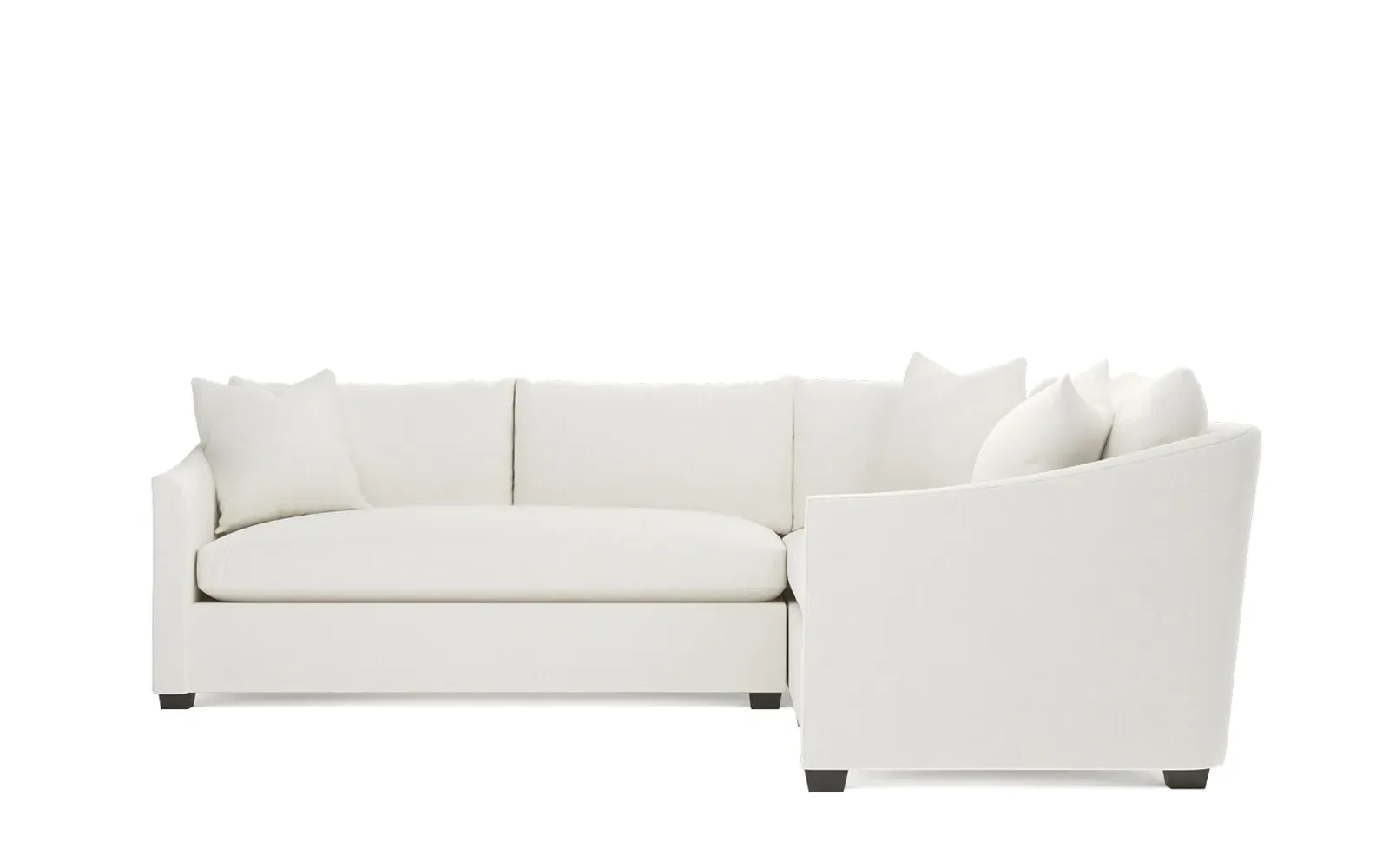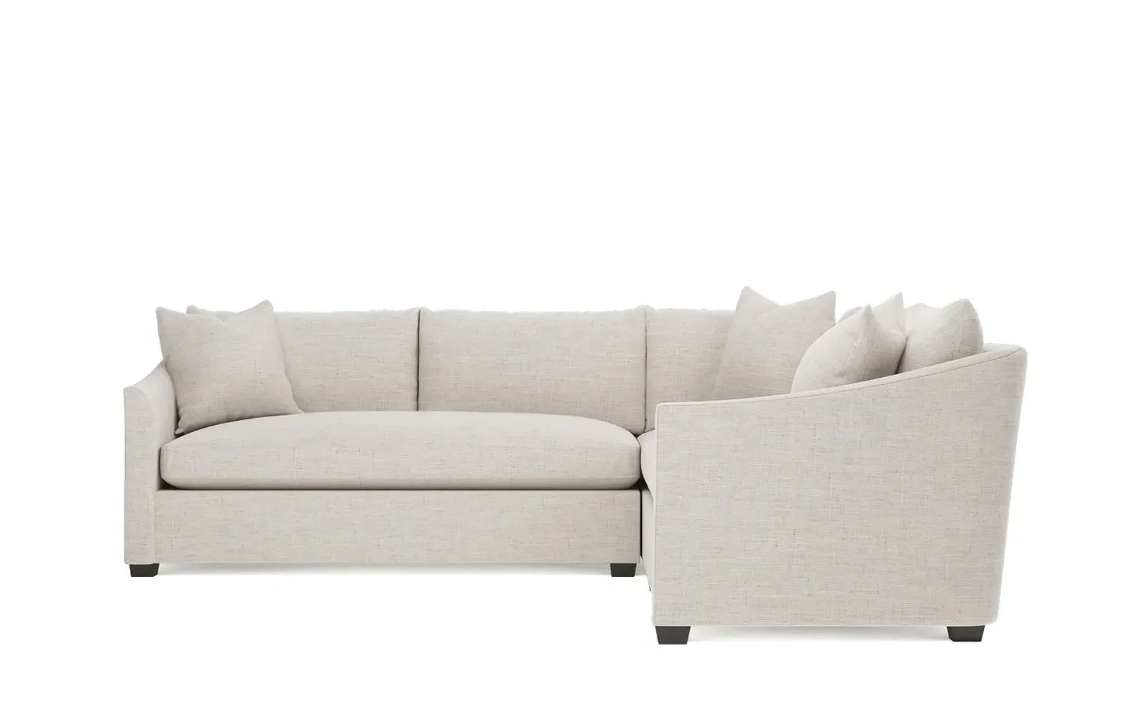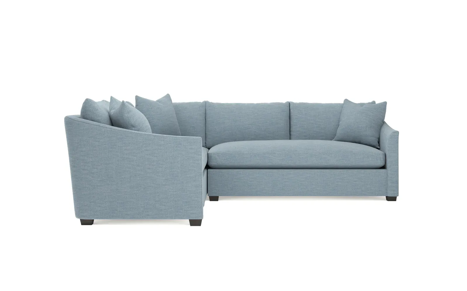 The left 105” Clairmont corner sectional is understated and comfortable, with a generous form perfect for any family room or great room. Set atop tapered wood legs, the inviting silhouette includes softly sloped arms, gently curved back corners, and cozy throw pillows. Soft yet supportive with a slightly firm sit, the low-maintenance seat cushions feature a foam core surrounded by plush fiber fill. Choose from a variety of upholstery options, including linen, velvet, and performance fabrics. <b>Overall Dimensions:</b> 105" W x 104" D x 36" H. <b>End Sofa Dimensions:</b> 66” W x 39” D x 36" H; <b>End Sofa with Corner Dimensions:</b> 104” W x 39” D x 36" H; <b>Seat Dimensions:</b> 24” D x 22” H; <b>Arm Height:</b> 28”; <b>Leg Height:</b> 2”. <b>Materials:</b> FSC®-certified, US-sourced, formaldehyde-free solid kiln-dried hardwood and furniture-grade laminates. <b>Material Finish:</b> Espresso legs. <b>Pieces Included:</b> Left end sofa, right end sofa with corner.