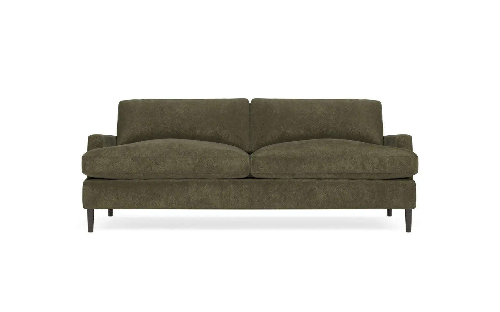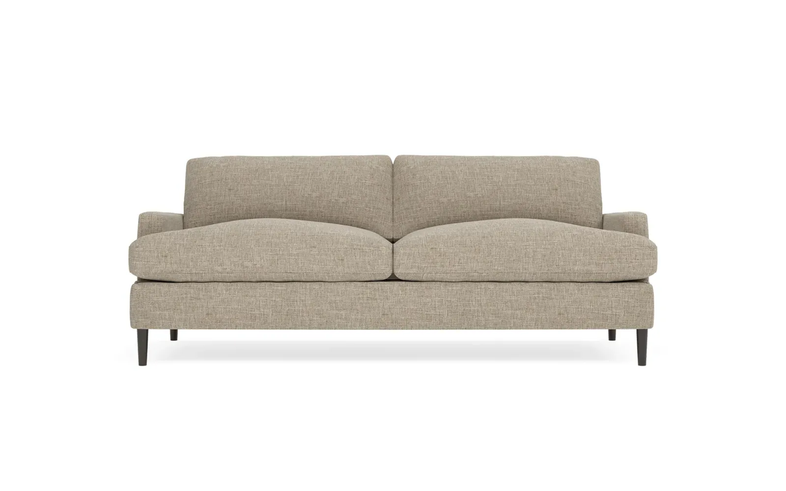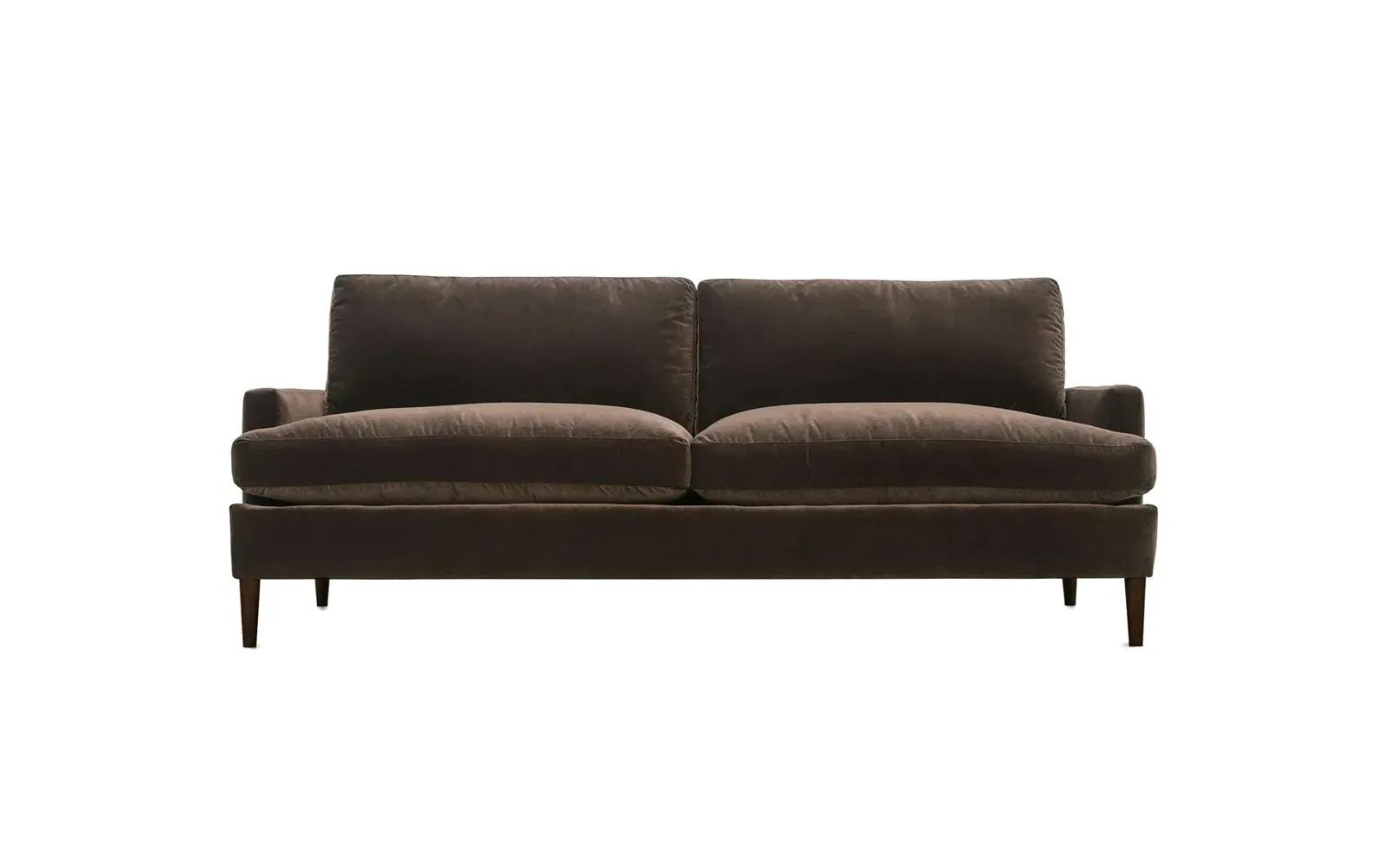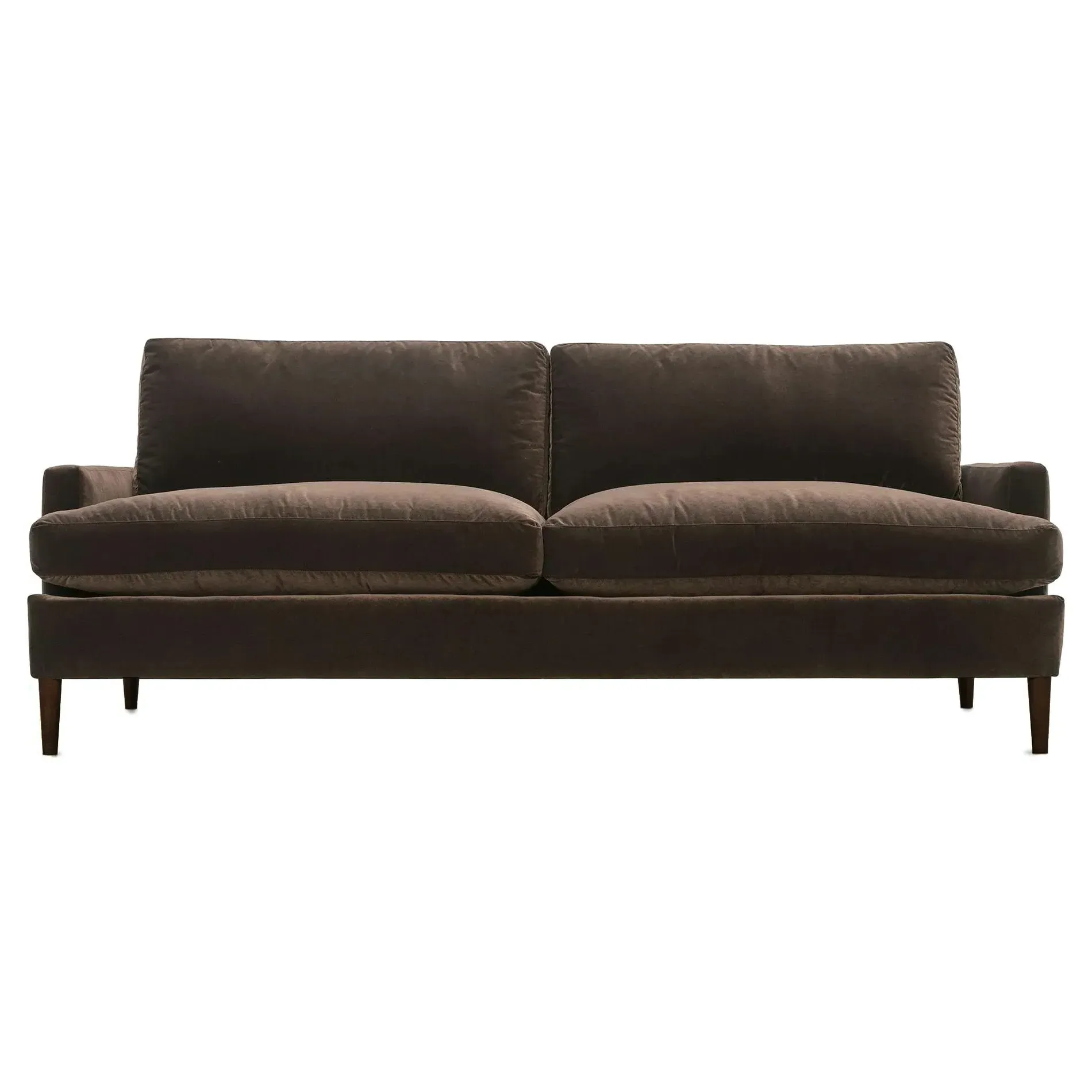 The 86" Claudie sofa draws inspiration from mid-century modern style, with clean lines and low track arms. Its tapered wood legs are slightly taller in the front, giving the frame a gentle upward stance. Soft yet supportive, the seat cushions are designed for supreme comfort, with a foam core surrounded by a blend of fiber, down, and feather fill. Choose from a variety of upholstery options, including linen, velvet, and performance fabrics. <b>Overall Dimensions:</b> 86" W x 41" D x 36" H. <b>Seat Dimensions:</b> 25” D x 23” H; <b>Distance Between Arms:</b> 77”; <b>Arm Height:</b> 24”; <b>Rear Leg Height:</b> 5 ¾”; <b>Front Leg Height:</b> 6 ¾”. <b>Materials:</b> FSC®-certified, US-sourced, formaldehyde-free solid kiln-dried hardwood and furniture-grade laminates. <b>Material Finish:</b> Espresso. <b>Cushion Fill:</b> A CertiPUR-US® certified, high-resiliency foam core wrapped with a super soft foam layer then inserted into a channel-quilted casing filled with a blend of 50% fiber, 5% down, and 45% feather.