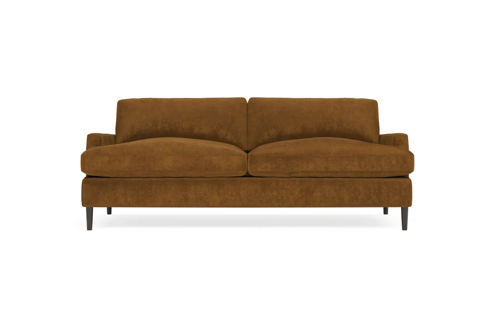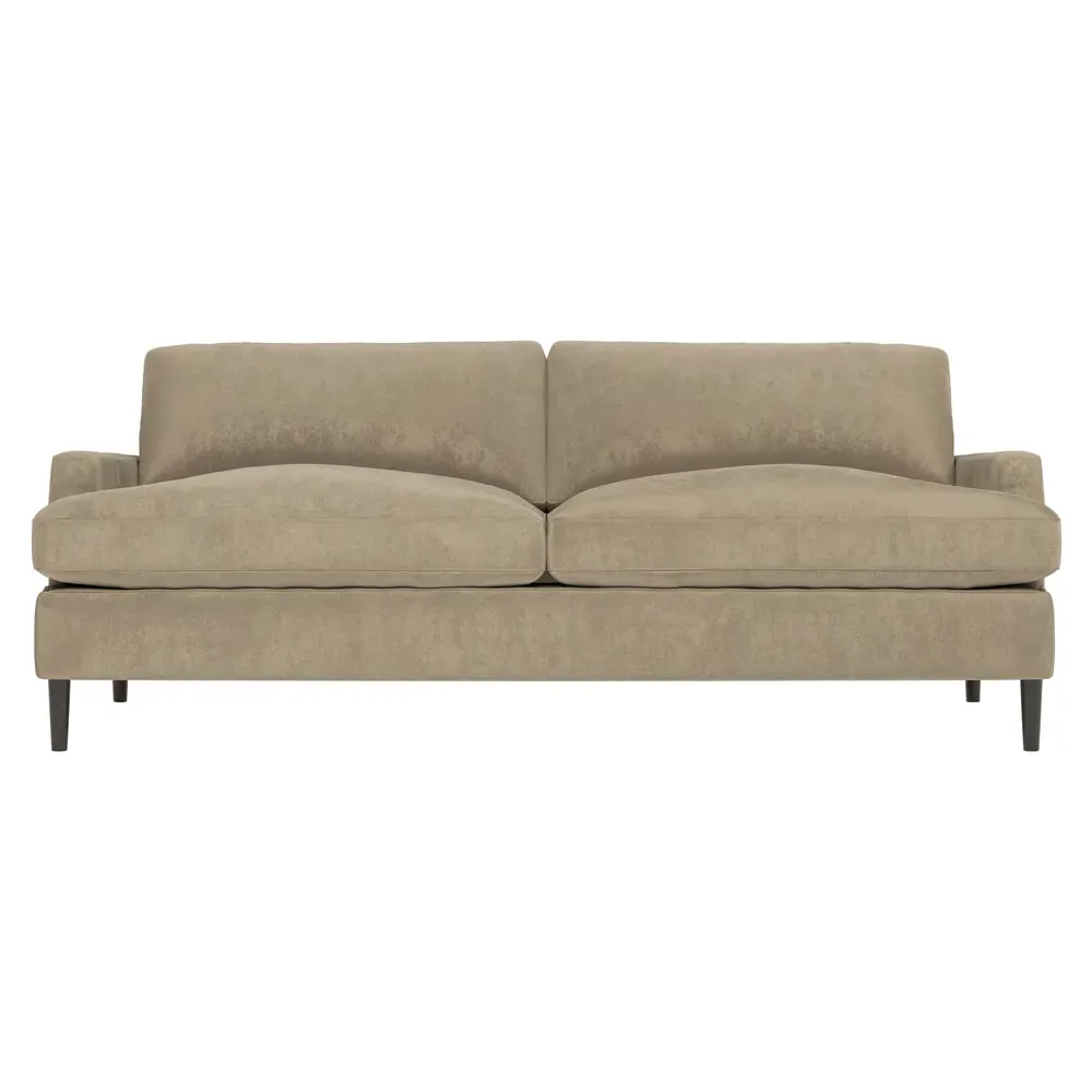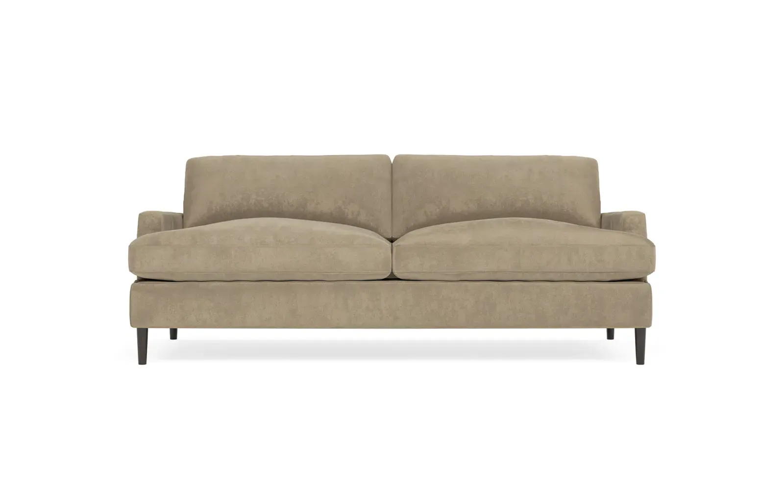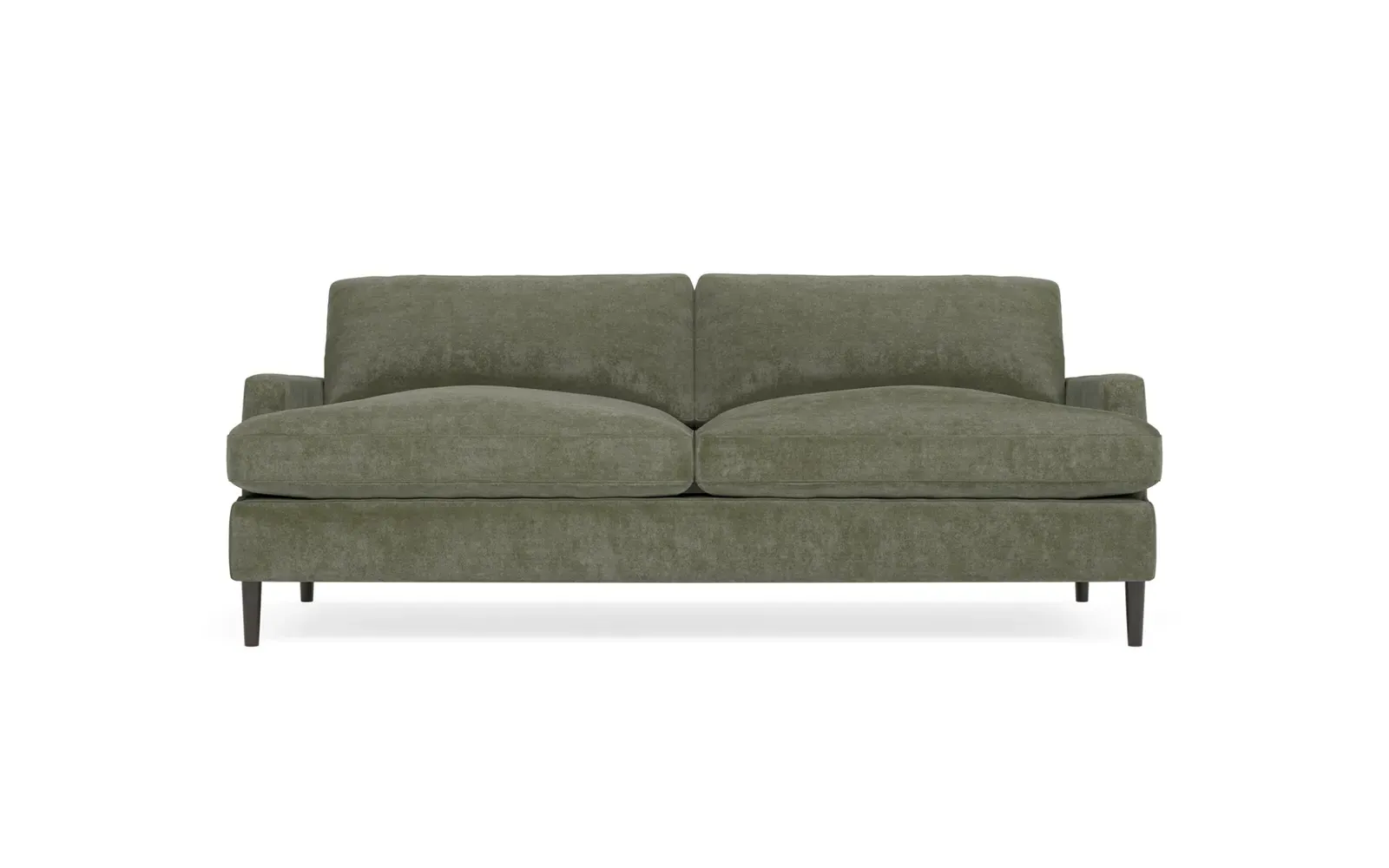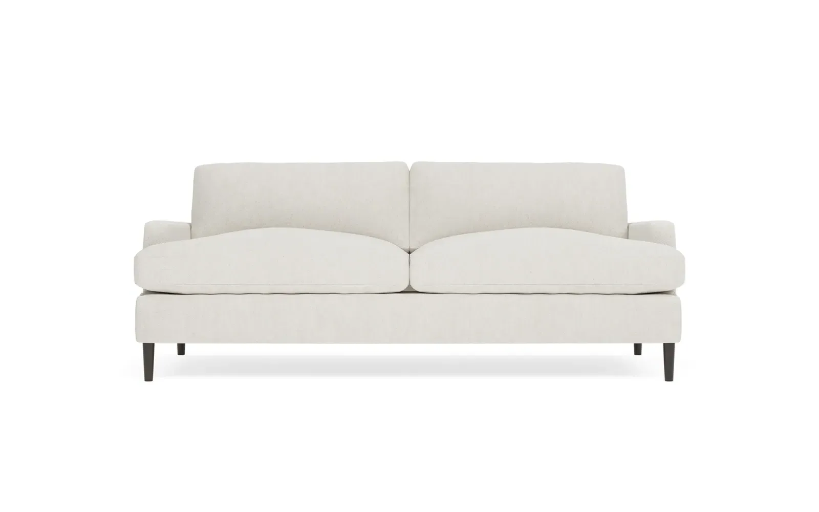 The 86" Claudie sofa draws inspiration from mid-century modern style, with clean lines and low track arms. Its tapered wood legs are slightly taller in the front, giving the frame a gentle upward stance. Soft yet supportive, the seat cushions are designed for supreme comfort, with a foam core surrounded by a blend of fiber, down, and feather fill. Choose from a variety of upholstery options, including linen, velvet, and performance fabrics. <b>Overall Dimensions:</b> 86" W x 41" D x 36" H. <b>Seat Dimensions:</b> 25” D x 23” H; <b>Distance Between Arms:</b> 77”; <b>Arm Height:</b> 24”; <b>Rear Leg Height:</b> 5 ¾”; <b>Front Leg Height:</b> 6 ¾”. <b>Materials:</b> FSC®-certified, US-sourced, formaldehyde-free solid kiln-dried hardwood and furniture-grade laminates. <b>Material Finish:</b> Espresso. <b>Cushion Fill:</b> A CertiPUR-US® certified, high-resiliency foam core wrapped with a super soft foam layer then inserted into a channel-quilted casing filled with a blend of 50% fiber, 5% down, and 45% feather.