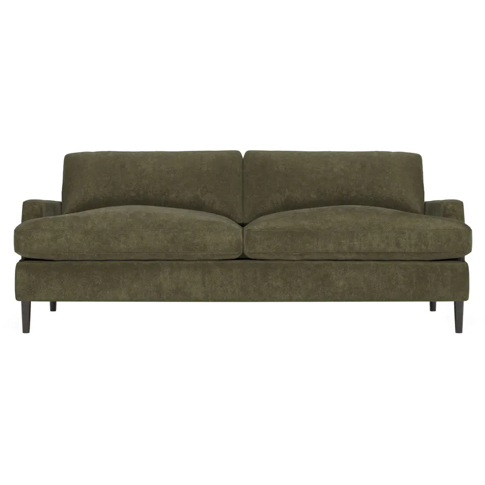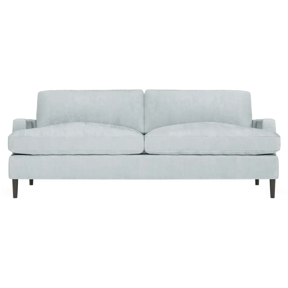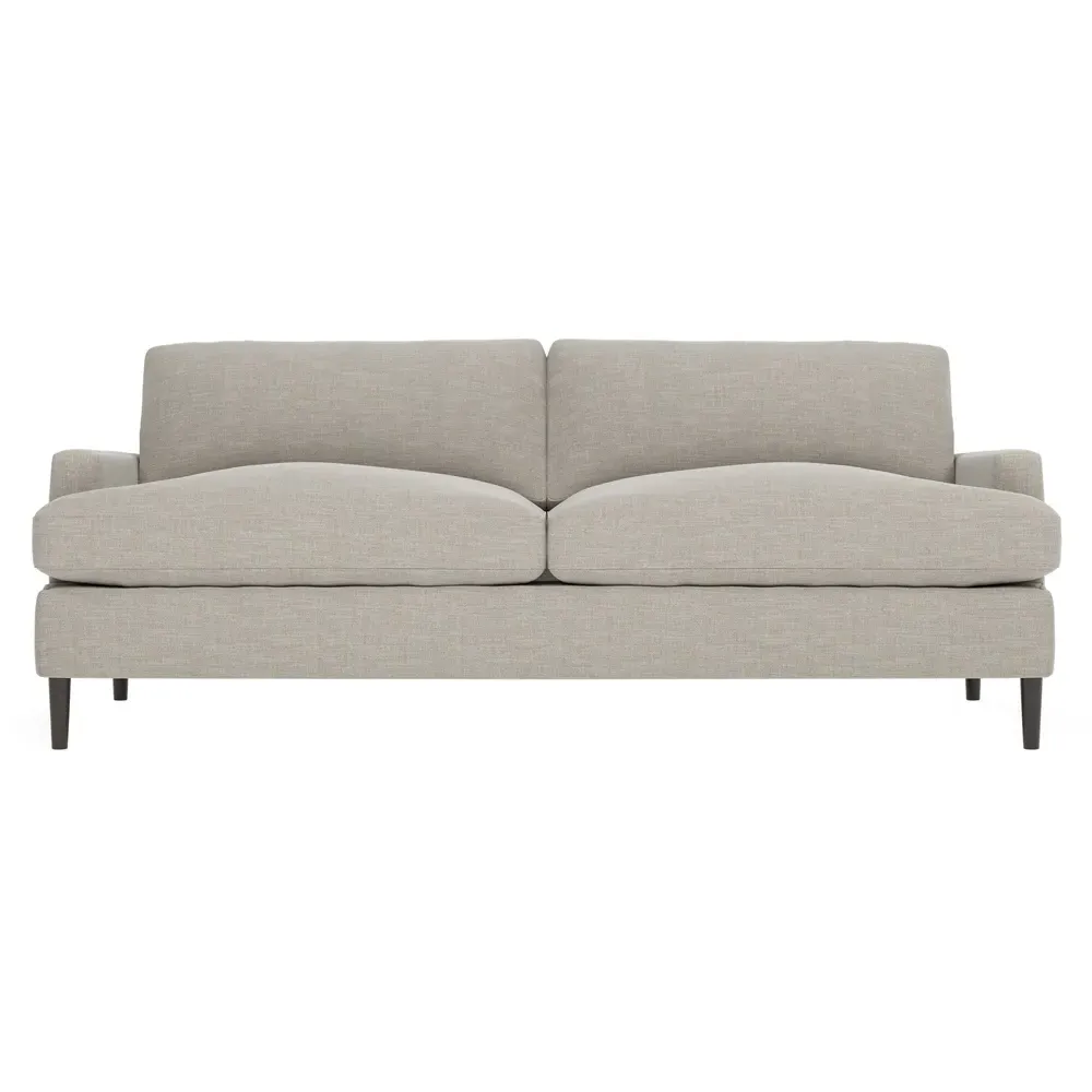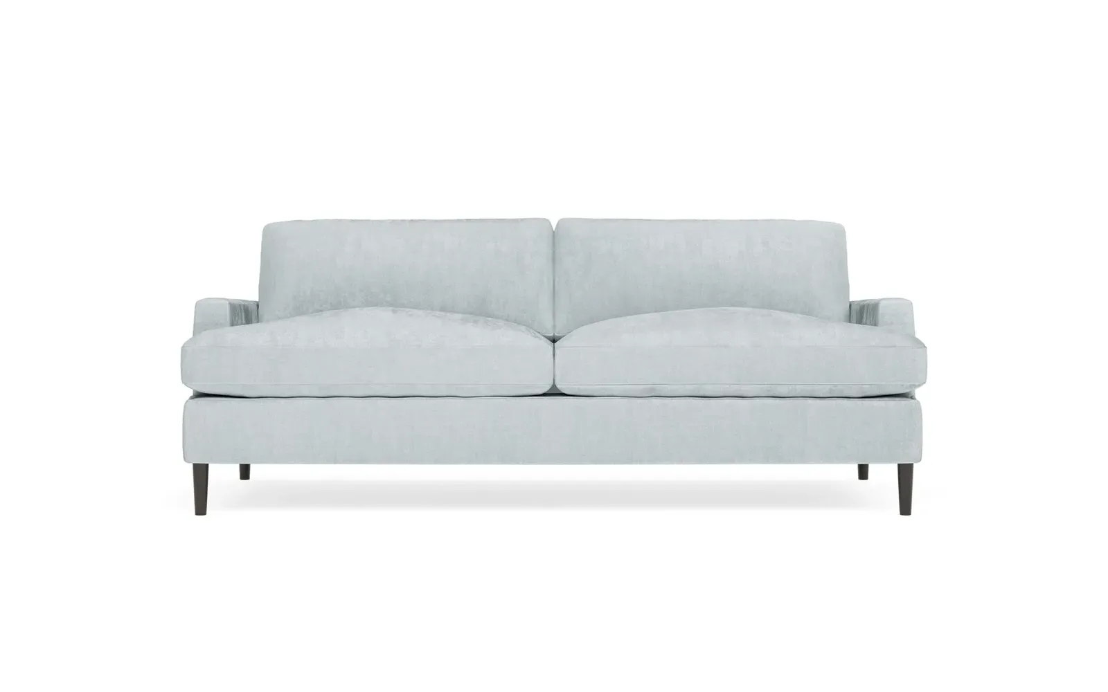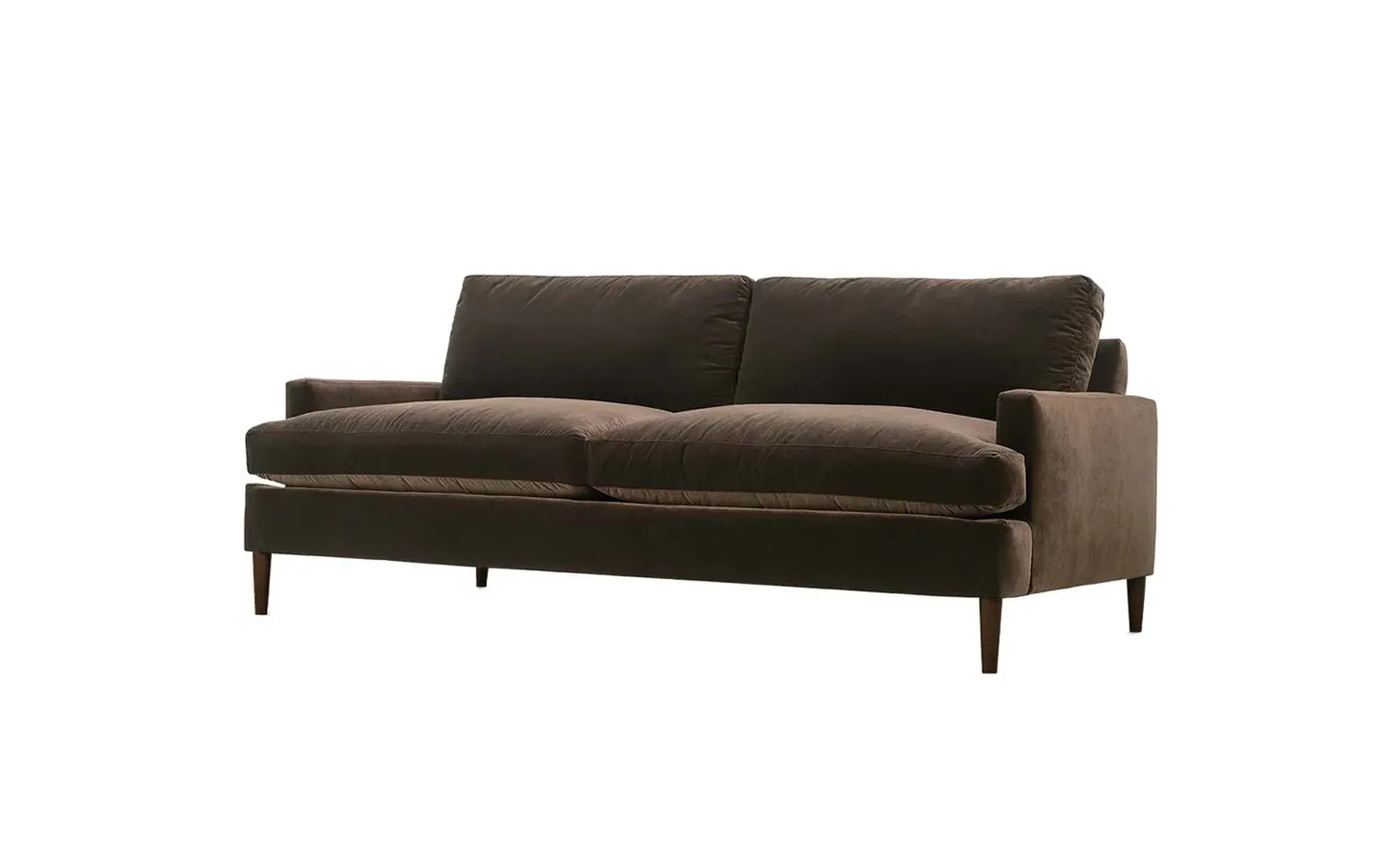 The 86" Claudie sofa draws inspiration from mid-century modern style, with clean lines and low track arms. Its tapered wood legs are slightly taller in the front, giving the frame a gentle upward stance. Soft yet supportive, the seat cushions are designed for supreme comfort, with a foam core surrounded by a blend of fiber, down, and feather fill. Choose from a variety of upholstery options, including linen, velvet, and performance fabrics. <b>Overall Dimensions:</b> 86" W x 41" D x 36" H. <b>Seat Dimensions:</b> 25” D x 23” H; <b>Distance Between Arms:</b> 77”; <b>Arm Height:</b> 24”; <b>Rear Leg Height:</b> 5 ¾”; <b>Front Leg Height:</b> 6 ¾”. <b>Materials:</b> FSC®-certified, US-sourced, formaldehyde-free solid kiln-dried hardwood and furniture-grade laminates. <b>Material Finish:</b> Espresso. <b>Cushion Fill:</b> A CertiPUR-US® certified, high-resiliency foam core wrapped with a super soft foam layer then inserted into a channel-quilted casing filled with a blend of 50% fiber, 5% down, and 45% feather.