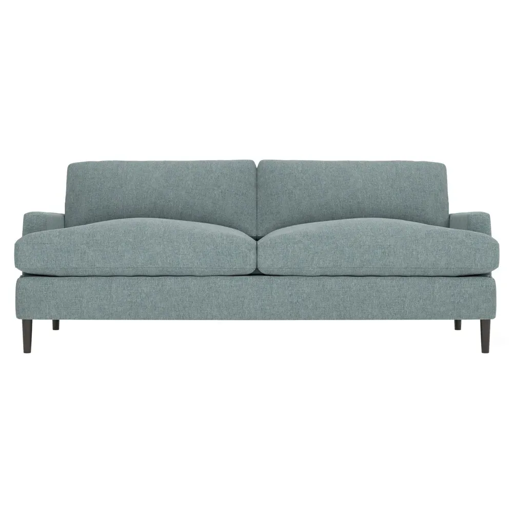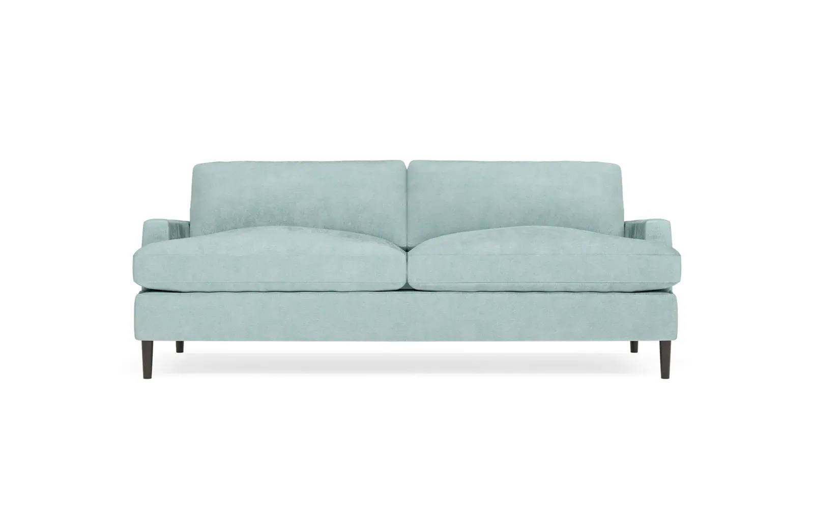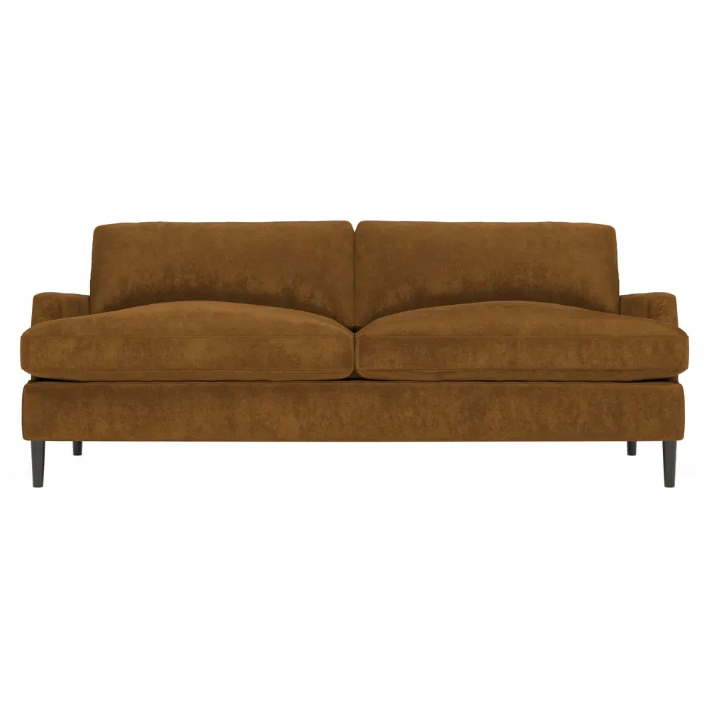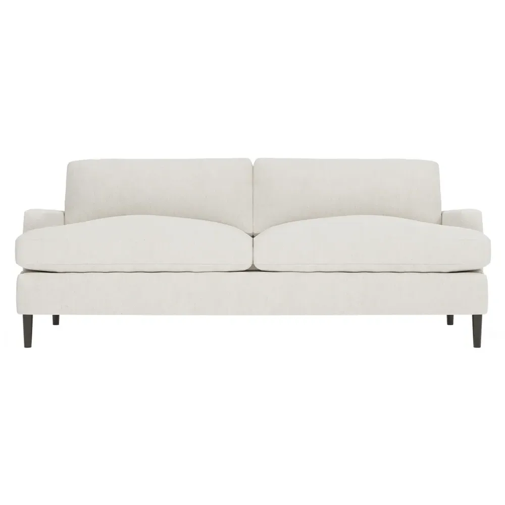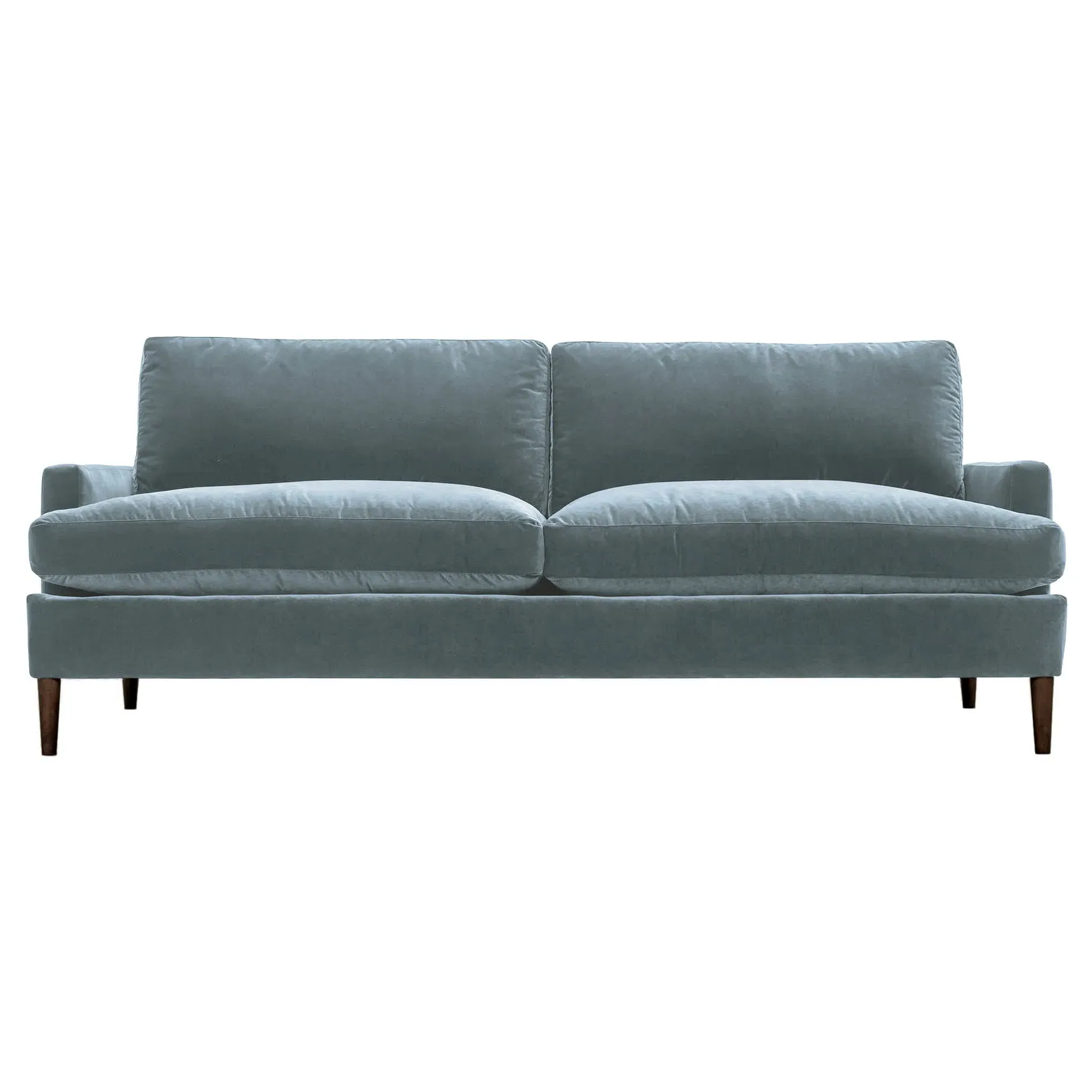 The 86" Claudie sofa draws inspiration from mid-century modern style, with clean lines and low track arms. Its tapered wood legs are slightly taller in the front, giving the frame a gentle upward stance. Soft yet supportive, the seat cushions are designed for supreme comfort, with a foam core surrounded by a blend of fiber, down, and feather fill. Choose from a variety of upholstery options, including linen, velvet, and performance fabrics. <b>Overall Dimensions:</b> 86" W x 41" D x 36" H. <b>Seat Dimensions:</b> 25” D x 23” H; <b>Distance Between Arms:</b> 77”; <b>Arm Height:</b> 24”; <b>Rear Leg Height:</b> 5 ¾”; <b>Front Leg Height:</b> 6 ¾”. <b>Materials:</b> FSC®-certified, US-sourced, formaldehyde-free solid kiln-dried hardwood and furniture-grade laminates. <b>Material Finish:</b> Espresso. <b>Cushion Fill:</b> A CertiPUR-US® certified, high-resiliency foam core wrapped with a super soft foam layer then inserted into a channel-quilted casing filled with a blend of 50% fiber, 5% down, and 45% feather.