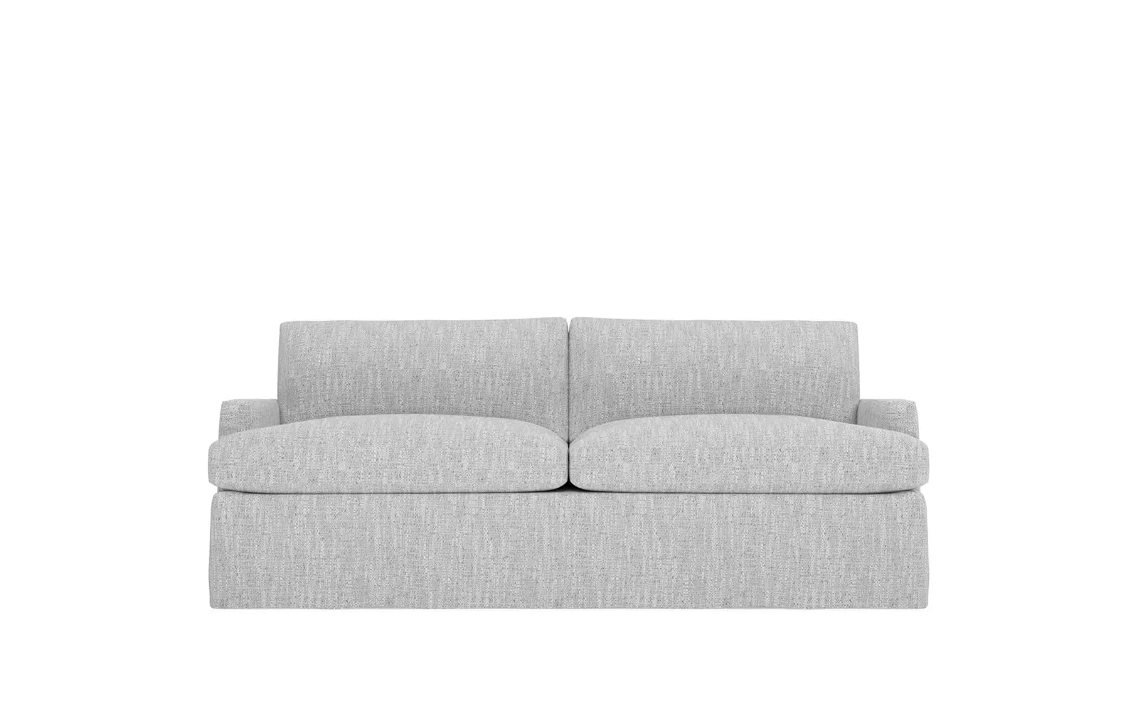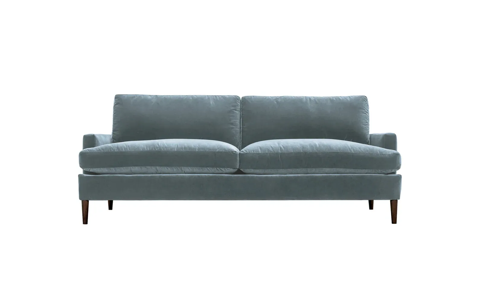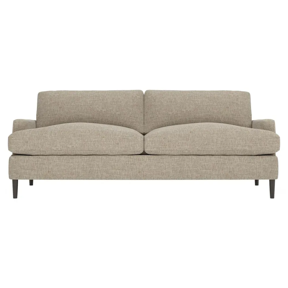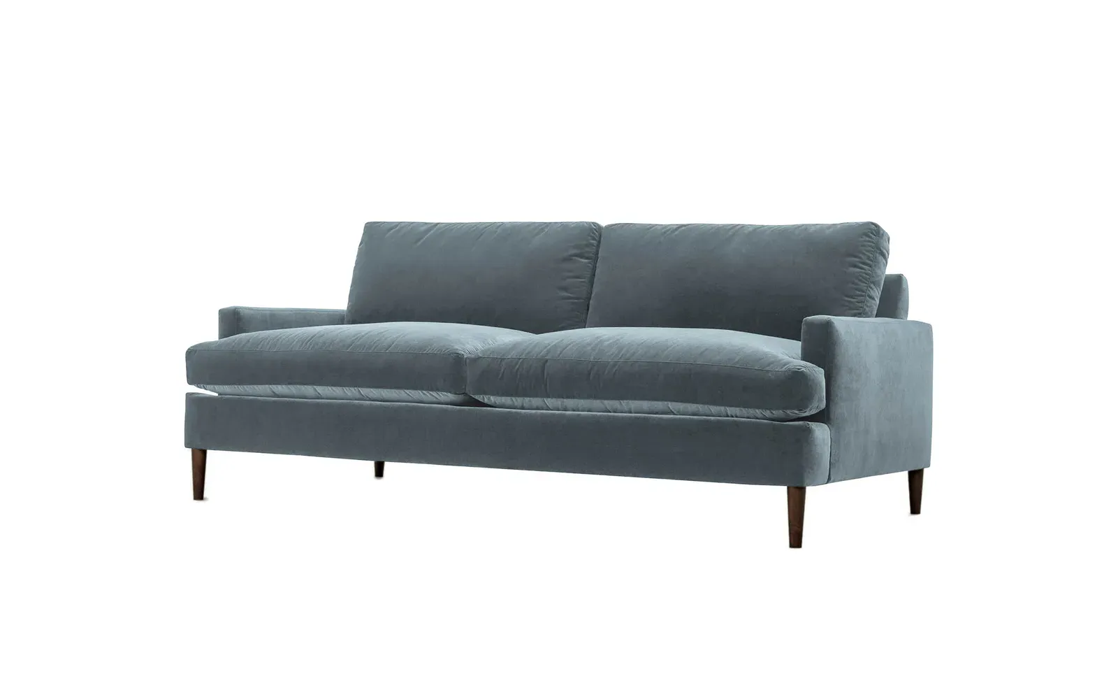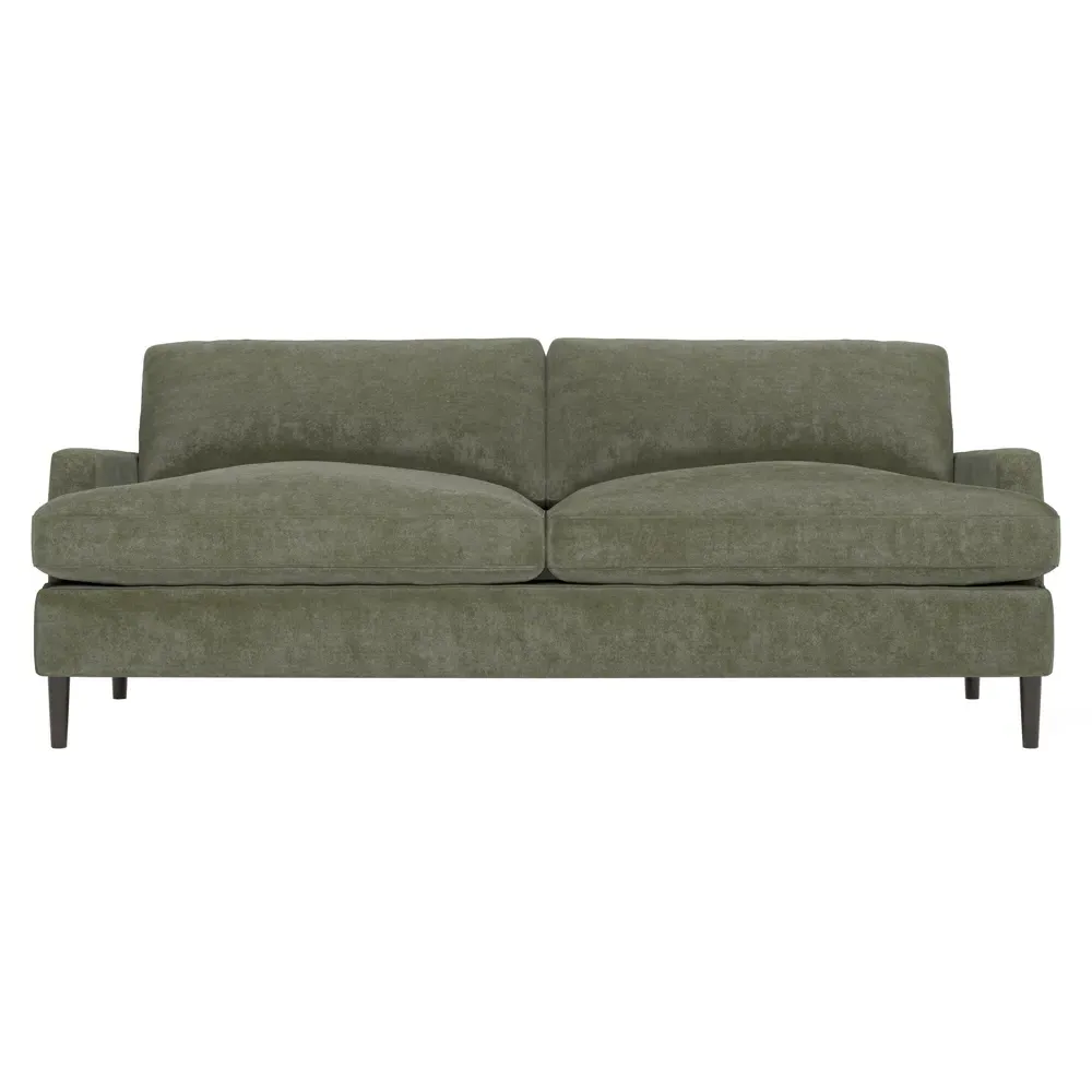 The 86" Claudie sofa draws inspiration from mid-century modern style, with clean lines and low track arms. Its tapered wood legs are slightly taller in the front, giving the frame a gentle upward stance. Soft yet supportive, the seat cushions are designed for supreme comfort, with a foam core surrounded by a blend of fiber, down, and feather fill. Choose from a variety of upholstery options, including linen, velvet, and performance fabrics. <b>Overall Dimensions:</b> 86" W x 41" D x 36" H. <b>Seat Dimensions:</b> 25” D x 23” H; <b>Distance Between Arms:</b> 77”; <b>Arm Height:</b> 24”; <b>Rear Leg Height:</b> 5 ¾”; <b>Front Leg Height:</b> 6 ¾”. <b>Materials:</b> FSC®-certified, US-sourced, formaldehyde-free solid kiln-dried hardwood and furniture-grade laminates. <b>Material Finish:</b> Espresso. <b>Cushion Fill:</b> A CertiPUR-US® certified, high-resiliency foam core wrapped with a super soft foam layer then inserted into a channel-quilted casing filled with a blend of 50% fiber, 5% down, and 45% feather.