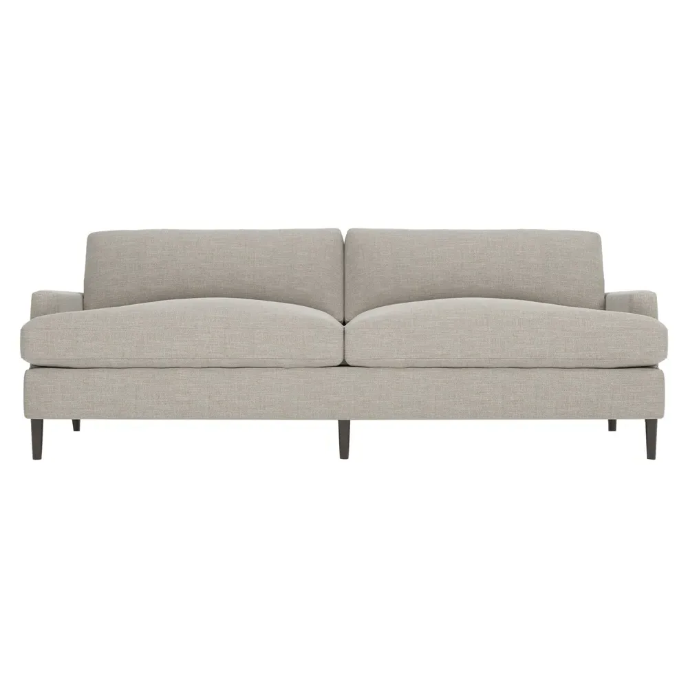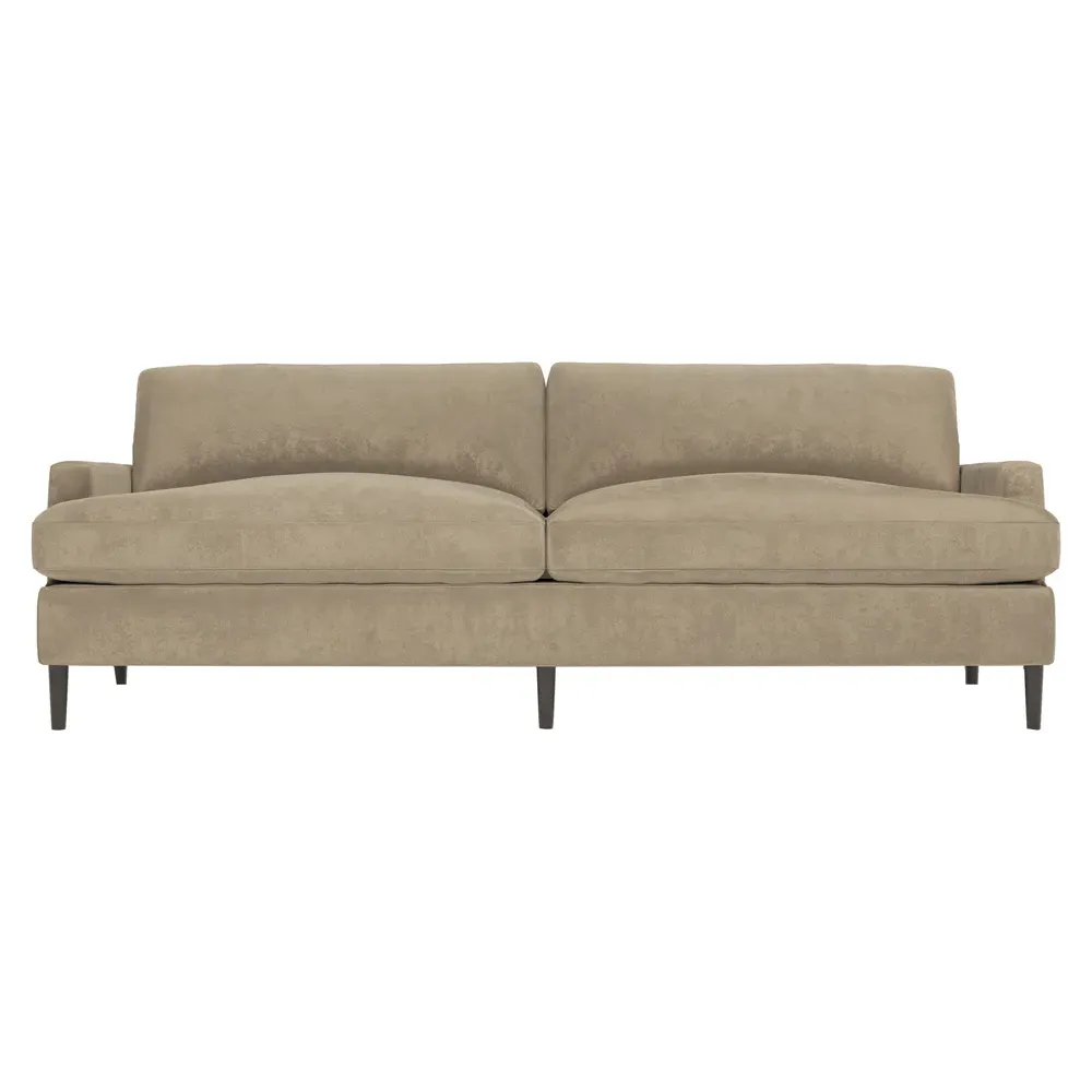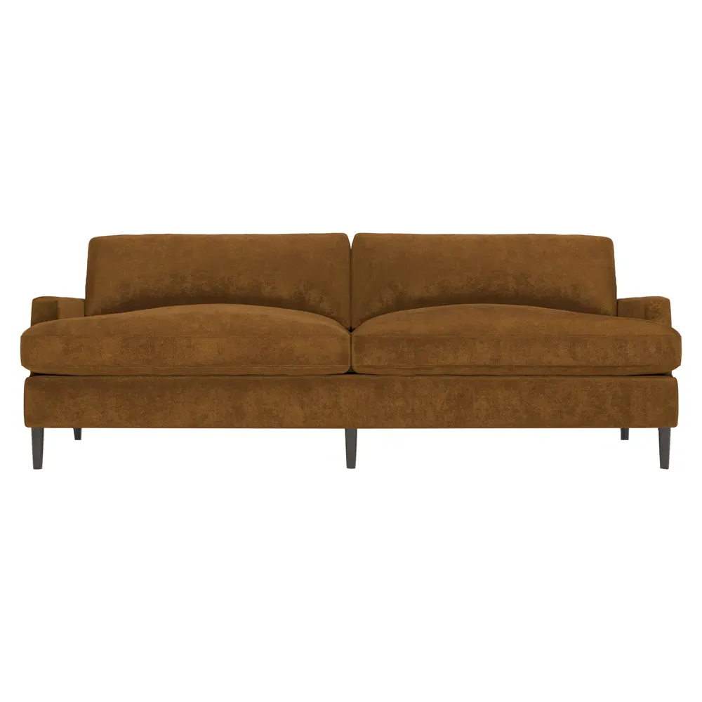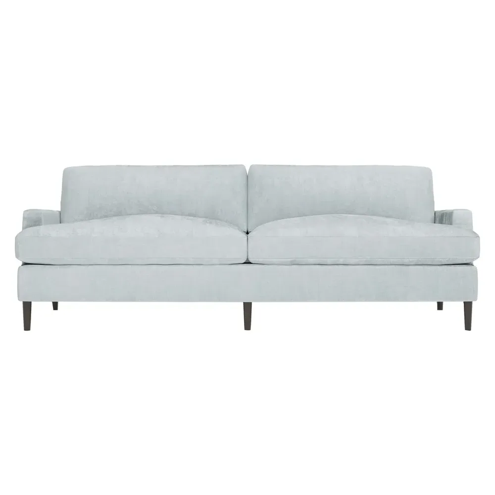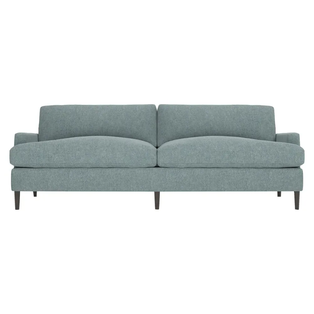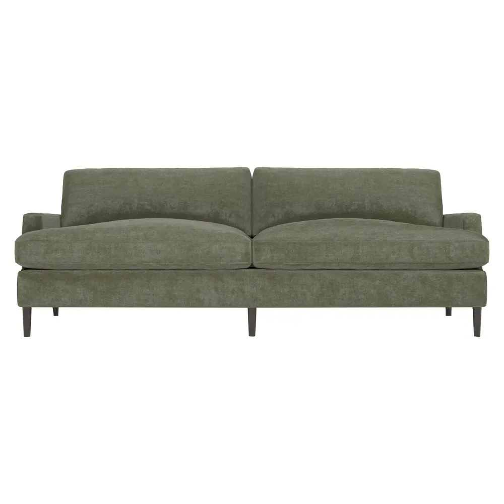 The 96" Claudie sofa draws inspiration from mid-century modern style, with clean lines and low track arms. Its tapered wood legs are slightly taller in the front, giving the frame a gentle upward stance. Soft yet supportive, the seat cushions are designed for supreme comfort, with a foam core surrounded by a blend of fiber, down, and feather fill. Choose from a variety of upholstery options, including linen, velvet, and performance fabrics. <b>Overall Dimensions:</b> 96" W x 41" D x 36" H. <b>Seat Dimensions:</b> 25” D x 23” H; <b>Distance Between Arms:</b> 88”; <b>Arm Height:</b> 24”; <b>Rear Leg Height:</b> 5 ¾”; <b>Front Leg Height:</b> 6 ¾”. <b>Materials:</b> FSC®-certified, US-sourced, formaldehyde-free solid kiln-dried hardwood and furniture-grade laminates. <b>Material Finish:</b> Espresso legs. <b>Cushion Fill:</b> A CertiPUR-US® certified, high-resiliency foam core wrapped with a super soft foam layer then inserted into a channel-quilted casing filled with a blend of 50% fiber, 5% down, and 45% feather.