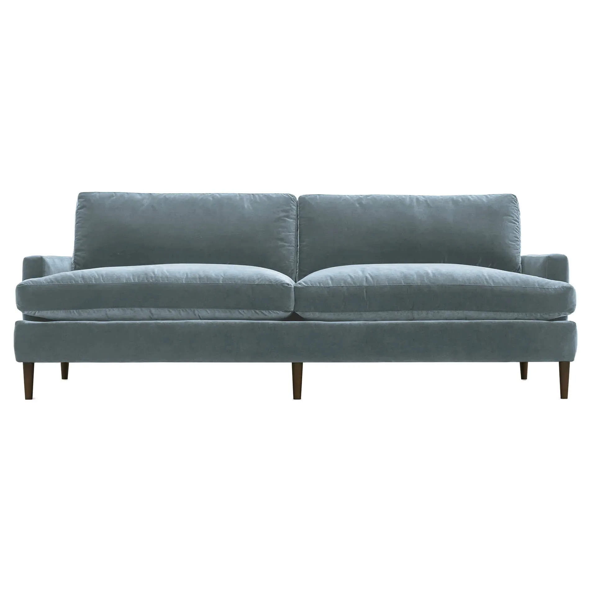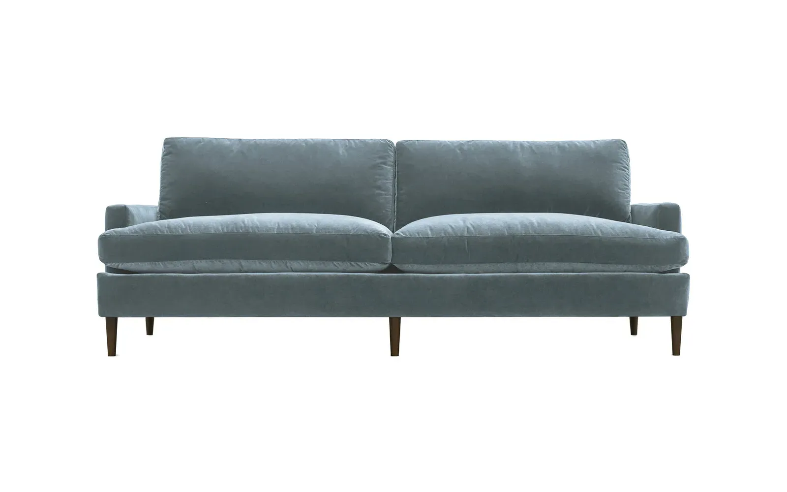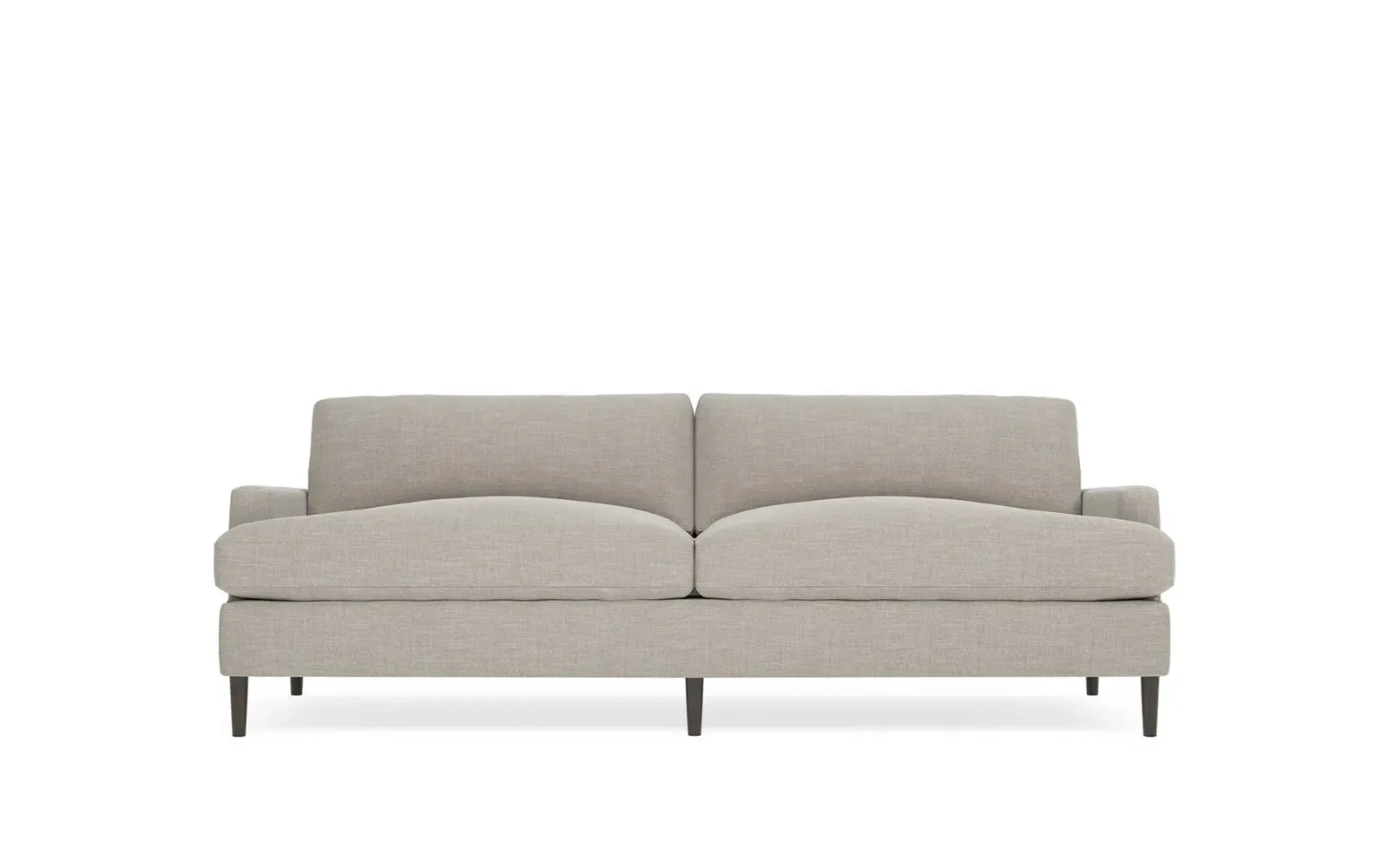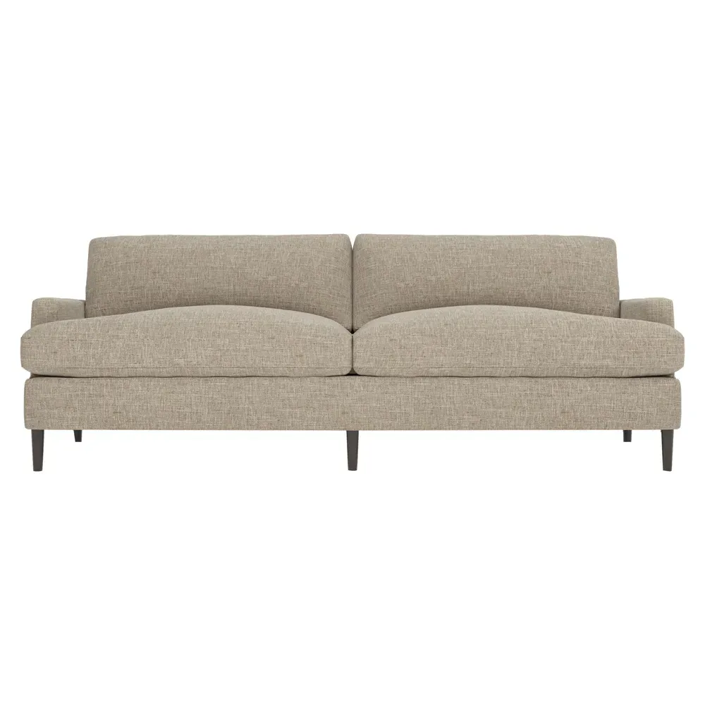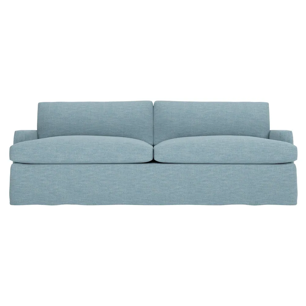 The 96" Claudie sofa draws inspiration from mid-century modern style, with clean lines and low track arms. Its tapered wood legs are slightly taller in the front, giving the frame a gentle upward stance. Soft yet supportive, the seat cushions are designed for supreme comfort, with a foam core surrounded by a blend of fiber, down, and feather fill. Choose from a variety of upholstery options, including linen, velvet, and performance fabrics. <b>Overall Dimensions:</b> 96" W x 41" D x 36" H. <b>Seat Dimensions:</b> 25” D x 23” H; <b>Distance Between Arms:</b> 88”; <b>Arm Height:</b> 24”; <b>Rear Leg Height:</b> 5 ¾”; <b>Front Leg Height:</b> 6 ¾”. <b>Materials:</b> FSC®-certified, US-sourced, formaldehyde-free solid kiln-dried hardwood and furniture-grade laminates. <b>Material Finish:</b> Espresso legs. <b>Cushion Fill:</b> A CertiPUR-US® certified, high-resiliency foam core wrapped with a super soft foam layer then inserted into a channel-quilted casing filled with a blend of 50% fiber, 5% down, and 45% feather.