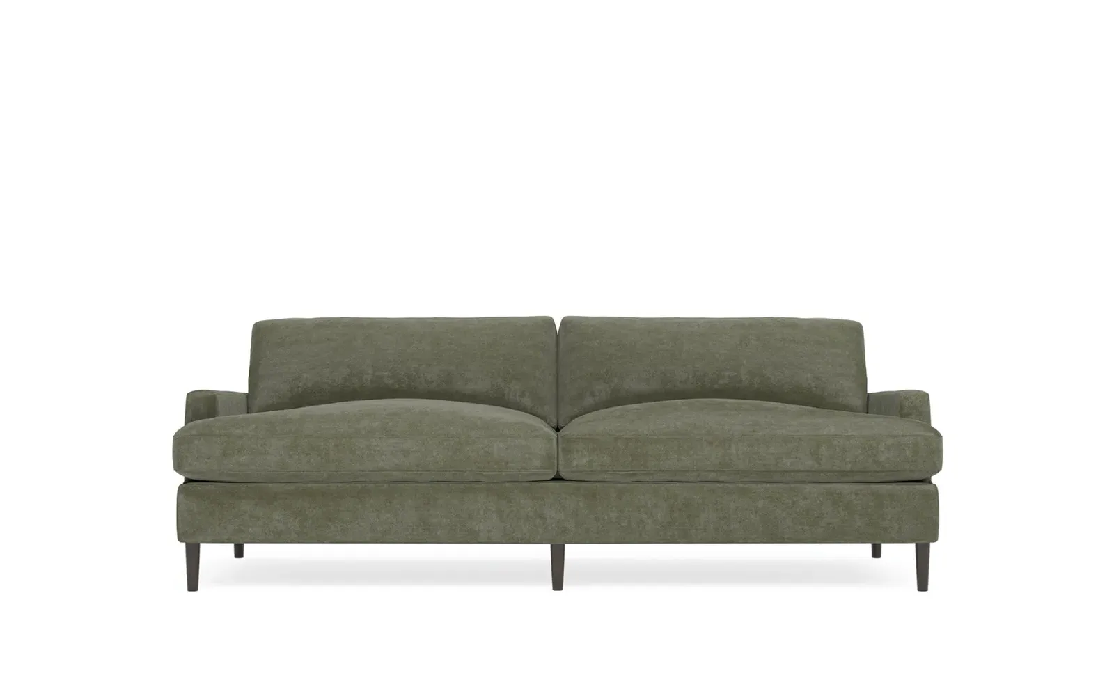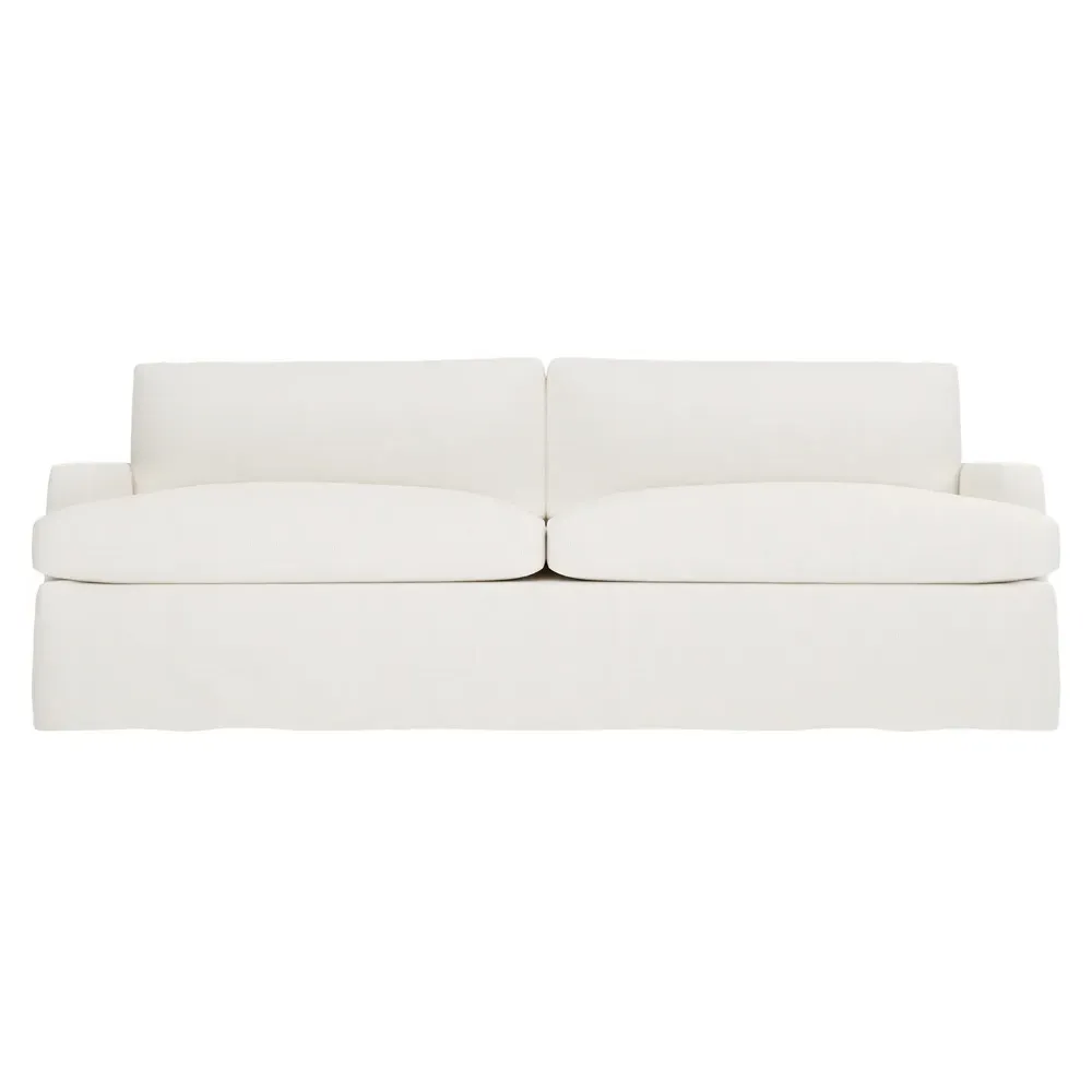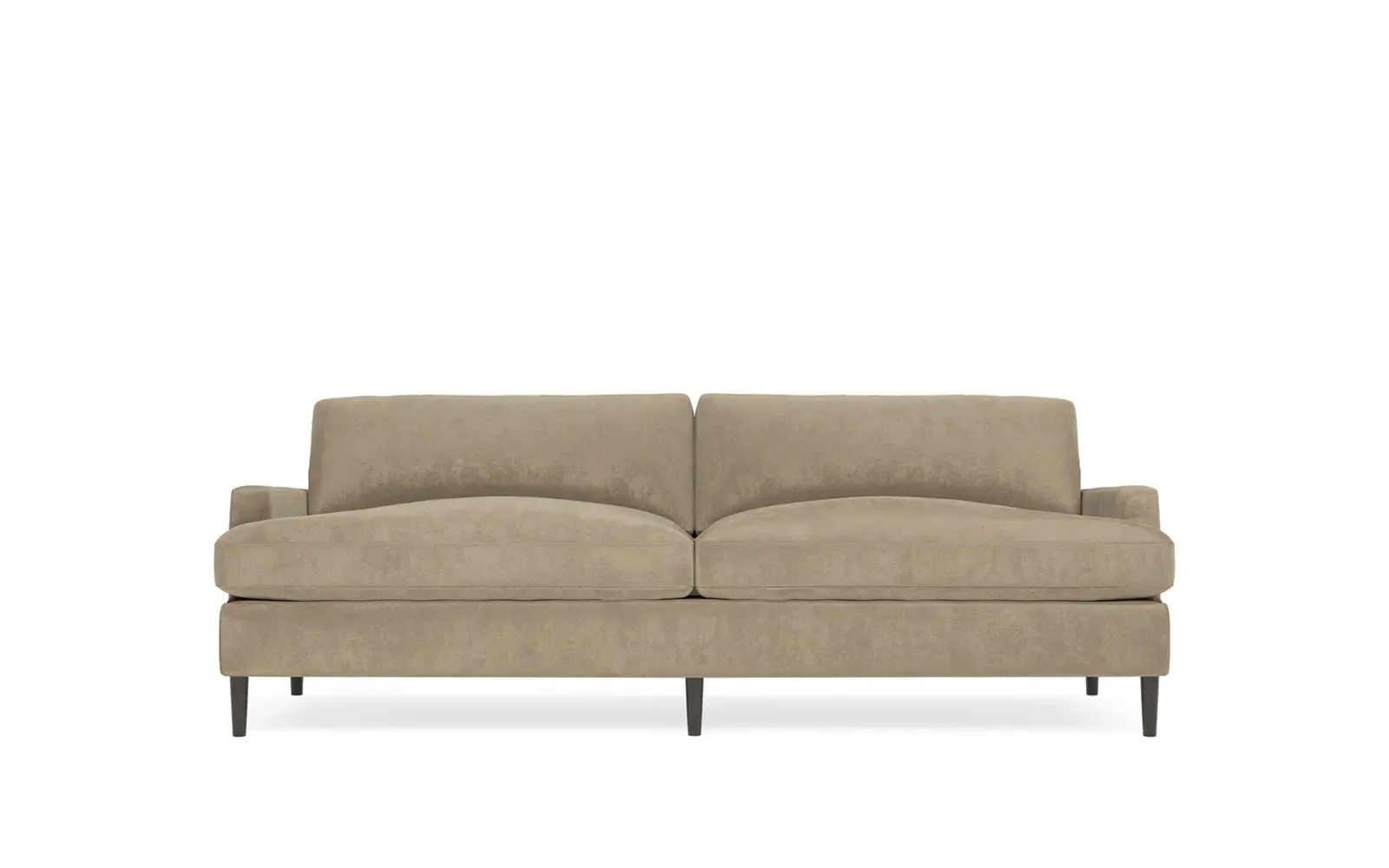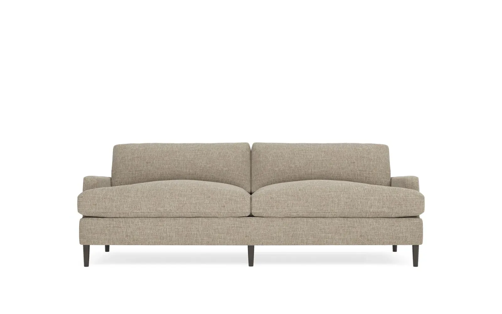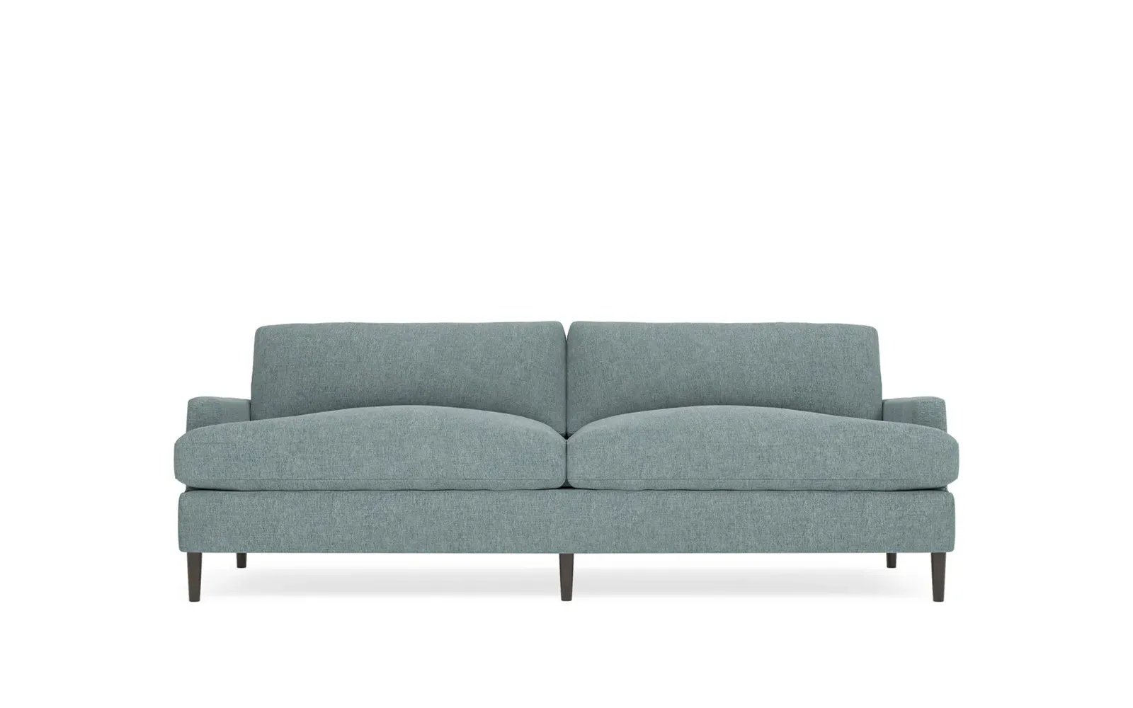 The 96" Claudie sofa draws inspiration from mid-century modern style, with clean lines and low track arms. Its tapered wood legs are slightly taller in the front, giving the frame a gentle upward stance. Soft yet supportive, the seat cushions are designed for supreme comfort, with a foam core surrounded by a blend of fiber, down, and feather fill. Choose from a variety of upholstery options, including linen, velvet, and performance fabrics. <b>Overall Dimensions:</b> 96" W x 41" D x 36" H. <b>Seat Dimensions:</b> 25” D x 23” H; <b>Distance Between Arms:</b> 88”; <b>Arm Height:</b> 24”; <b>Rear Leg Height:</b> 5 ¾”; <b>Front Leg Height:</b> 6 ¾”. <b>Materials:</b> FSC®-certified, US-sourced, formaldehyde-free solid kiln-dried hardwood and furniture-grade laminates. <b>Material Finish:</b> Espresso legs. <b>Cushion Fill:</b> A CertiPUR-US® certified, high-resiliency foam core wrapped with a super soft foam layer then inserted into a channel-quilted casing filled with a blend of 50% fiber, 5% down, and 45% feather.