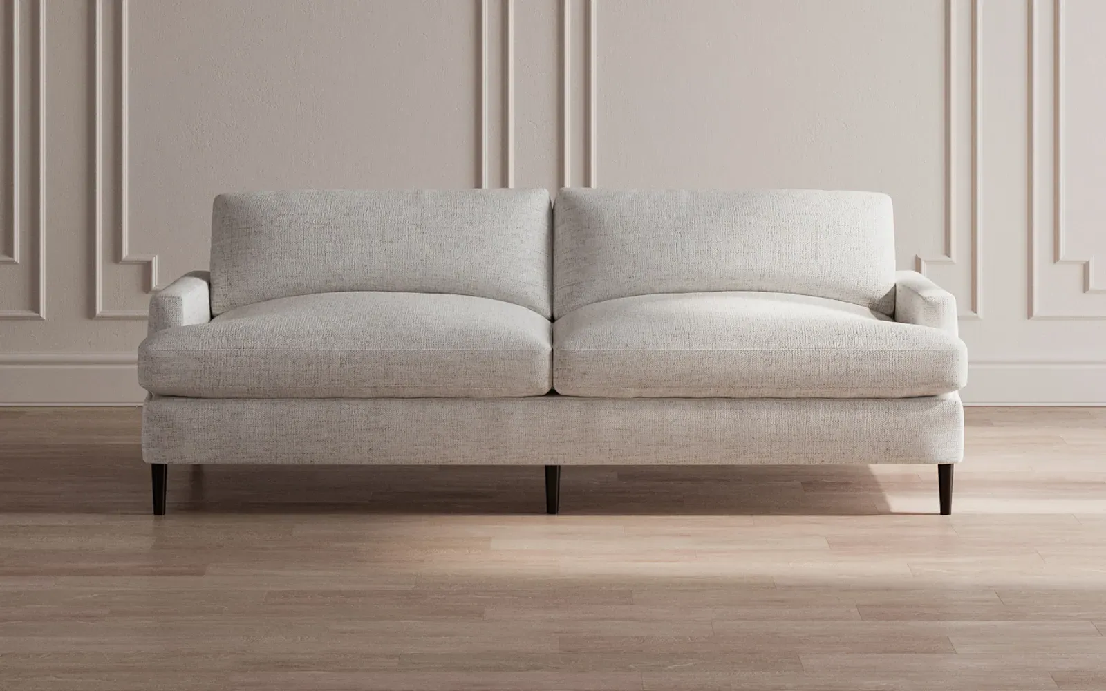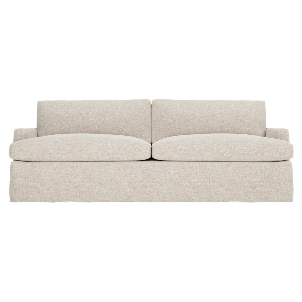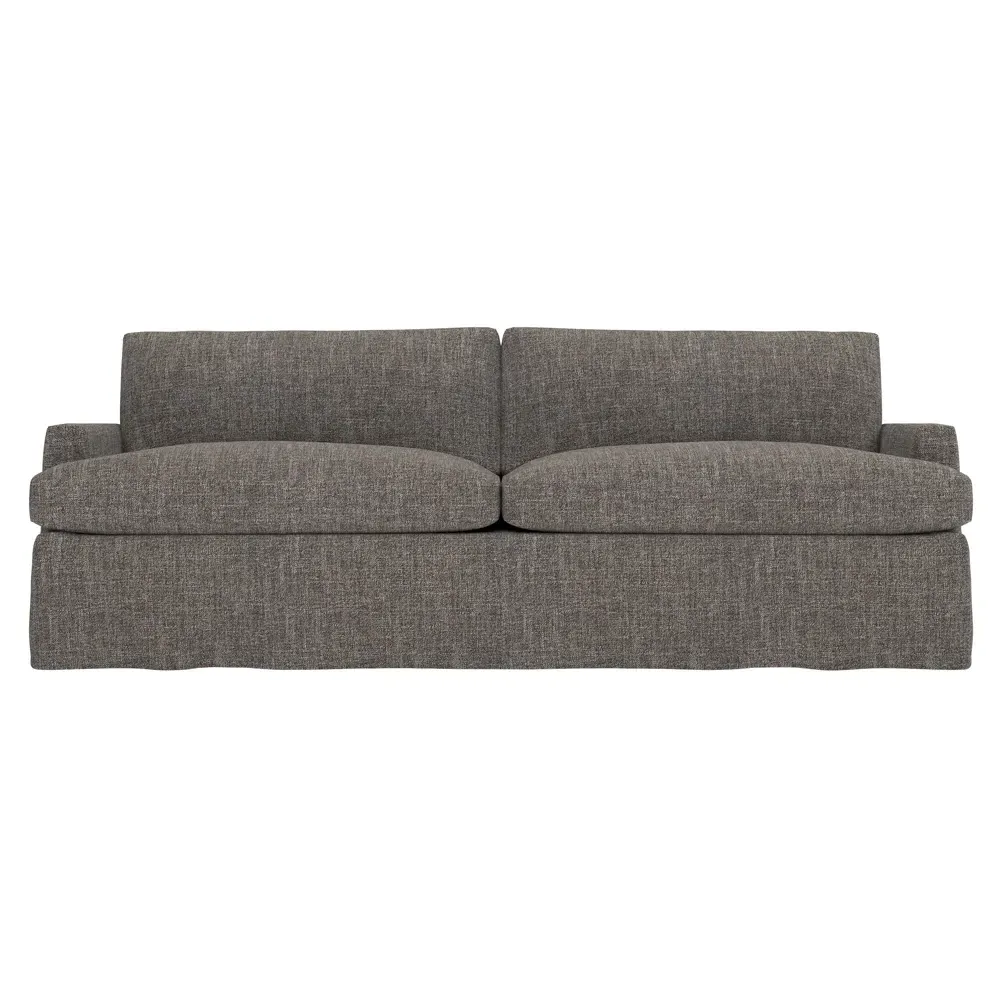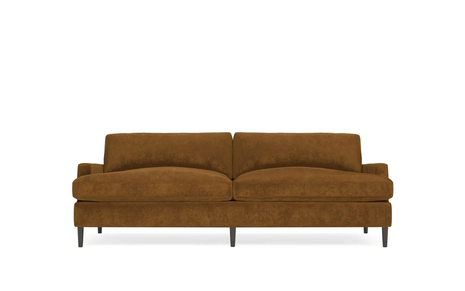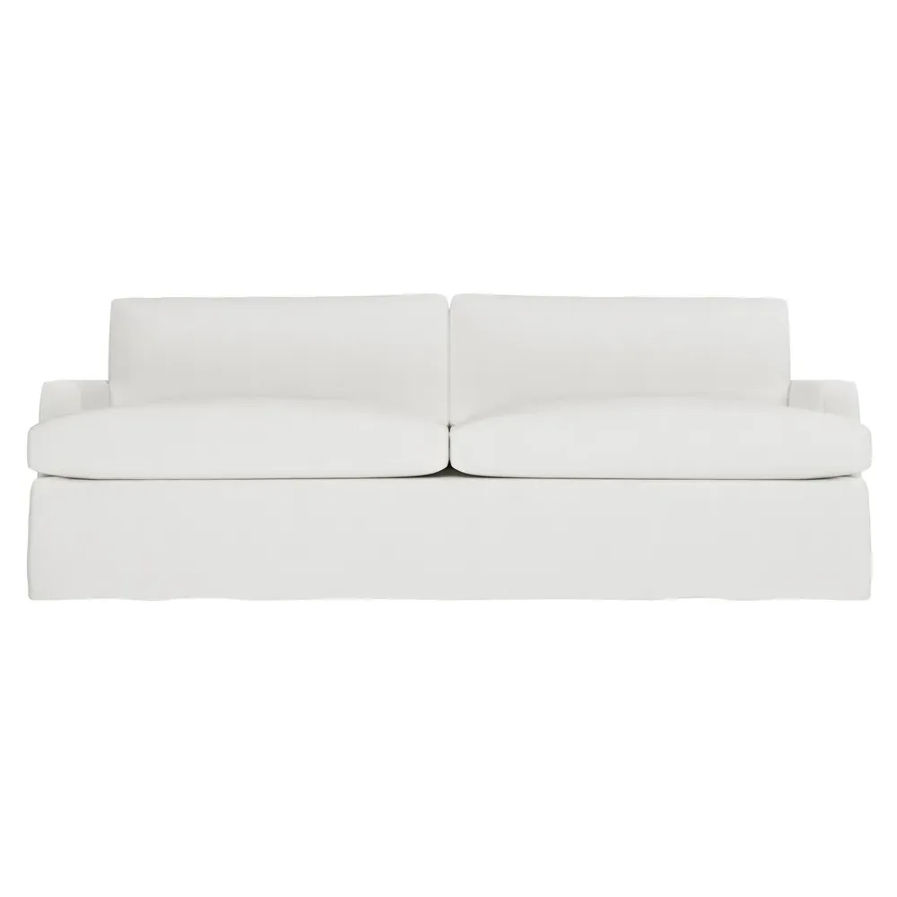 The 96" Claudie sofa draws inspiration from mid-century modern style, with clean lines and low track arms. Its tapered wood legs are slightly taller in the front, giving the frame a gentle upward stance. Soft yet supportive, the seat cushions are designed for supreme comfort, with a foam core surrounded by a blend of fiber, down, and feather fill. Choose from a variety of upholstery options, including linen, velvet, and performance fabrics. <b>Overall Dimensions:</b> 96" W x 41" D x 36" H. <b>Seat Dimensions:</b> 25” D x 23” H; <b>Distance Between Arms:</b> 88”; <b>Arm Height:</b> 24”; <b>Rear Leg Height:</b> 5 ¾”; <b>Front Leg Height:</b> 6 ¾”. <b>Materials:</b> FSC®-certified, US-sourced, formaldehyde-free solid kiln-dried hardwood and furniture-grade laminates. <b>Material Finish:</b> Espresso legs. <b>Cushion Fill:</b> A CertiPUR-US® certified, high-resiliency foam core wrapped with a super soft foam layer then inserted into a channel-quilted casing filled with a blend of 50% fiber, 5% down, and 45% feather.