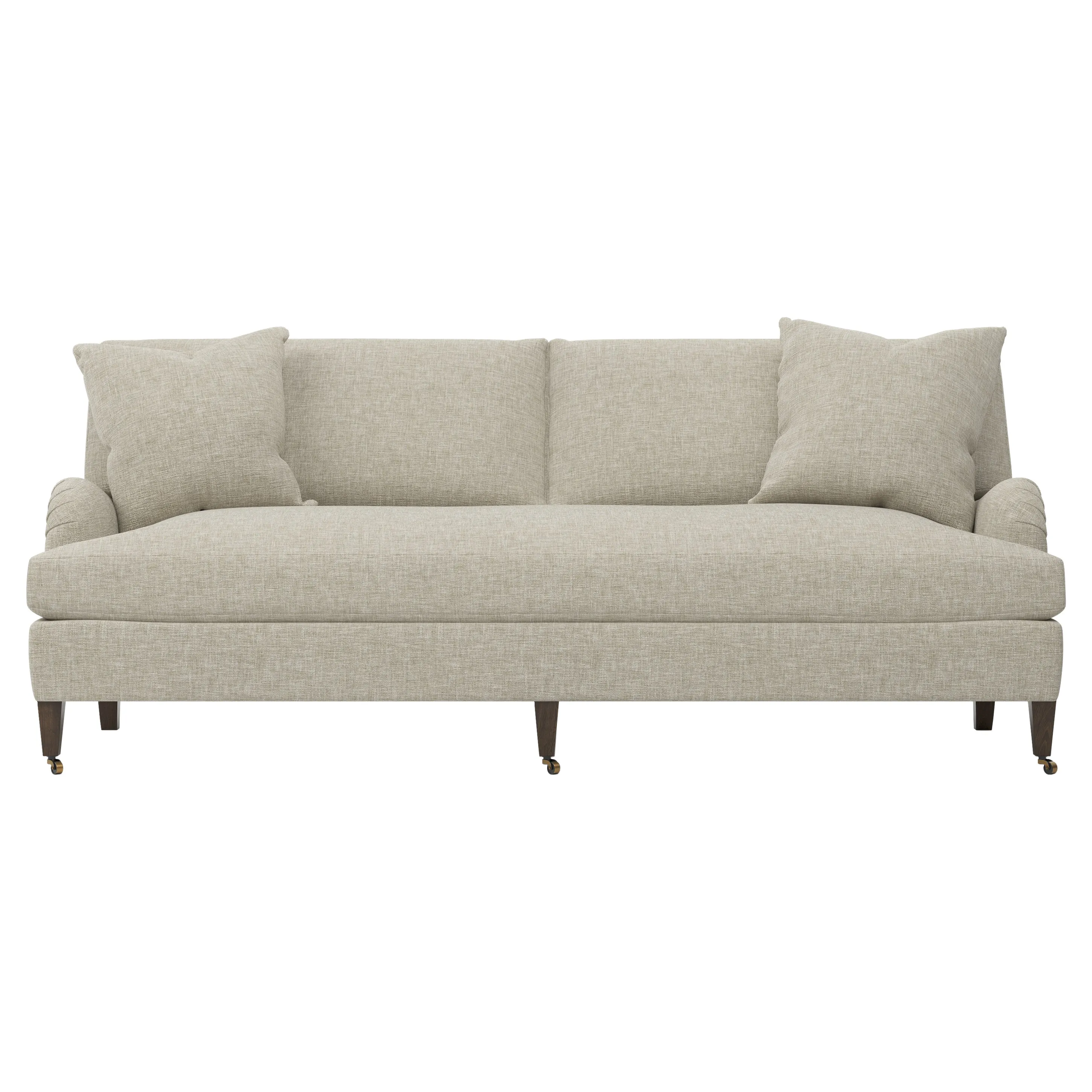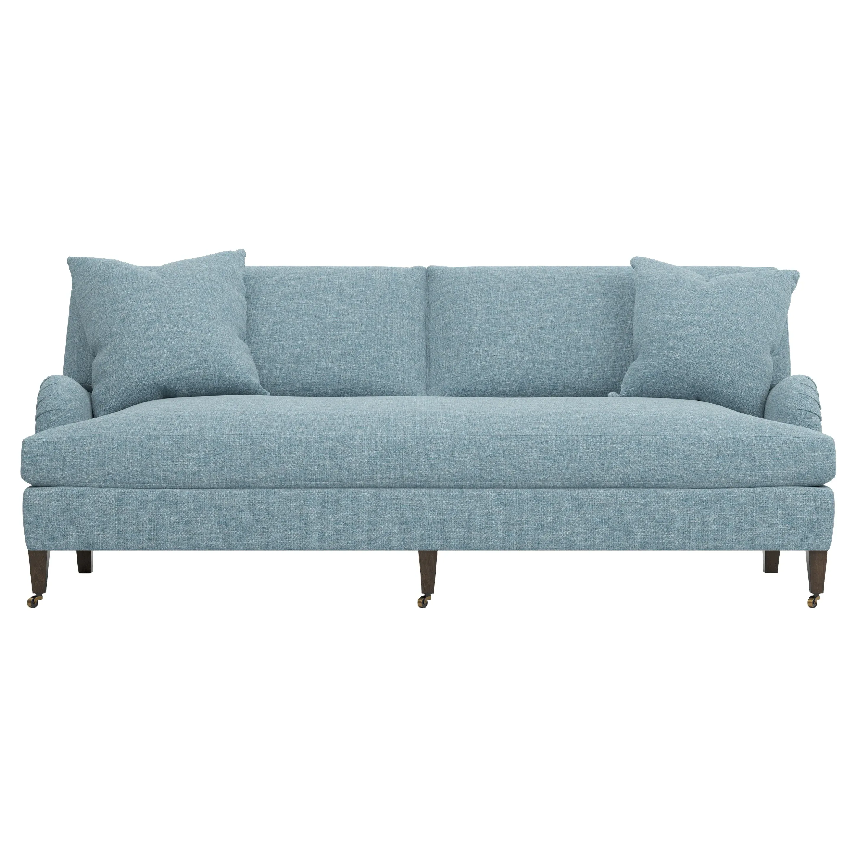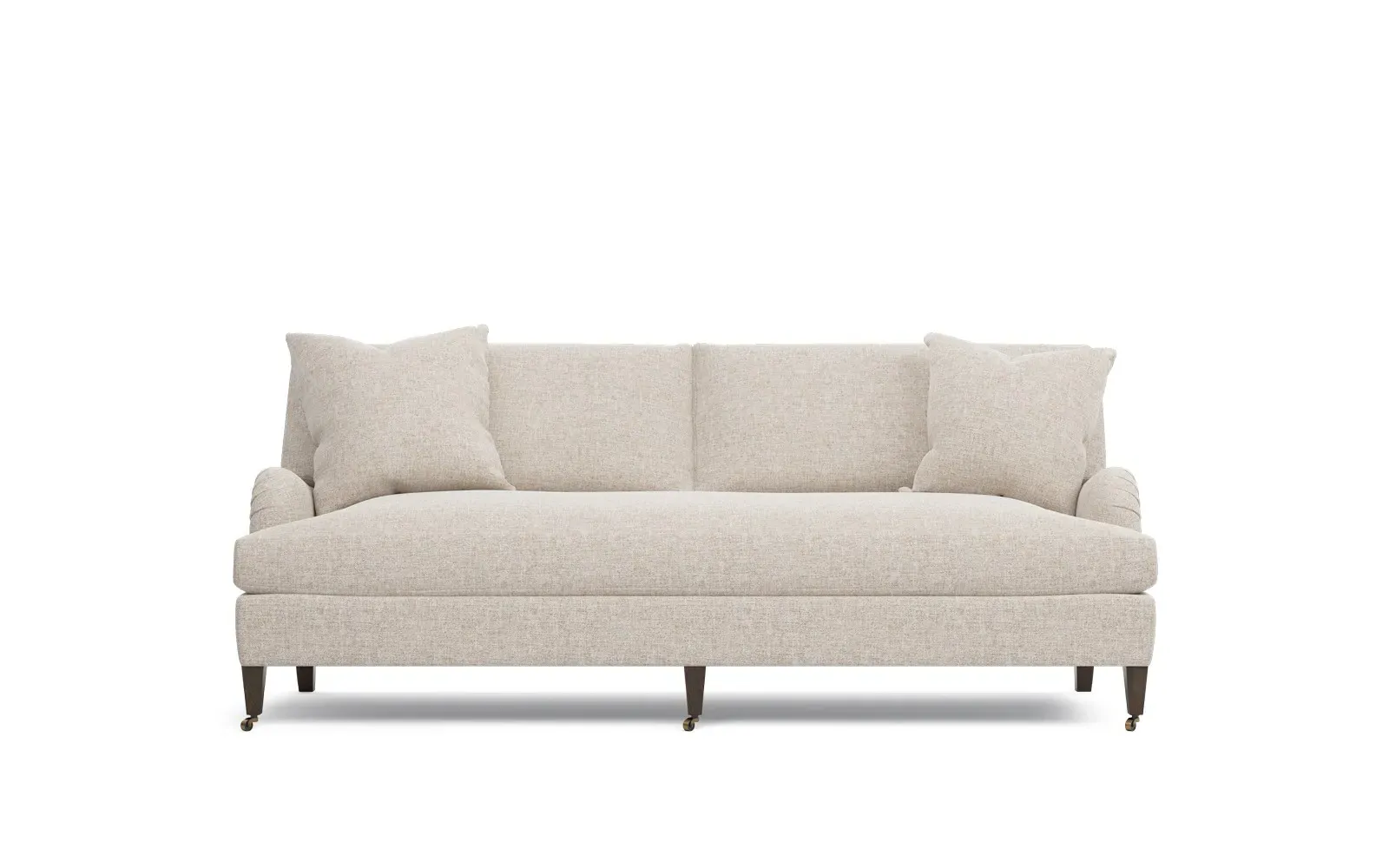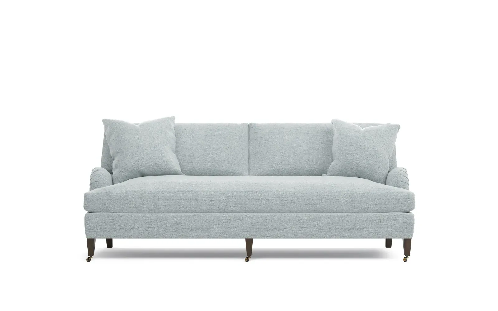 <b>Overall Dimensions:</b> 93" W x 41" D x 37" H. <b>Seat Dimensions:</b> 84” W x 25” D x 22” H; <b>Arm Height:</b> 24”; <b>Leg Height:</b> 6”. <b>Materials:</b> FSC®-certified, US-sourced, formaldehyde-free solid kiln-dried hardwood and furniture-grade laminates, metal and vulcanized rubber casters. <b>Material Finish:</b> Espresso legs, brass casters. <b>Cushion Fill:</b> A CertiPUR-US® certified, high-resiliency foam core wrapped with a super soft foam layer then inserted into a channel-quilted casing filled with a blend of 50% fiber, 5% down, and 45% feather.