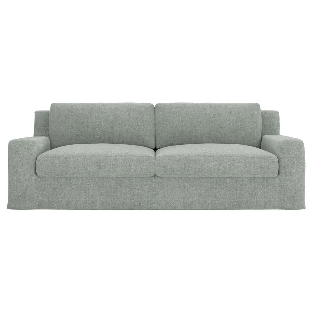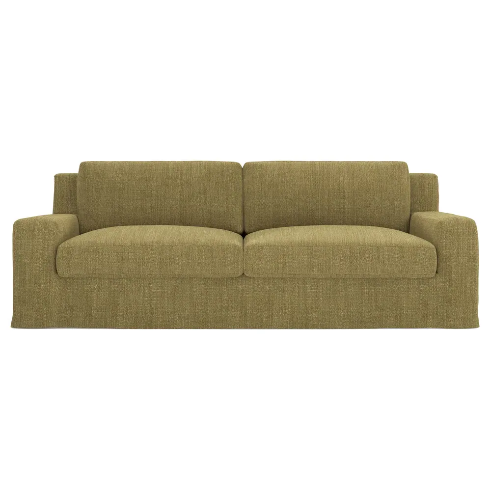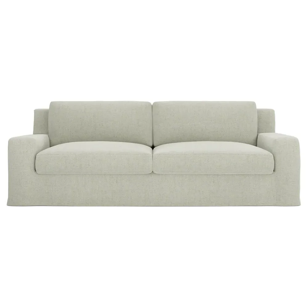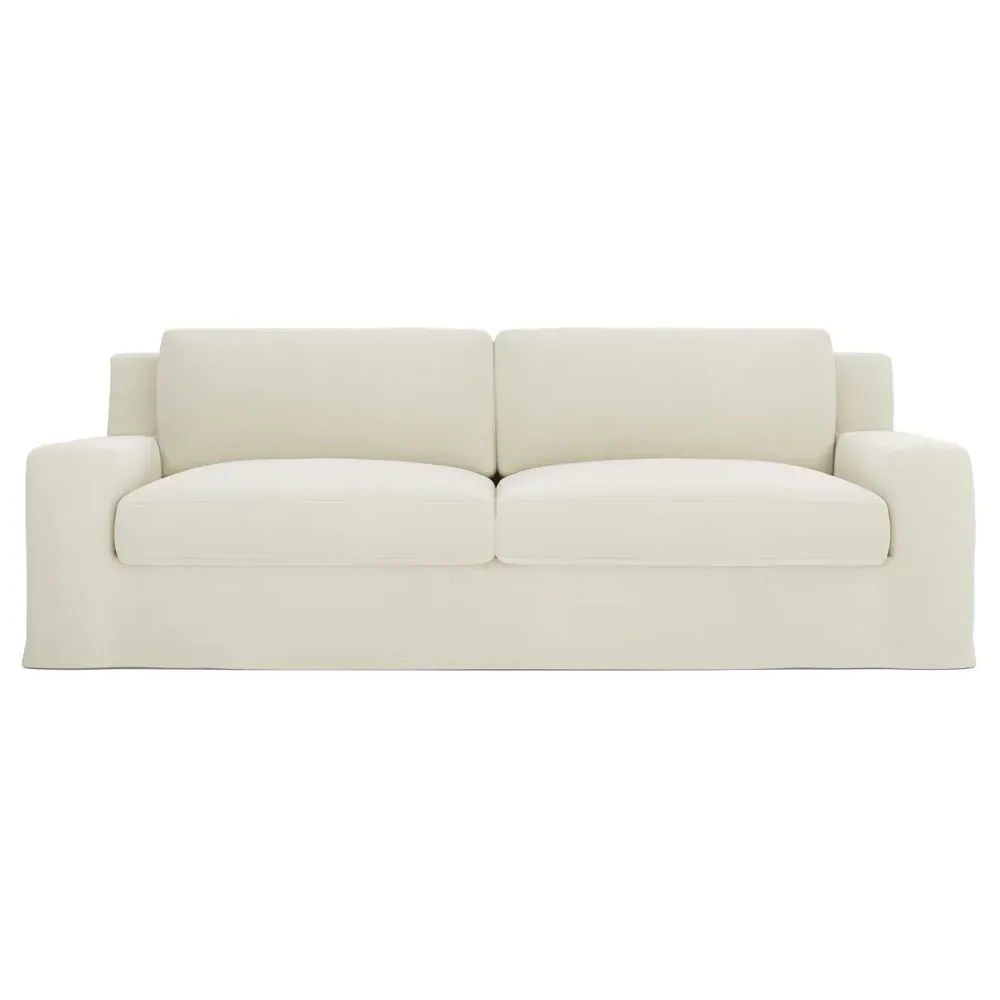 A Kathy Kuo Home exclusive, our 90” Henri sofa is UNBELIEVABLY COMFORTABLE and beautifully proportioned, lending modern yet timeless appeal to any home, from a townhouse to a beach house. With a deep seat, tapered back, and low track arms, its inviting silhouette makes you never want to get up. The seat cushions offer extraordinary comfort, with a foam core surrounded by a blend of feathers and duck down. Choose from a variety of slipcover options, including linen and performance fabrics. <b>Overall Dimensions:</b> 90" W x 39" D x 30" H. <b>Seat Dimensions:</b> 74" W x 24” D x 16” H; Arm Height: 21”; Back Rail Height: 30”. <b>Materials:</b> Hardwoods and engineered hardwoods from certified sustainable forests, recycled fiber, premium soy-based foam, and synthetic fiber. <b>Standard Cushion Fill (Down/Feather):</b> A premium soy-based, high-resiliency foam core is wrapped in an envelope of 90% feather and 10% duck down, then encased in a downproof ticking and sewn into channels to maintain an even sit. Back cushions are filled with a mixture of 90% feather and 10% duck down. <b>Seat Comfort (Down/Feather):</b> This cushion fill creates the plush yet supportive sit we love. Cushions with feather and down fill require regular fluffing and rotating to maintain their shape.