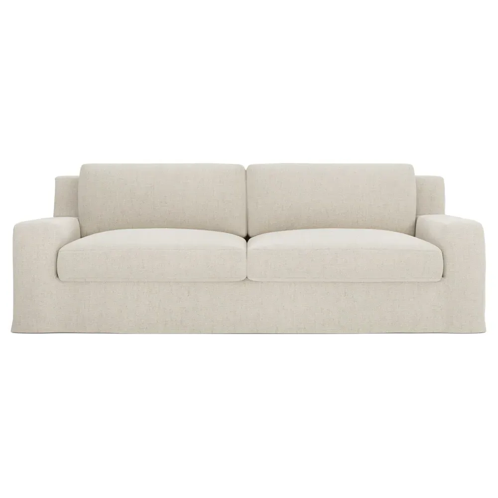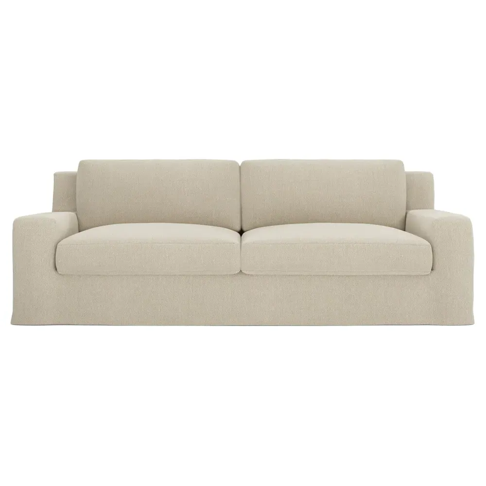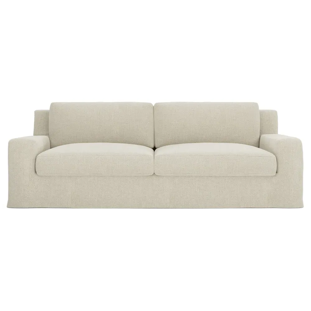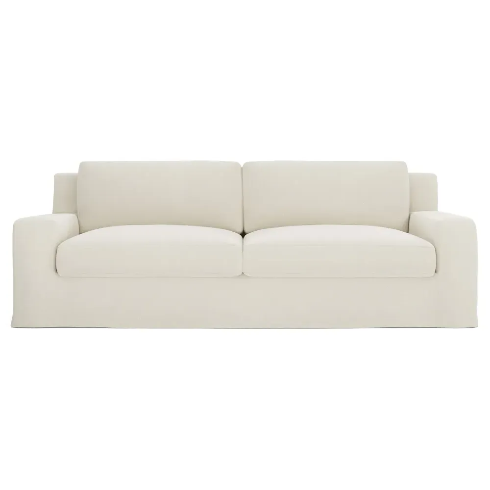 The Henri Slipcovered Sofa offers exceptional comfort with its deep seat and tapered back design. Its premium soy-based foam core is wrapped in an envelope of 90% feather and 10% duck down, providing plush yet supportive seating. The low track arms and removable slipcover add versatility, while the hardwood frame from certified sustainable forests ensures lasting durability. W228 x D99 x H76 cm.