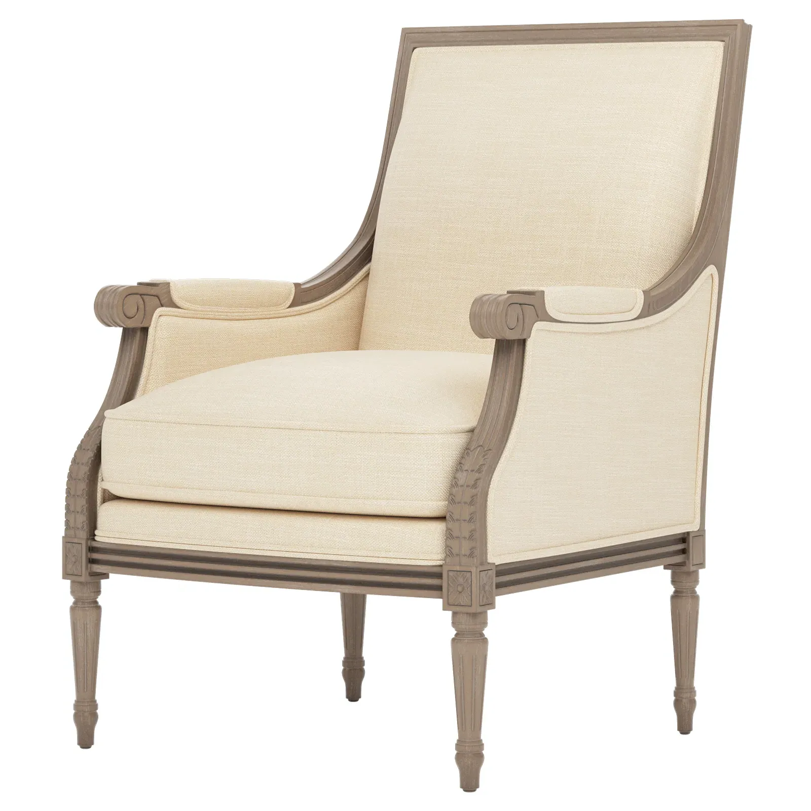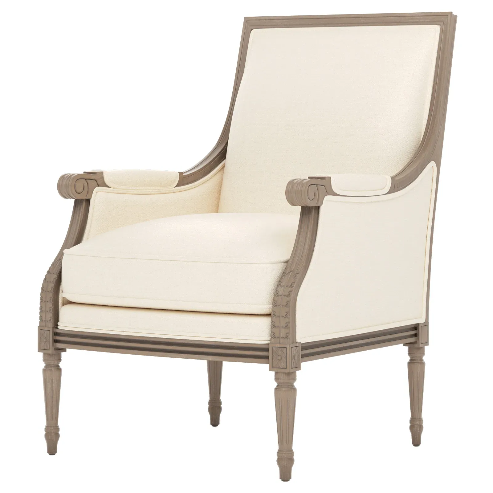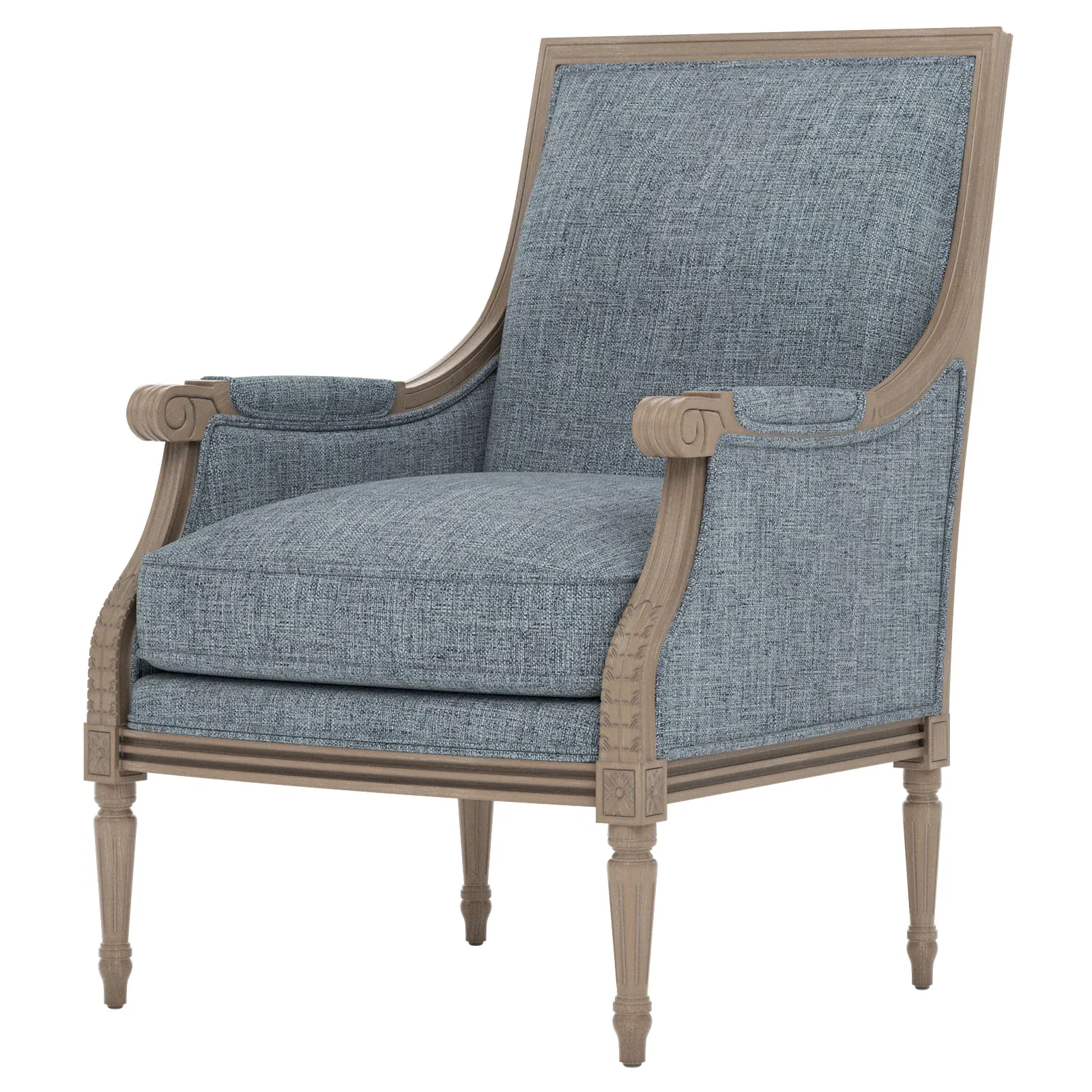 The Juliette Bergere Chair combines French-inspired design with luxurious comfort. Its hardwood frame features a driftwood finish, while the plush cushioning includes CertiPUR-US certified high-resiliency foam surrounded by feather and down fill. The channeled downproof jacket ensures lasting support and comfort. W66 x D79 x H99 cm.