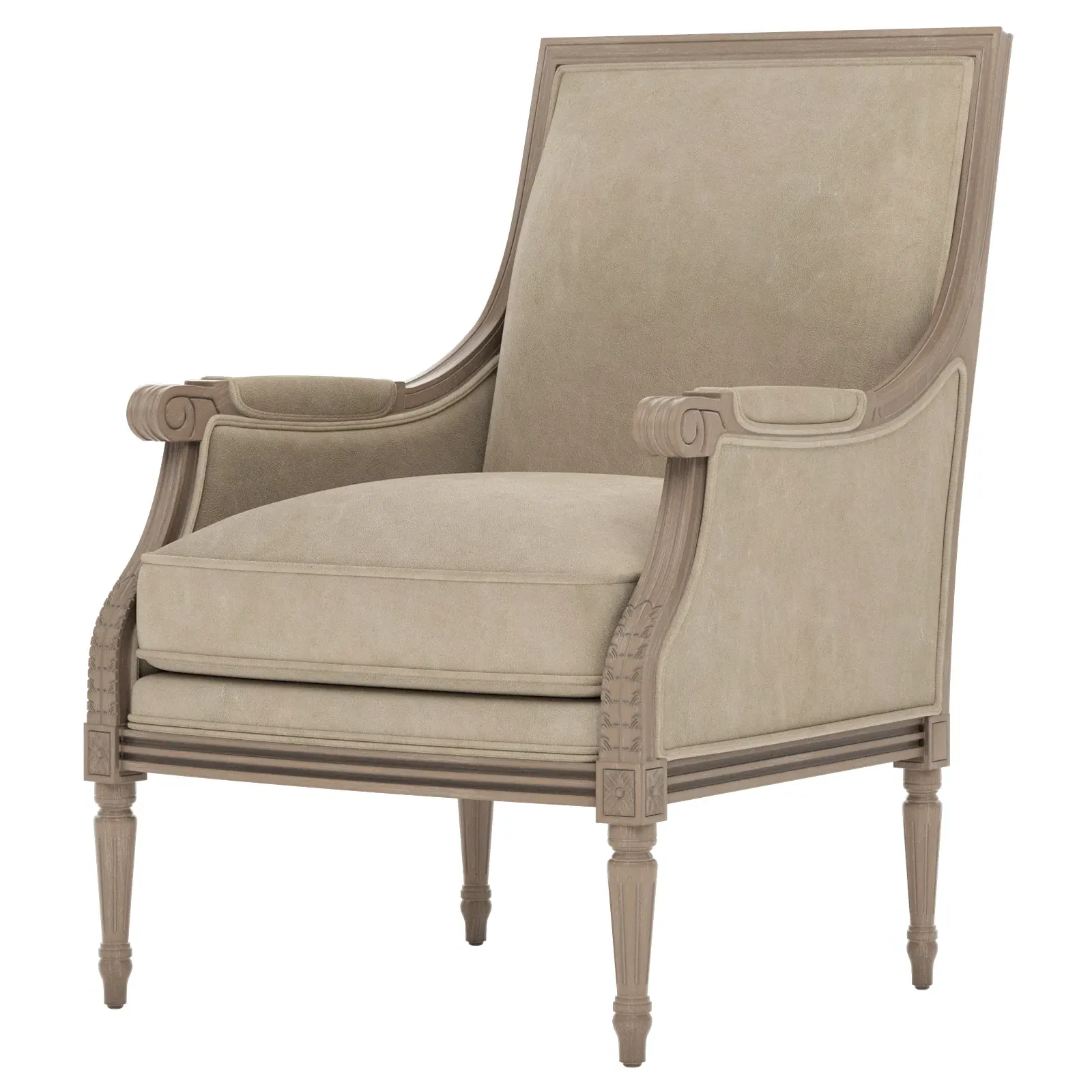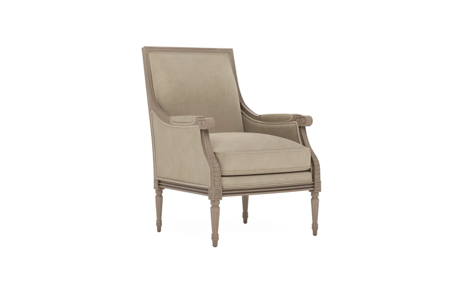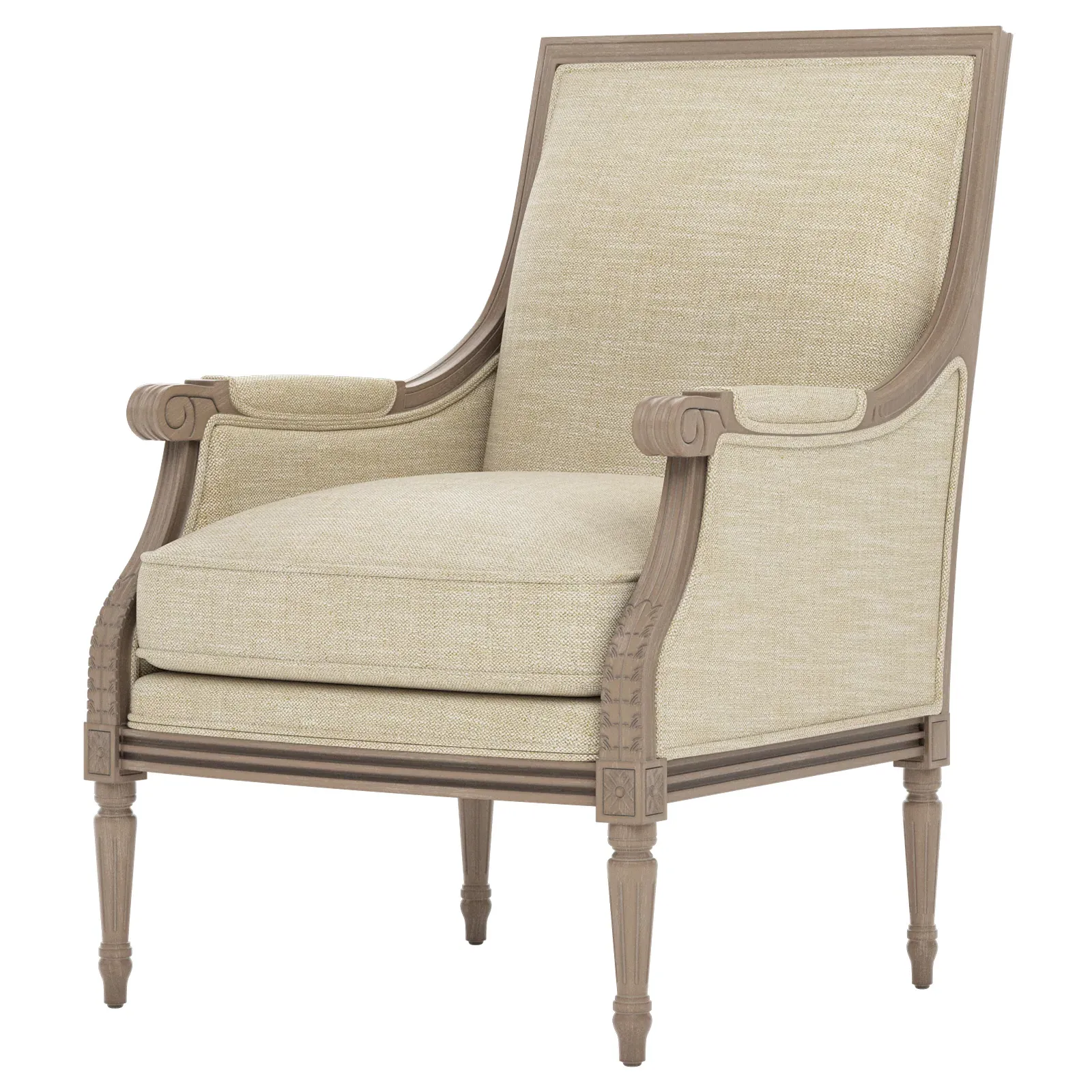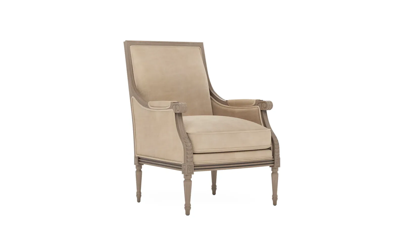The Juliette Bergere Chair combines French-inspired design with luxurious comfort. Its hardwood frame features a driftwood finish, while the plush cushioning includes CertiPUR-US certified high-resiliency foam surrounded by feather and down fill. The channeled downproof jacket ensures lasting support and comfort. W66 x D79 x H99 cm.