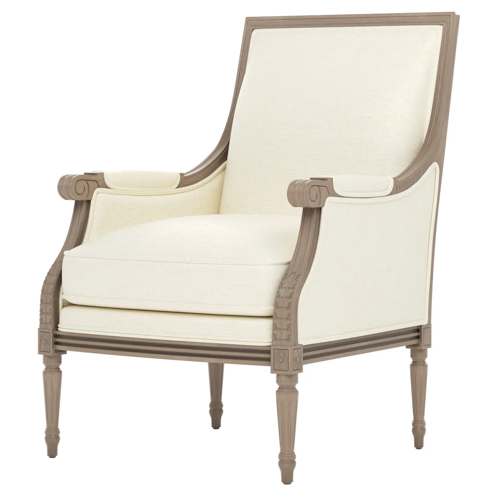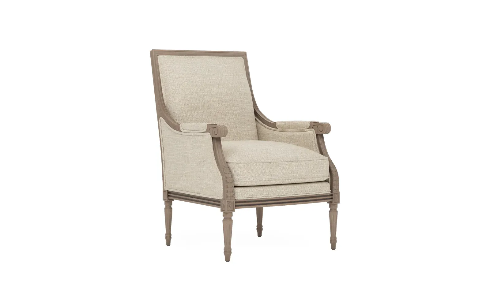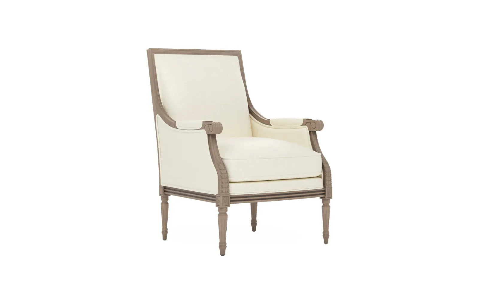 <b>Overall Dimensions: </b> 26" W x 31" D x 39" H. <b>Seat Dimensions:</b> 20” W x 21” D x 19” H; <b>Arm Height: </b> 25”; <b>Leg Height:</b> 10”. <b>Materials:</b> Hardwood. <b>Material Finish:</b> Driftwood. <b>Cushion Fill:</b> A CertiPUR-US® certified, 2.3-density, high-resiliency Ultracel foam core is surrounded by a convoluted foam layer and inserted into a channeled downproof jacket filled with 50% polyester fiber and 50% feather and down.