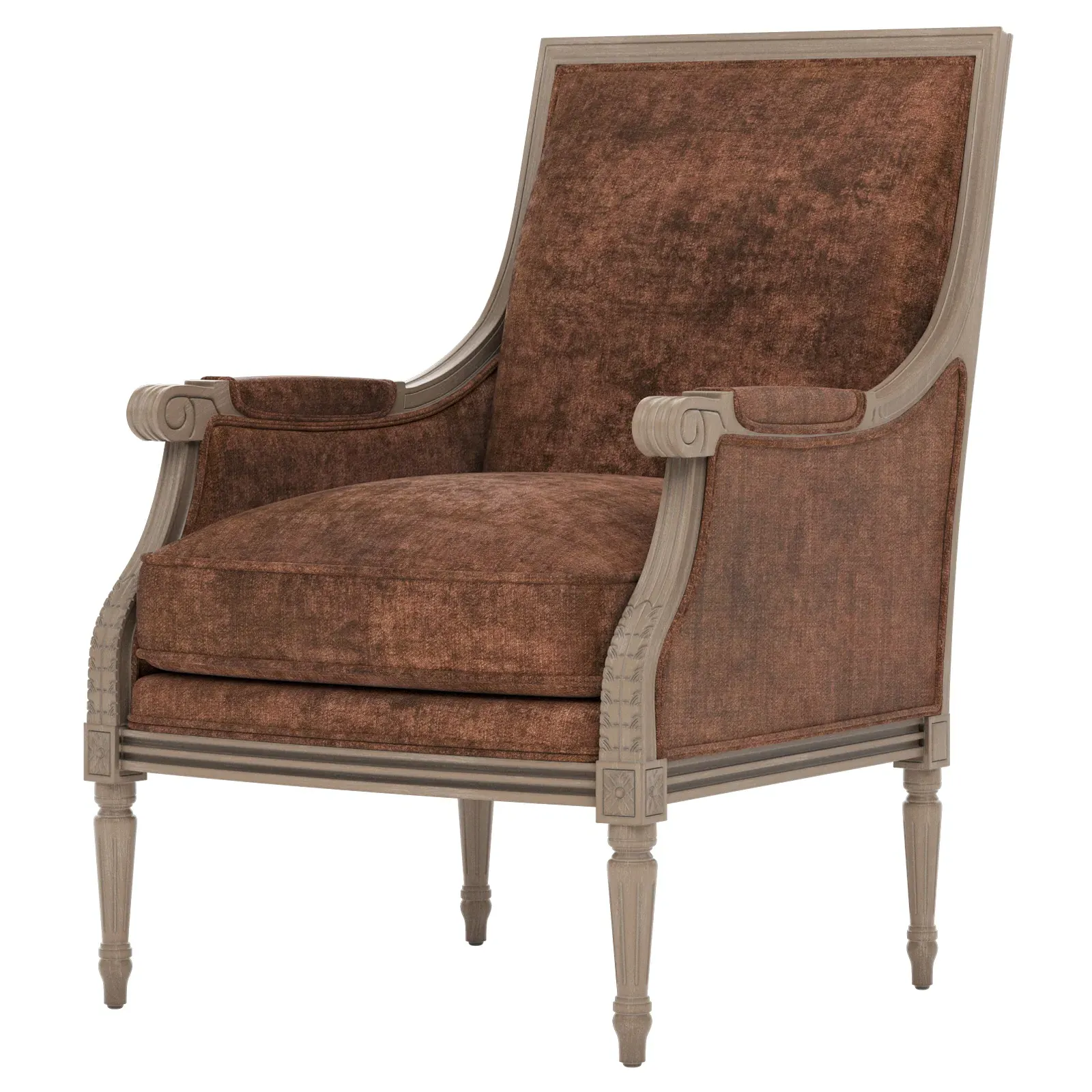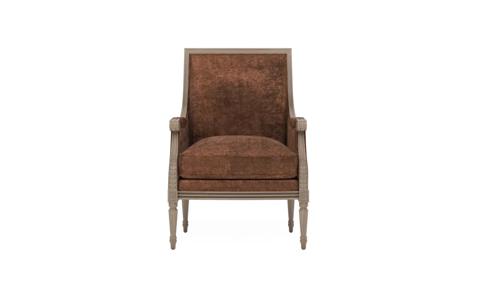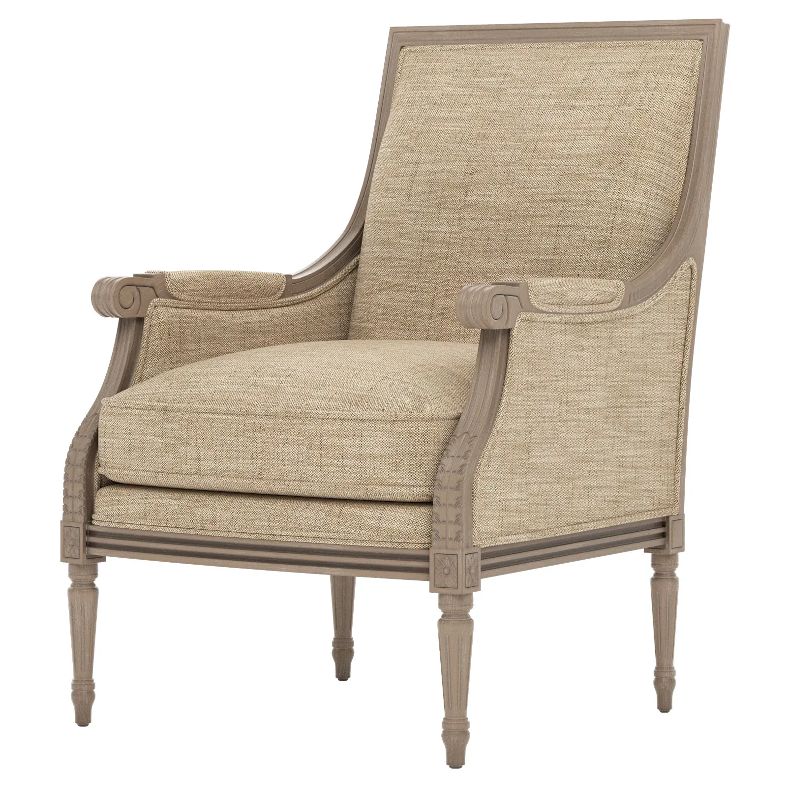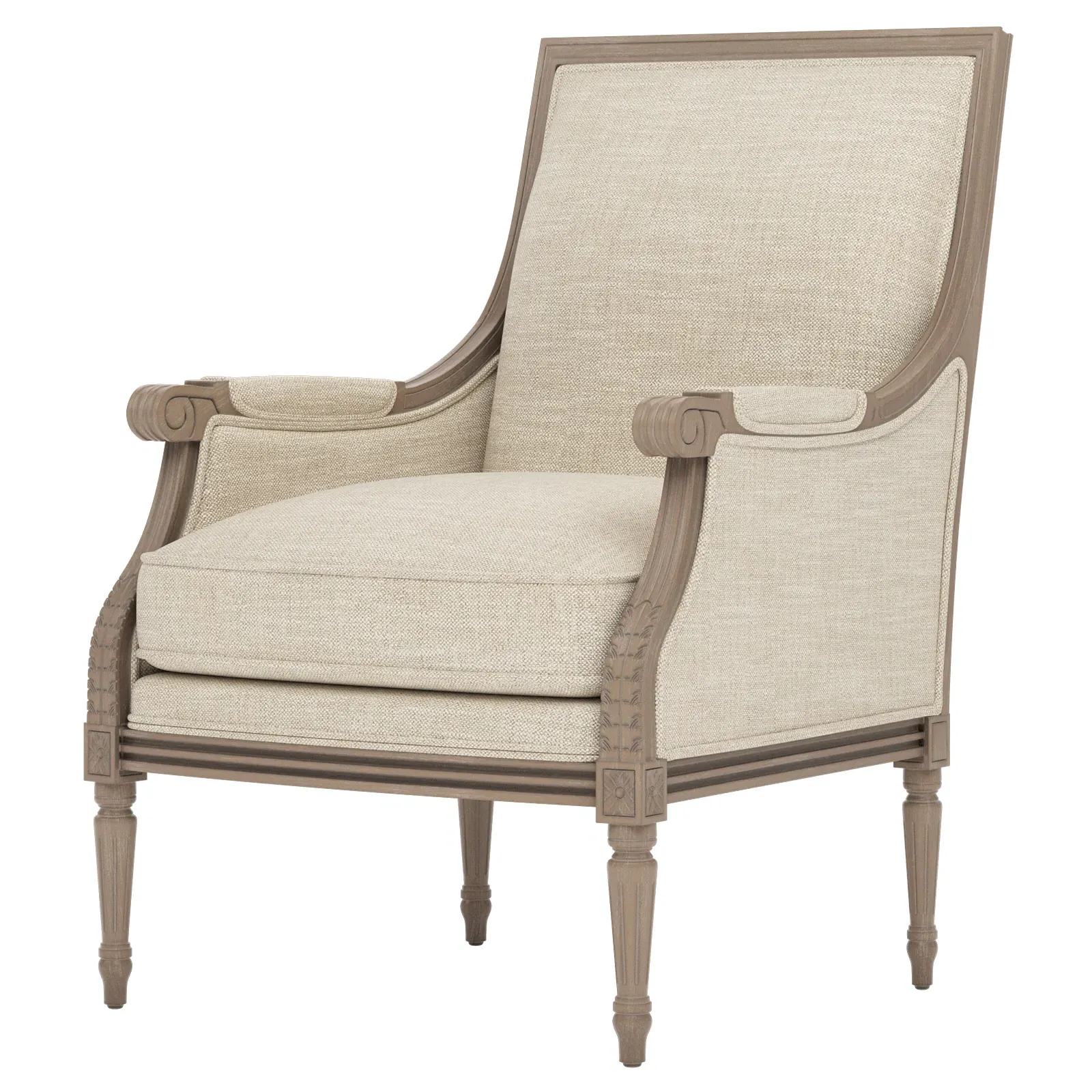 <b>Overall Dimensions: </b> 26" W x 31" D x 39" H. <b>Seat Dimensions:</b> 20” W x 21” D x 19” H; <b>Arm Height: </b> 25”; <b>Leg Height:</b> 10”. <b>Materials:</b> Hardwood. <b>Material Finish:</b> Driftwood. <b>Cushion Fill:</b> A CertiPUR-US® certified, 2.3-density, high-resiliency Ultracel foam core is surrounded by a convoluted foam layer and inserted into a channeled downproof jacket filled with 50% polyester fiber and 50% feather and down.
