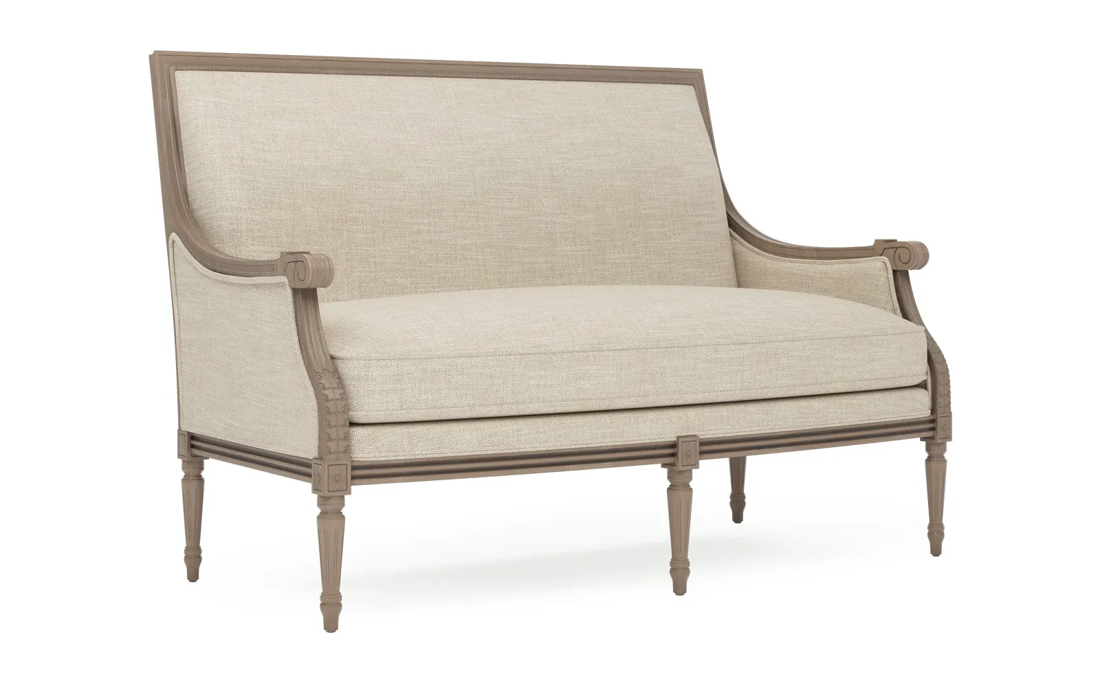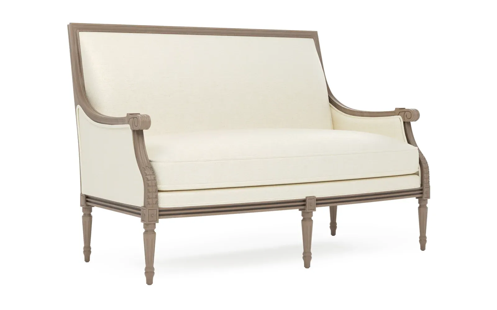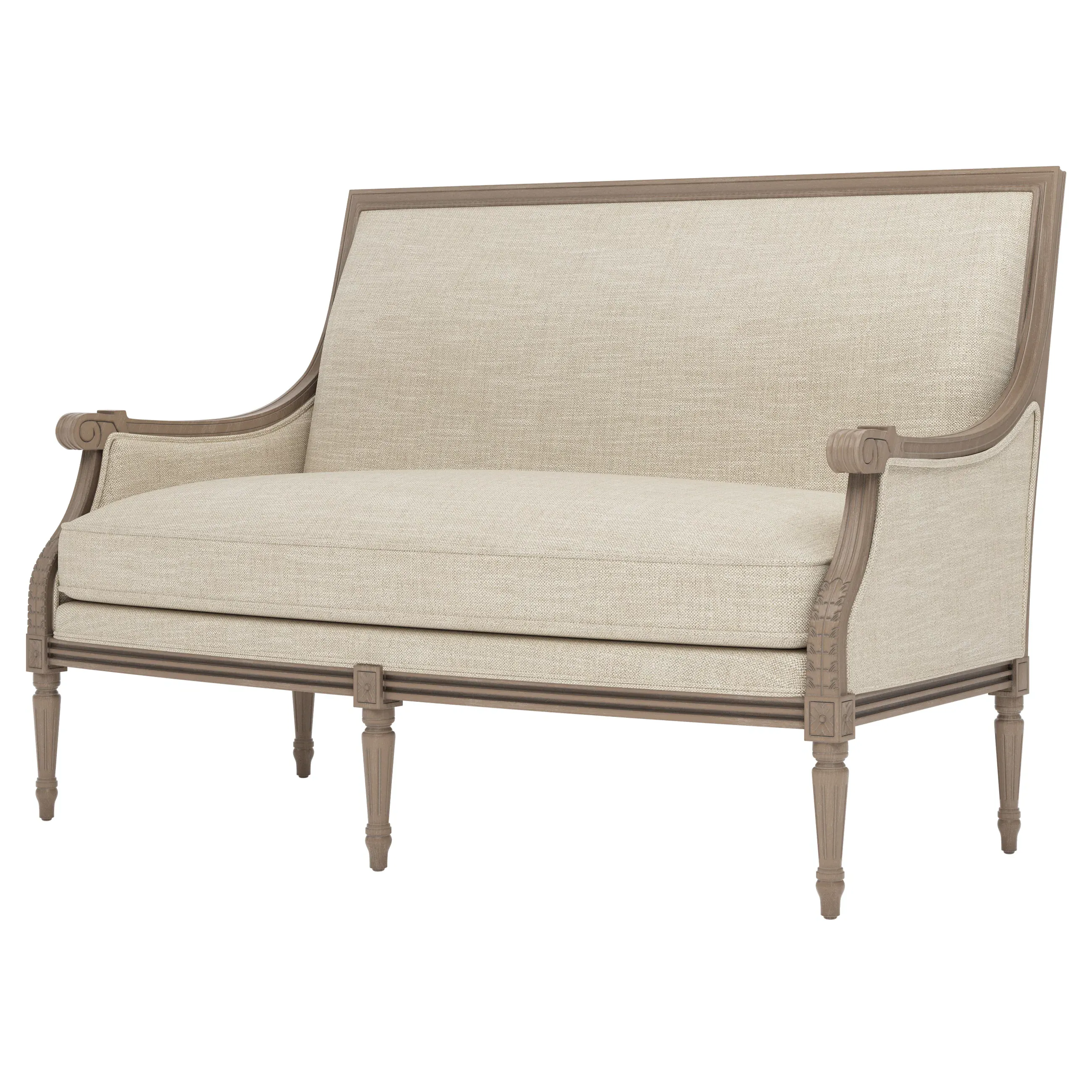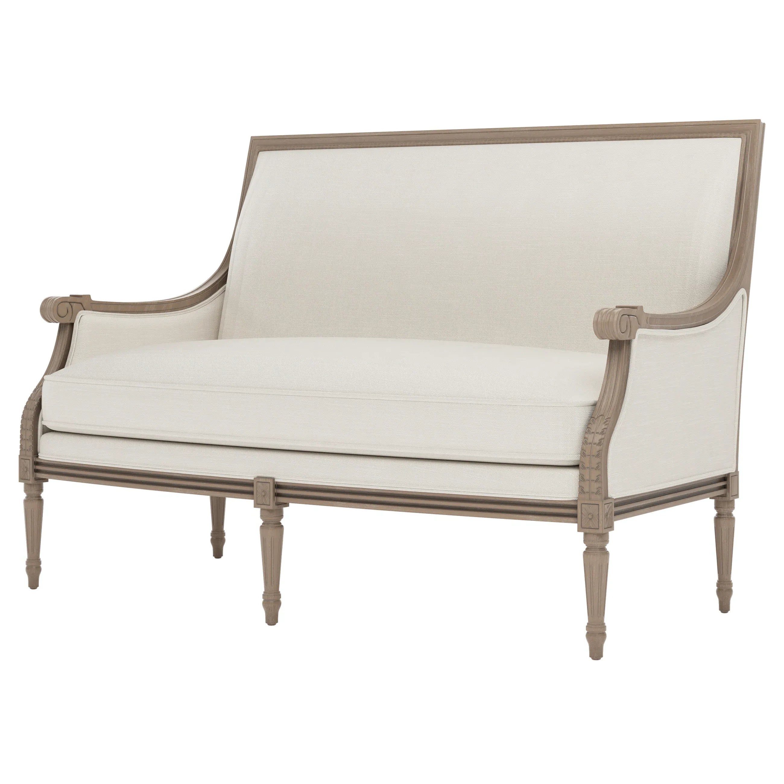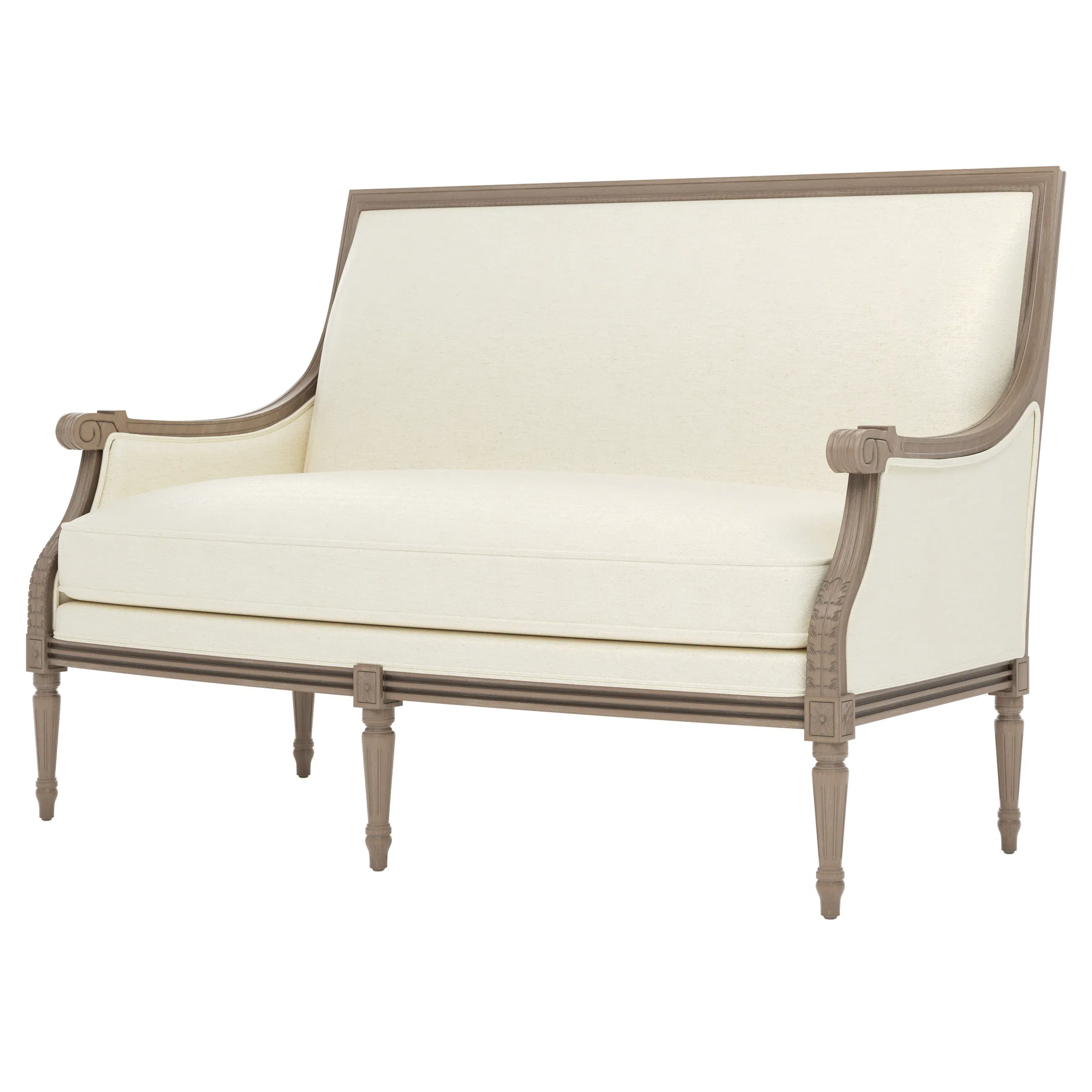 <b>Overall Dimensions:</b> 56" W x 31" D x 39" H. <b>Seat Dimensions:</b> 48” W x 21” D x 19” H; <b>Arm Height:</b> 25”; <b>Leg Height:</b> 10”. <b>Materials:</b> Hardwood. <b>Material Finish:</b> Driftwood. <b>Cushion Fill:</b> A CertiPUR-US® certified, 2.3-density, high-resiliency Ultracel foam core is surrounded by a convoluted foam layer and inserted into a channeled downproof jacket filled with 50% polyester fiber and 50% feather and down.