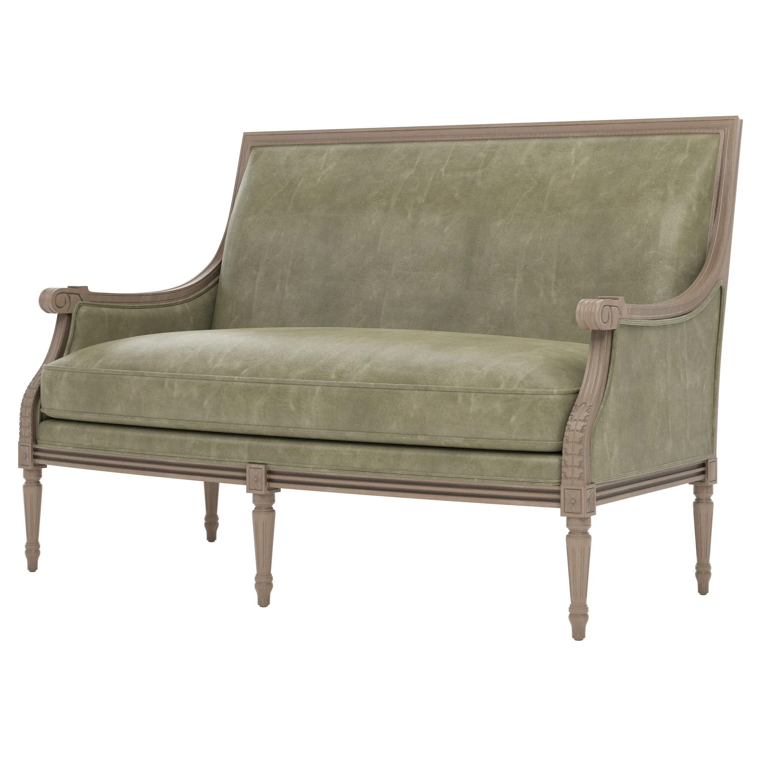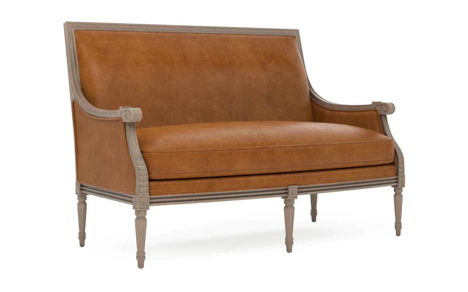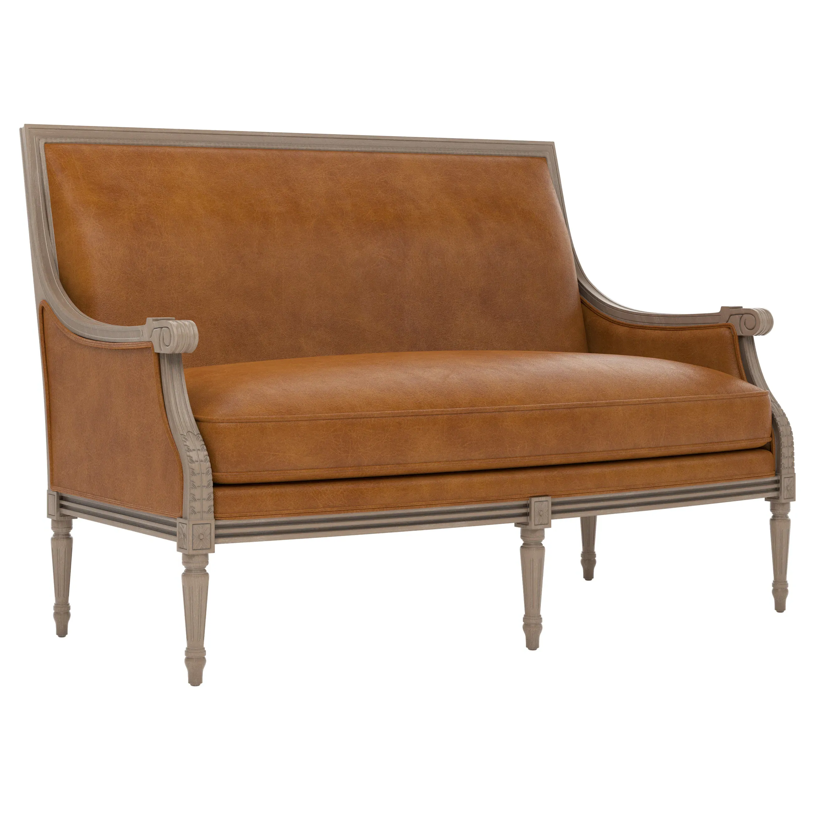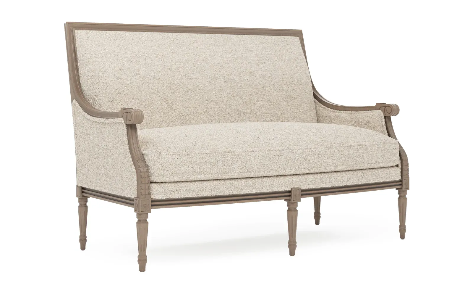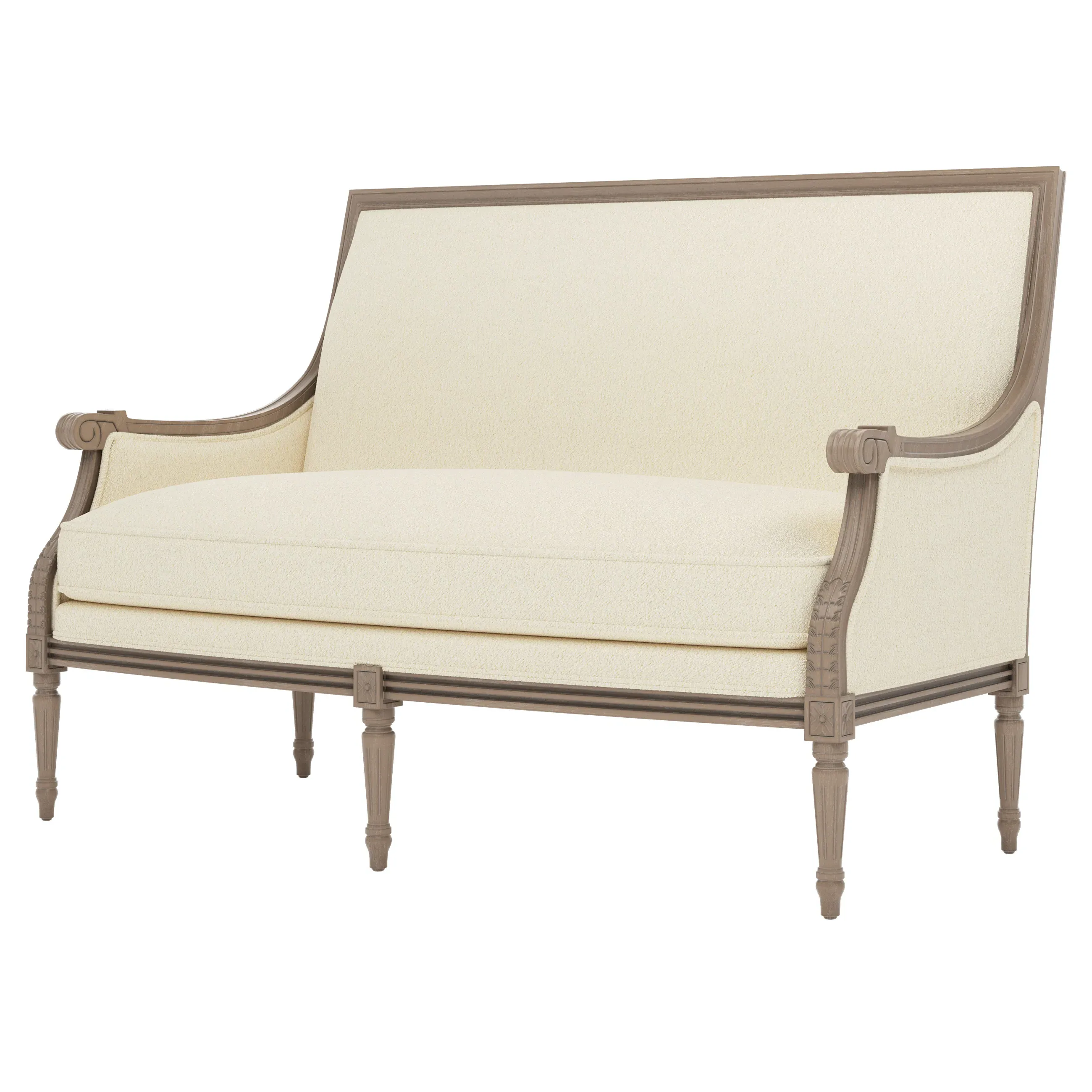 <b>Overall Dimensions:</b> 56" W x 31" D x 39" H. <b>Seat Dimensions:</b> 48” W x 21” D x 19” H; <b>Arm Height:</b> 25”; <b>Leg Height:</b> 10”. <b>Materials:</b> Hardwood. <b>Material Finish:</b> Driftwood. <b>Cushion Fill:</b> A CertiPUR-US® certified, 2.3-density, high-resiliency Ultracel foam core is surrounded by a convoluted foam layer and inserted into a channeled downproof jacket filled with 50% polyester fiber and 50% feather and down.