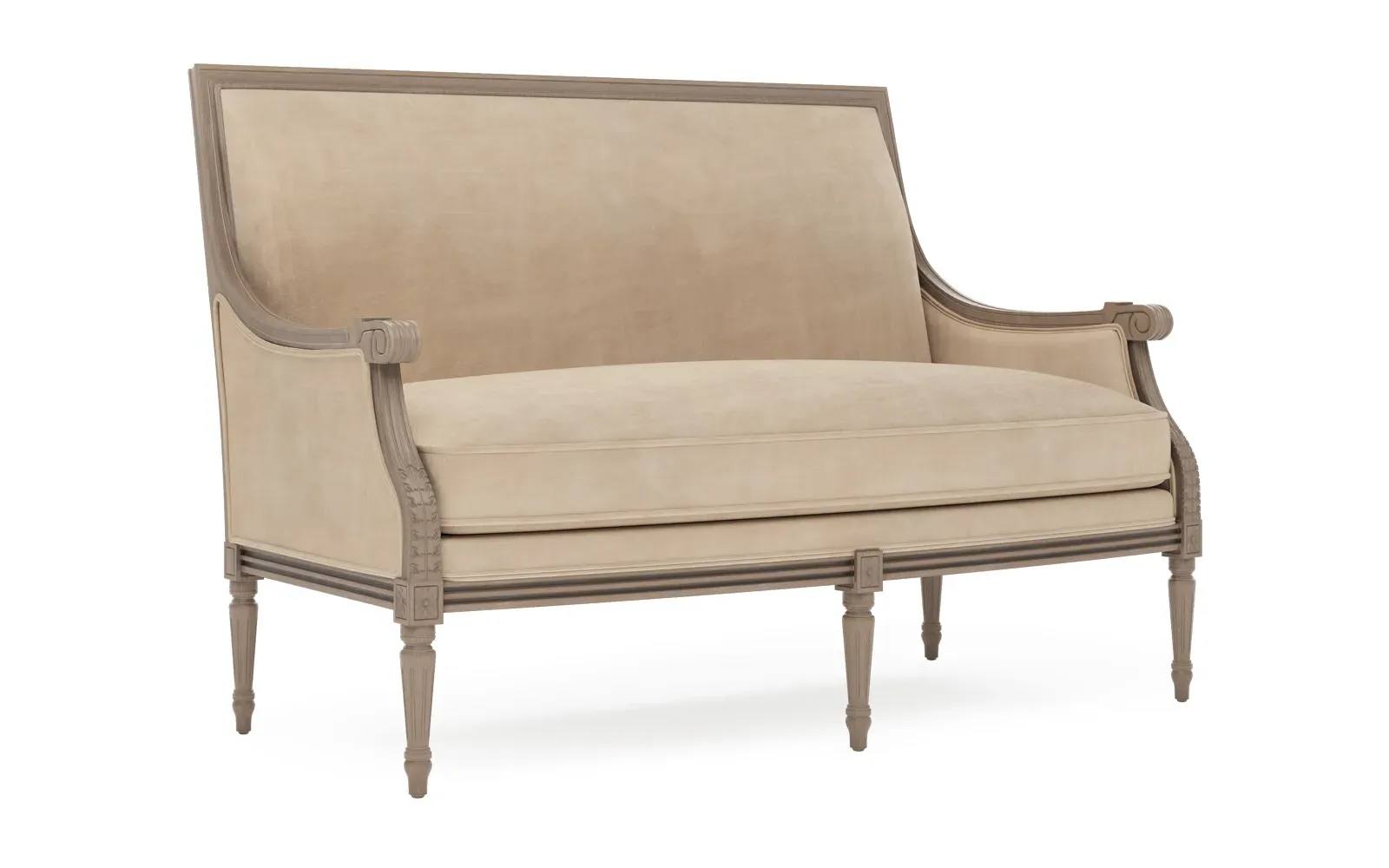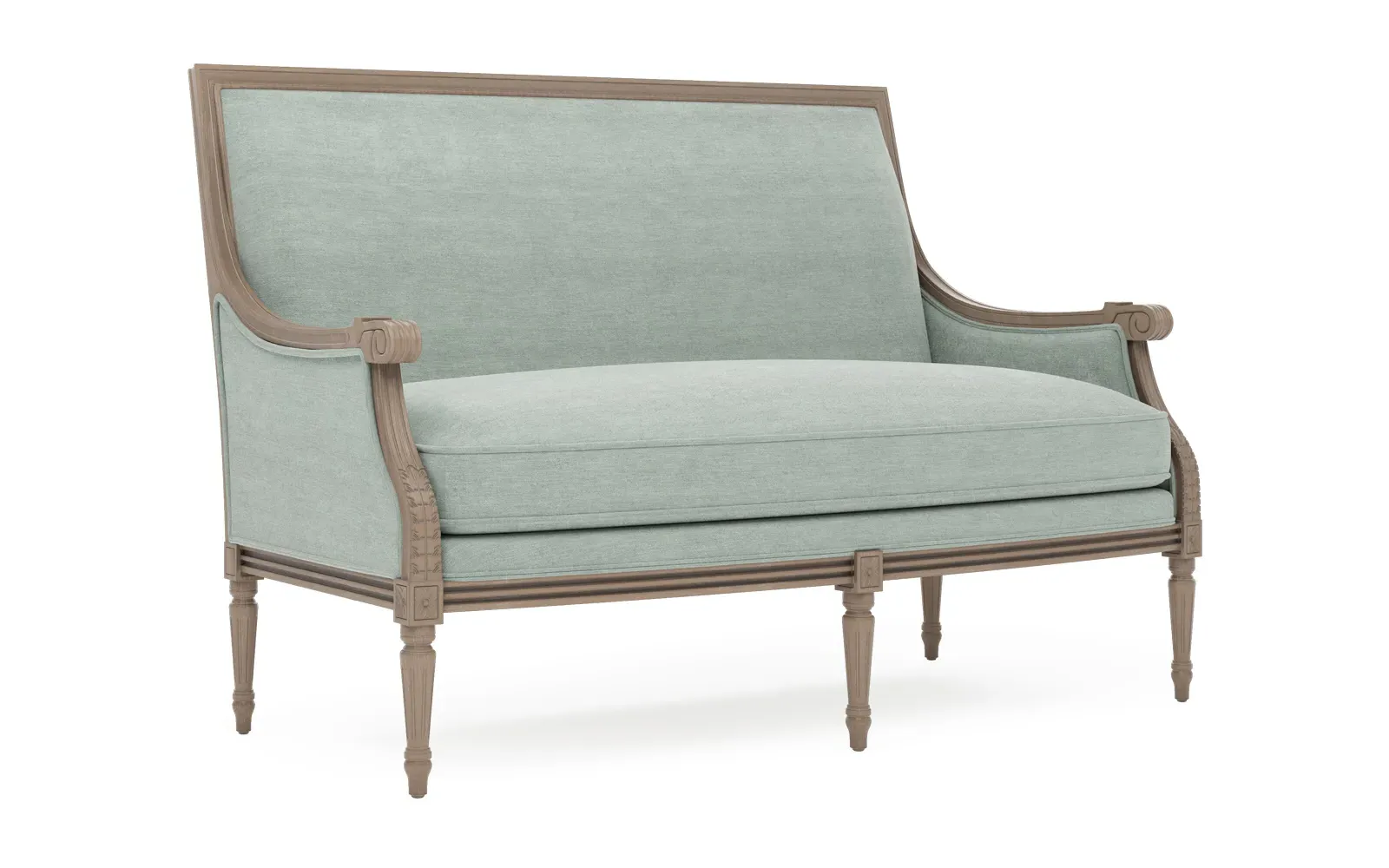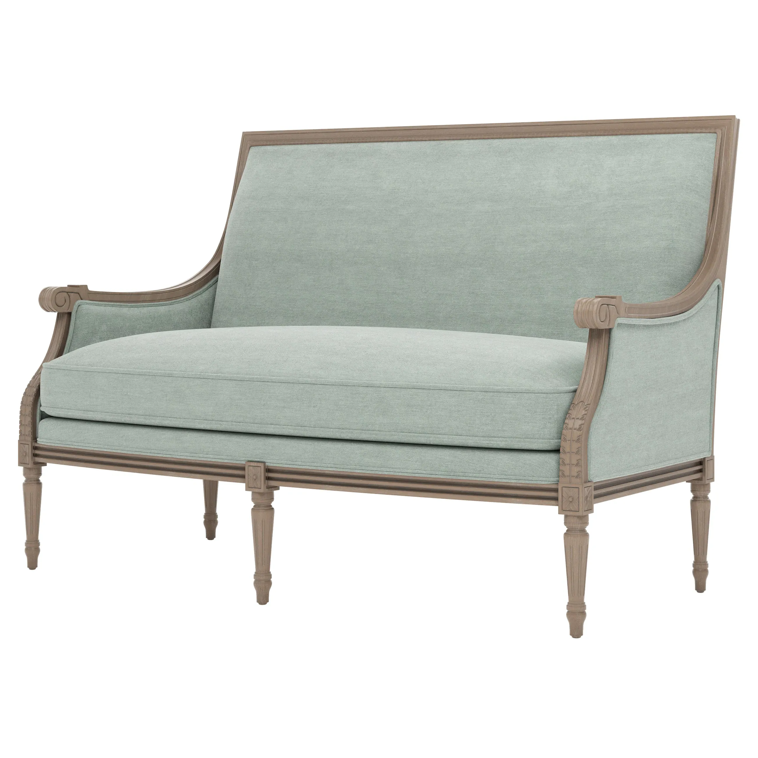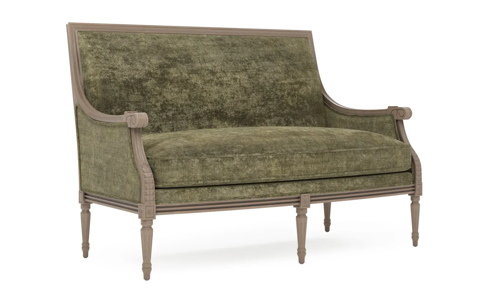 The Juliette settee combines comfort with its velvet upholstery and driftwood hardwood frame. Its CertiPUR-US certified foam core provides high-resiliency support, while the convoluted foam layer and feather-down blend adds luxurious comfort. The channeled downproof jacket ensures durability, and the hardwood construction with driftwood finish offers lasting stability. W142 x D79 x H99 cm.