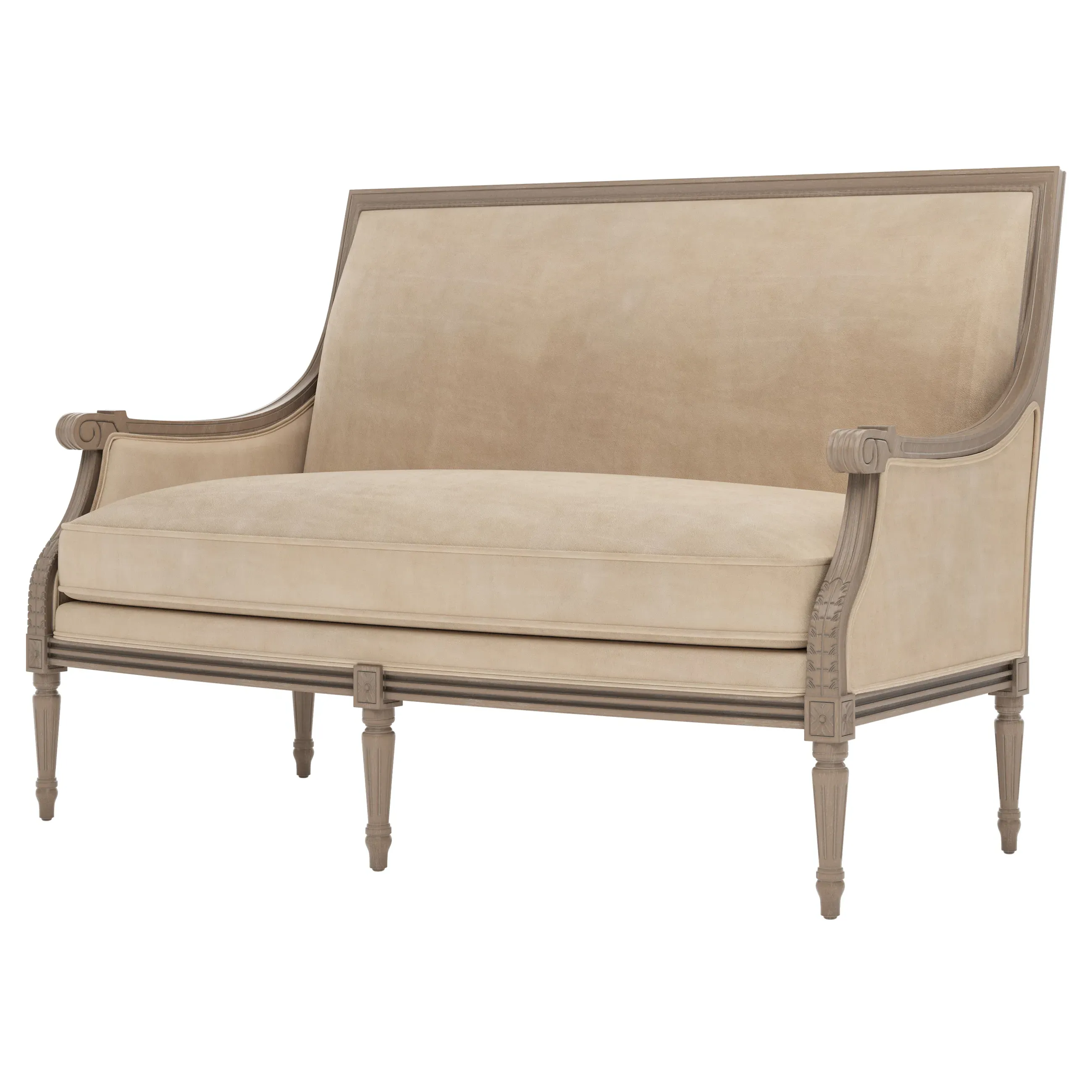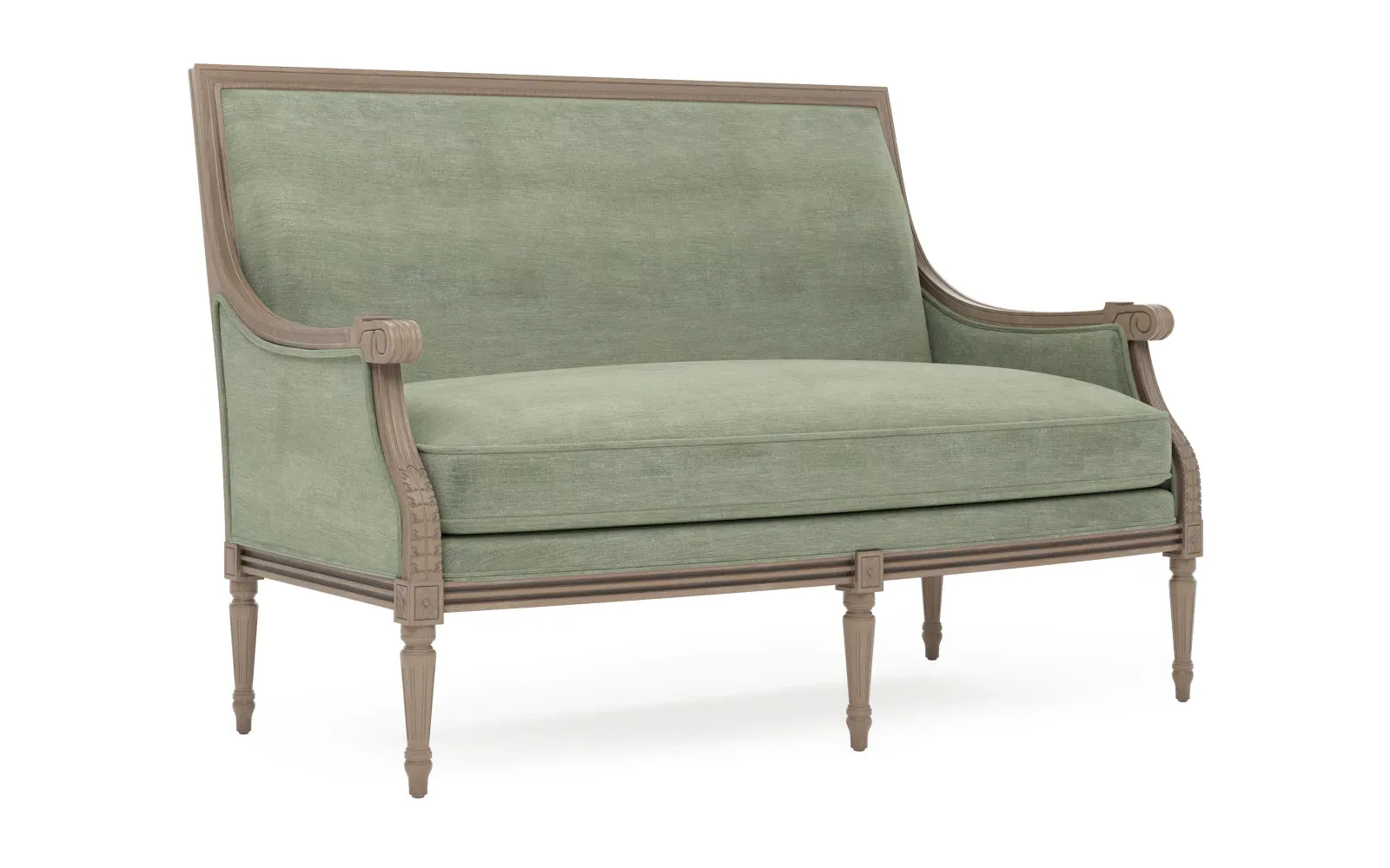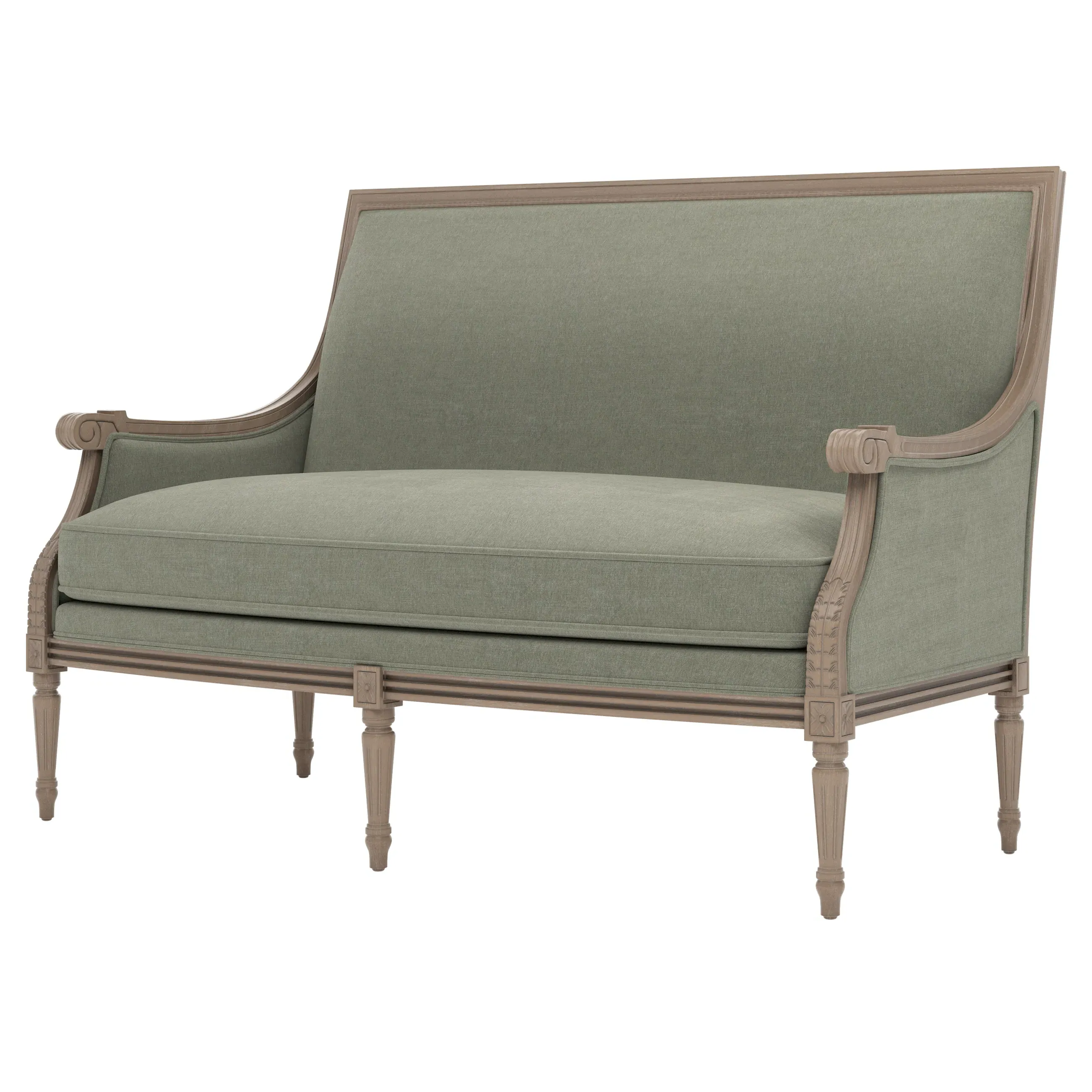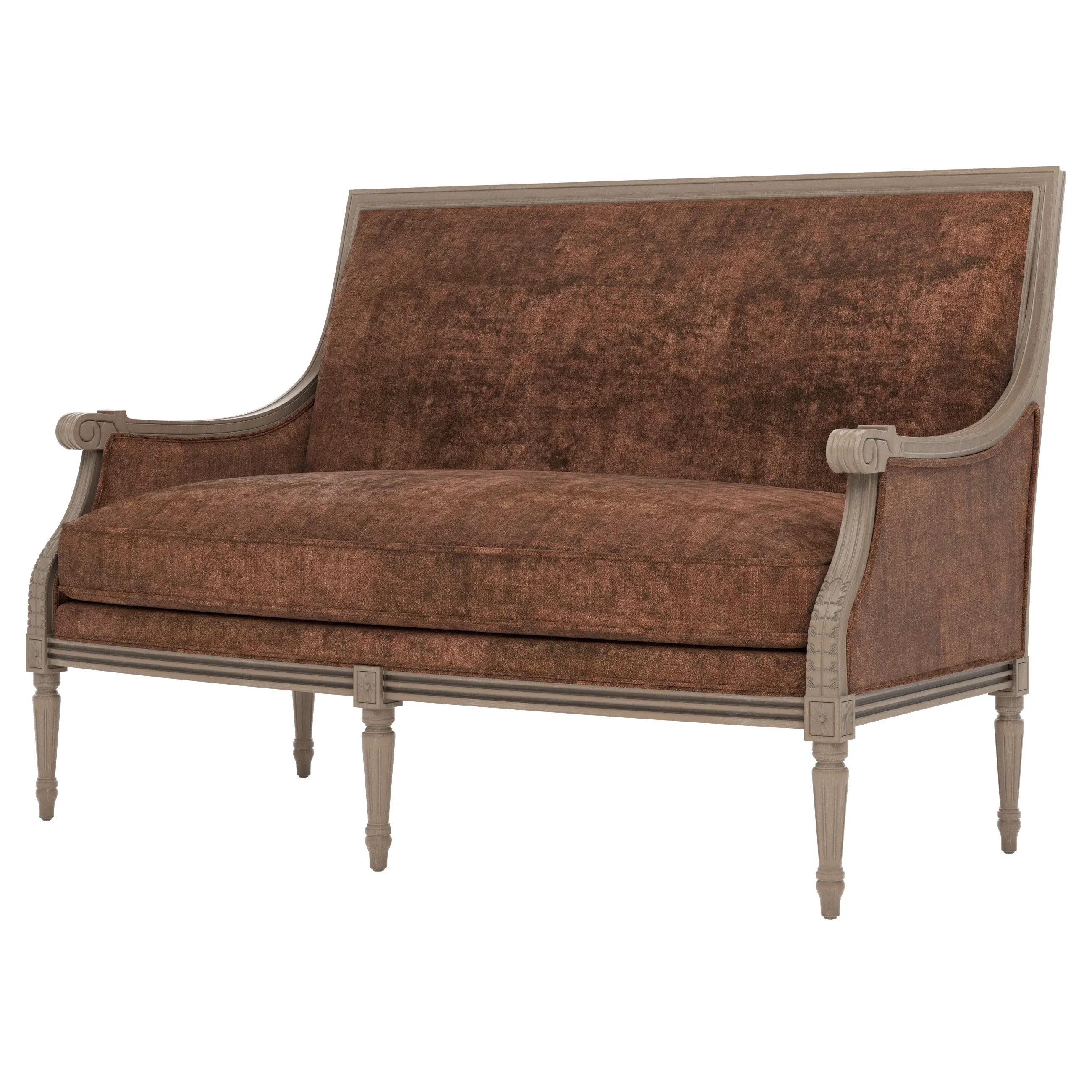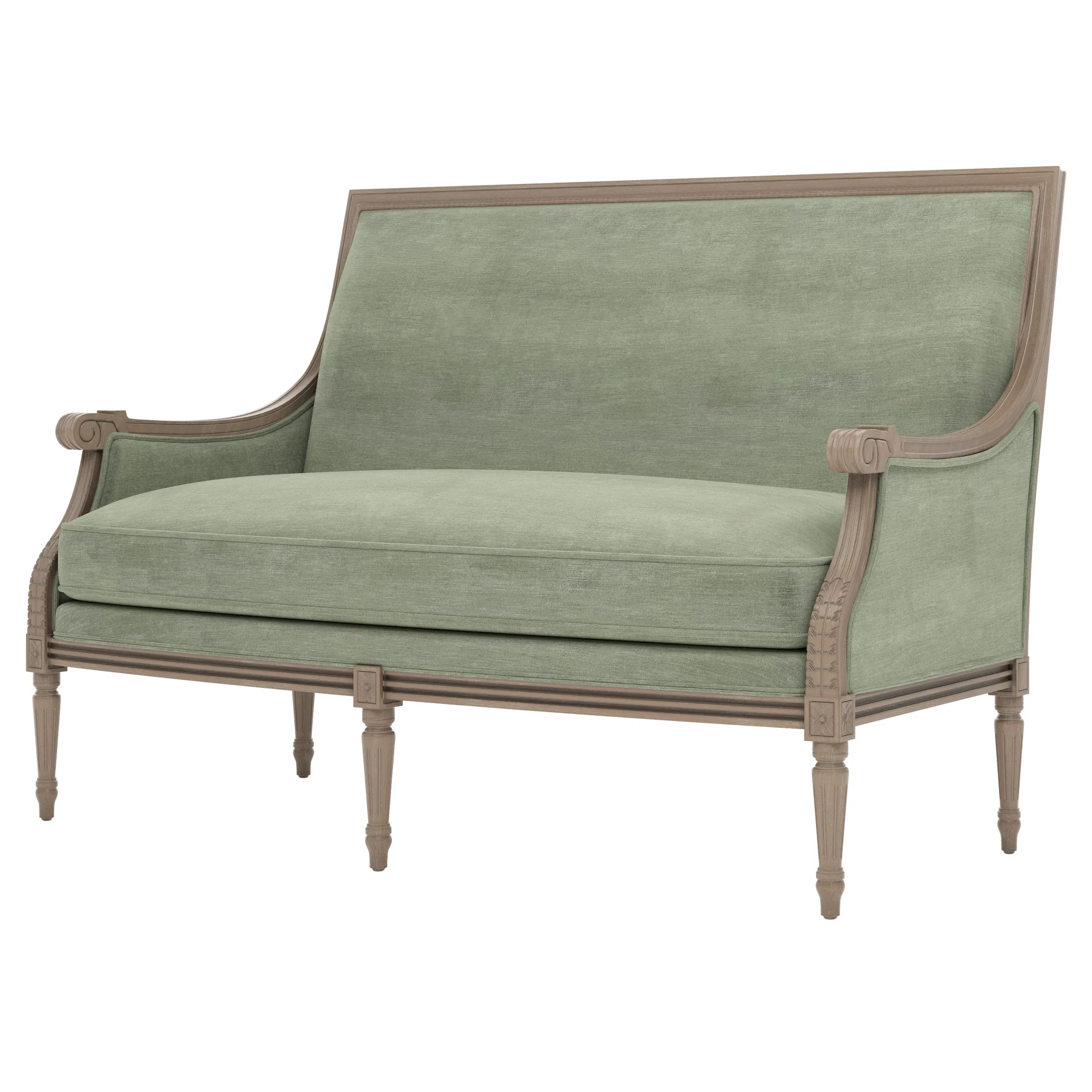The Juliette settee combines comfort with its velvet upholstery and driftwood hardwood frame. Its CertiPUR-US certified foam core provides high-resiliency support, while the convoluted foam layer and feather-down blend adds luxurious comfort. The channeled downproof jacket ensures durability, and the hardwood construction with driftwood finish offers lasting stability. W142 x D79 x H99 cm.