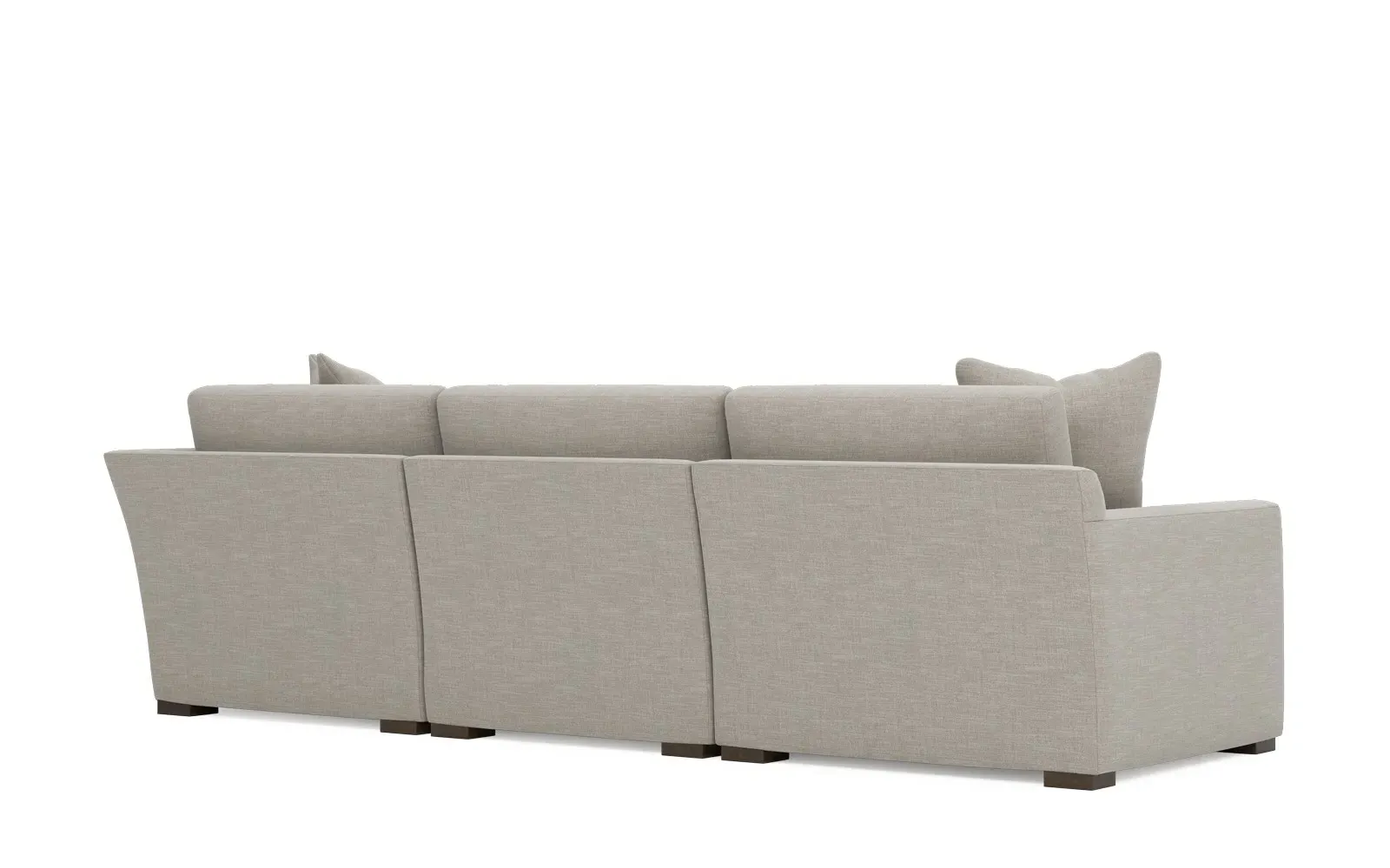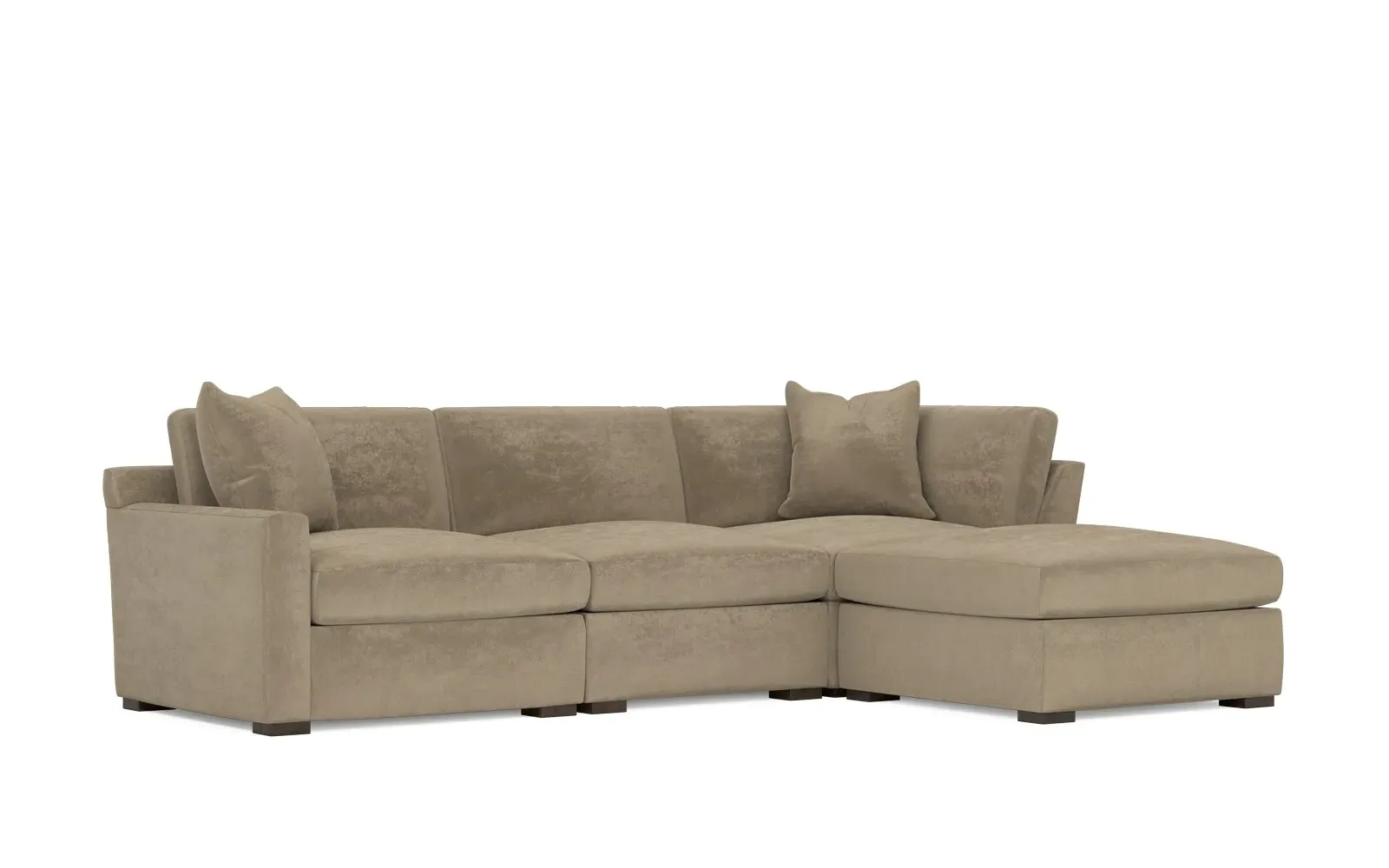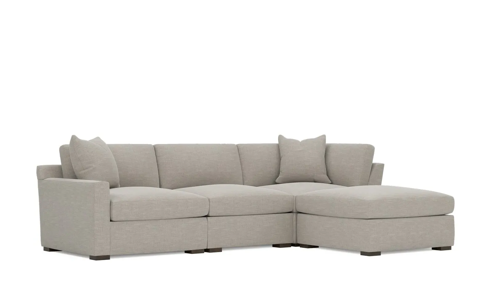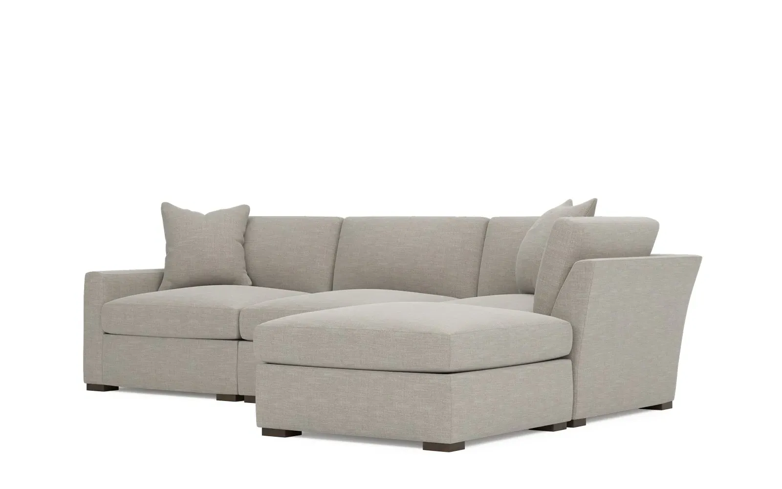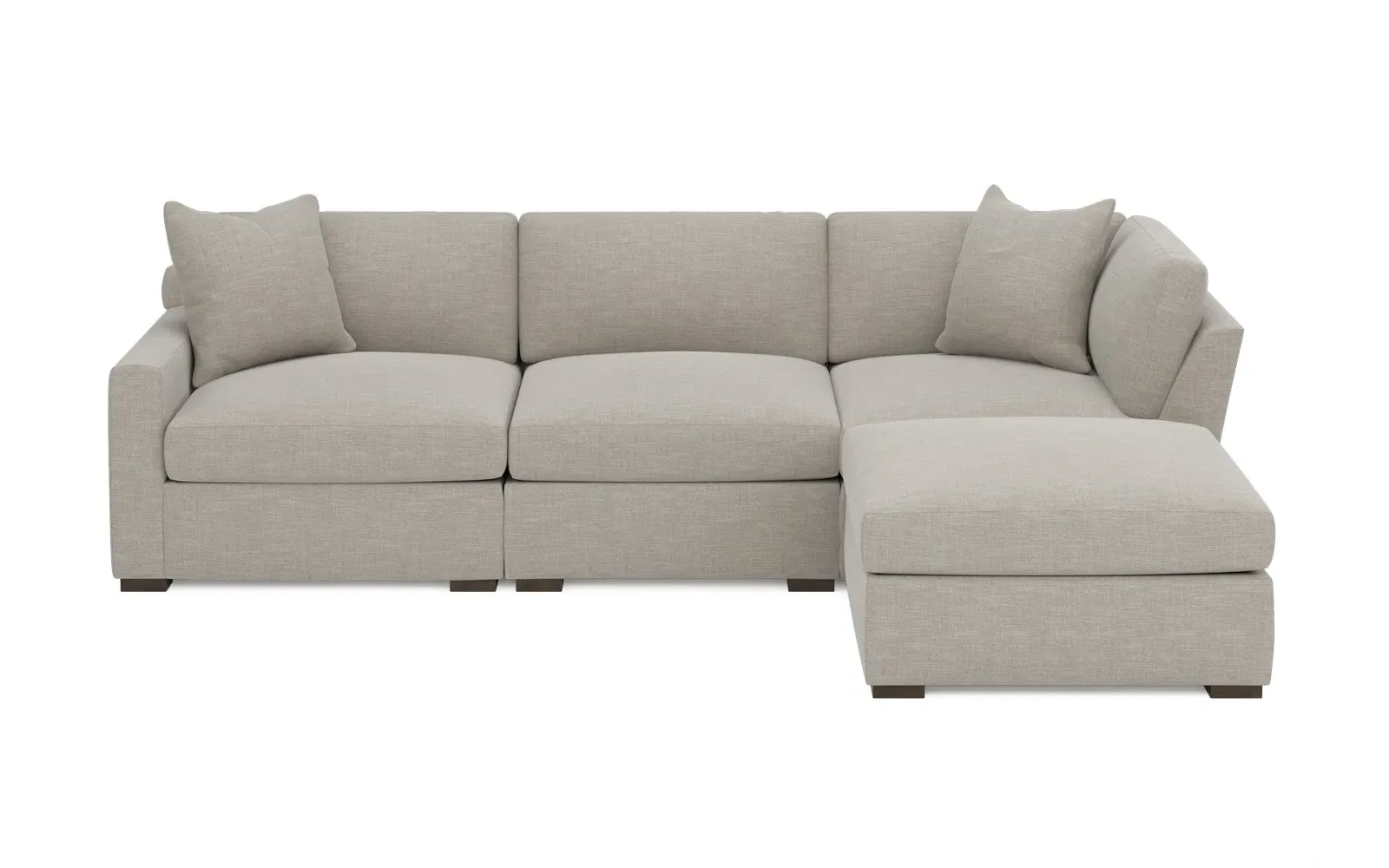 The Kamryn sectional offers versatile seating with its modular 4-piece configuration, featuring an ottoman, corner seat, armless seat, and single seat. Its FSC-certified kiln-dried hardwood frame provides lasting durability, while the espresso-finished legs add stability. The modular design allows for flexible arrangement, and the 24-inch arm height ensures comfortable lounging. W292 x D193 x H94 cm.