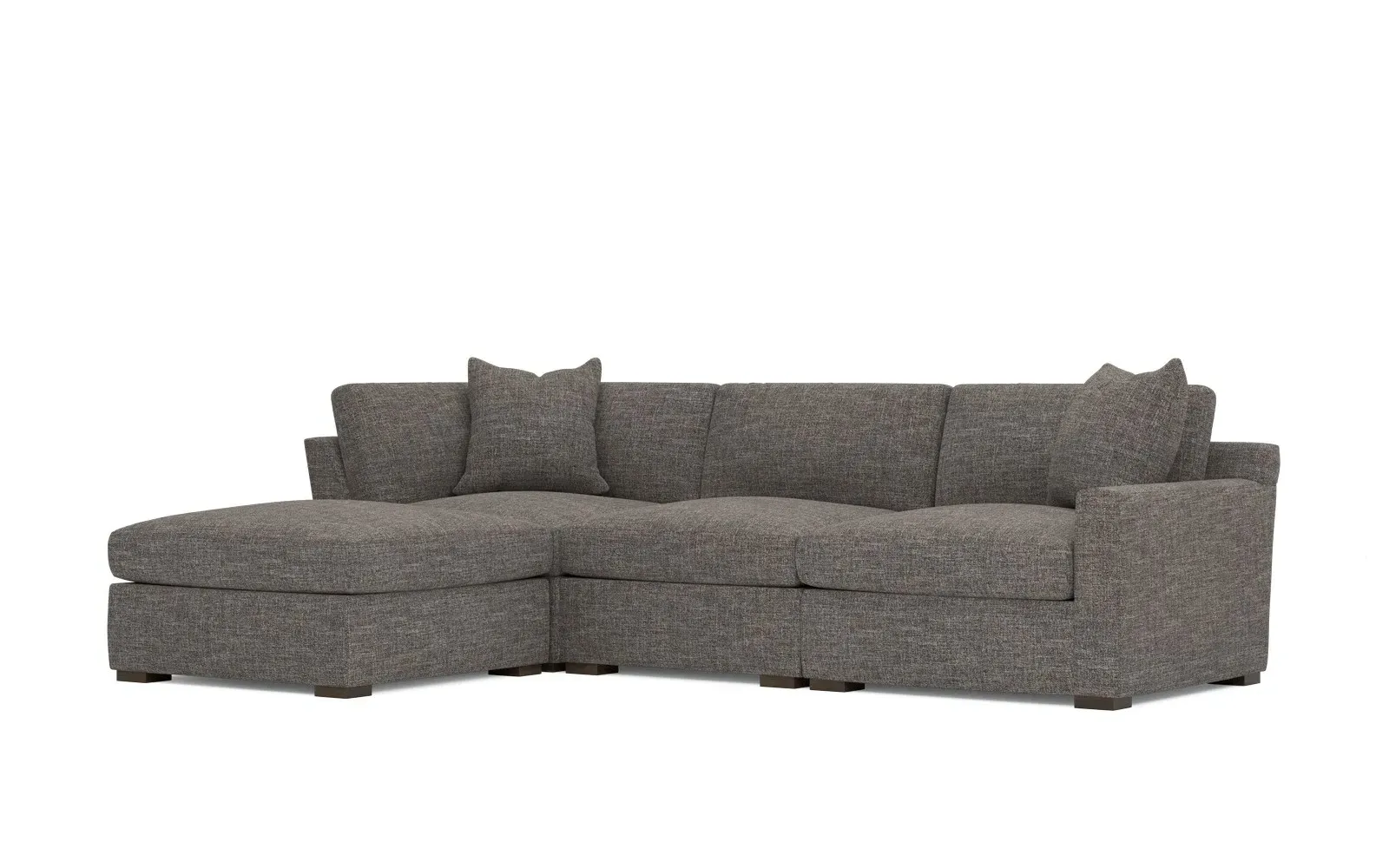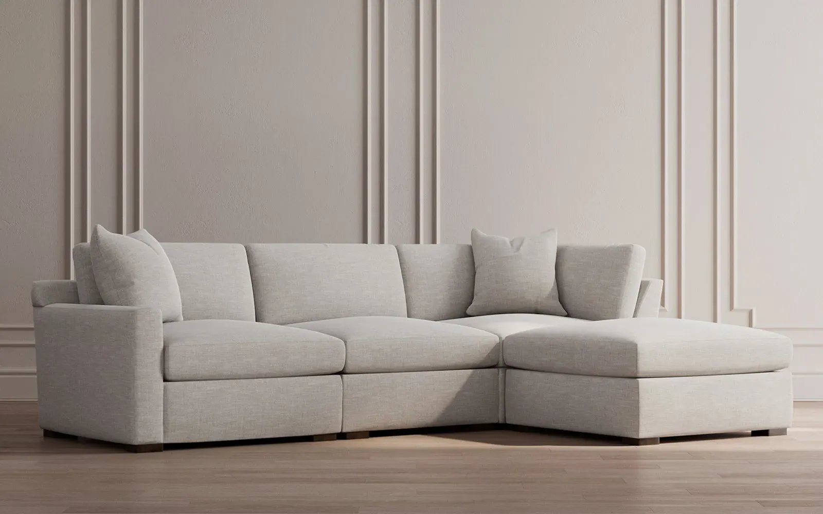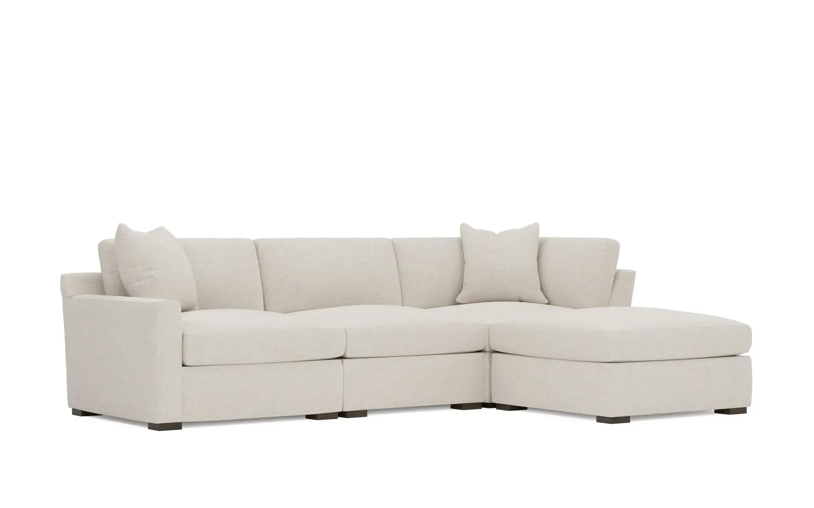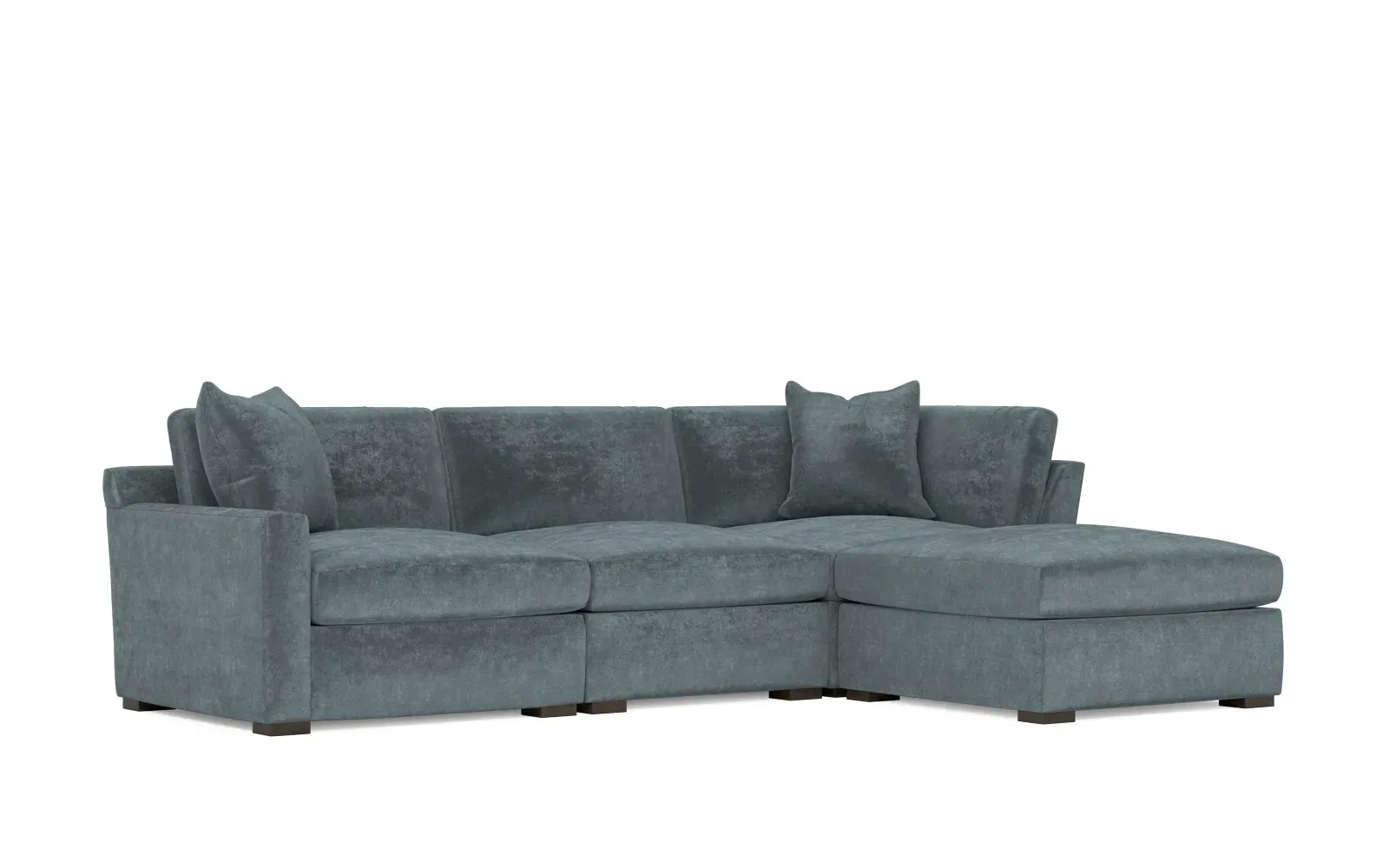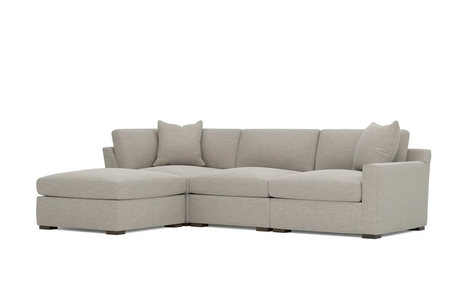 The Kamryn sectional offers versatile seating with its modular 4-piece configuration, featuring an ottoman, corner seat, armless seat, and single seat. Its FSC-certified kiln-dried hardwood frame provides lasting durability, while the espresso-finished legs add stability. The modular design allows for flexible arrangement, and the 24-inch arm height ensures comfortable lounging. W292 x D193 x H94 cm.