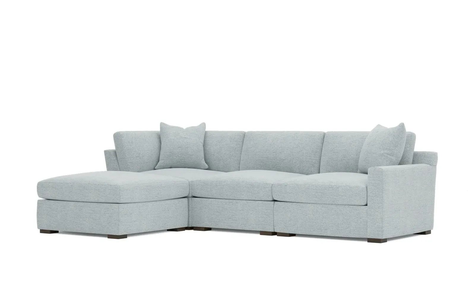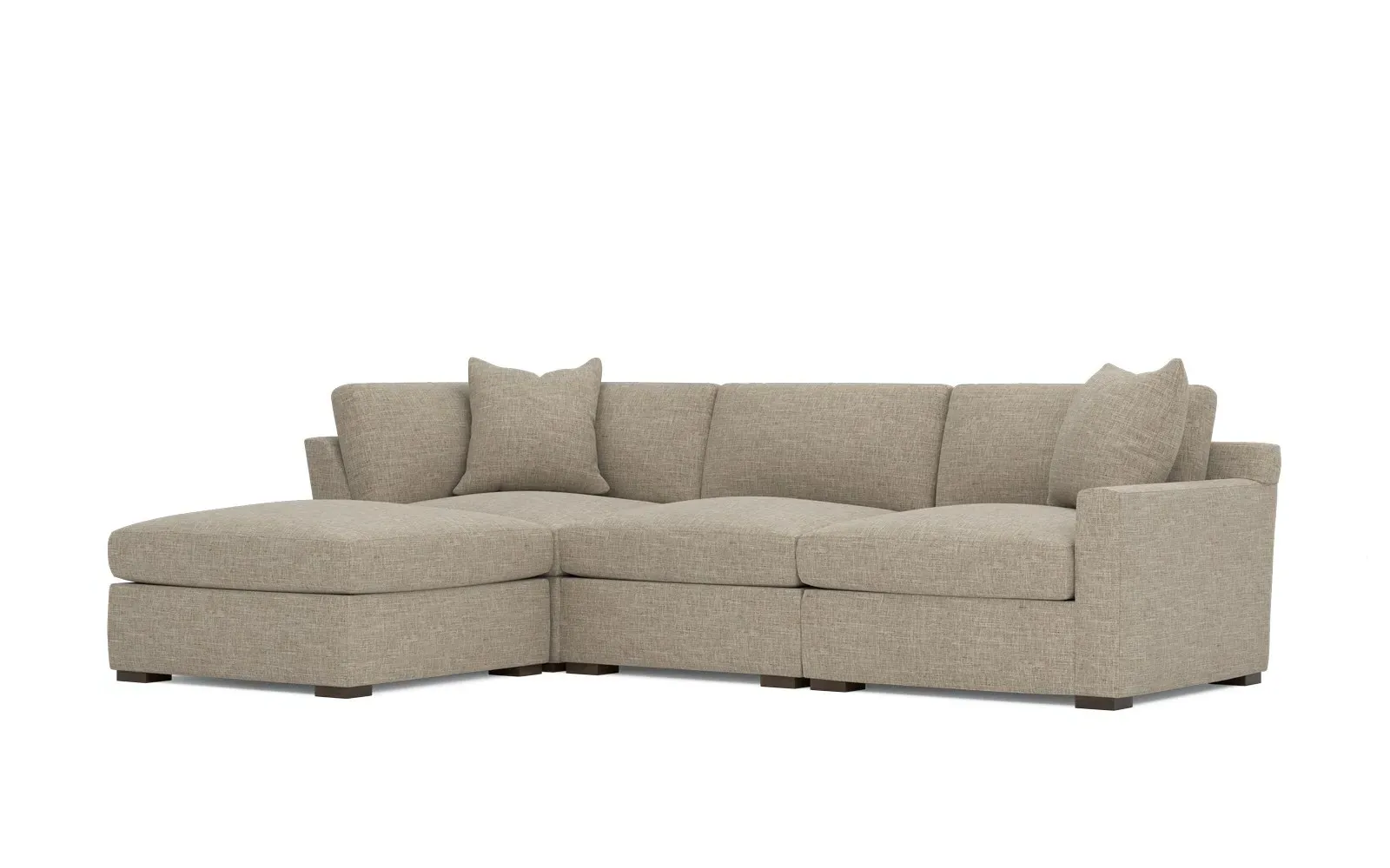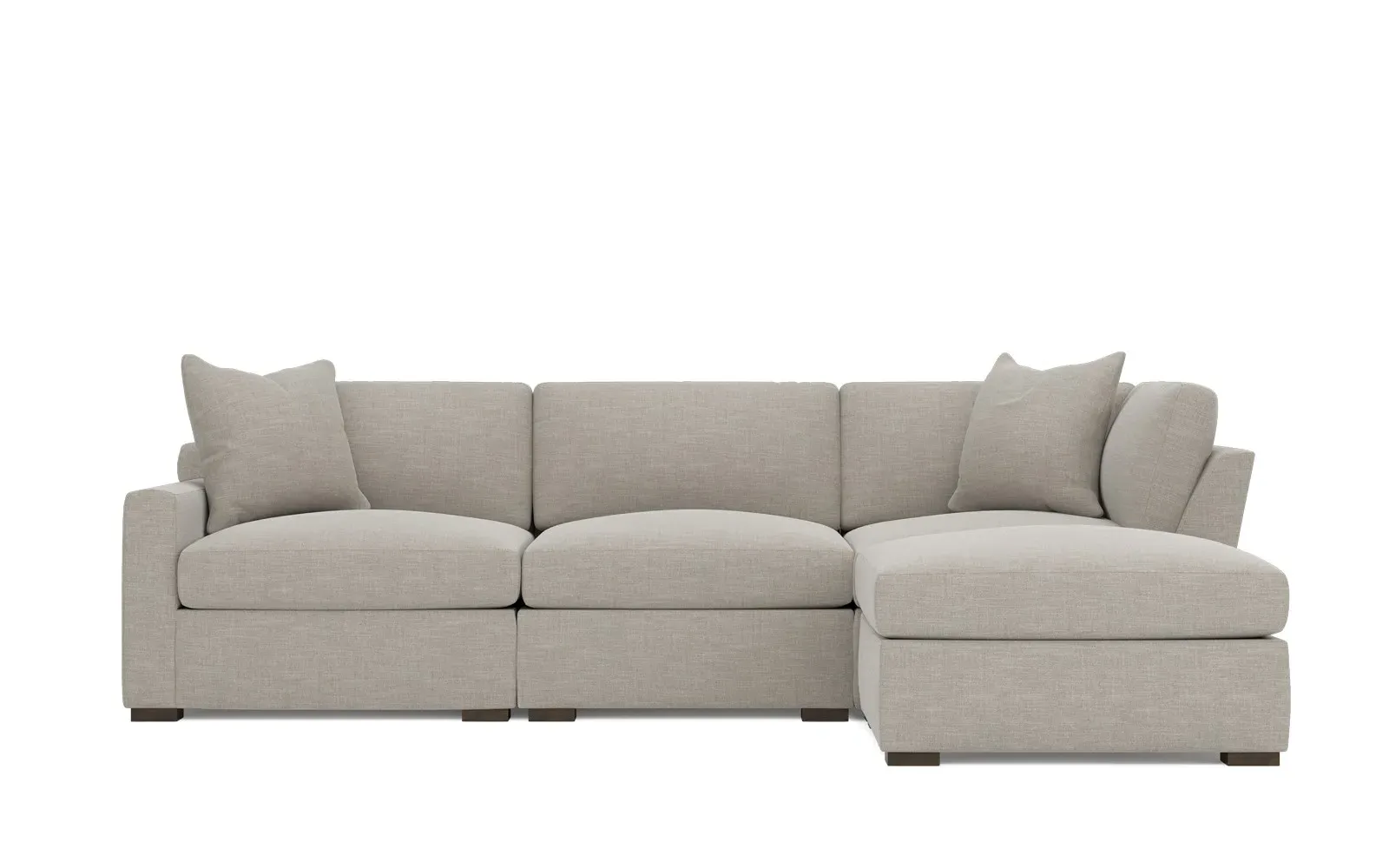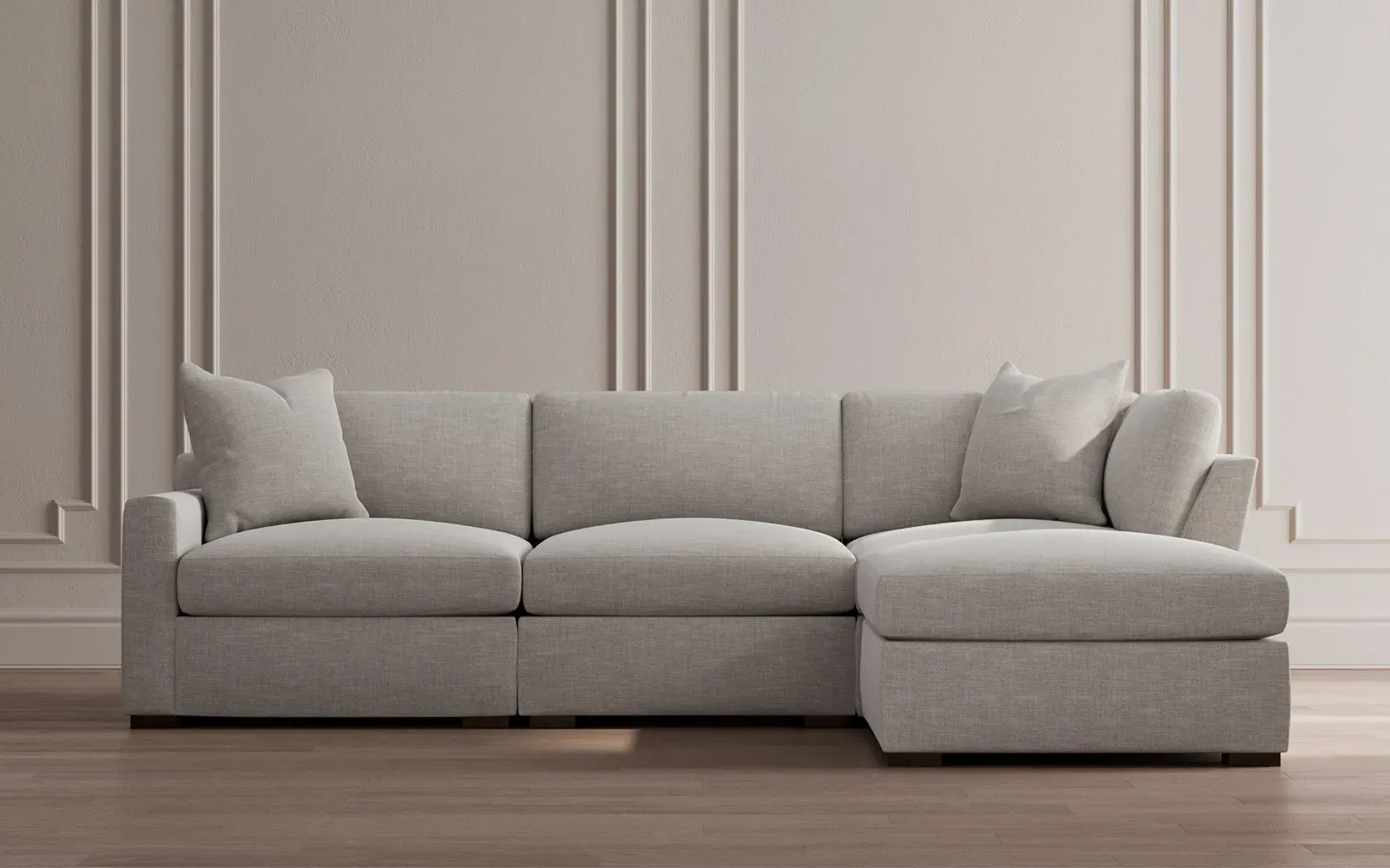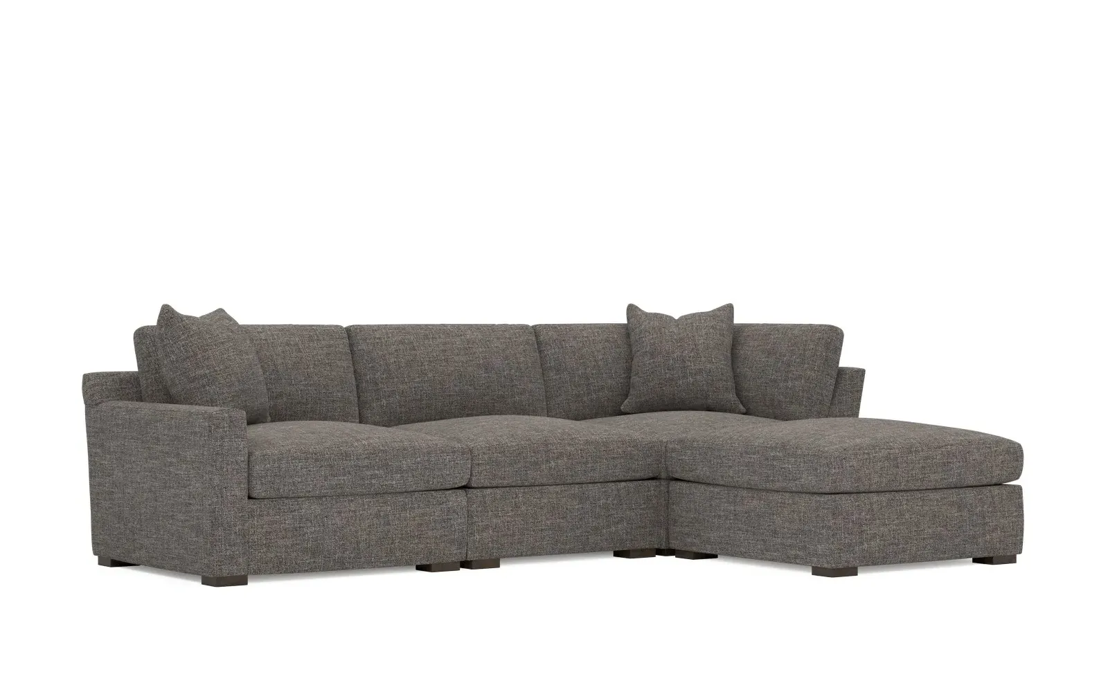 The Kamryn sectional offers versatile seating with its modular 4-piece configuration, featuring an ottoman, corner seat, armless seat, and single seat. Its FSC-certified kiln-dried hardwood frame provides lasting durability, while the espresso-finished legs add stability. The modular design allows for flexible arrangement, and the 24-inch arm height ensures comfortable lounging. W292 x D193 x H94 cm.