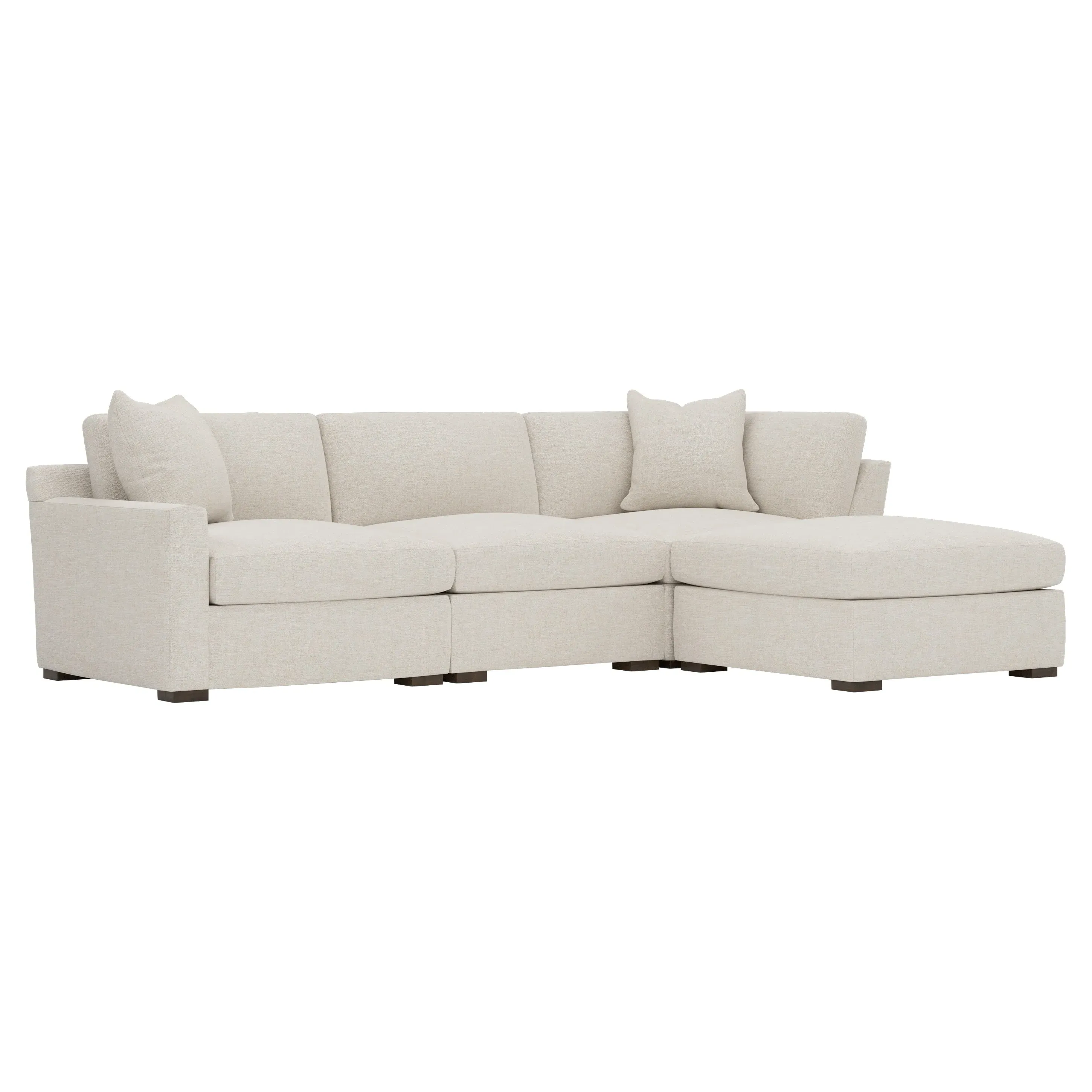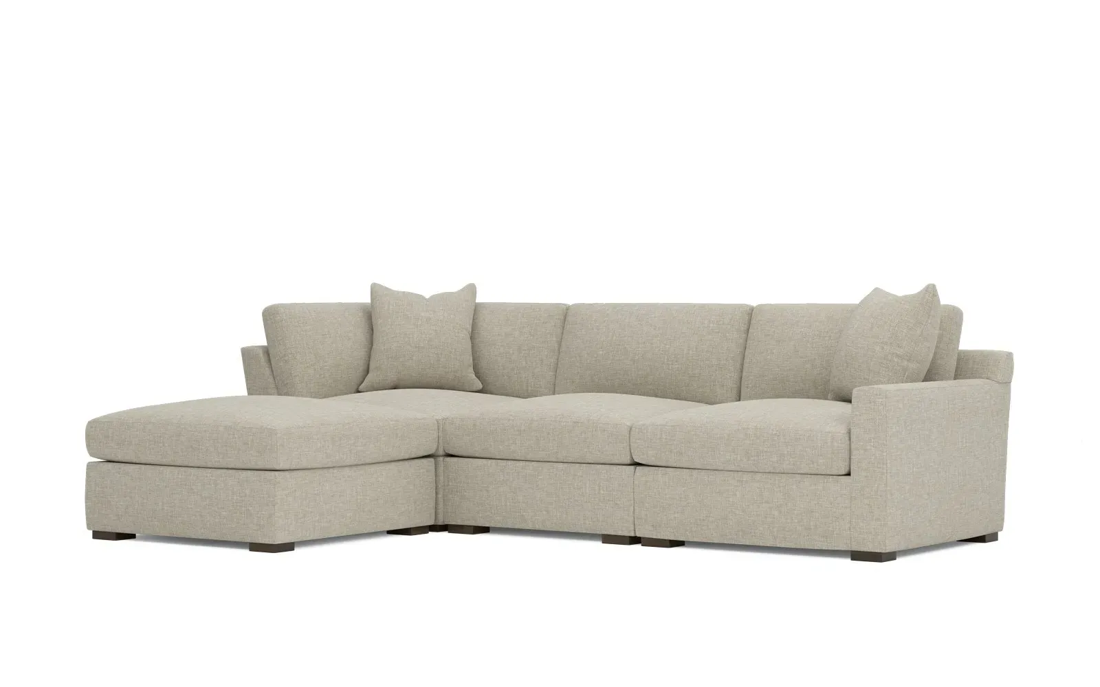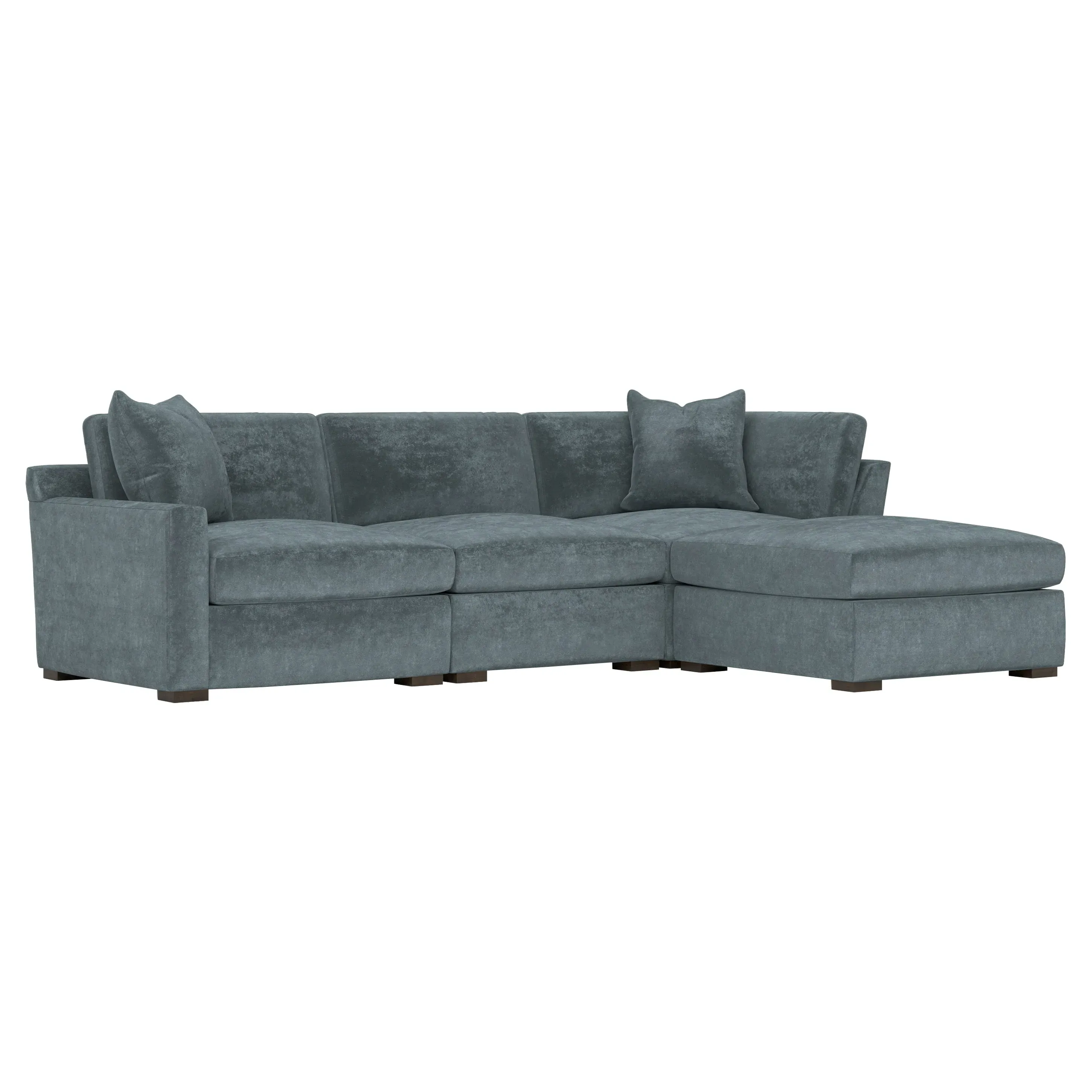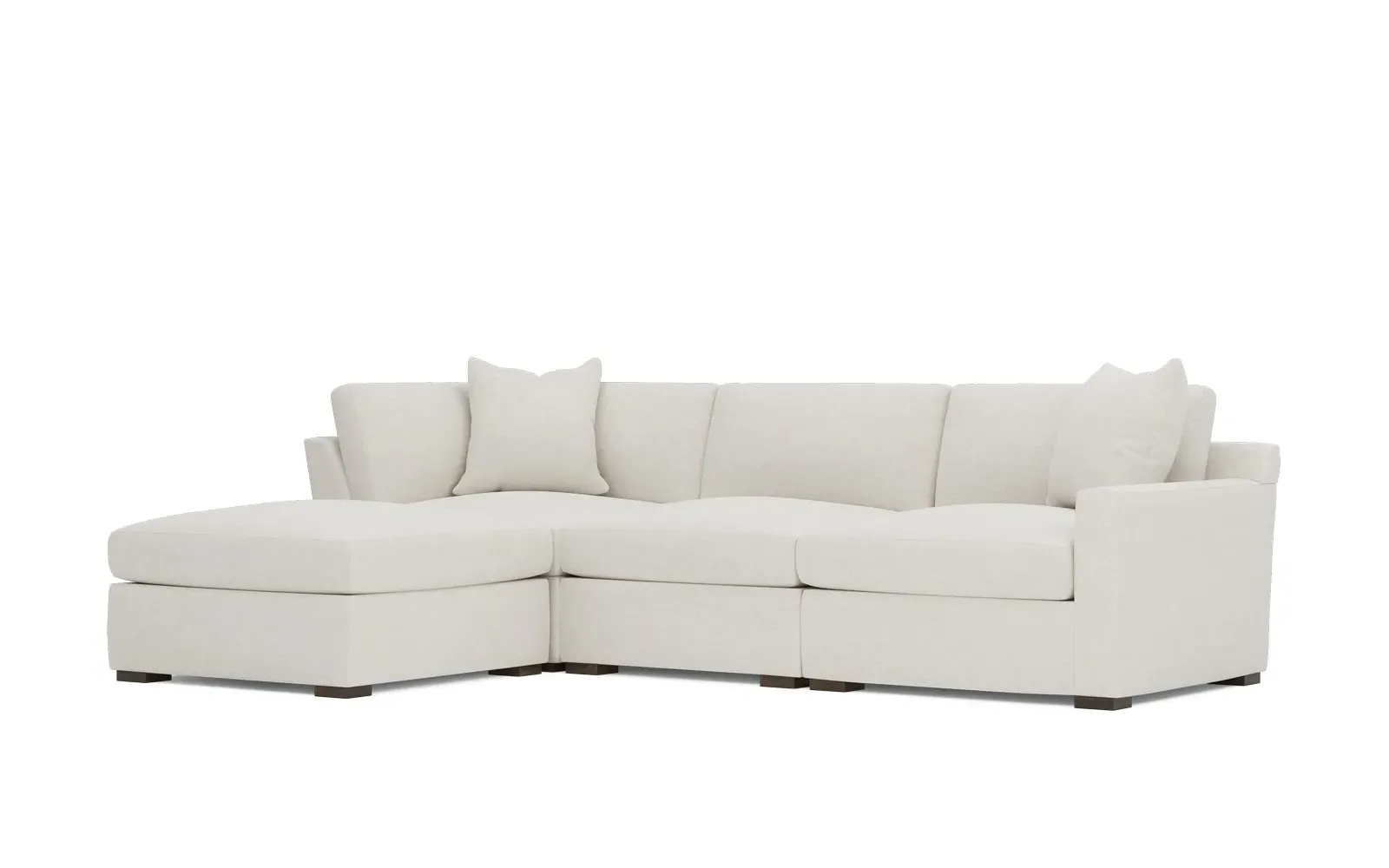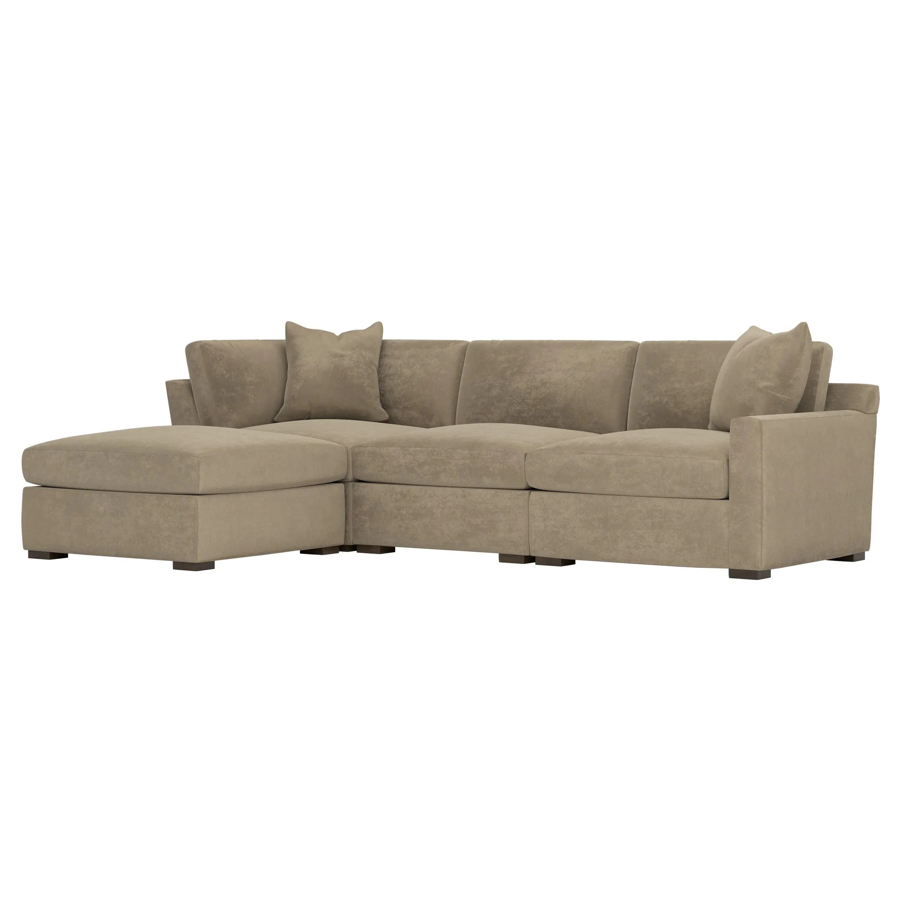 The Kamryn sectional offers versatile seating with its modular 4-piece configuration, featuring an ottoman, corner seat, armless seat, and single seat. Its FSC-certified kiln-dried hardwood frame provides lasting durability, while the espresso-finished legs add stability. The modular design allows for flexible arrangement, and the 24-inch arm height ensures comfortable lounging. W292 x D193 x H94 cm.