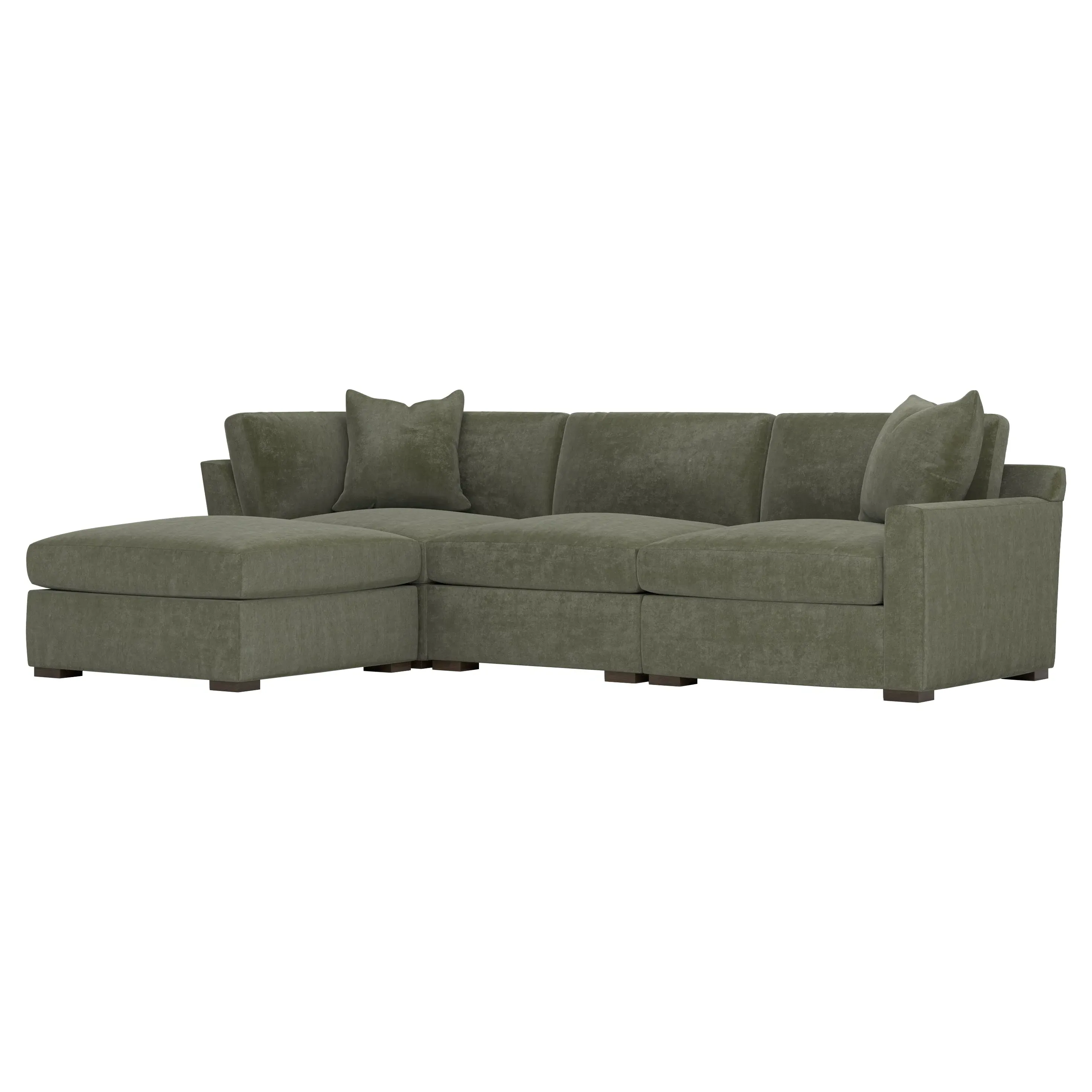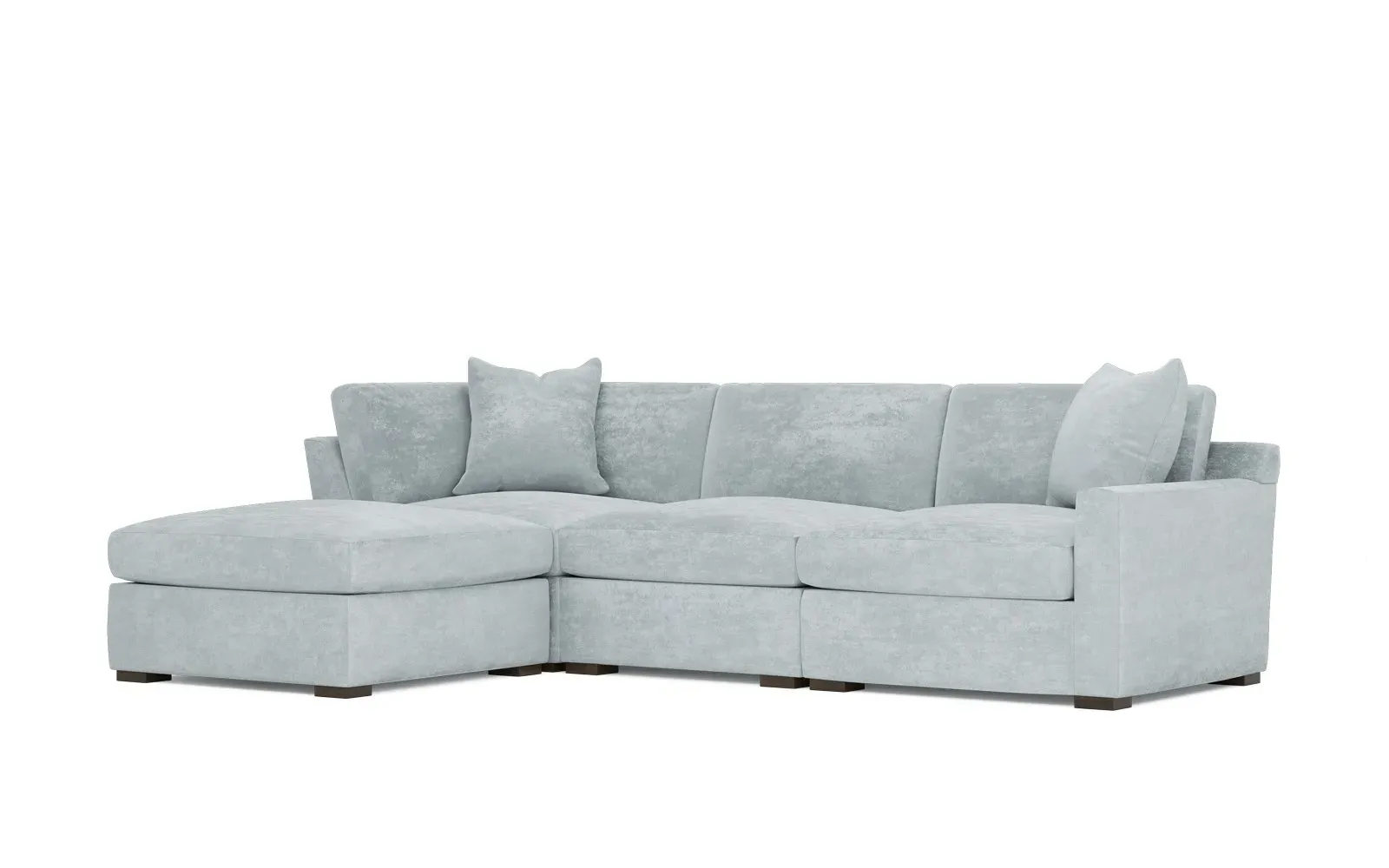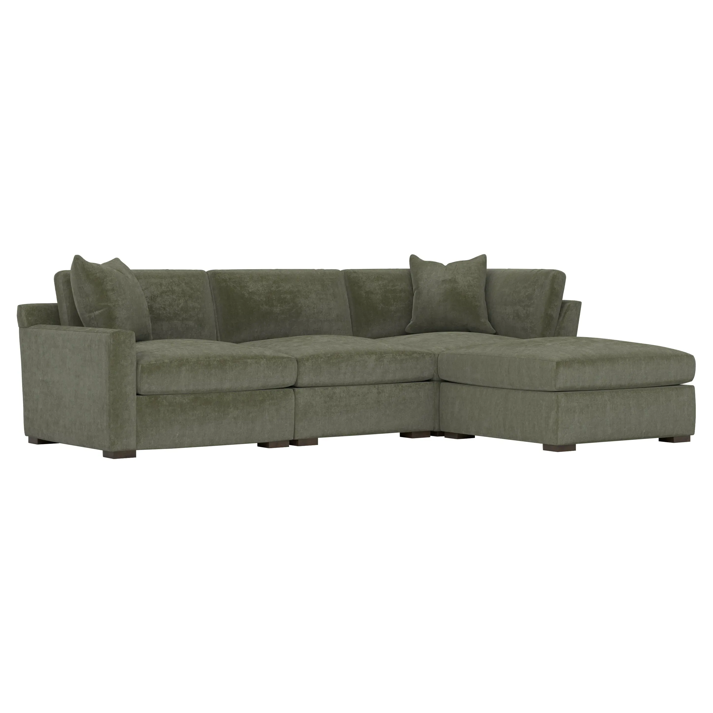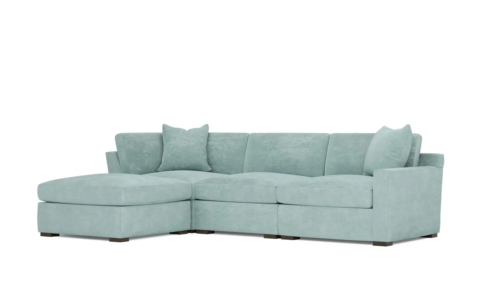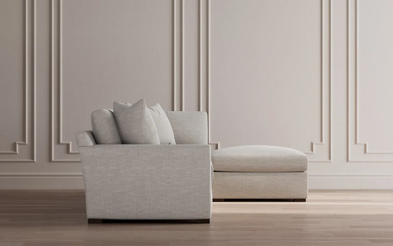 The Kamryn sectional offers versatile seating with its modular 4-piece configuration, featuring an ottoman, corner seat, armless seat, and single seat. Its FSC-certified kiln-dried hardwood frame provides lasting durability, while the espresso-finished legs add stability. The modular design allows for flexible arrangement, and the 24-inch arm height ensures comfortable lounging. W292 x D193 x H94 cm.