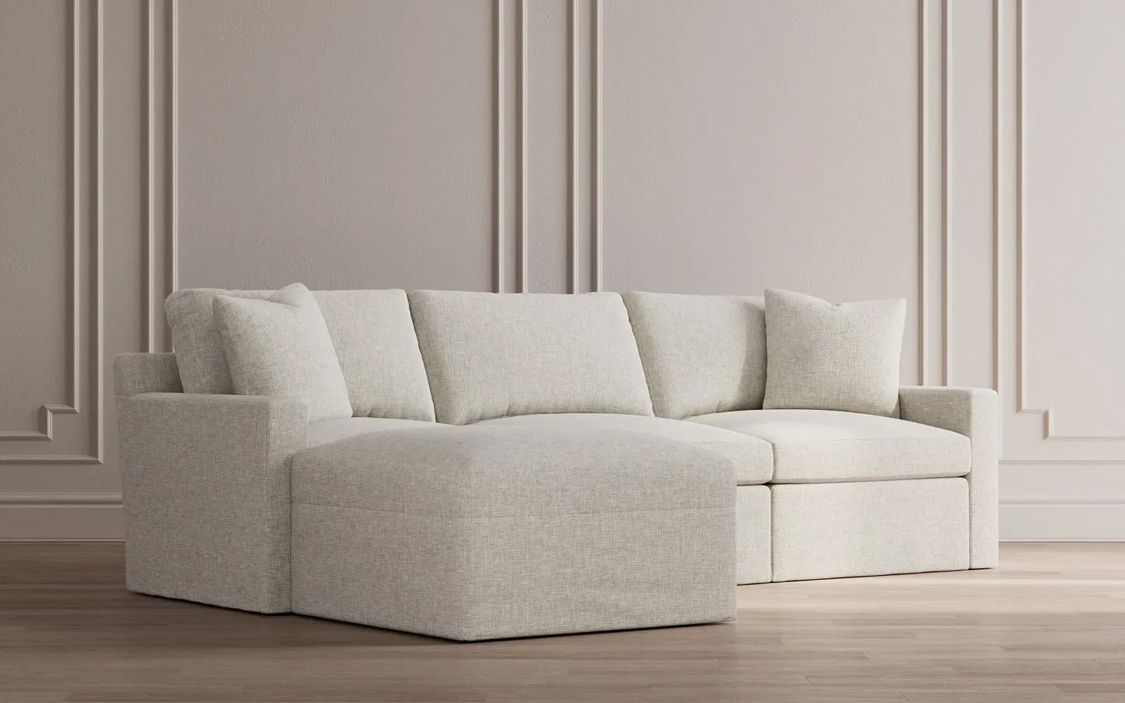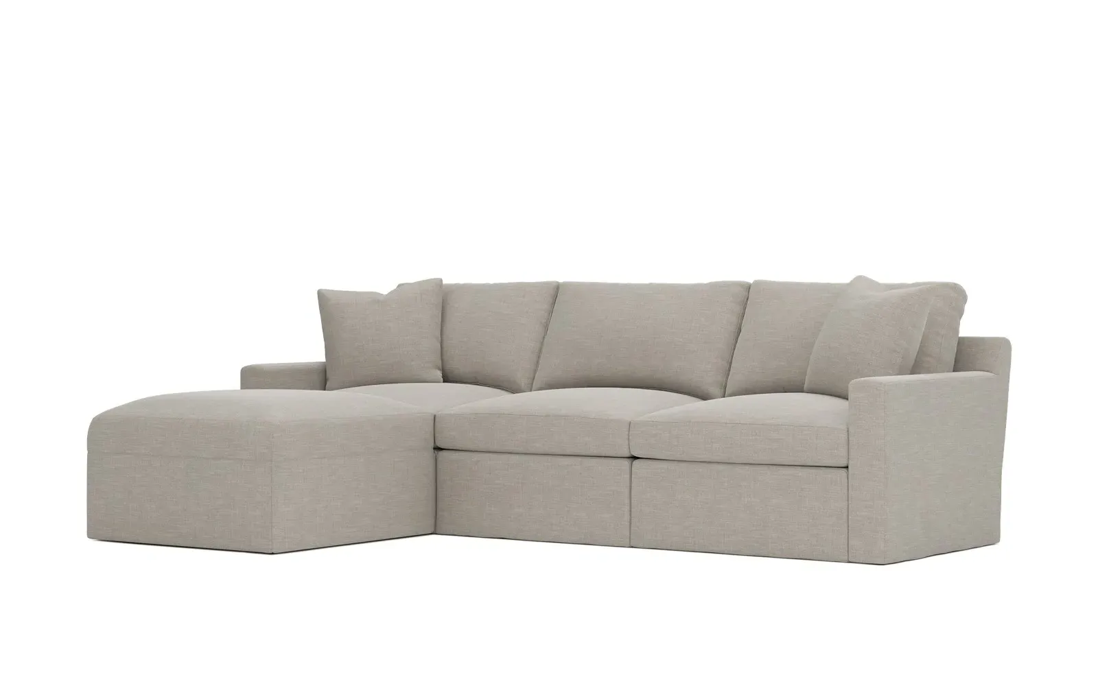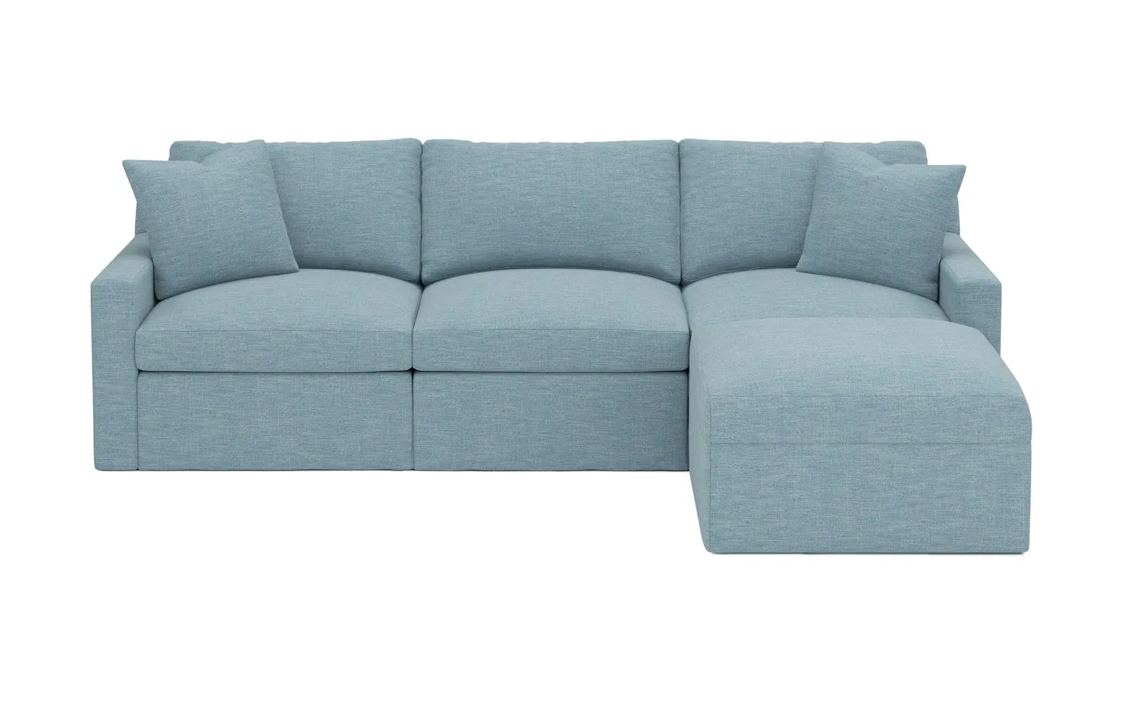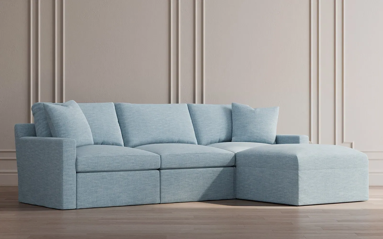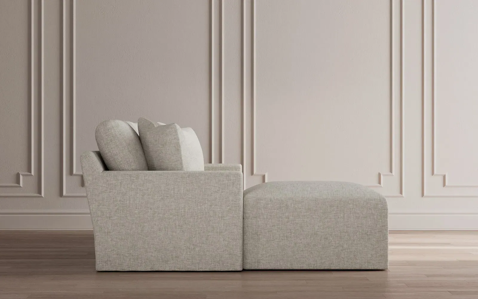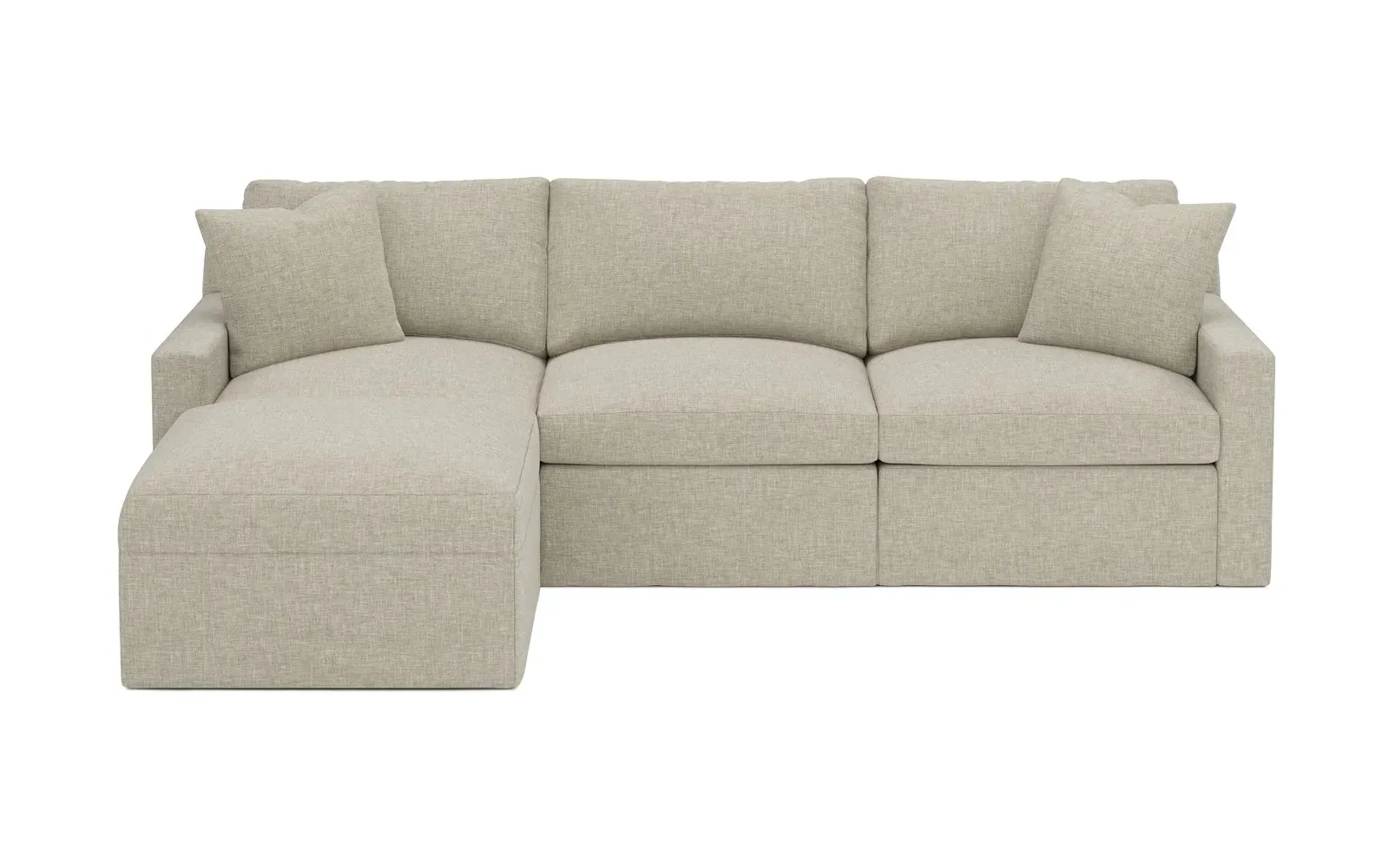 The Kamryn sectional offers versatile seating with its modular 4-piece configuration, featuring an ottoman, corner seat, armless seat, and single seat. Its FSC-certified kiln-dried hardwood frame provides lasting durability, while the espresso-finished legs add stability. The modular design allows for flexible arrangement, and the 24-inch arm height ensures comfortable lounging. W292 x D193 x H94 cm.