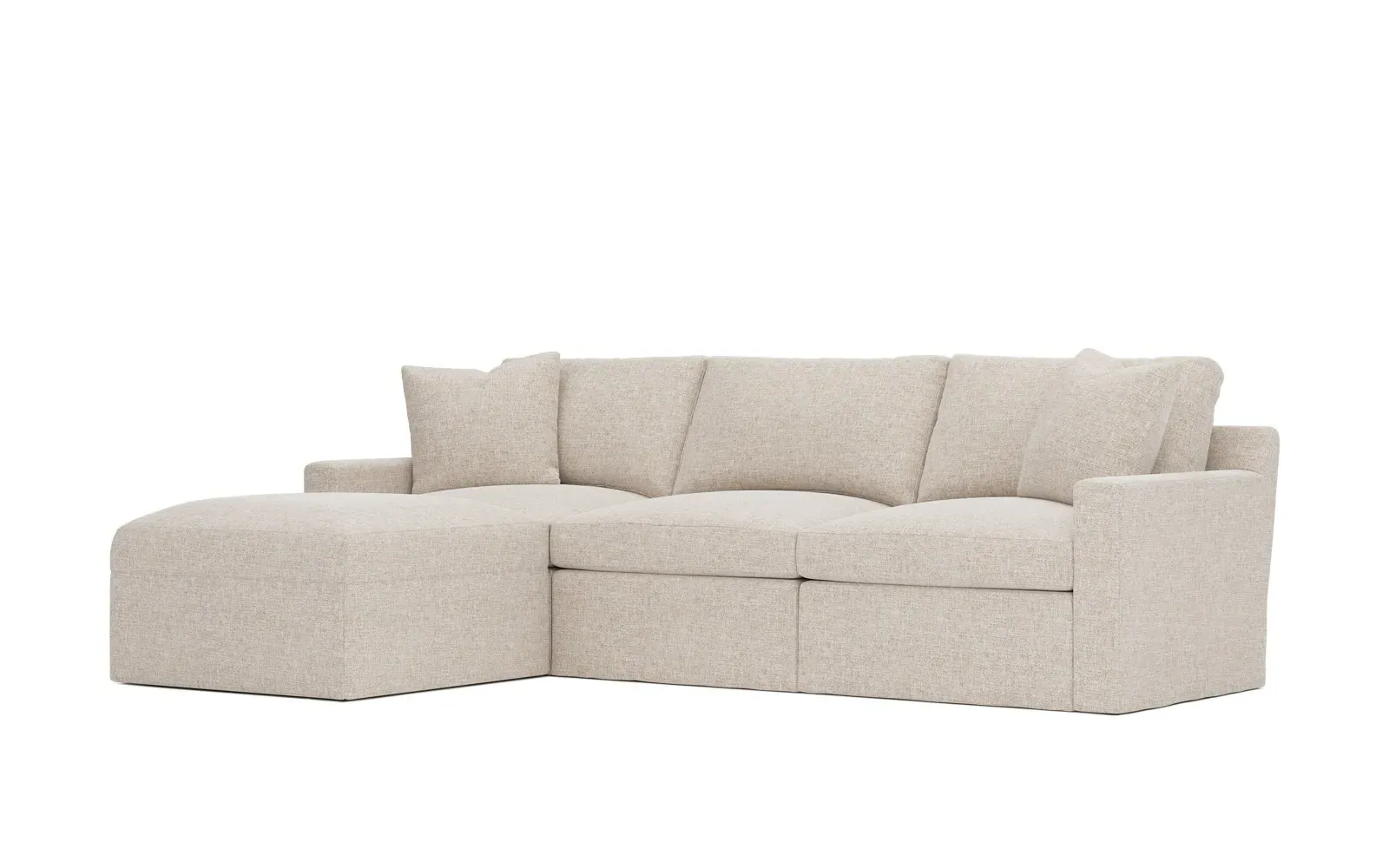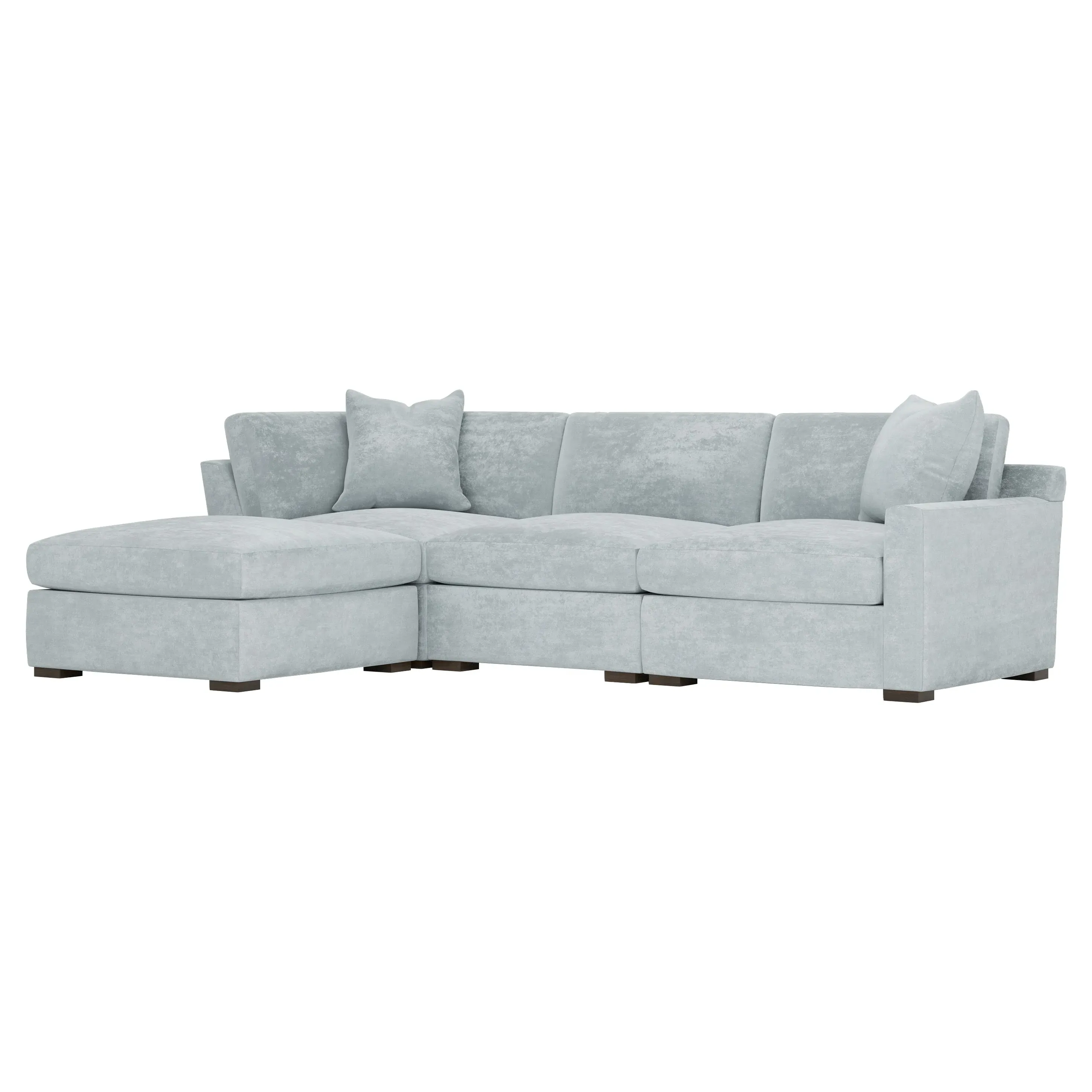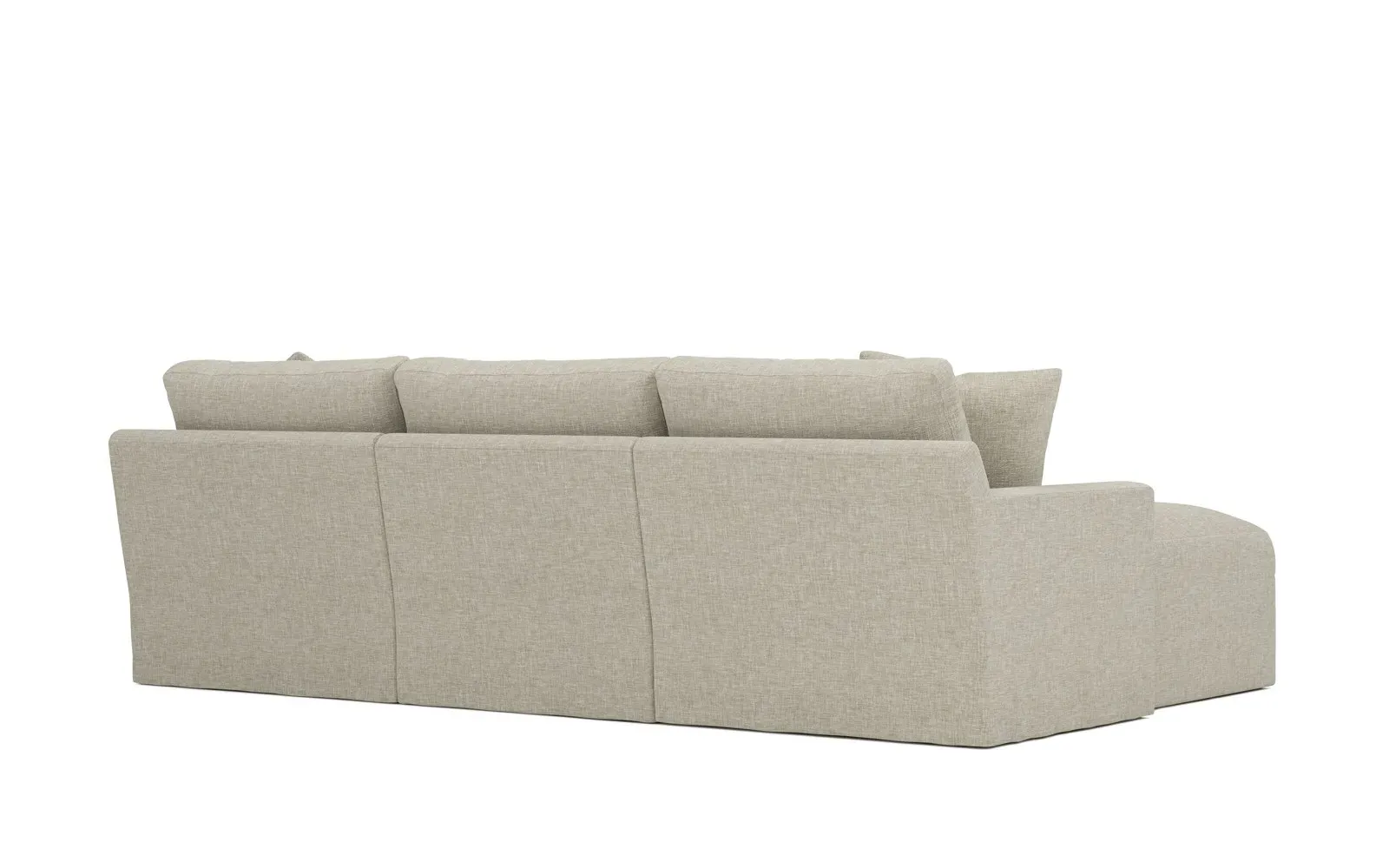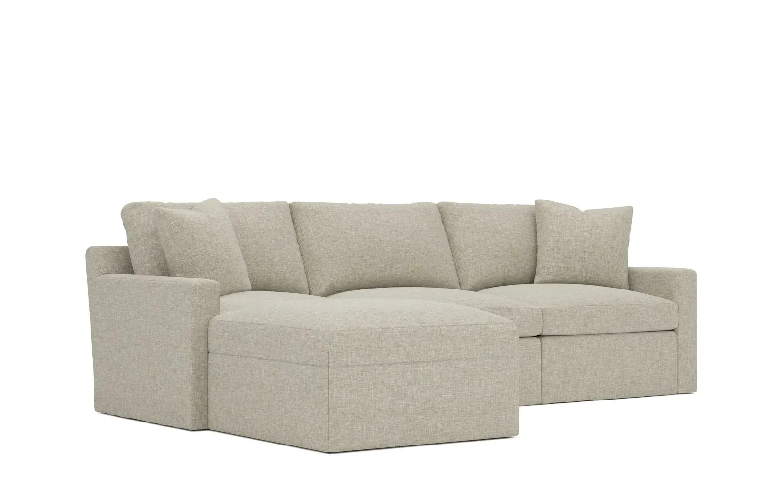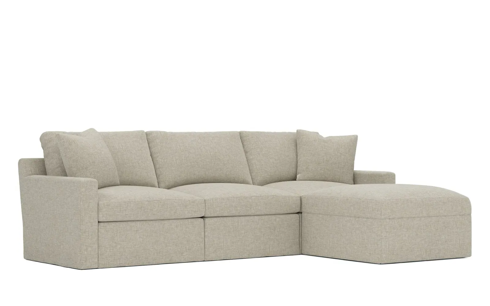 The Kamryn sectional offers versatile seating with its modular 4-piece configuration, featuring an ottoman, corner seat, armless seat, and single seat. Its FSC-certified kiln-dried hardwood frame provides lasting durability, while the espresso-finished legs add stability. The modular design allows for flexible arrangement, and the 24-inch arm height ensures comfortable lounging. W292 x D193 x H94 cm.