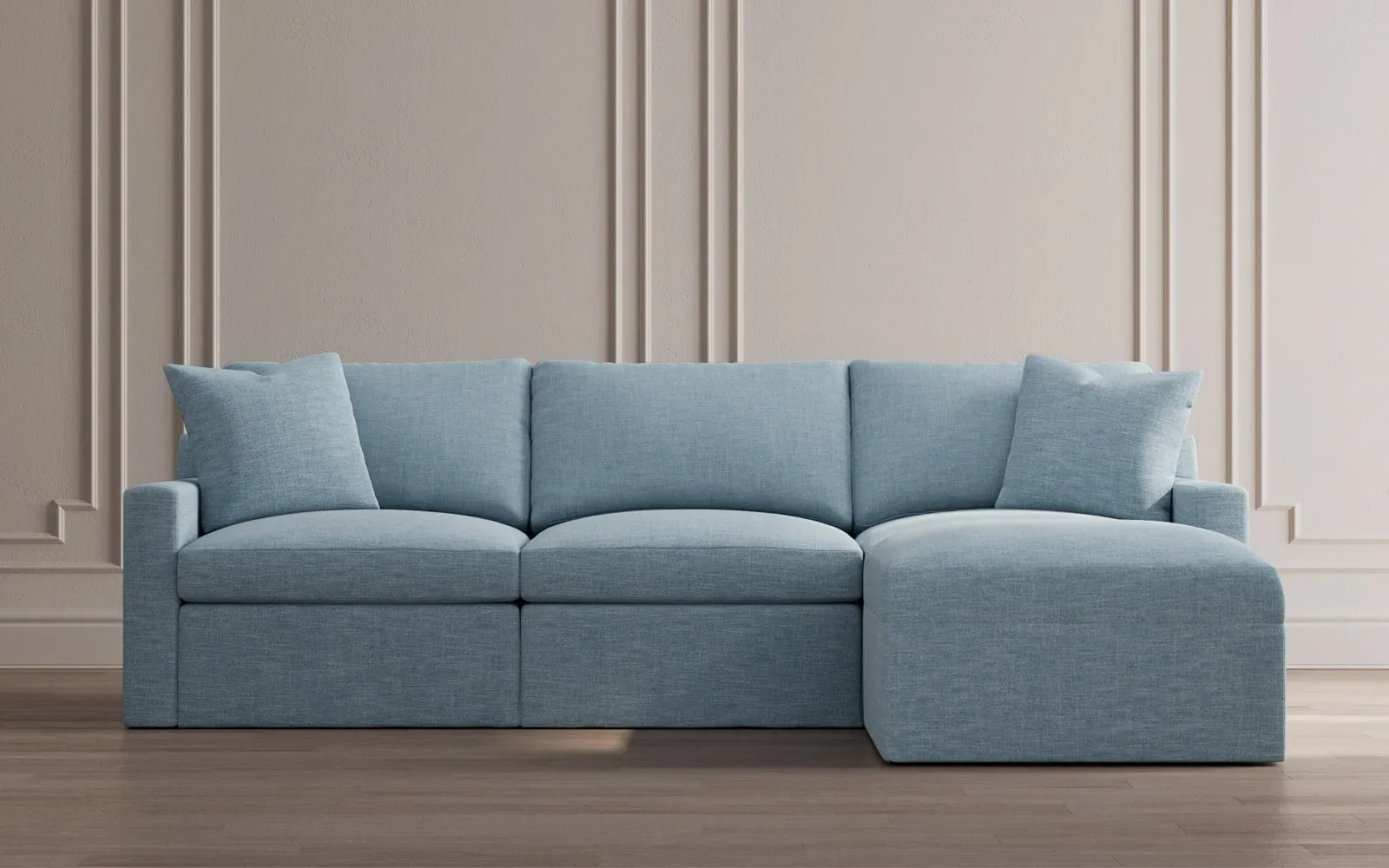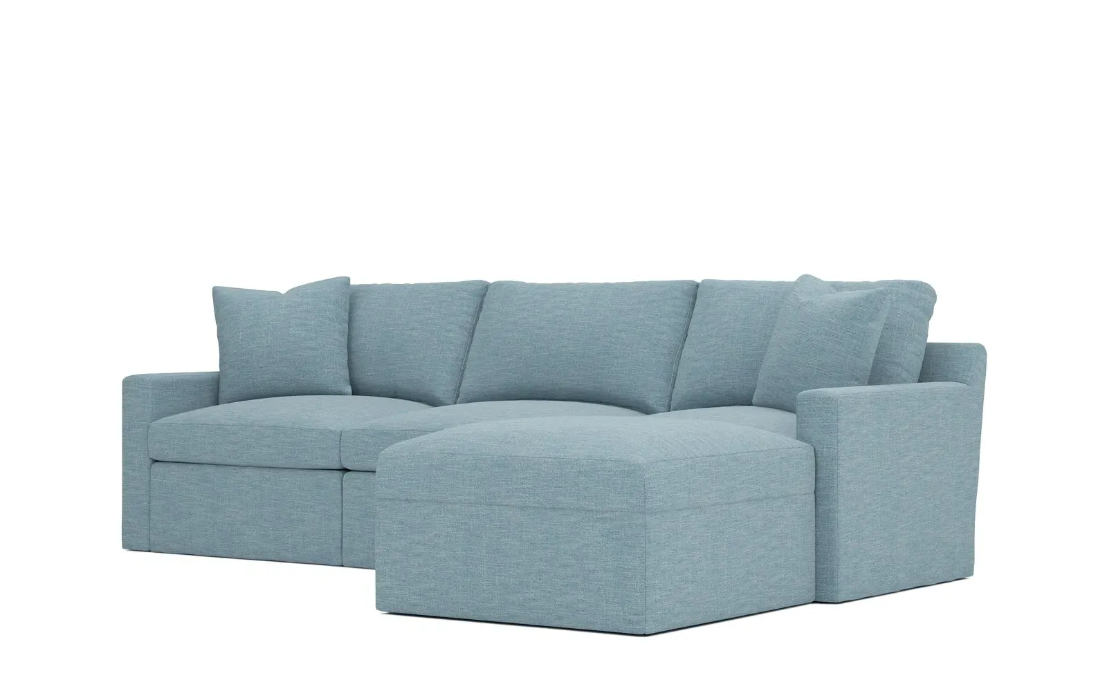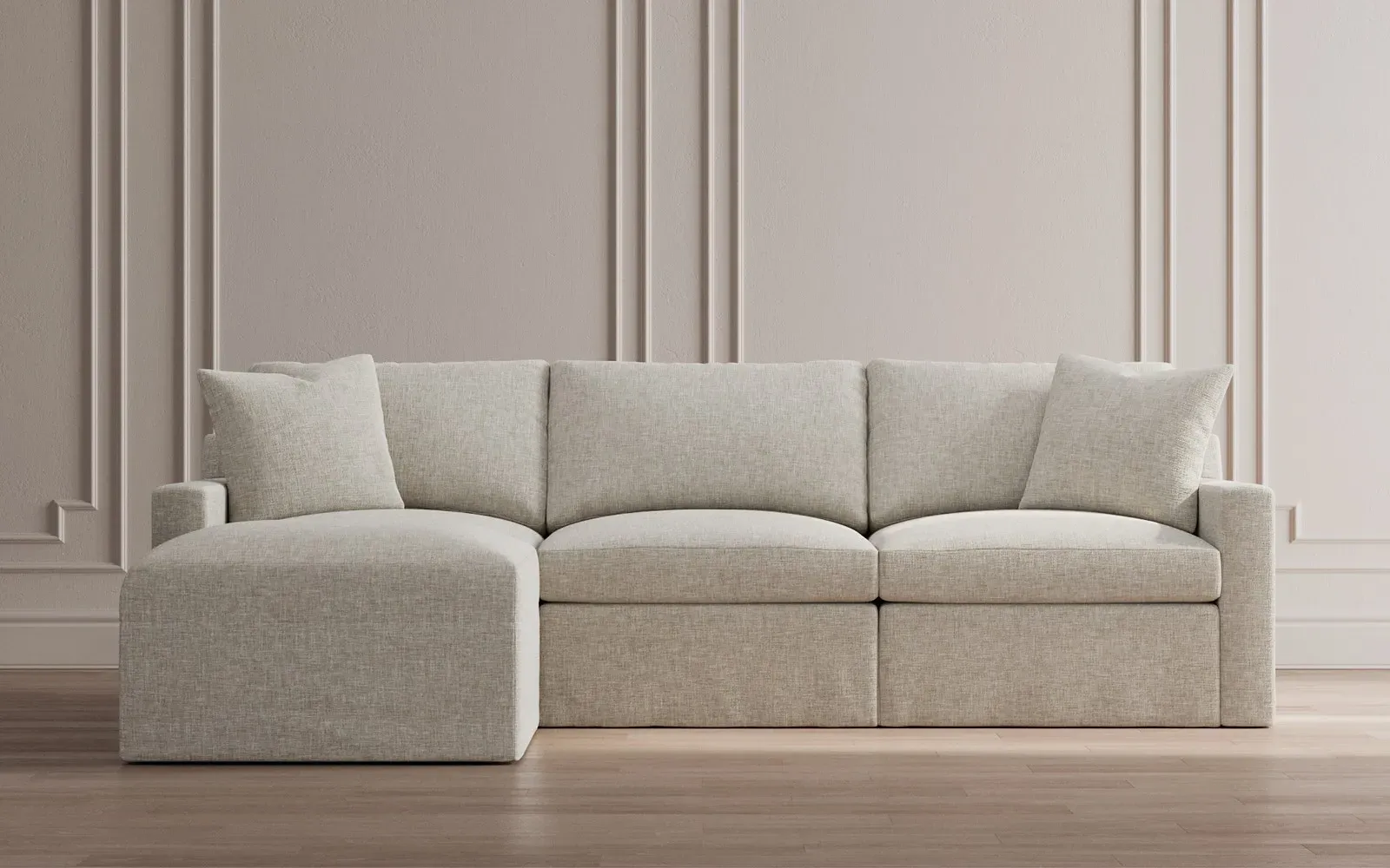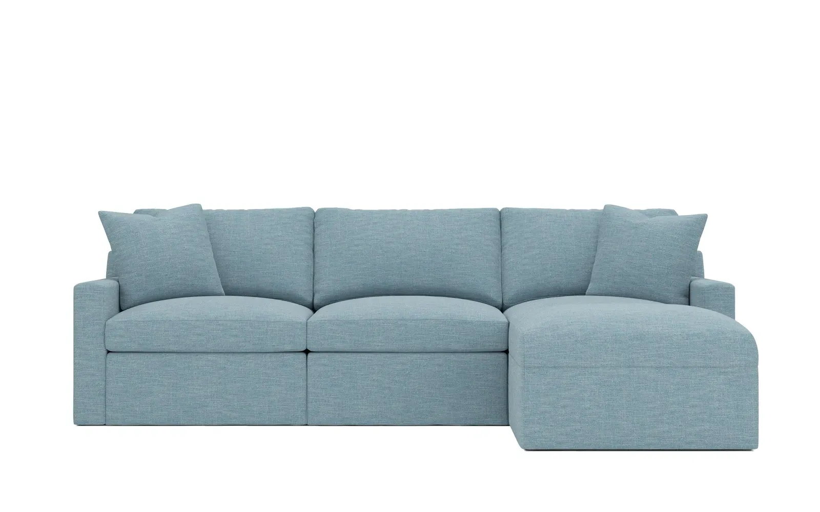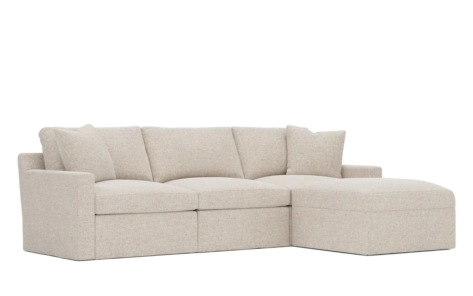 The Kamryn sectional offers versatile seating with its modular 4-piece configuration, featuring an ottoman, corner seat, armless seat, and single seat. Its FSC-certified kiln-dried hardwood frame provides lasting durability, while the espresso-finished legs add stability. The modular design allows for flexible arrangement, and the 24-inch arm height ensures comfortable lounging. W292 x D193 x H94 cm.