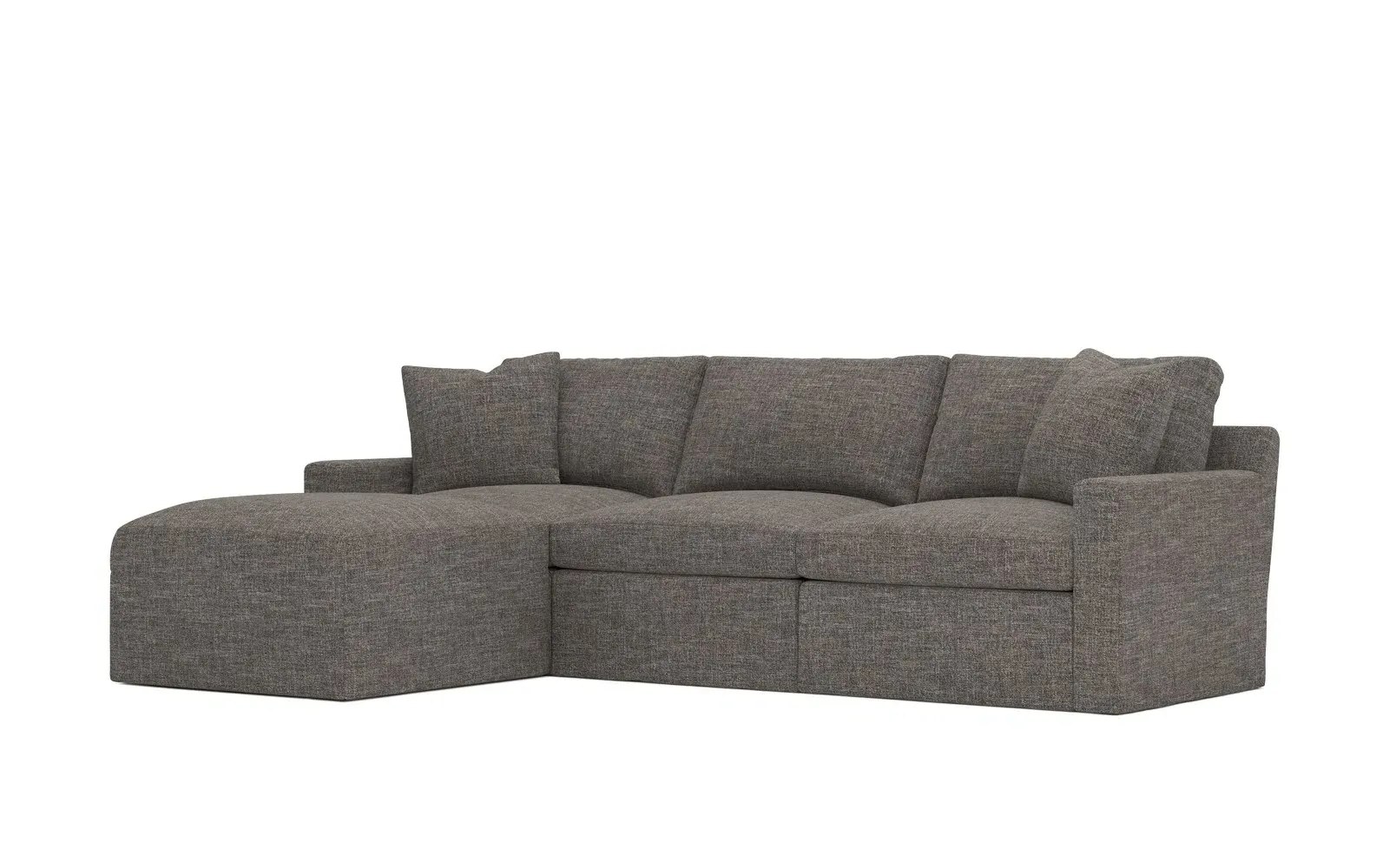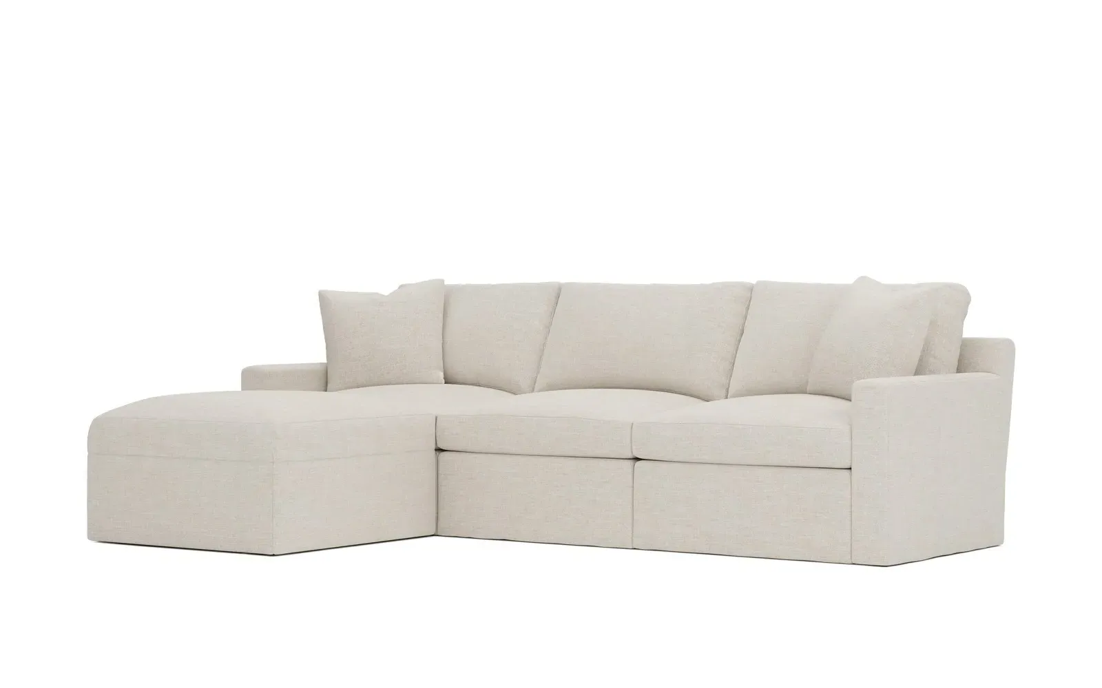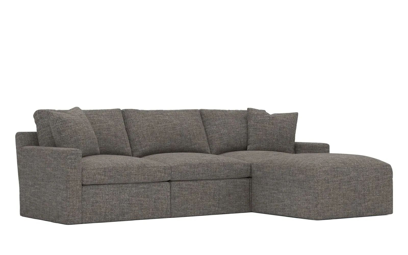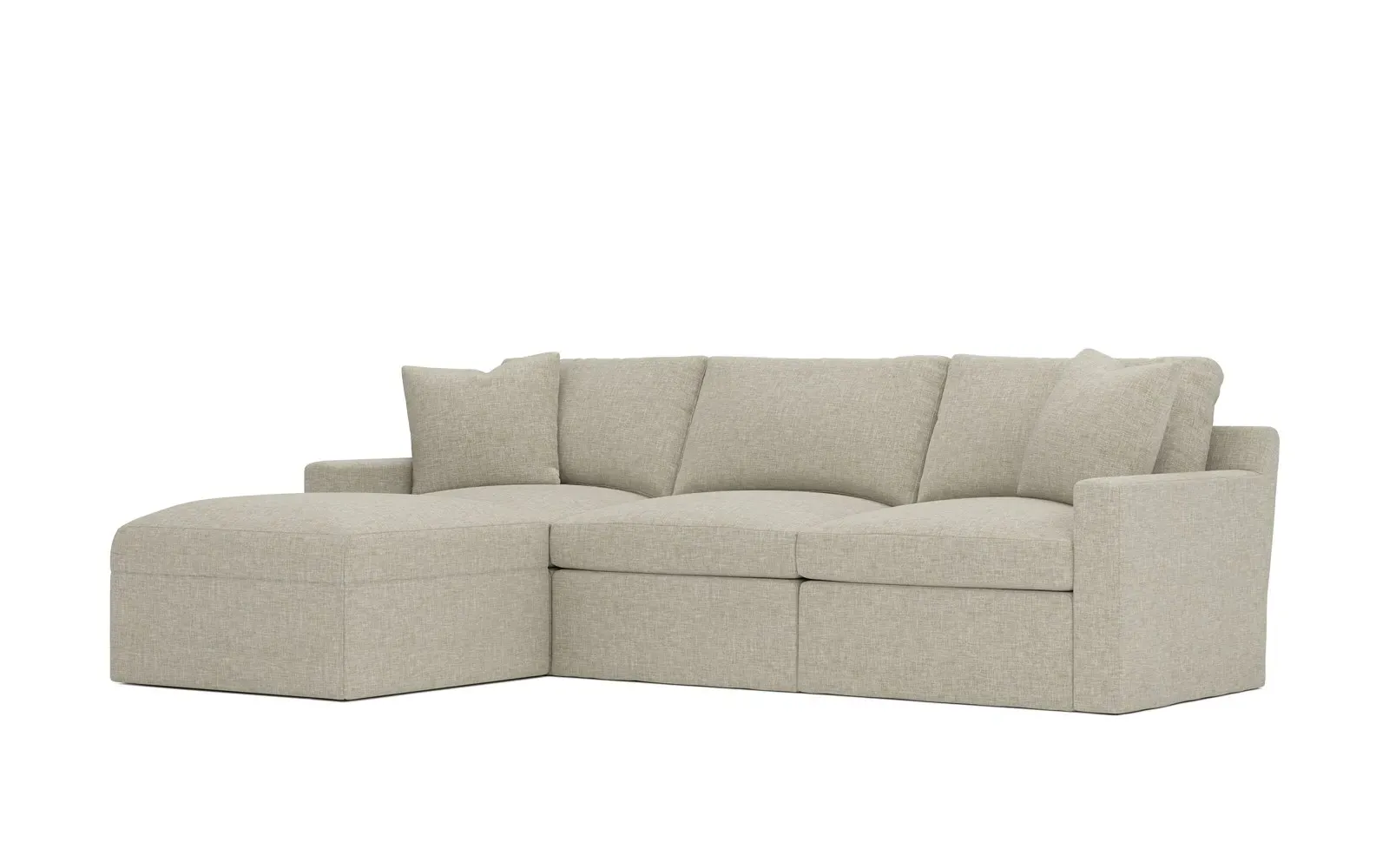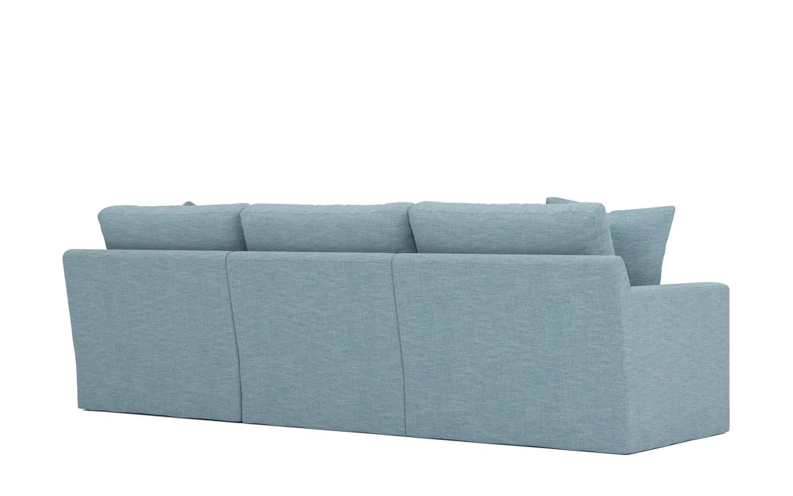 The Kamryn sectional offers versatile seating with its modular 4-piece configuration, featuring an ottoman, corner seat, armless seat, and single seat. Its FSC-certified kiln-dried hardwood frame provides lasting durability, while the espresso-finished legs add stability. The modular design allows for flexible arrangement, and the 24-inch arm height ensures comfortable lounging. W292 x D193 x H94 cm.