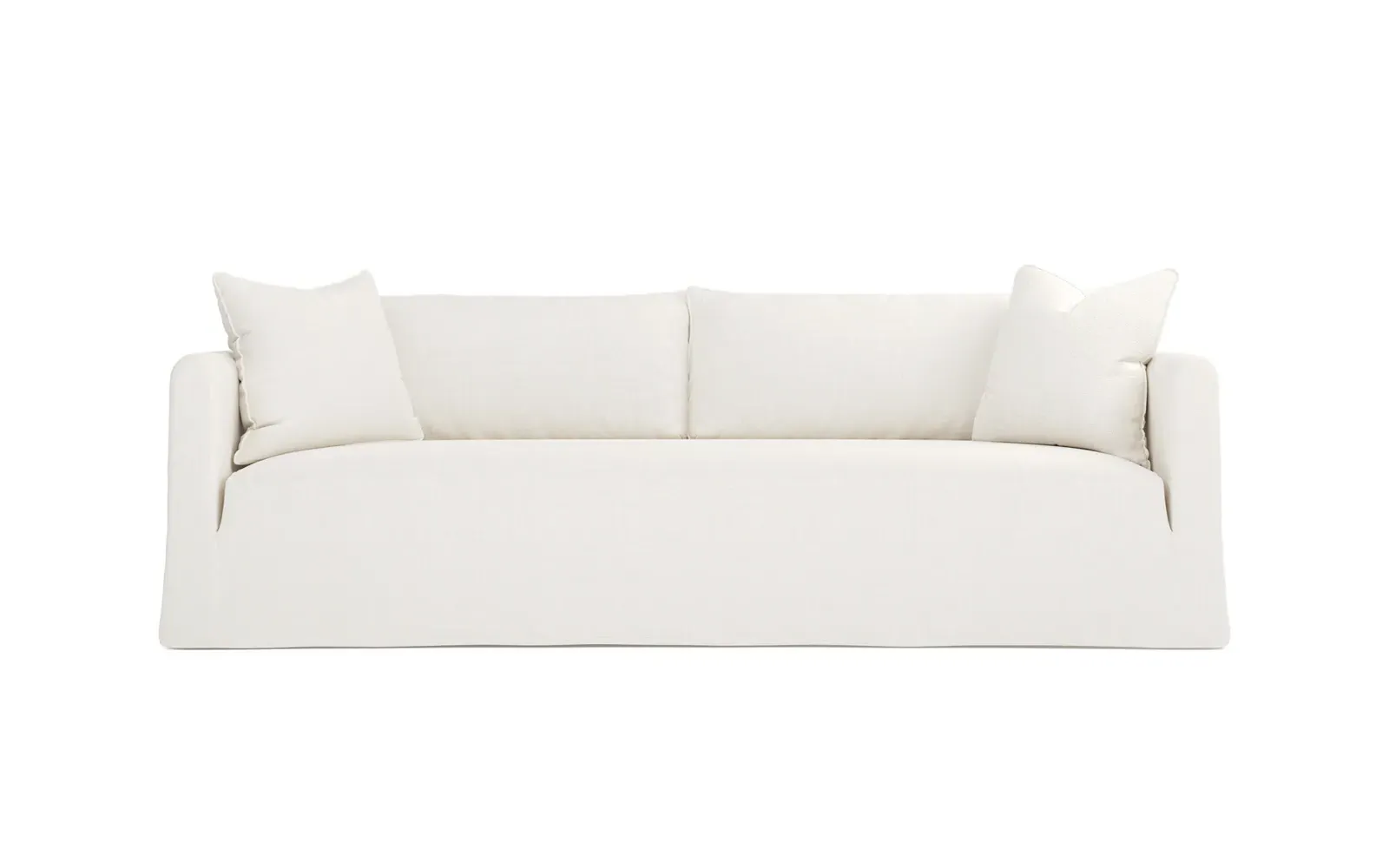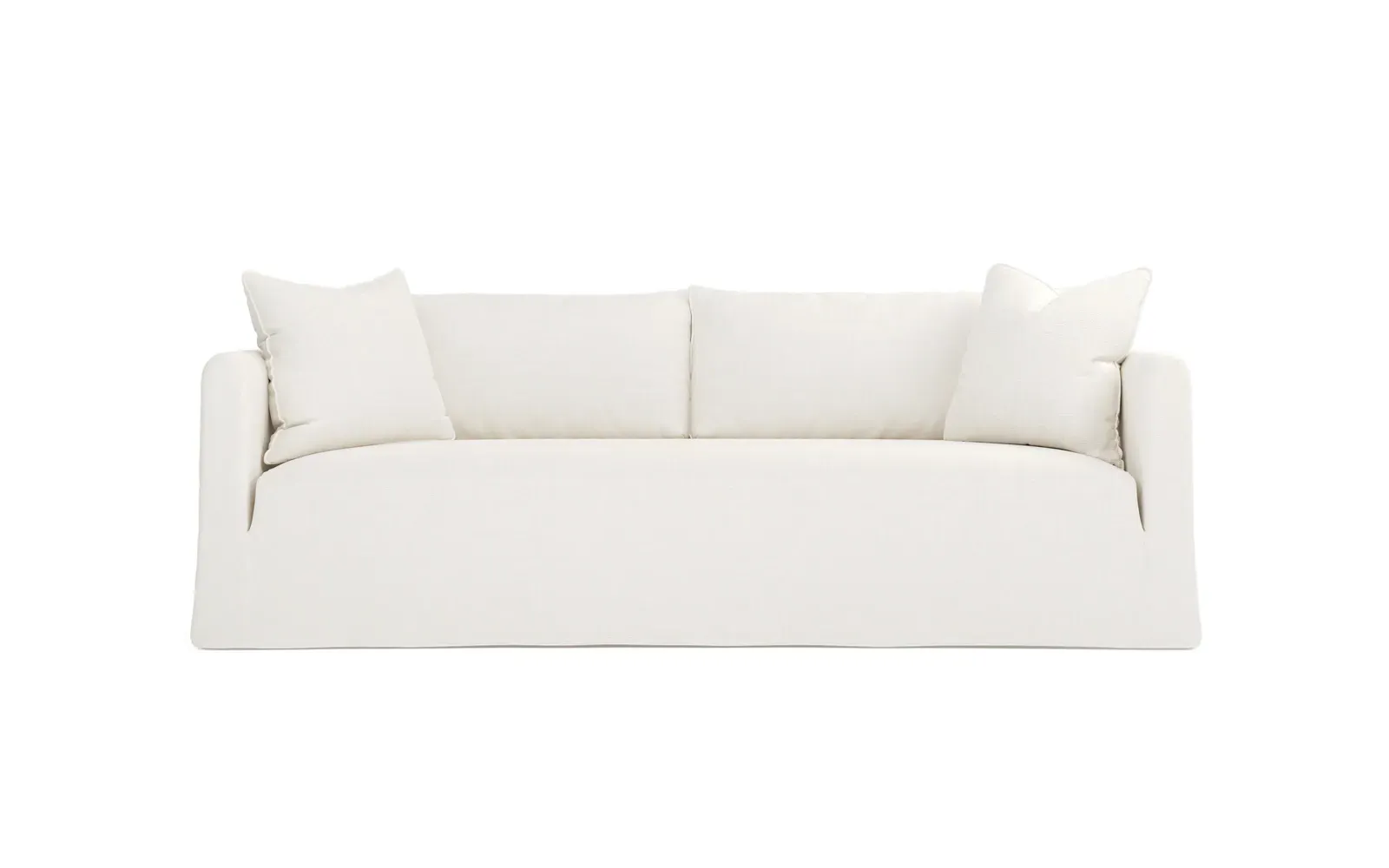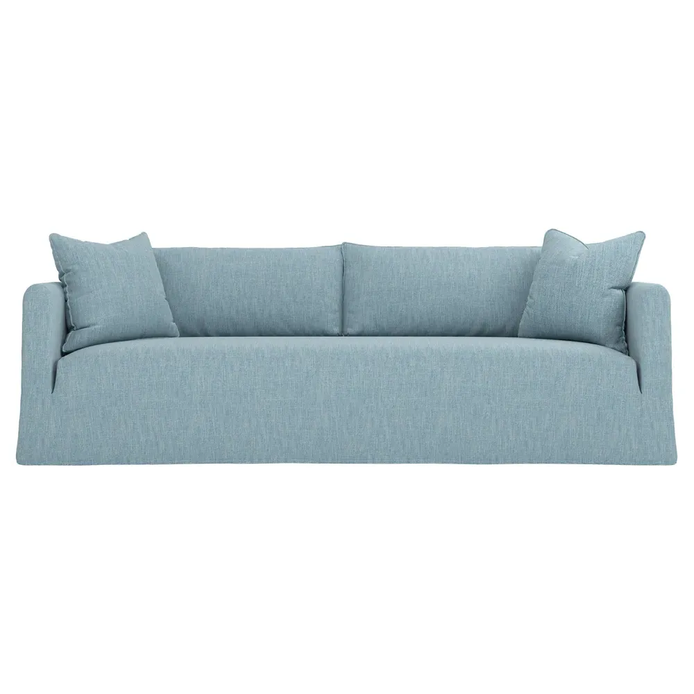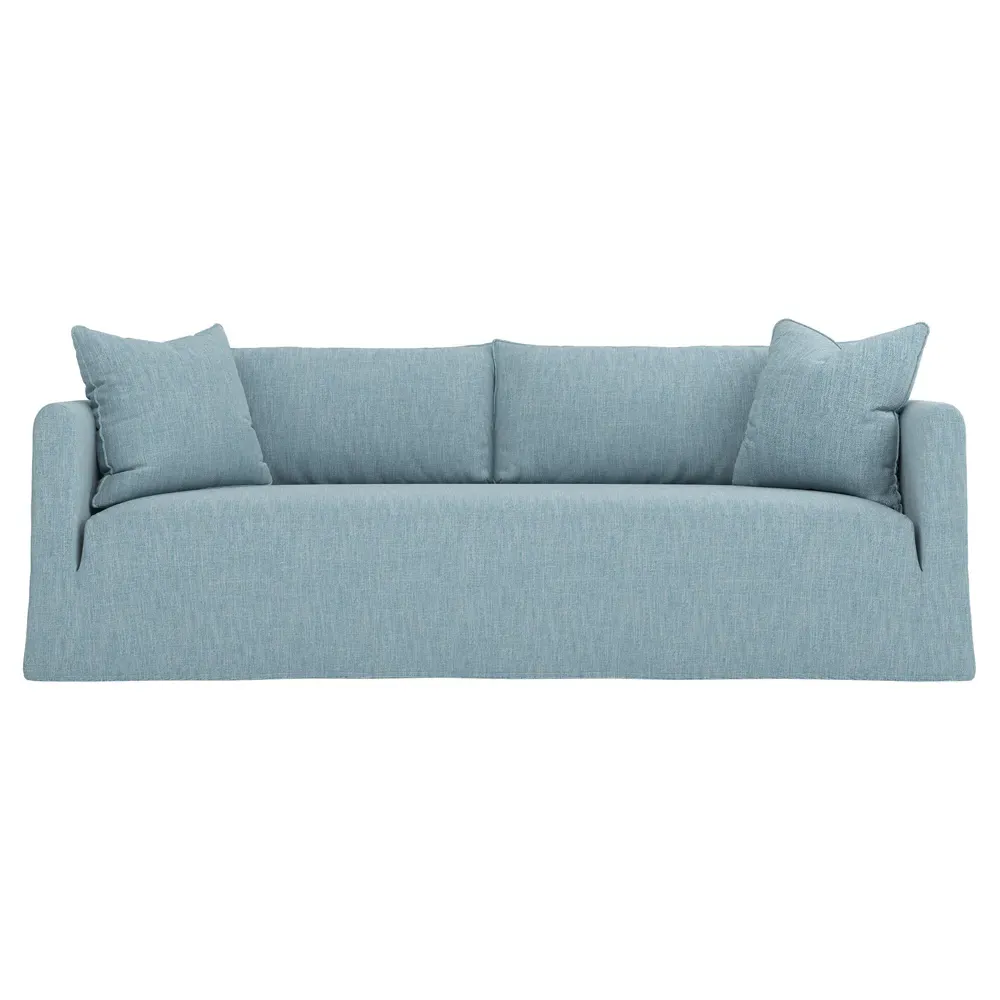 Timeless and versatile with a nod to Parisian style, the 90" Kaoru slipcovered sofa complements any modern, transitional, or coastal home. The tight seat is designed with premium foam cushioning for a firm yet comfortable sit. Accented with subtle flange edges, plush back pillows are filled with feathers and down. A pair of throw pillows lean against rounded track arms, flanking the seamless bench seat. Choose from washable slipcover fabrics in a variety of serene hues. <b>Overall Dimensions:</b> 90" W x 39" D x 33" H. <b>Seat Dimensions:</b> 23” D x 18” H; <b>Distance Between Arms:</b> 79”; <b>Arm Height:</b> 27”. <b>Materials:</b> FSC®-certified, US-sourced, formaldehyde-free solid kiln-dried hardwood and furniture-grade laminates. <b>Cushion Fill:</b> The tight seat is made with various layers of CertiPUR-US® certified foam. <b>Back Fill:</b> Loose back cushions are filled with a blend of feathers and down.
