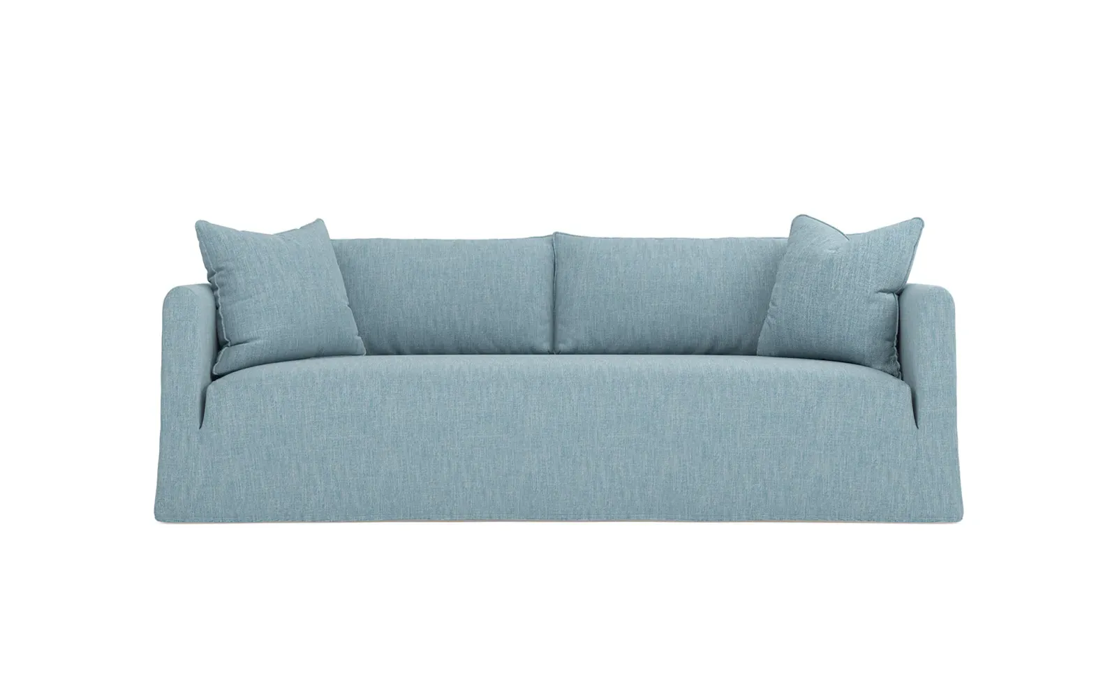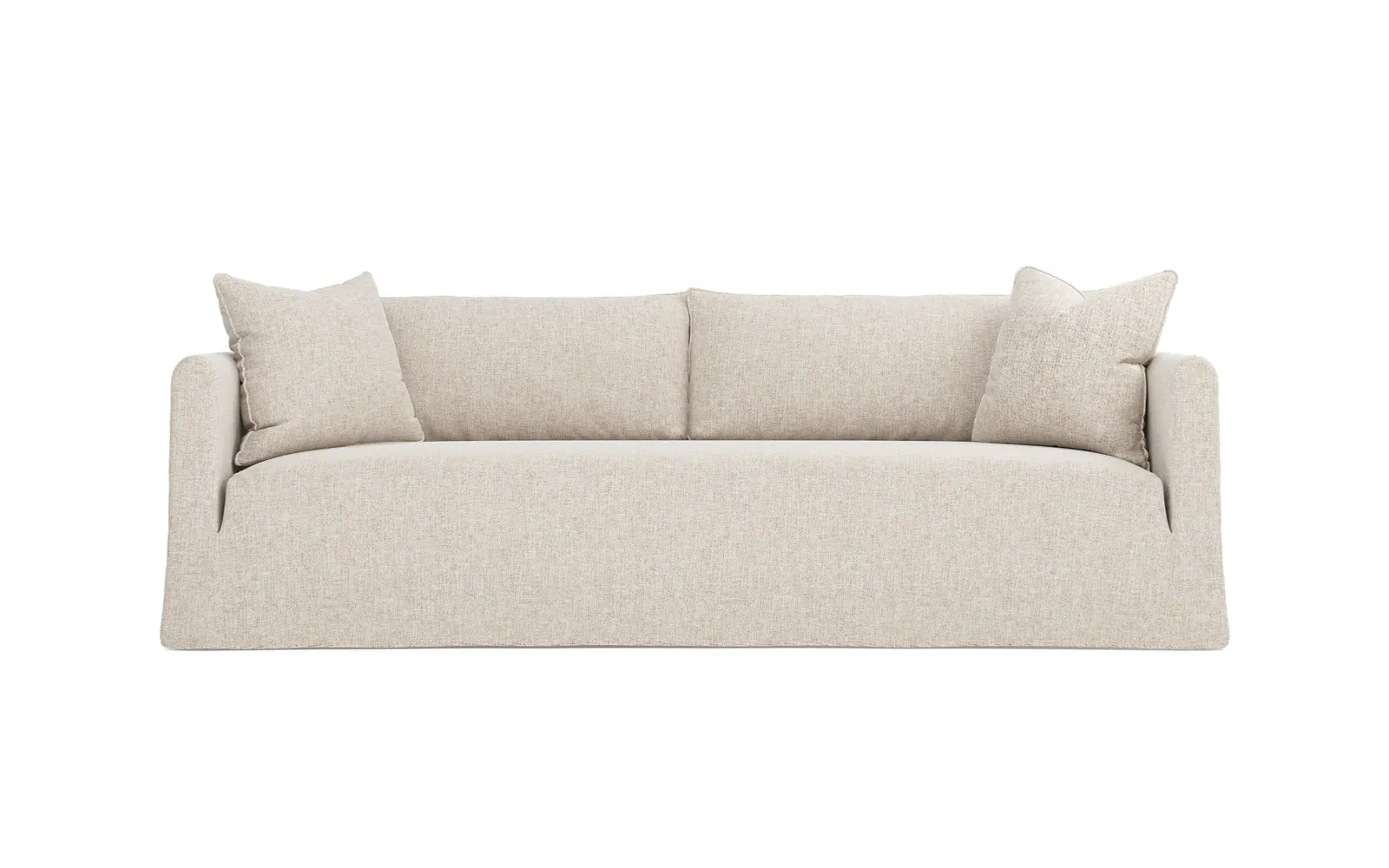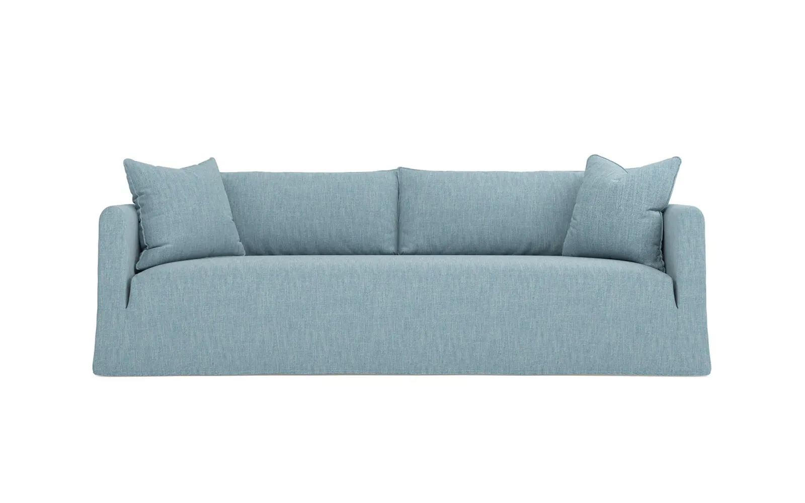Timeless and versatile with a nod to Parisian style, the 90" Kaoru slipcovered sofa complements any modern, transitional, or coastal home. The tight seat is designed with premium foam cushioning for a firm yet comfortable sit. Accented with subtle flange edges, plush back pillows are filled with feathers and down. A pair of throw pillows lean against rounded track arms, flanking the seamless bench seat. Choose from washable slipcover fabrics in a variety of serene hues. <b>Overall Dimensions:</b> 90" W x 39" D x 33" H. <b>Seat Dimensions:</b> 23” D x 18” H; <b>Distance Between Arms:</b> 79”; <b>Arm Height:</b> 27”. <b>Materials:</b> FSC®-certified, US-sourced, formaldehyde-free solid kiln-dried hardwood and furniture-grade laminates. <b>Cushion Fill:</b> The tight seat is made with various layers of CertiPUR-US® certified foam. <b>Back Fill:</b> Loose back cushions are filled with a blend of feathers and down.
