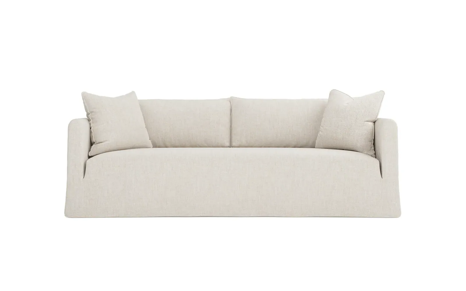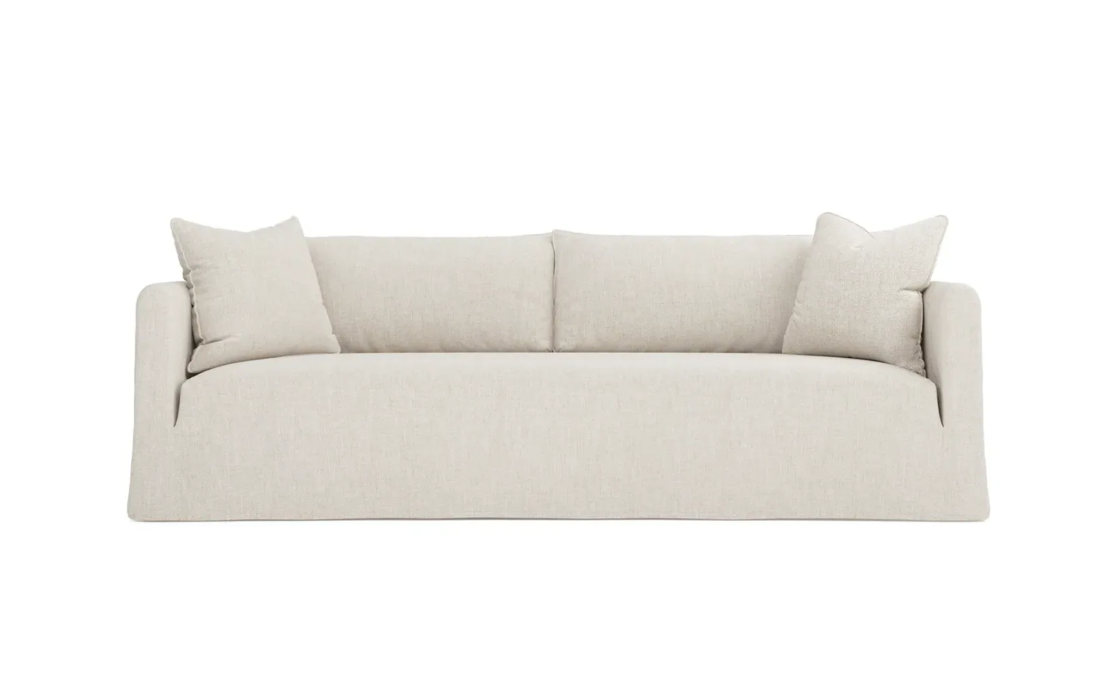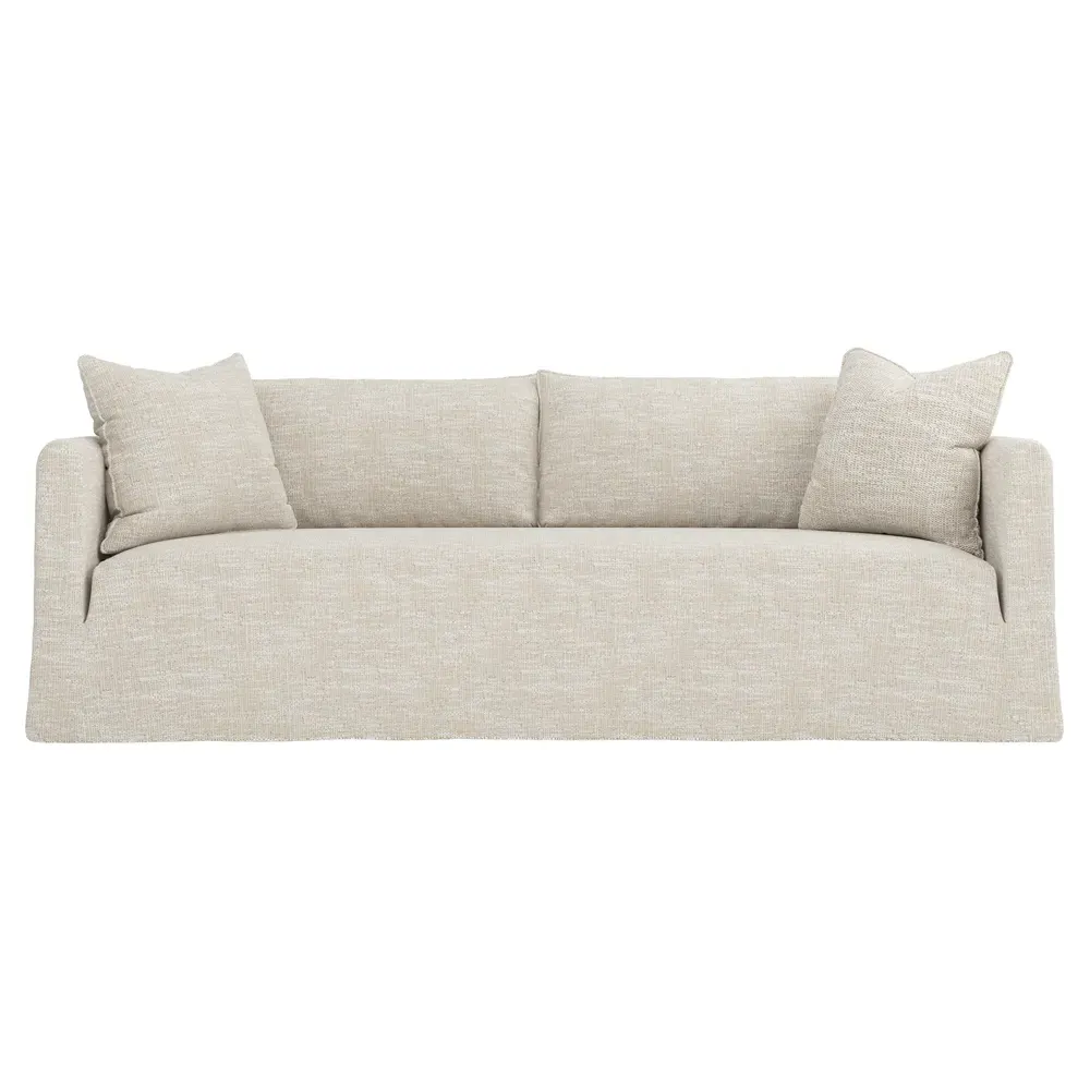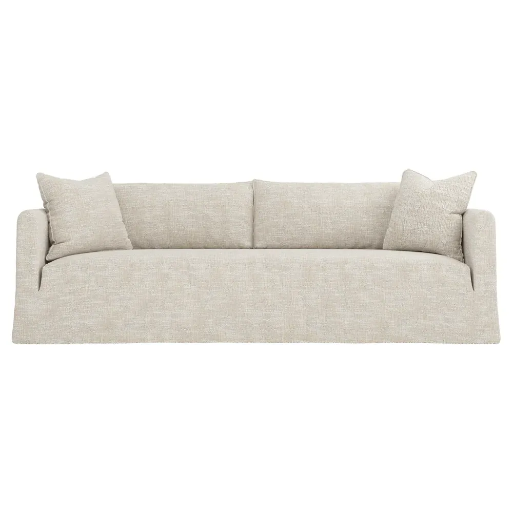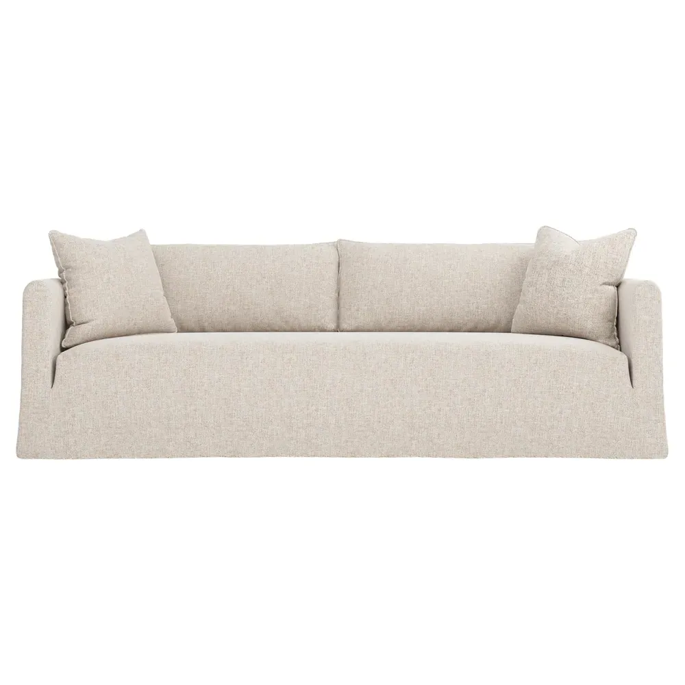 The Kaoru slipcovered sofa combines comfort with practicality through its washable slipcover design. The tight seat features premium foam cushioning for firm support, while plush back pillows filled with feathers and down provide soft comfort. Rounded track arms frame the seamless bench seat, and subtle flange edges add refined detailing. The FSC-certified kiln-dried hardwood frame ensures lasting durability. W228 x D99 x H84 cm.
