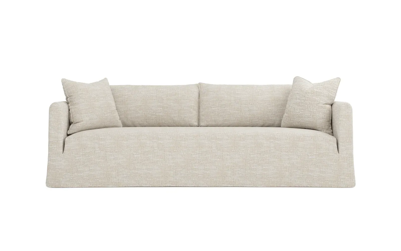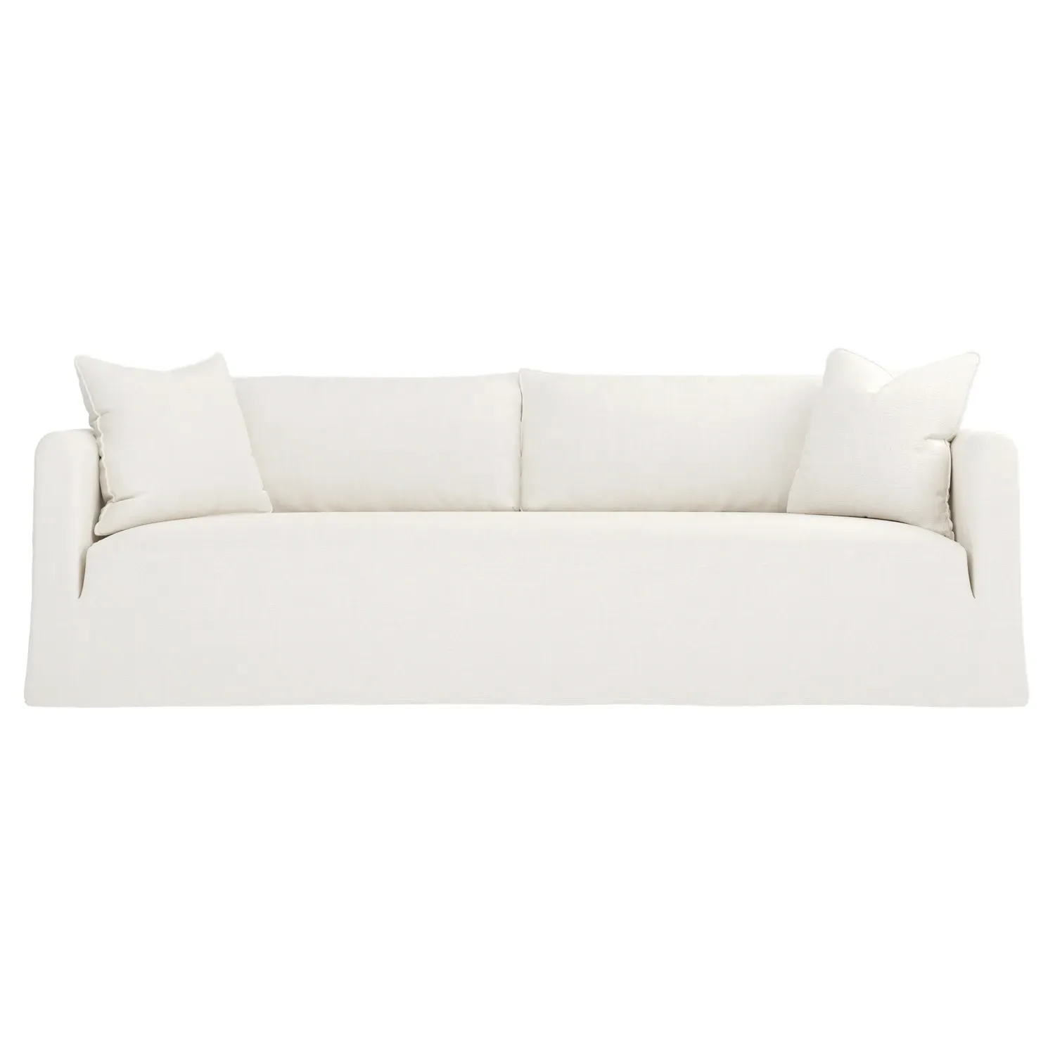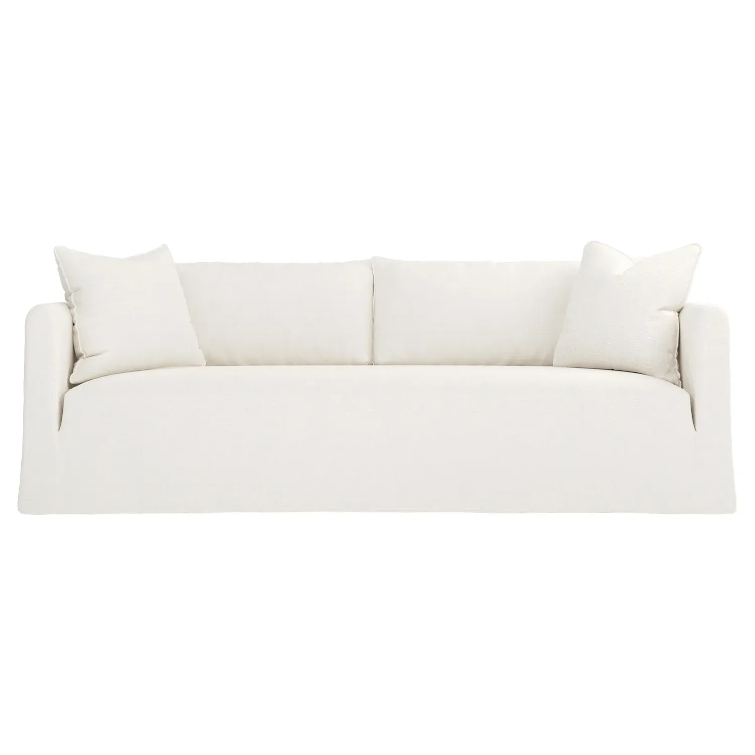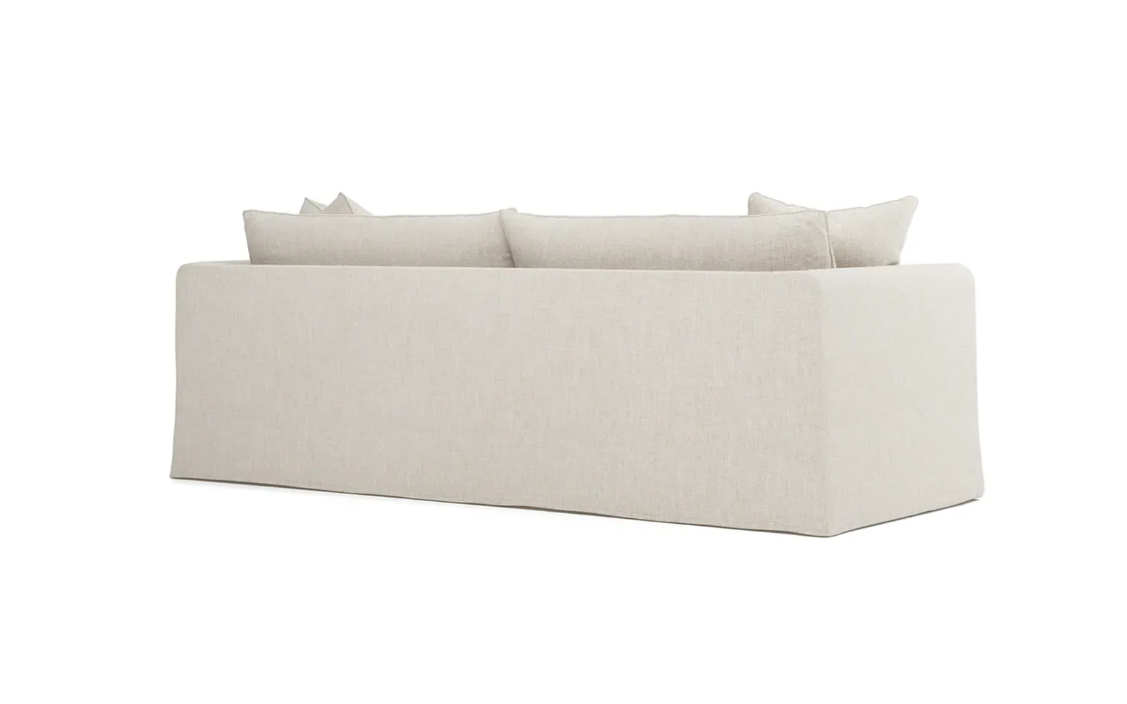 The Kaoru slipcovered sofa combines comfort with practicality through its washable slipcover design. The tight seat features premium foam cushioning for firm support, while plush back pillows filled with feathers and down provide soft comfort. Rounded track arms frame the seamless bench seat, and subtle flange edges add refined detailing. The FSC-certified kiln-dried hardwood frame ensures lasting durability. W228 x D99 x H84 cm.