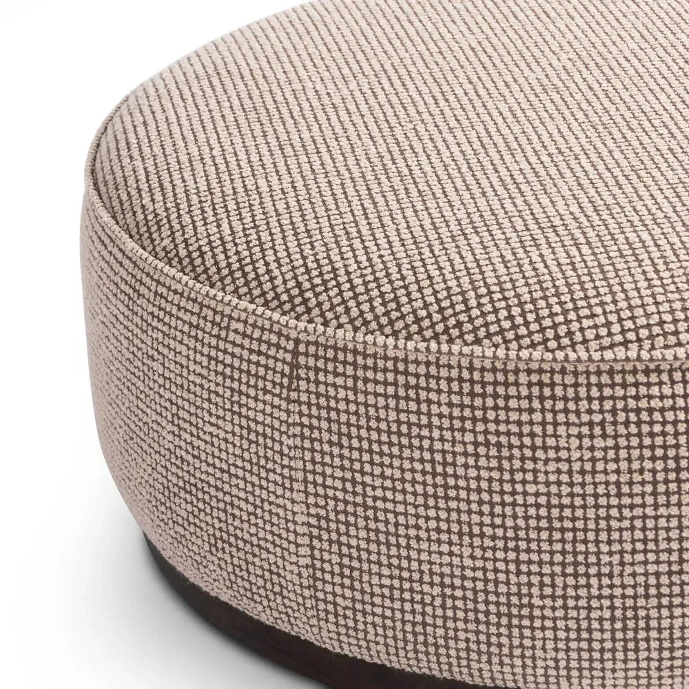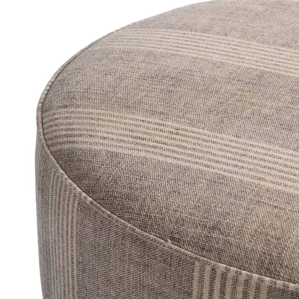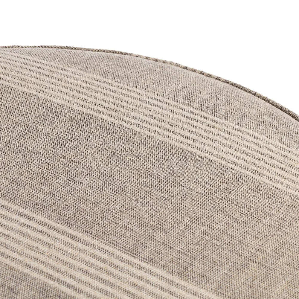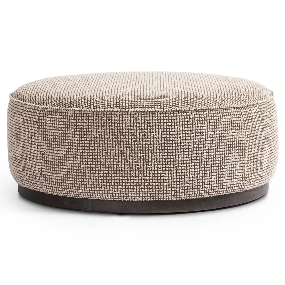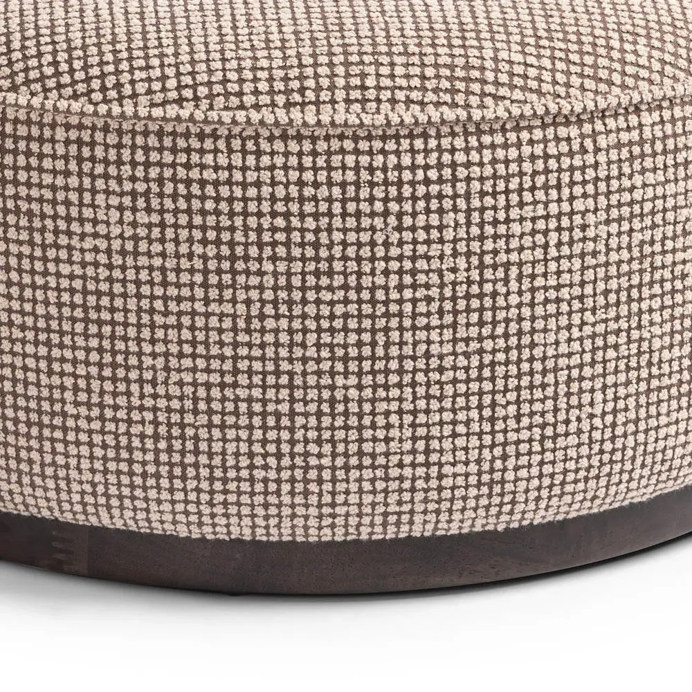 The Leah ottoman offers versatile seating with its round shape and performance grey bouclé fabric. Its solid parawood construction provides durability, while the brushed ebony finish adds sophistication. The 36-inch diameter suits both extra seating and coffee table use, and the sturdy base ensures stability. W91 x D91 x H37 cm.