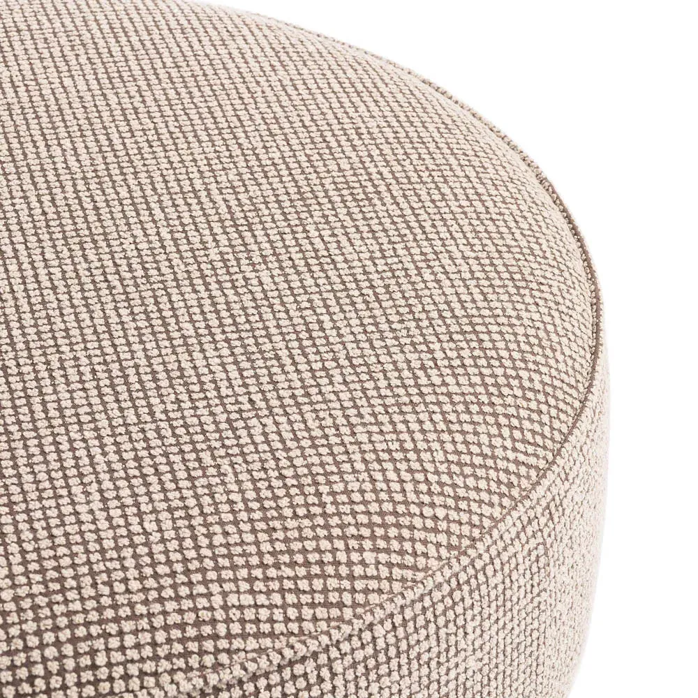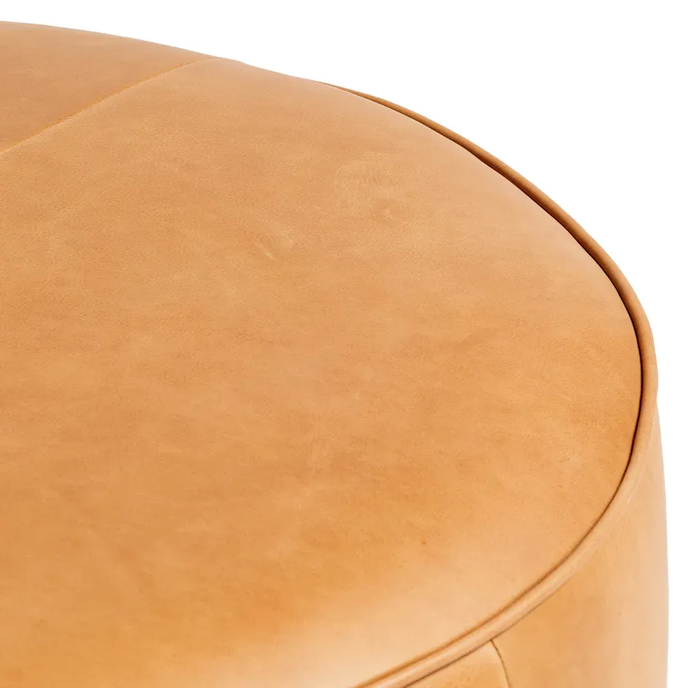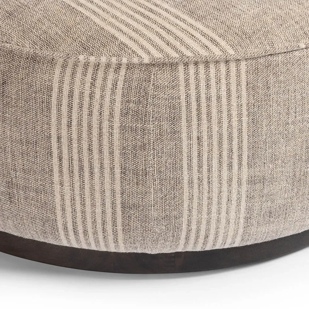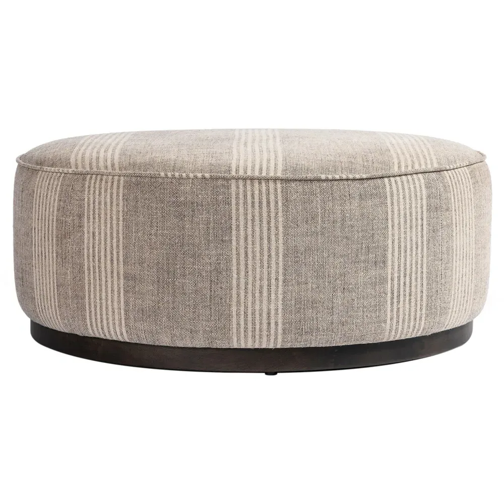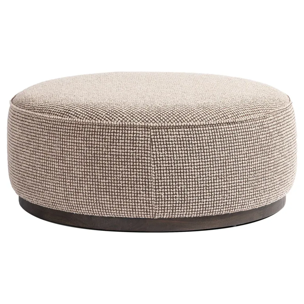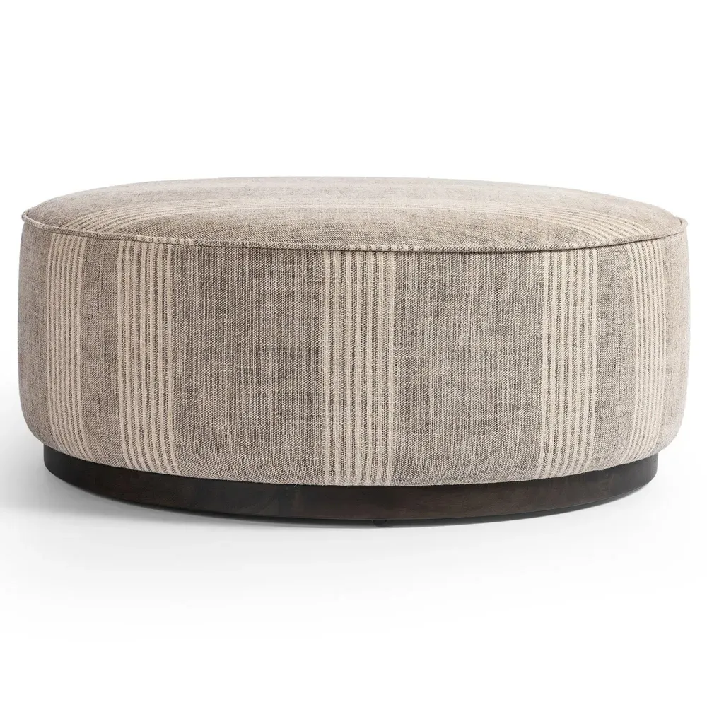 The Leah ottoman offers versatile seating with its round shape and performance grey bouclé fabric. Its solid parawood construction provides durability, while the brushed ebony finish adds sophistication. The 36-inch diameter suits both extra seating and coffee table use, and the sturdy base ensures stability. W91 x D91 x H37 cm.