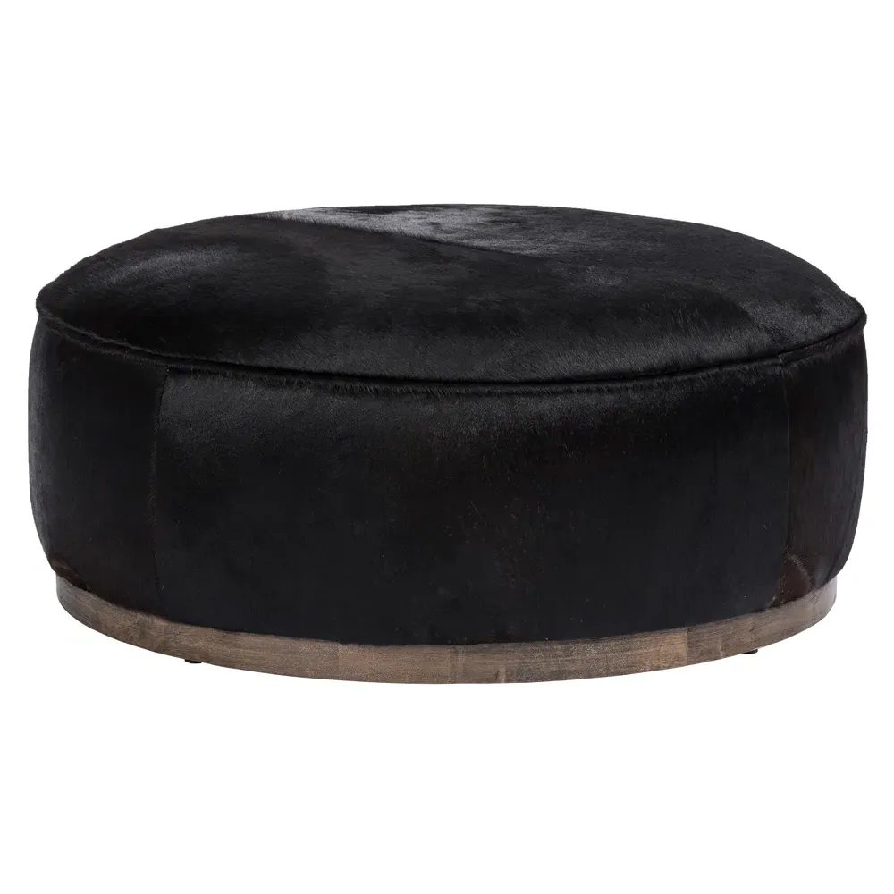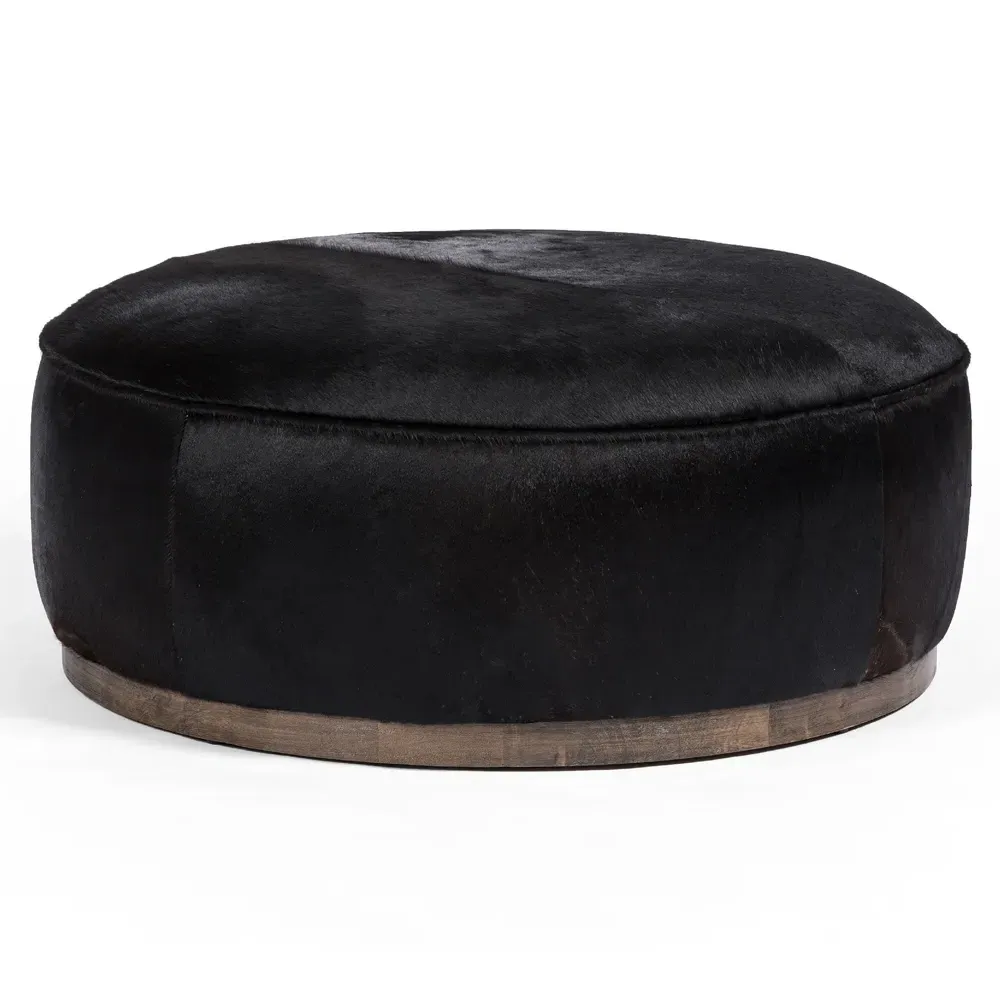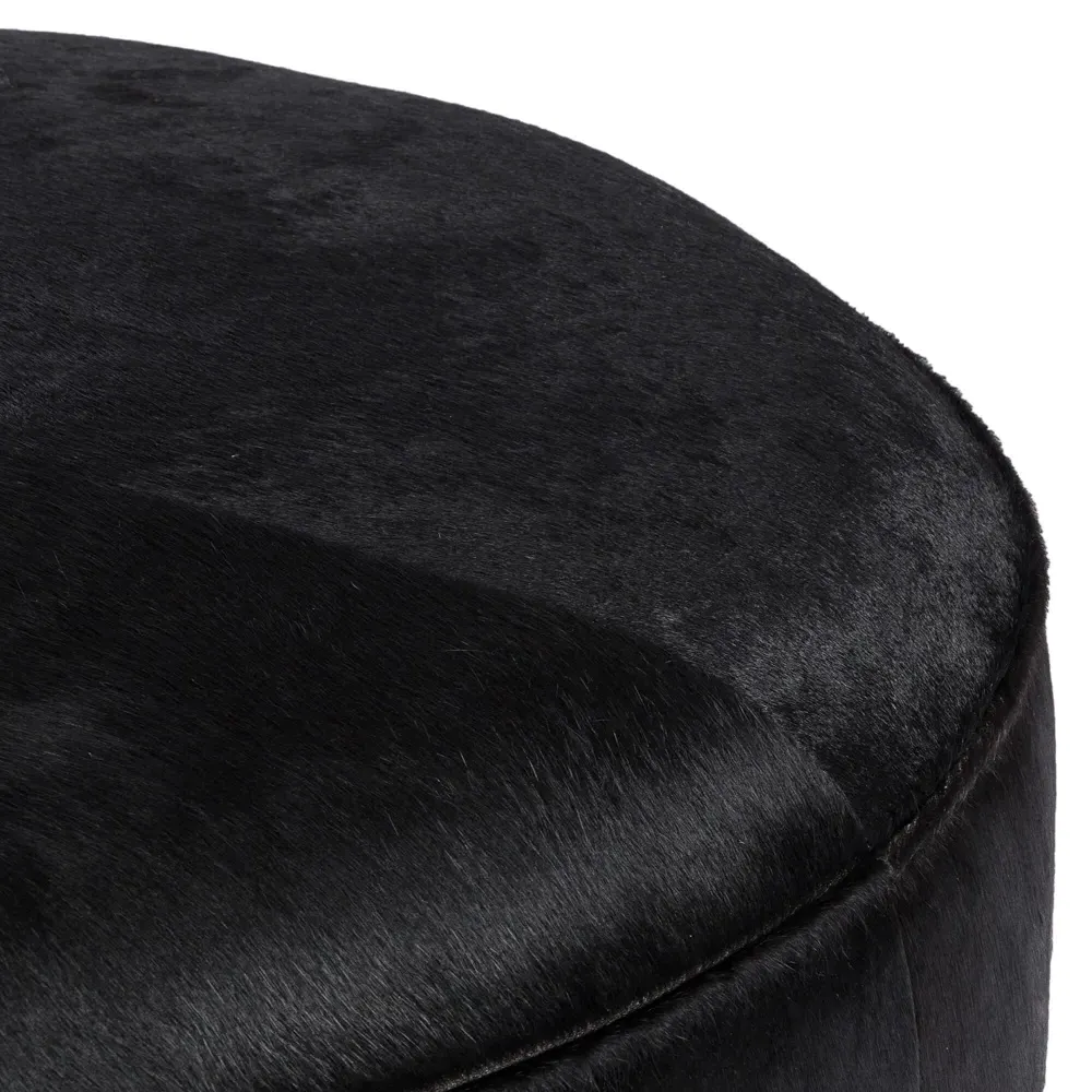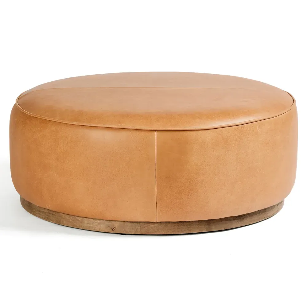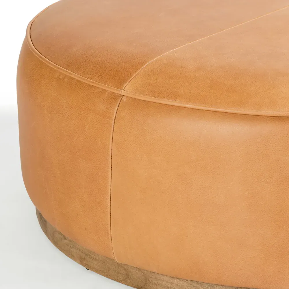The Leah ottoman offers versatile seating with its round shape and performance grey bouclé fabric. Its solid parawood construction provides durability, while the brushed ebony finish adds sophistication. The 36-inch diameter suits both extra seating and coffee table use, and the sturdy base ensures stability. W91 x D91 x H37 cm.
