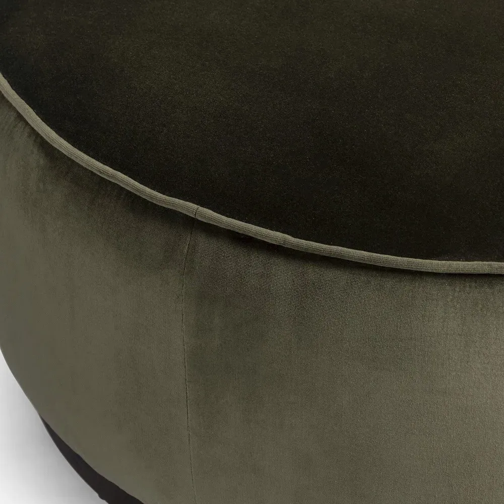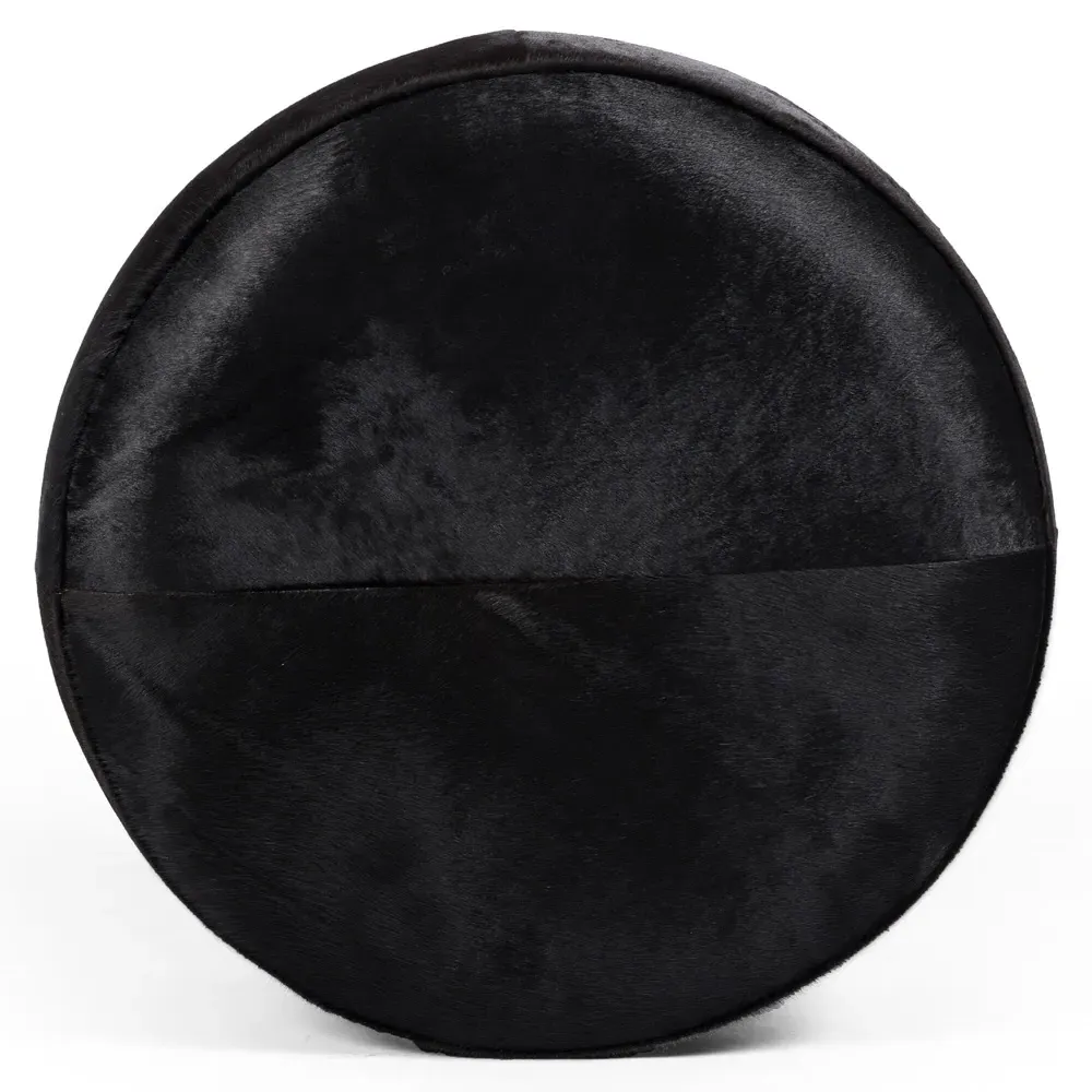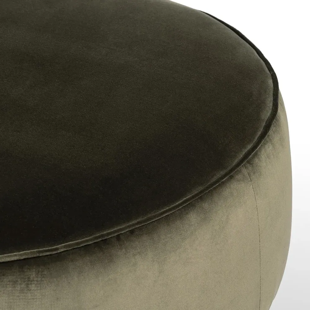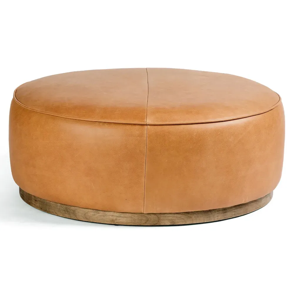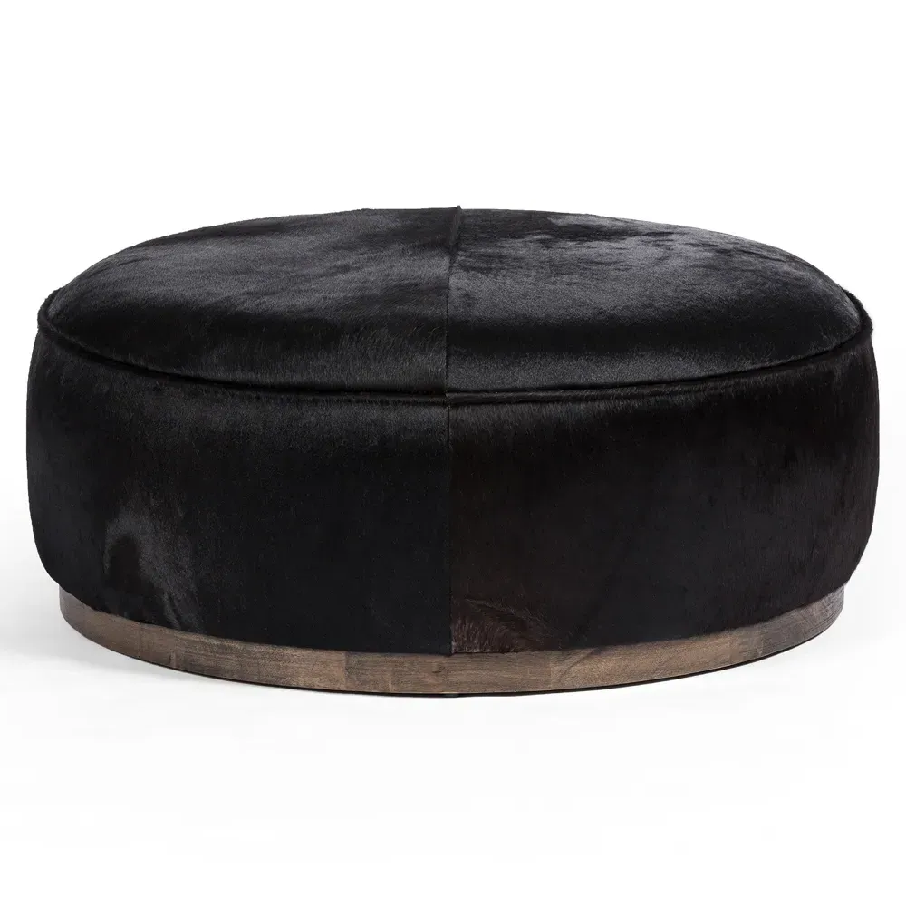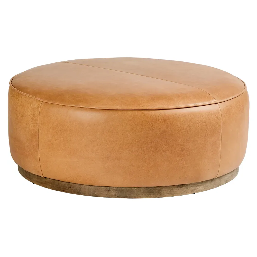 The Leah ottoman offers versatile seating with its round shape and performance grey bouclé fabric. Its solid parawood construction provides durability, while the brushed ebony finish adds sophistication. The 36-inch diameter suits both extra seating and coffee table use, and the sturdy base ensures stability. W91 x D91 x H37 cm.