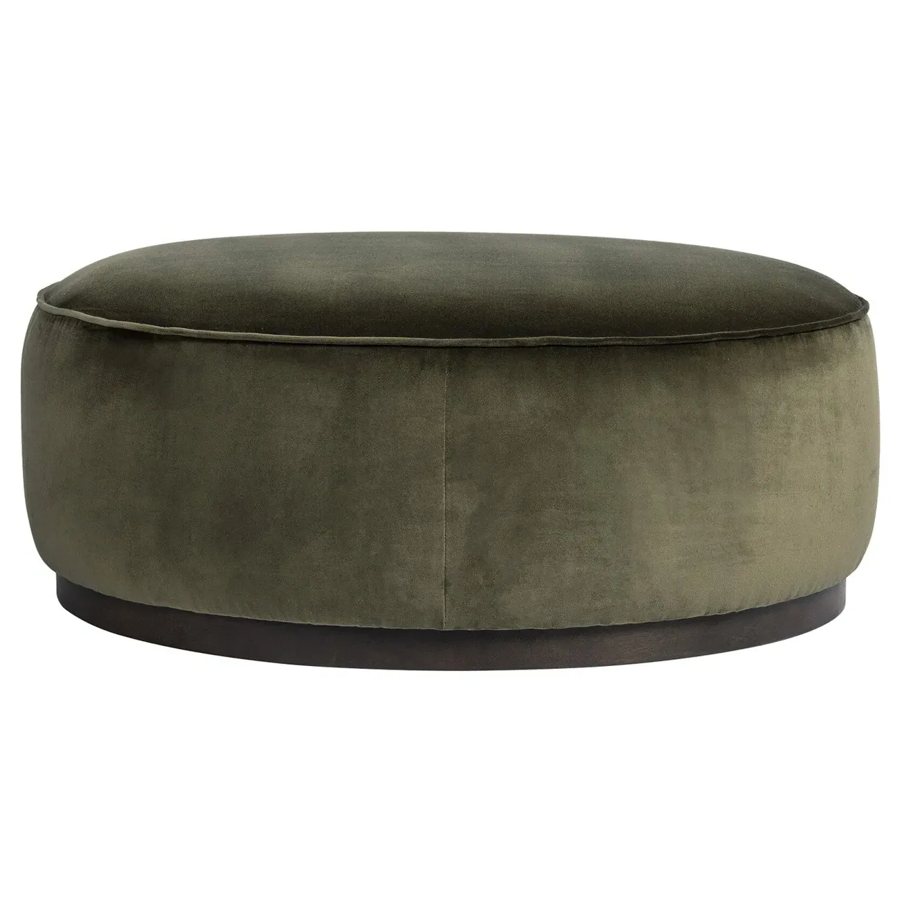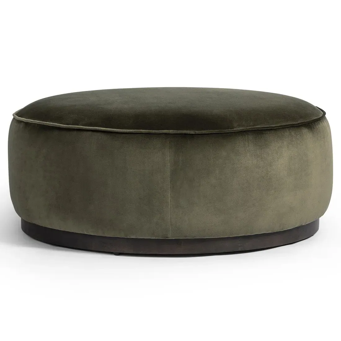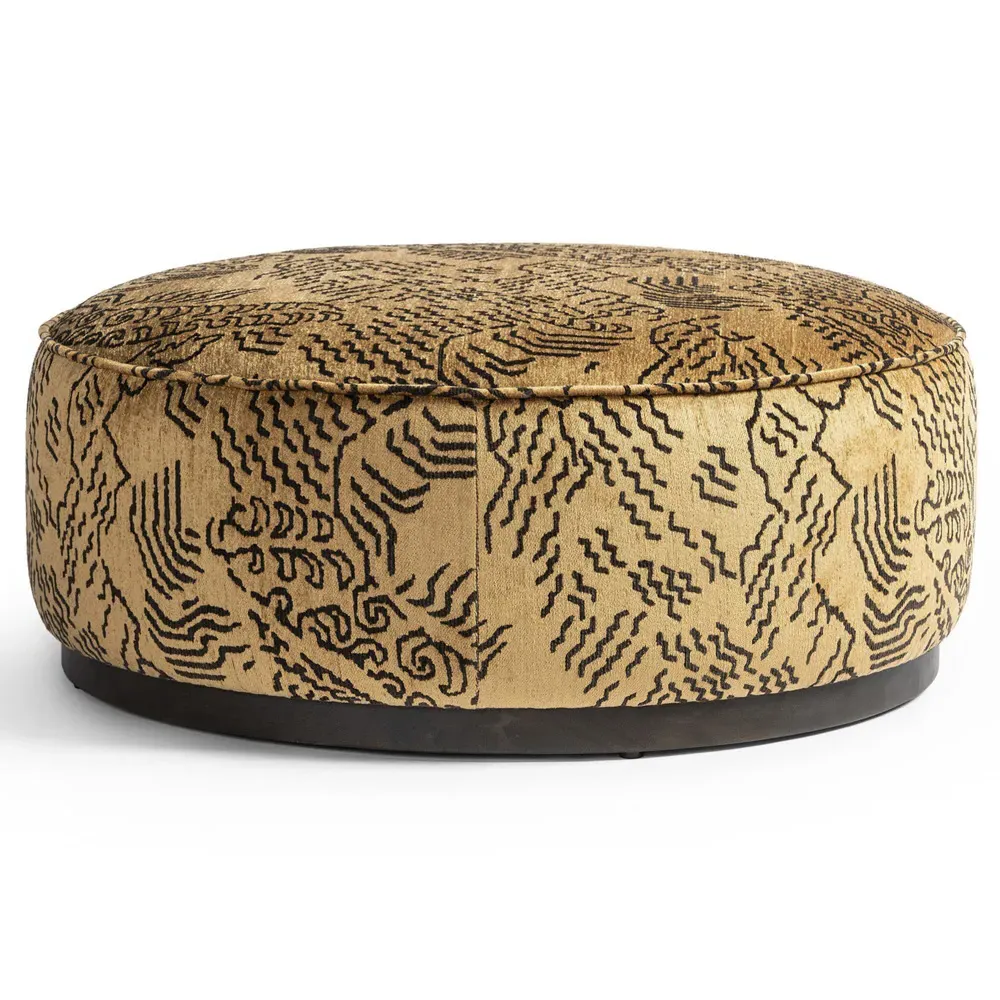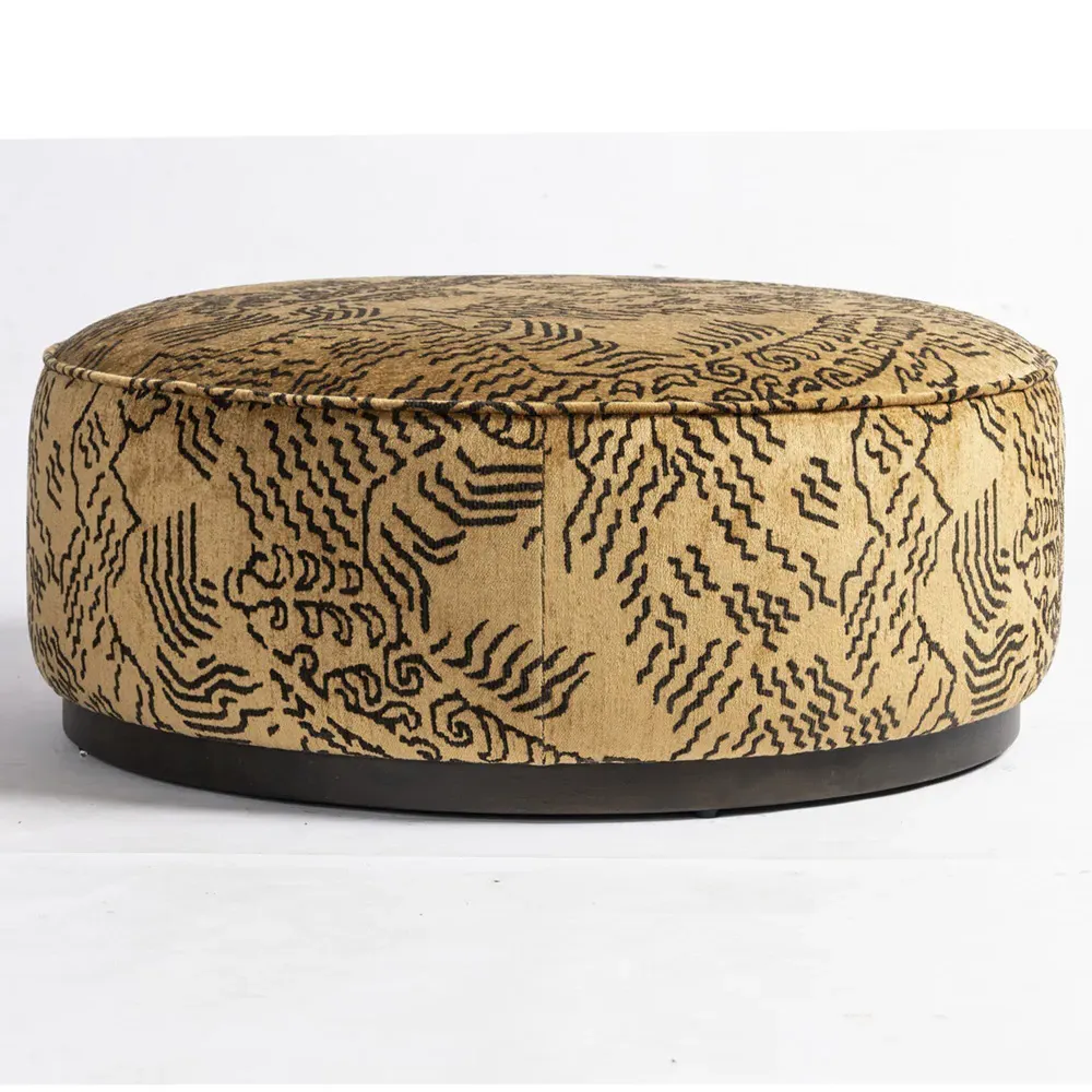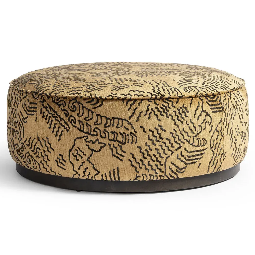 The Leah ottoman offers versatile seating with its round shape and performance grey bouclé fabric. Its solid parawood construction provides durability, while the brushed ebony finish adds sophistication. The 36-inch diameter suits both extra seating and coffee table use, and the sturdy base ensures stability. W91 x D91 x H37 cm.