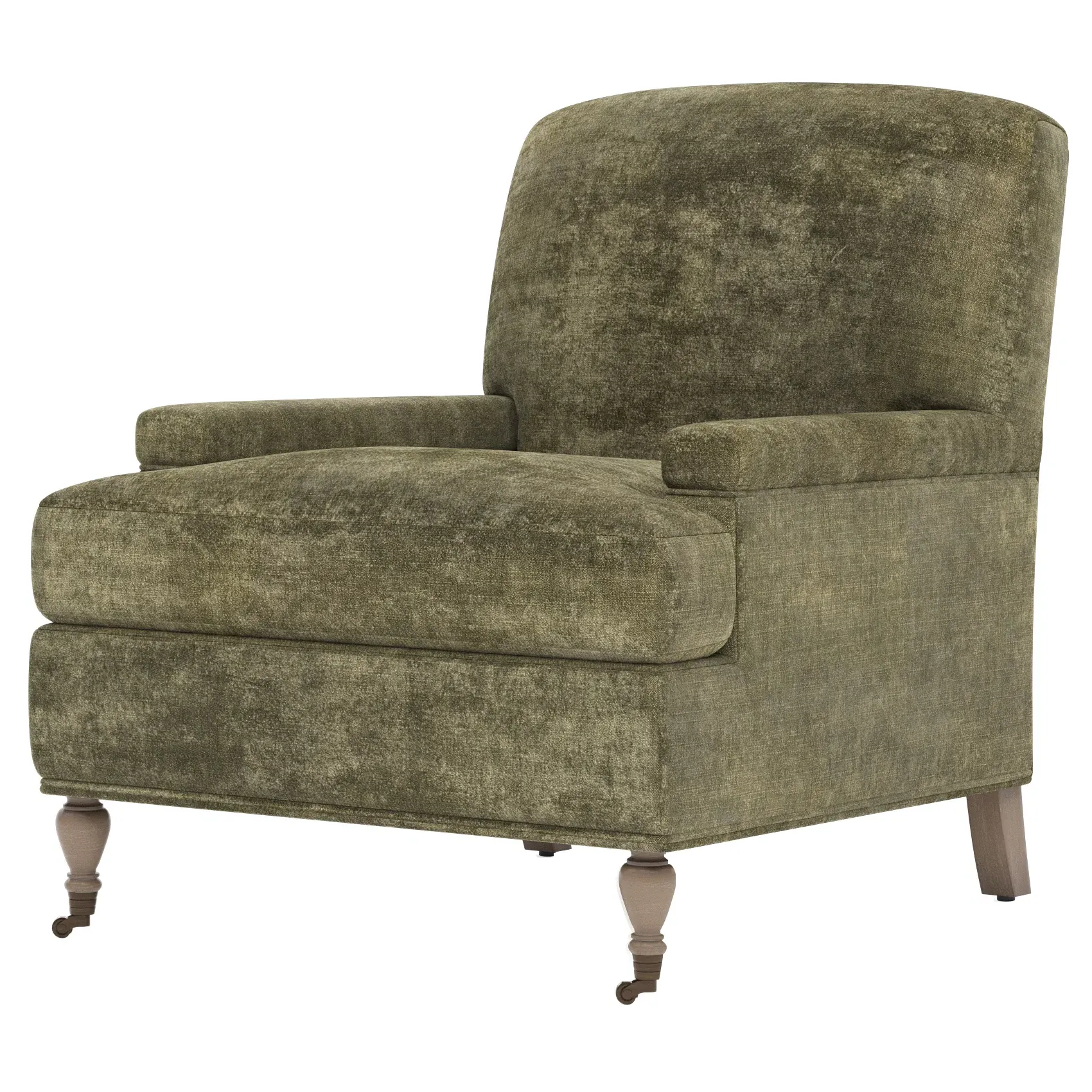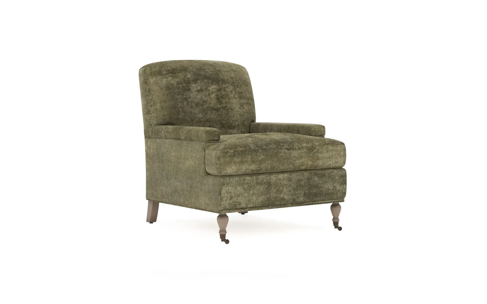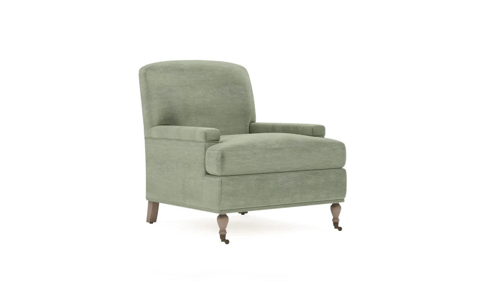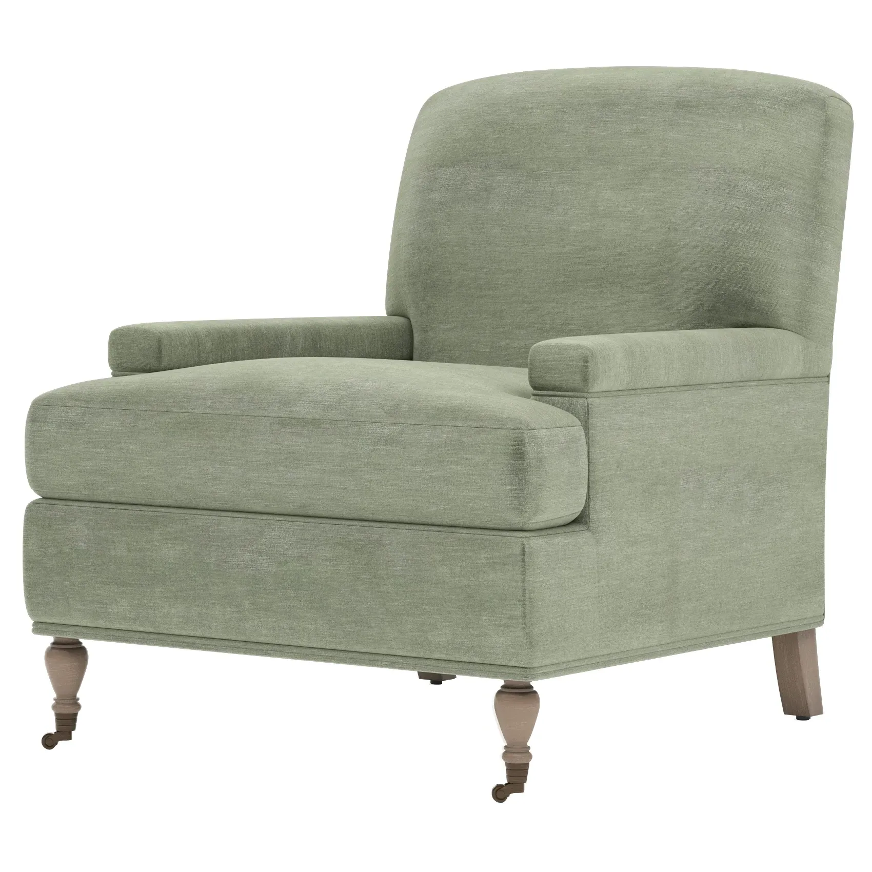 The Liliane chair combines willow green velvet upholstery with a driftwood hardwood frame for lasting durability. Its CertiPUR-US certified foam core provides high-resiliency support, while the convoluted foam layer and feather-down blend offer enhanced comfort. The channeled downproof jacket maintains cushion shape and prevents filling migration. W81 x D94 x H89 cm.