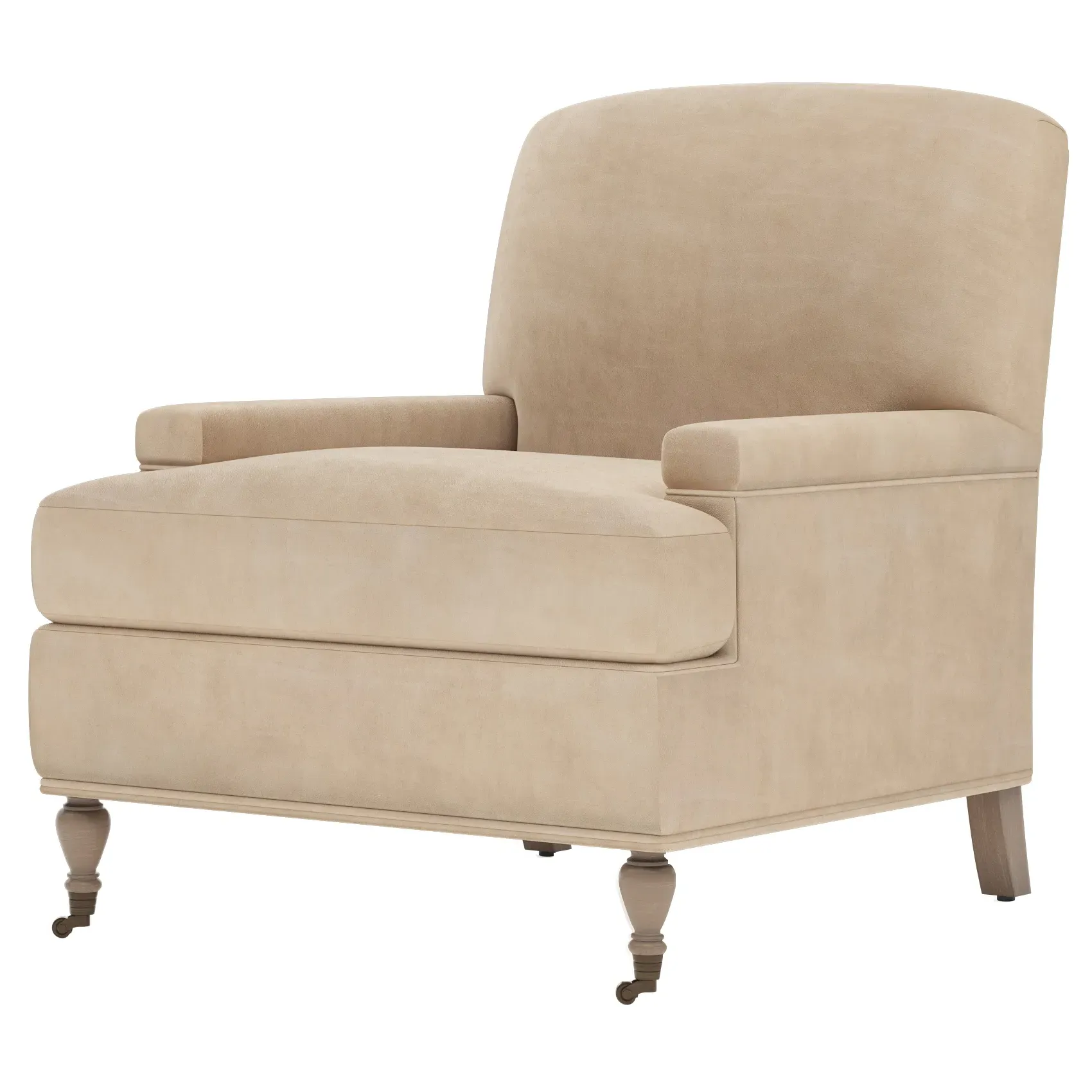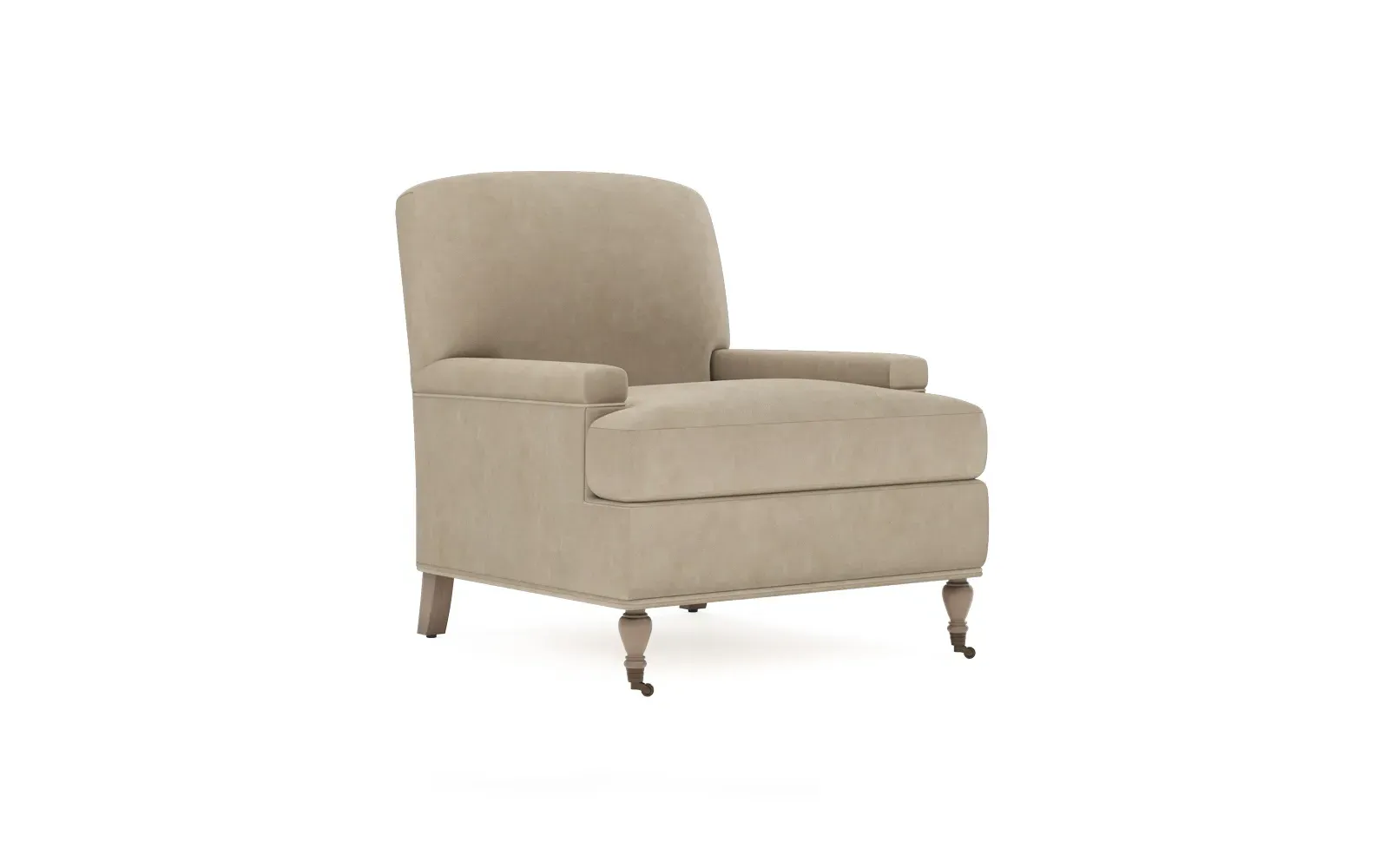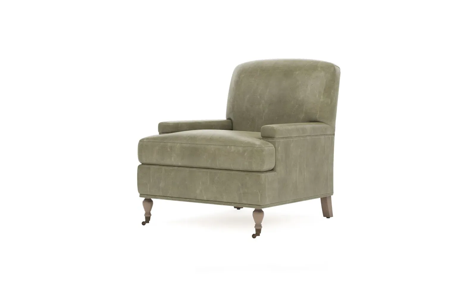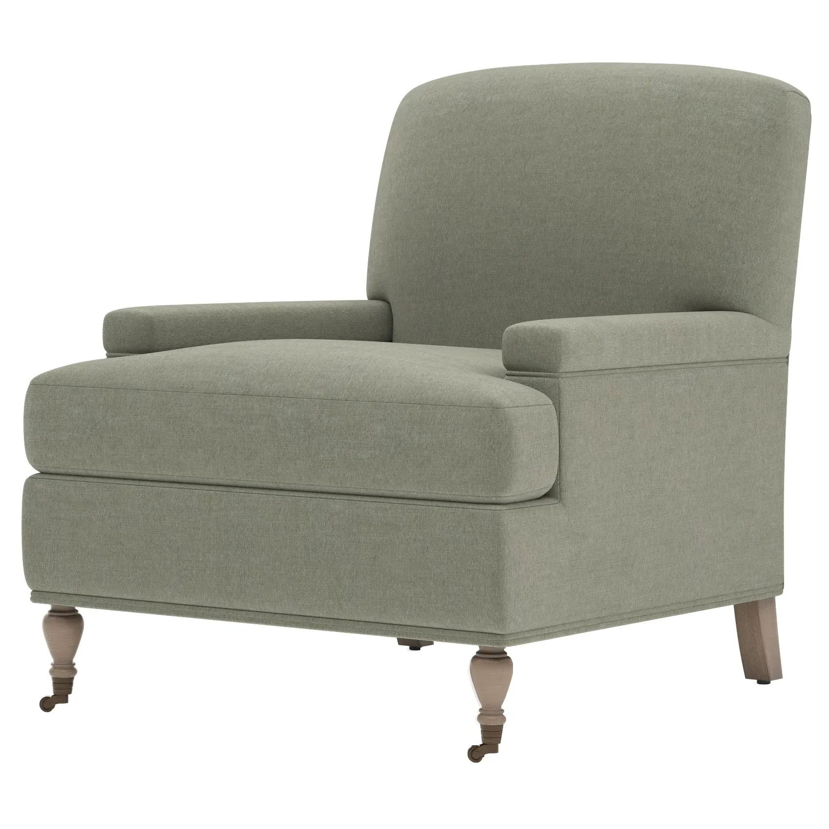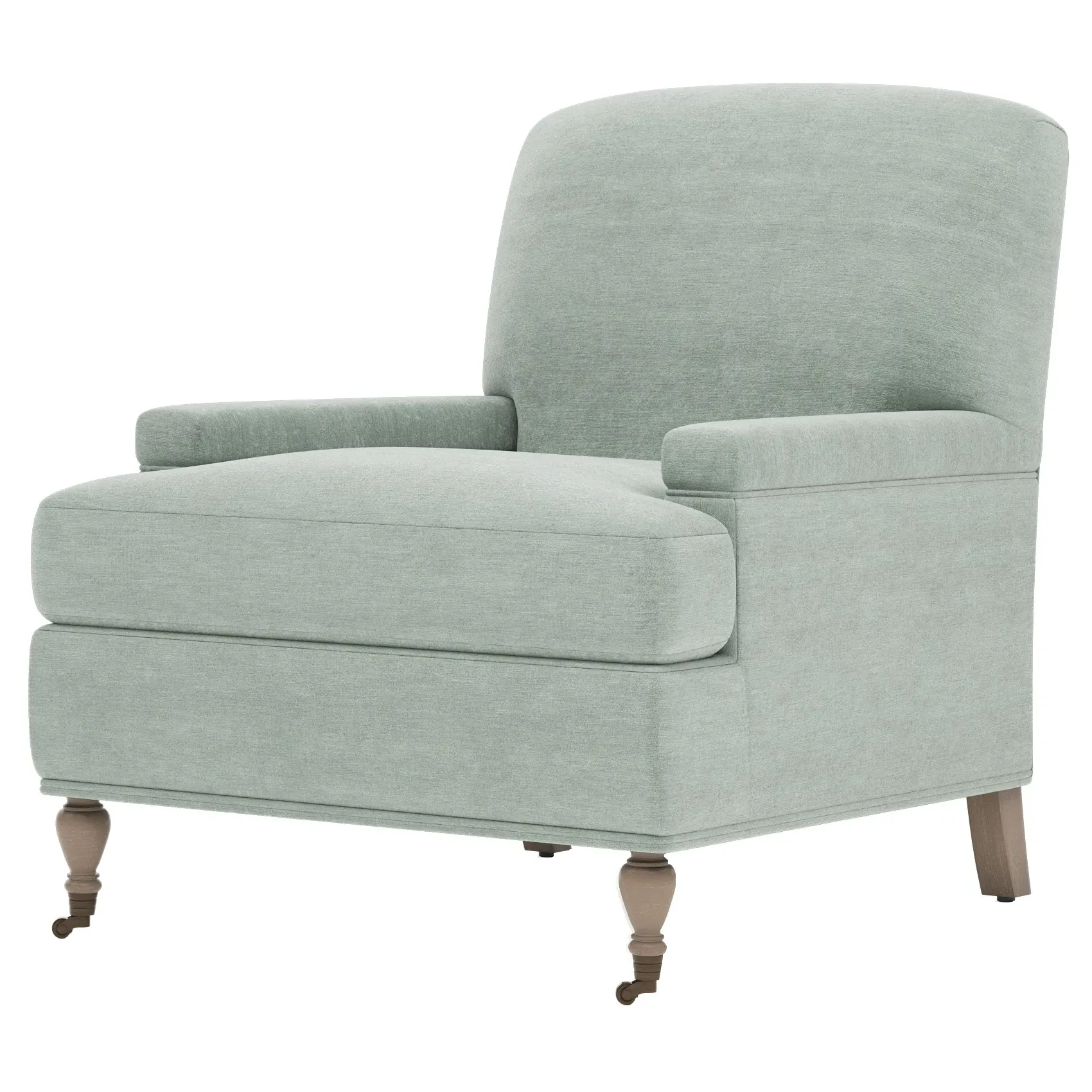 The Liliane chair combines willow green velvet upholstery with a driftwood hardwood frame for lasting durability. Its CertiPUR-US certified foam core provides high-resiliency support, while the convoluted foam layer and feather-down blend offer enhanced comfort. The channeled downproof jacket maintains cushion shape and prevents filling migration. W81 x D94 x H89 cm.