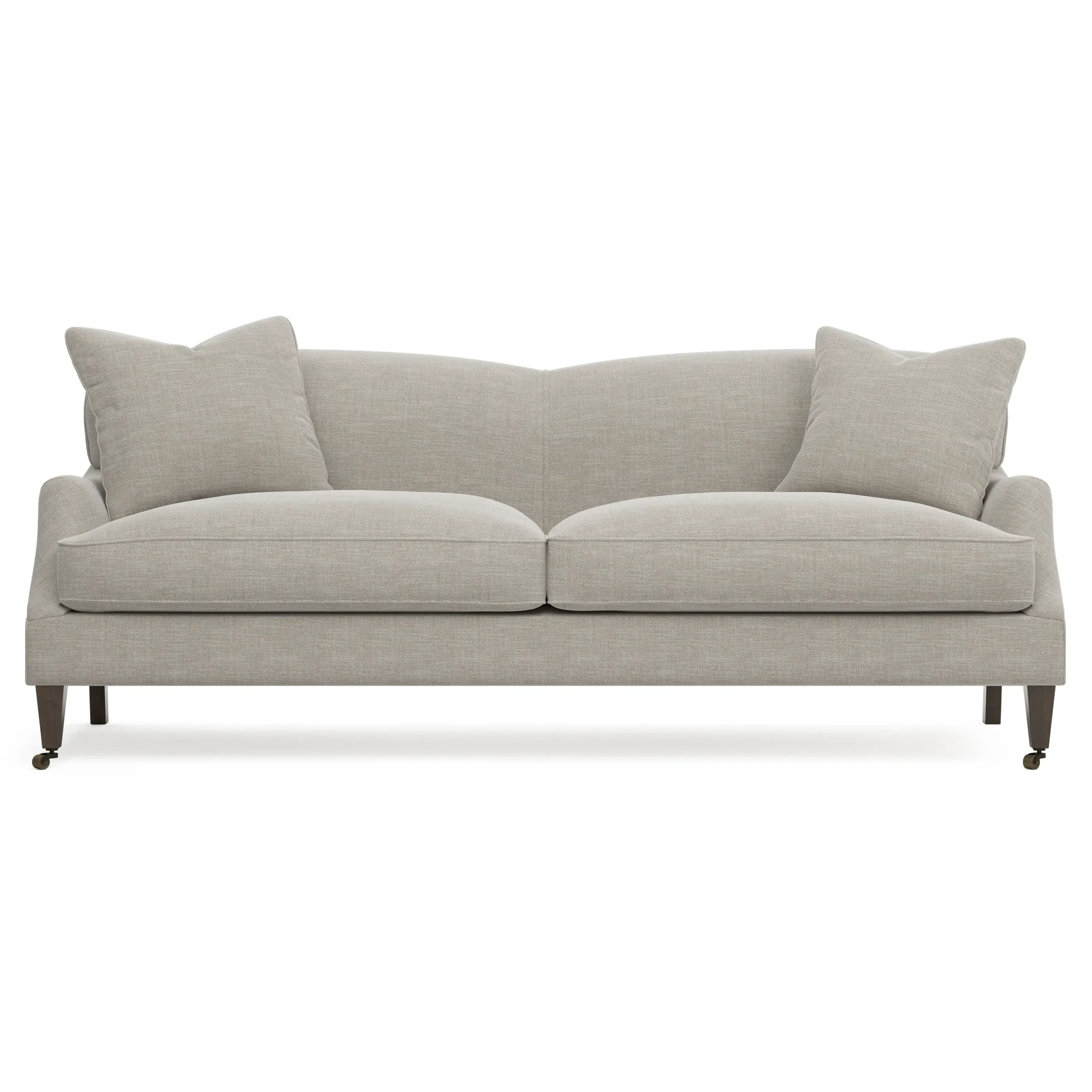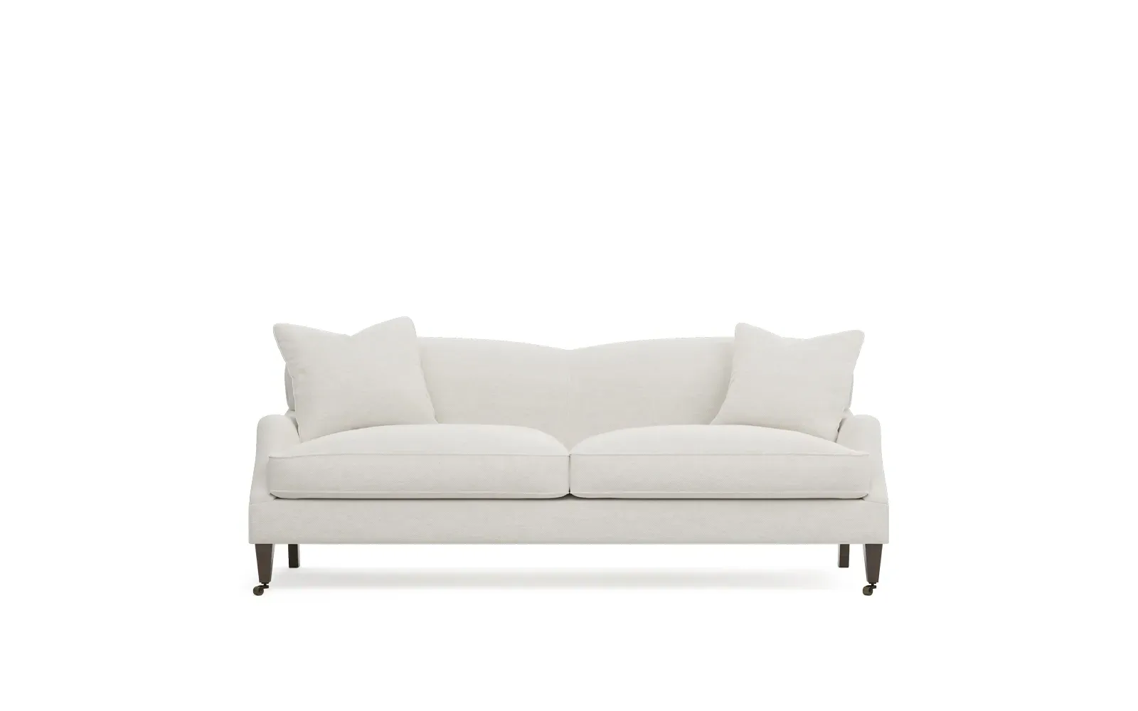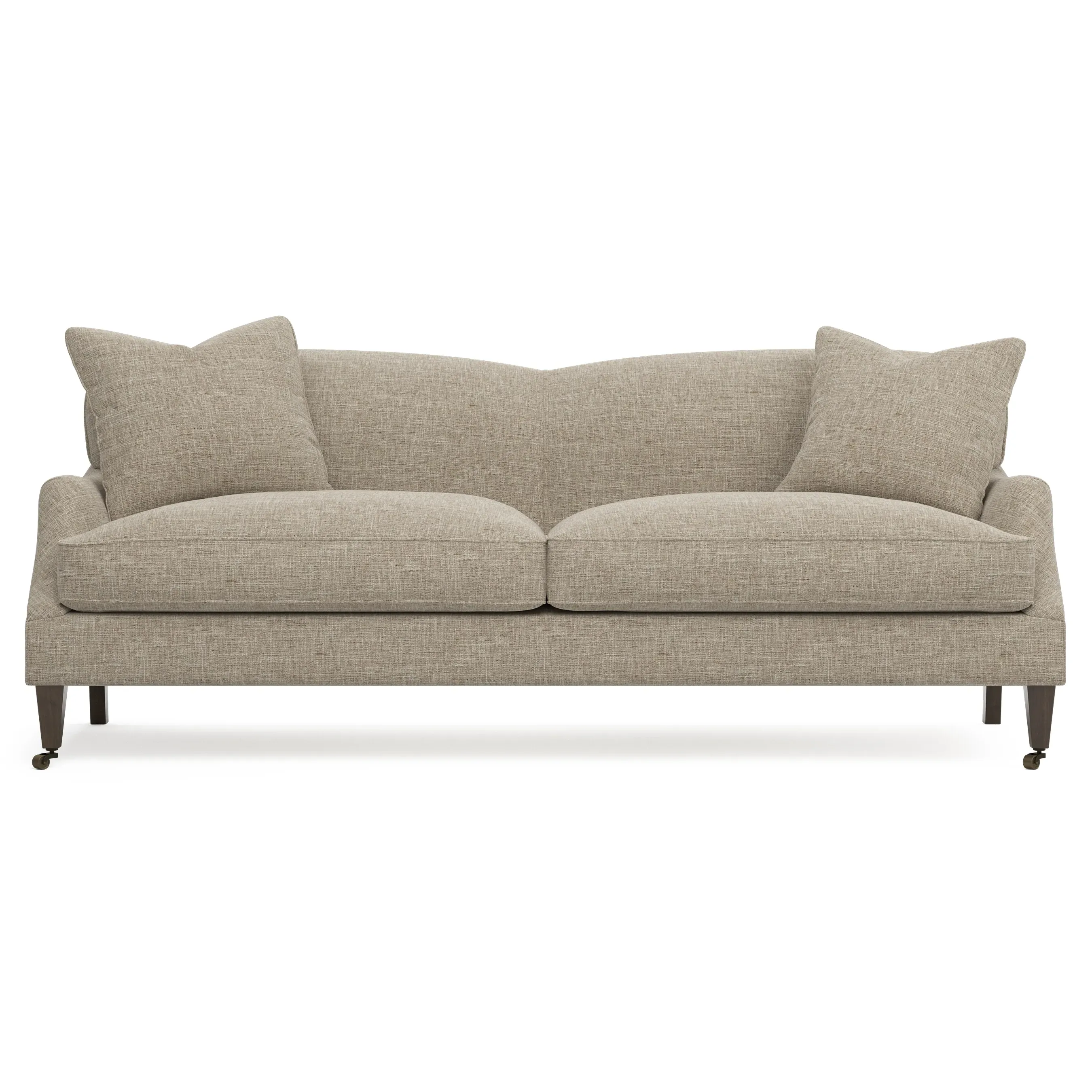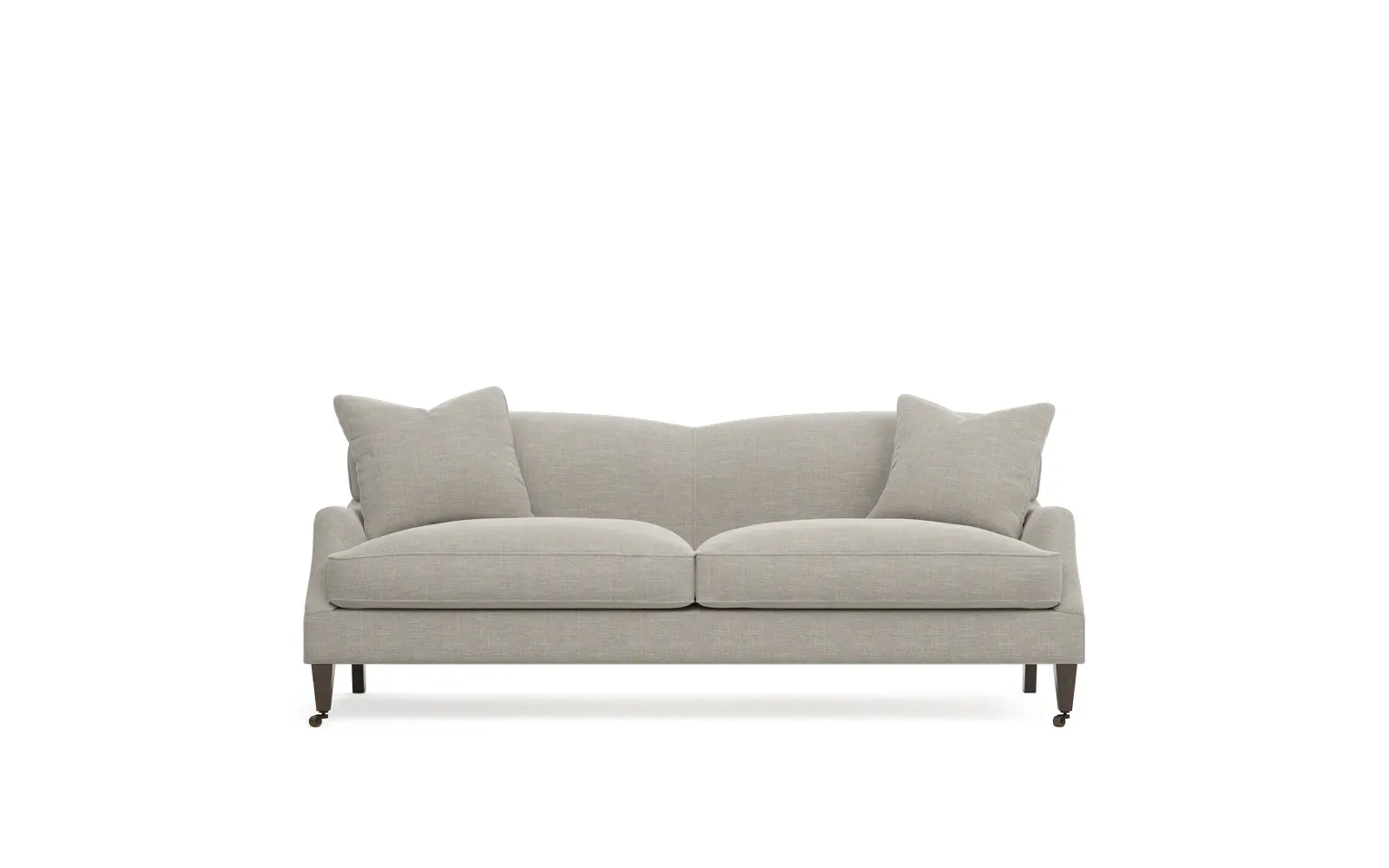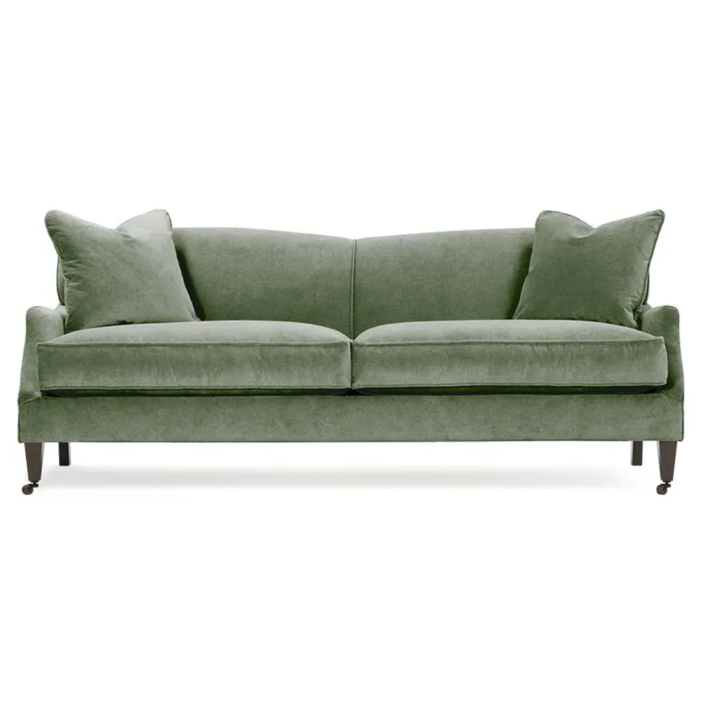 <b>Overall Dimensions:</b> 85" W x 39" D x 34" H. <b>Seat Dimensions:</b> 77” W x 26” D x 22” H; <b>Arm Height:</b> 23”; <b>Leg Height:</b> 7”. <b>Materials:</b> FSC®-certified, US-sourced, formaldehyde-free solid kiln-dried hardwood and furniture-grade laminates, metal and vulcanized rubber casters. <b>Material Finishes:</b> Espresso legs, brass casters. <b>Cushion Fill:</b> A CertiPUR-US® certified, high-resiliency foam core wrapped with a super soft foam layer then inserted into a channel-quilted casing filled with a blend of 50% fiber, 5% down, and 45% feather.