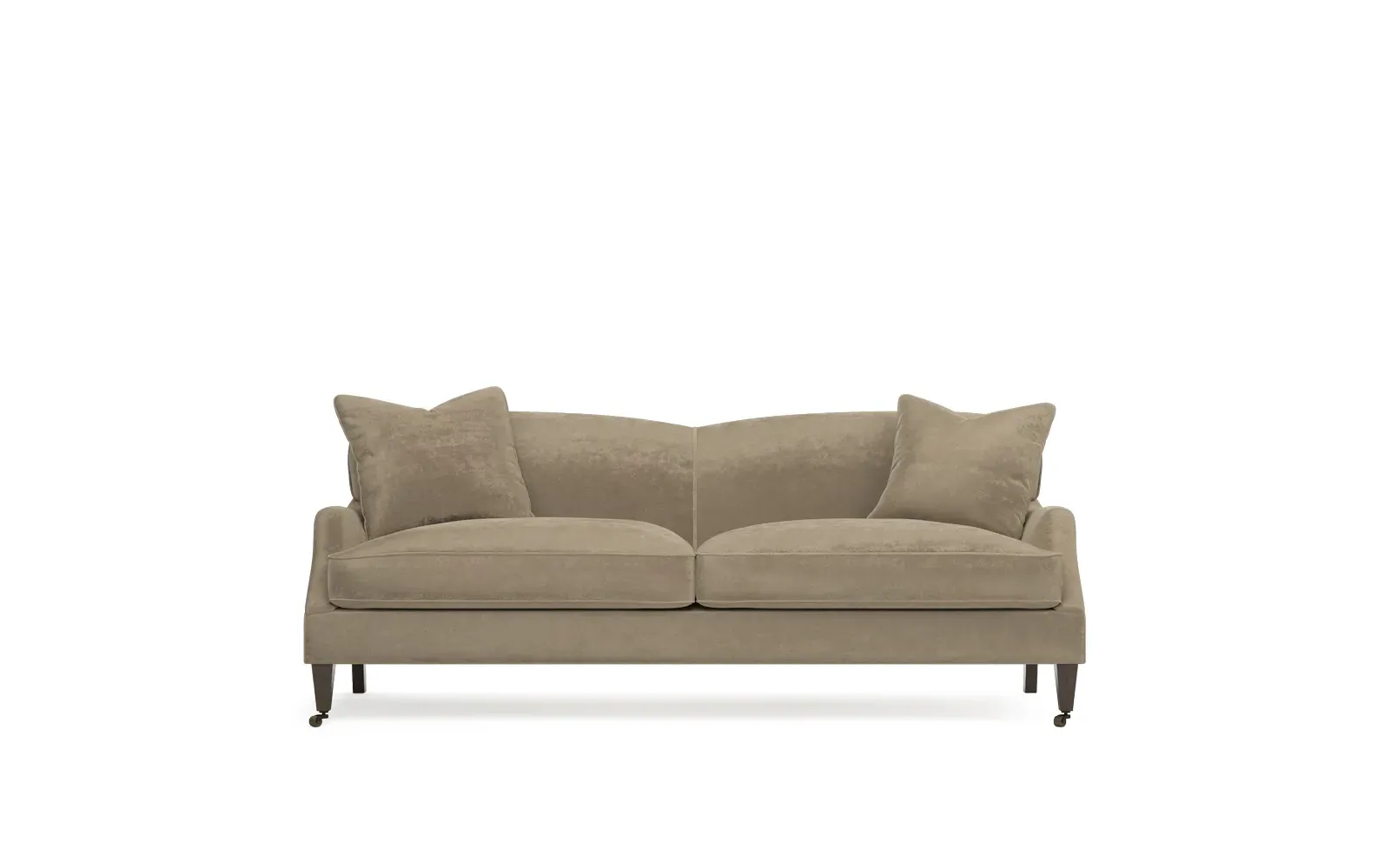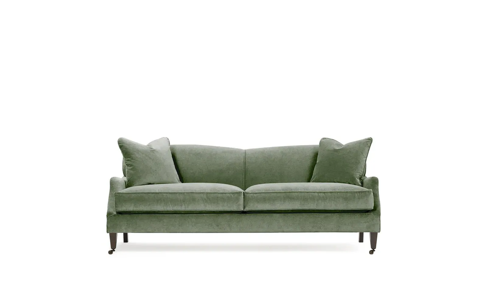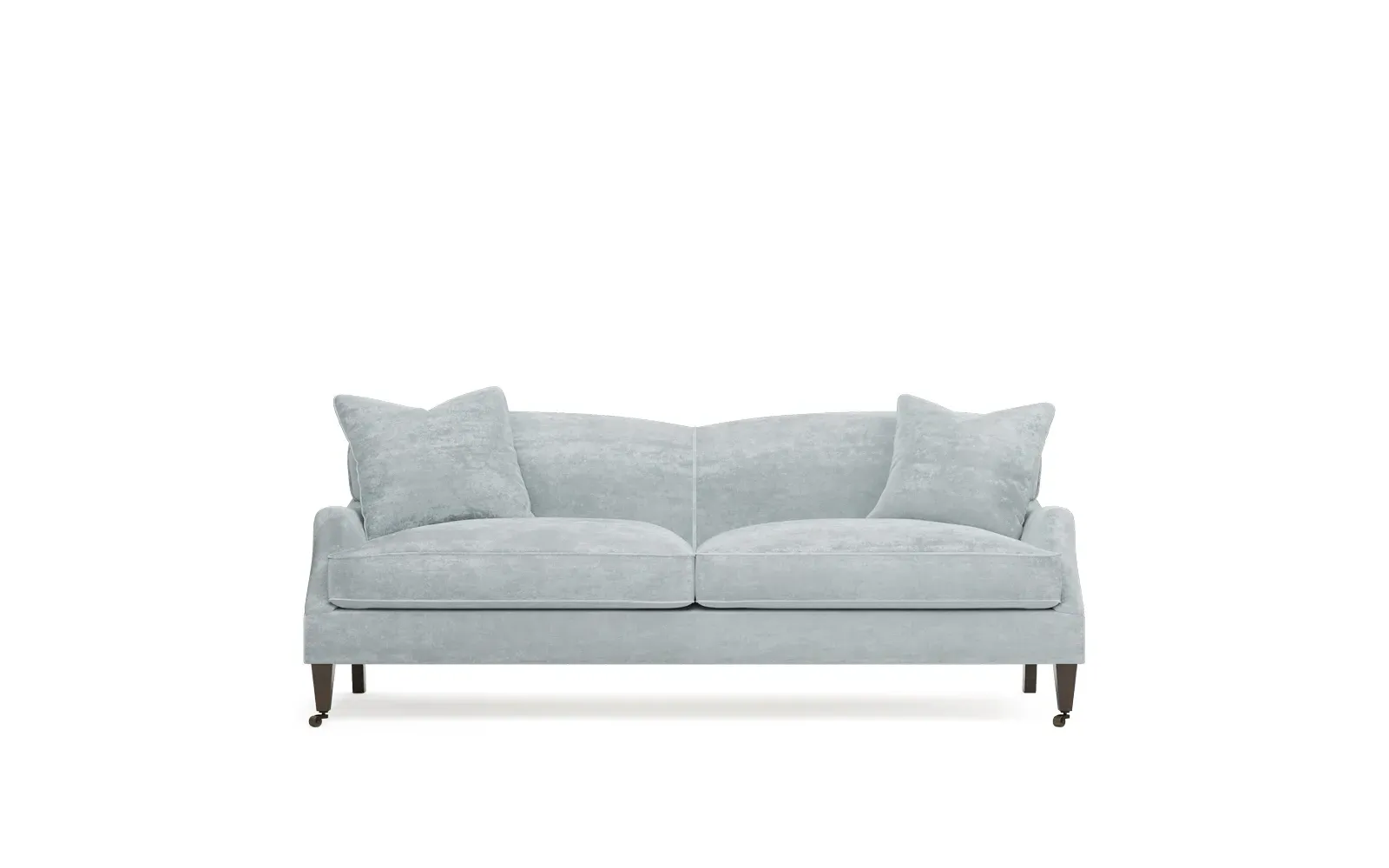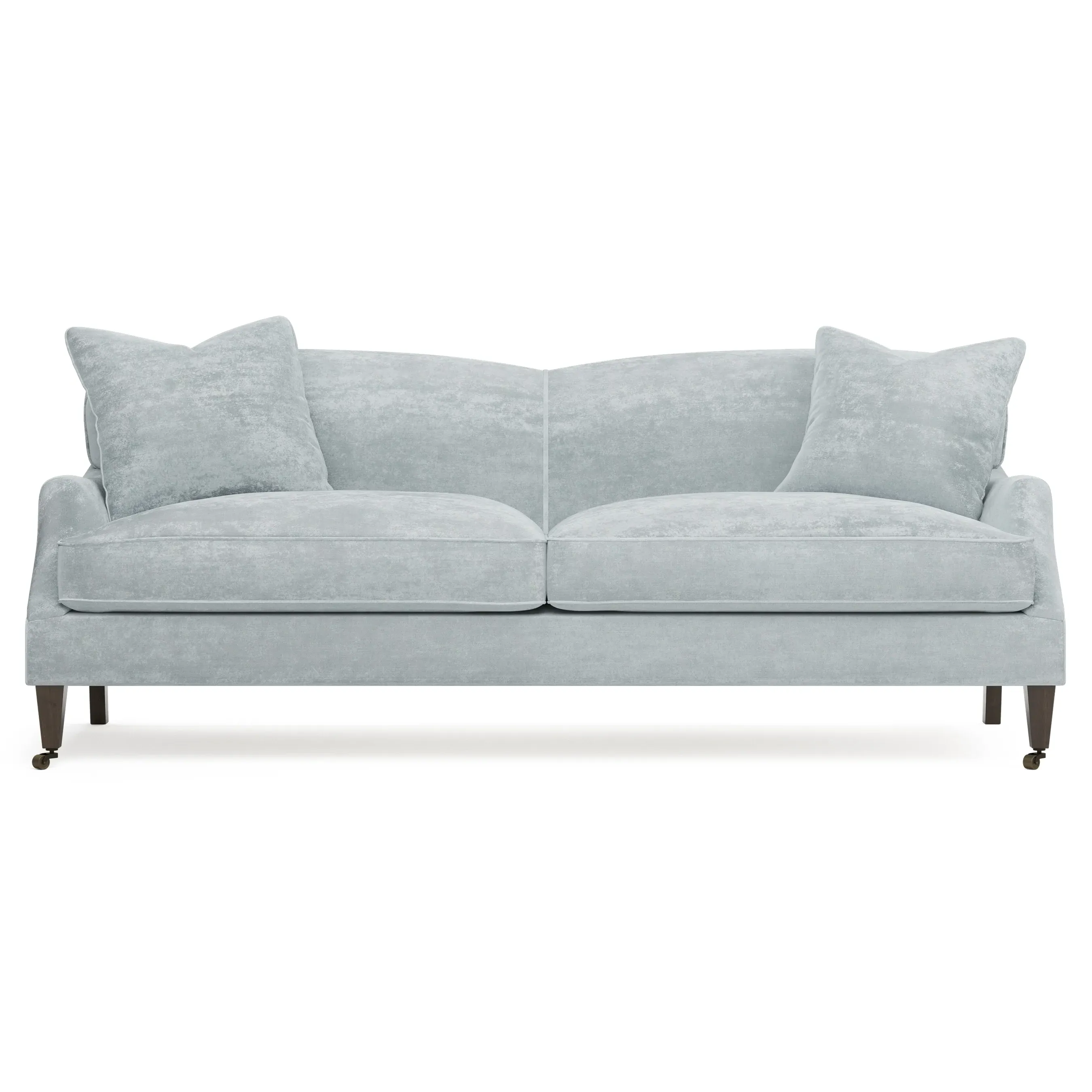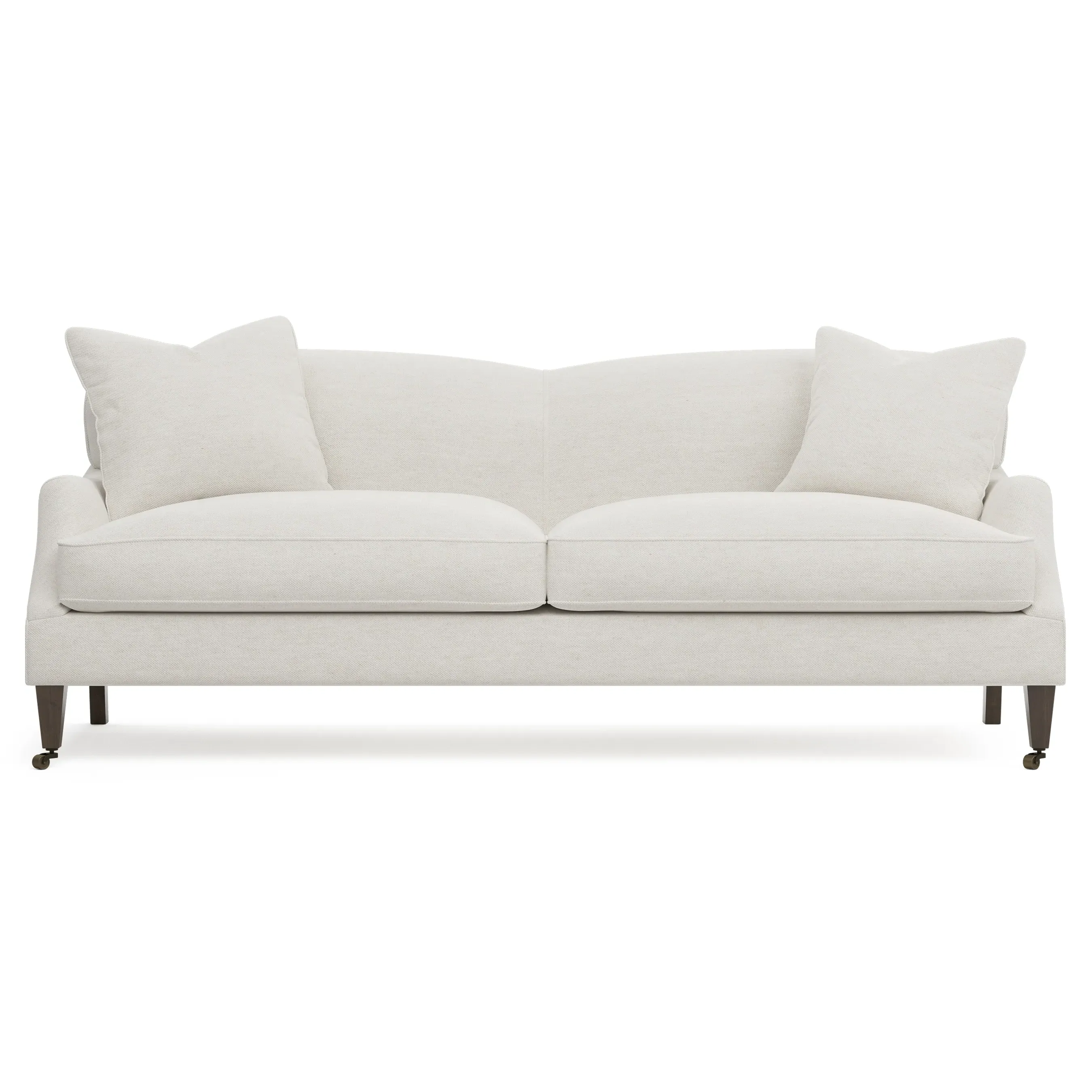 <b>Overall Dimensions:</b> 85" W x 39" D x 34" H. <b>Seat Dimensions:</b> 77” W x 26” D x 22” H; <b>Arm Height:</b> 23”; <b>Leg Height:</b> 7”. <b>Materials:</b> FSC®-certified, US-sourced, formaldehyde-free solid kiln-dried hardwood and furniture-grade laminates, metal and vulcanized rubber casters. <b>Material Finishes:</b> Espresso legs, brass casters. <b>Cushion Fill:</b> A CertiPUR-US® certified, high-resiliency foam core wrapped with a super soft foam layer then inserted into a channel-quilted casing filled with a blend of 50% fiber, 5% down, and 45% feather.