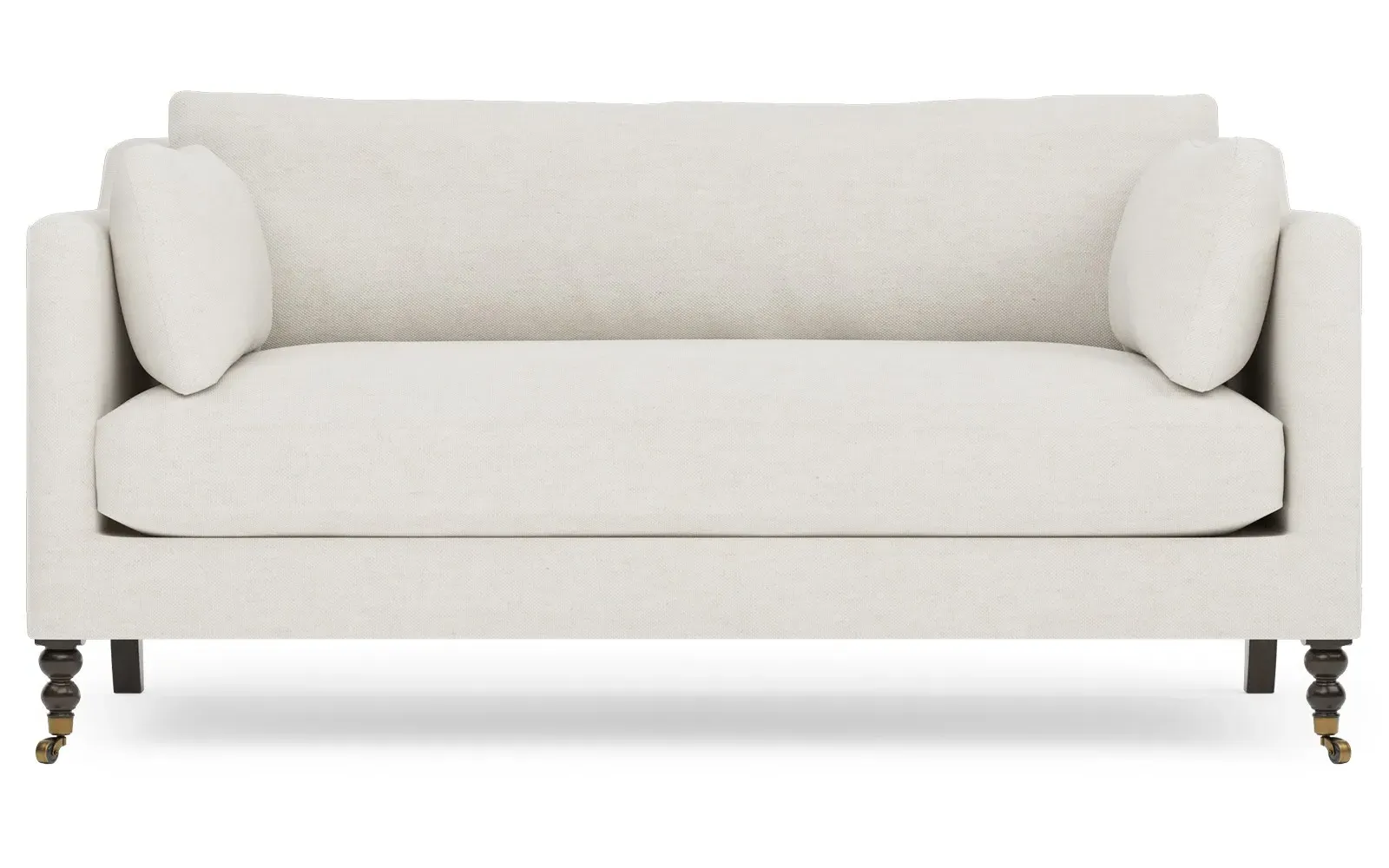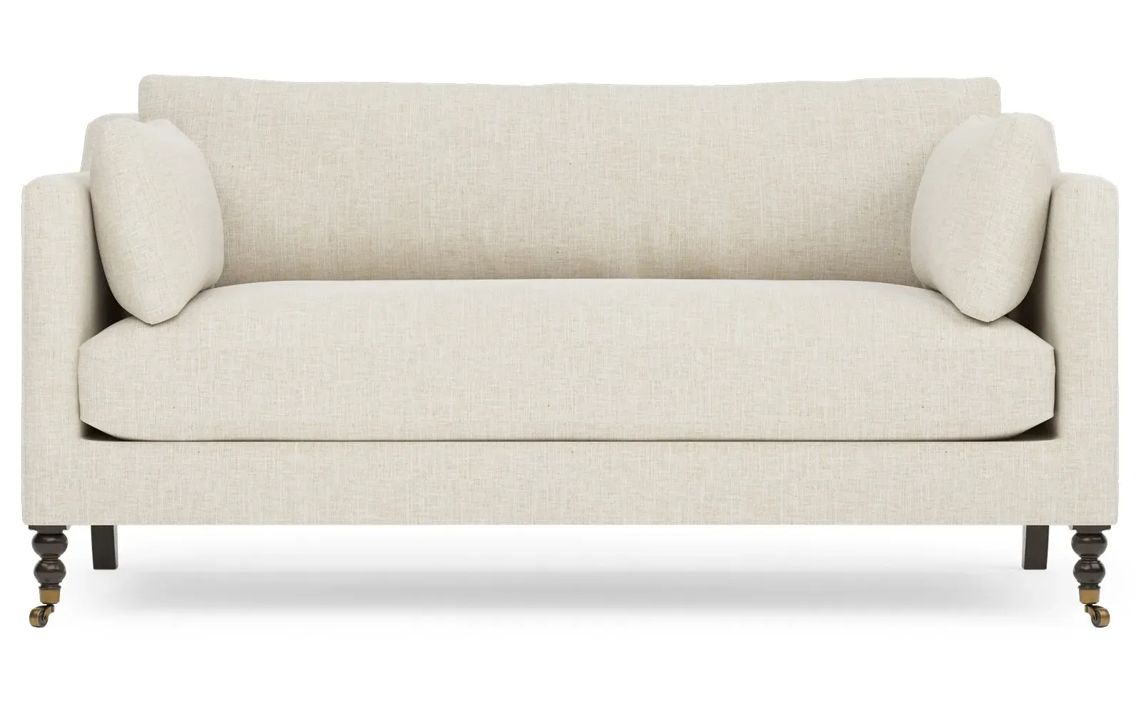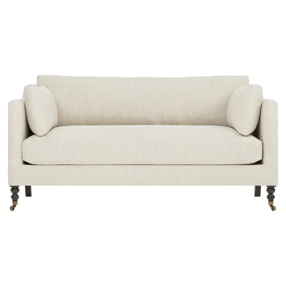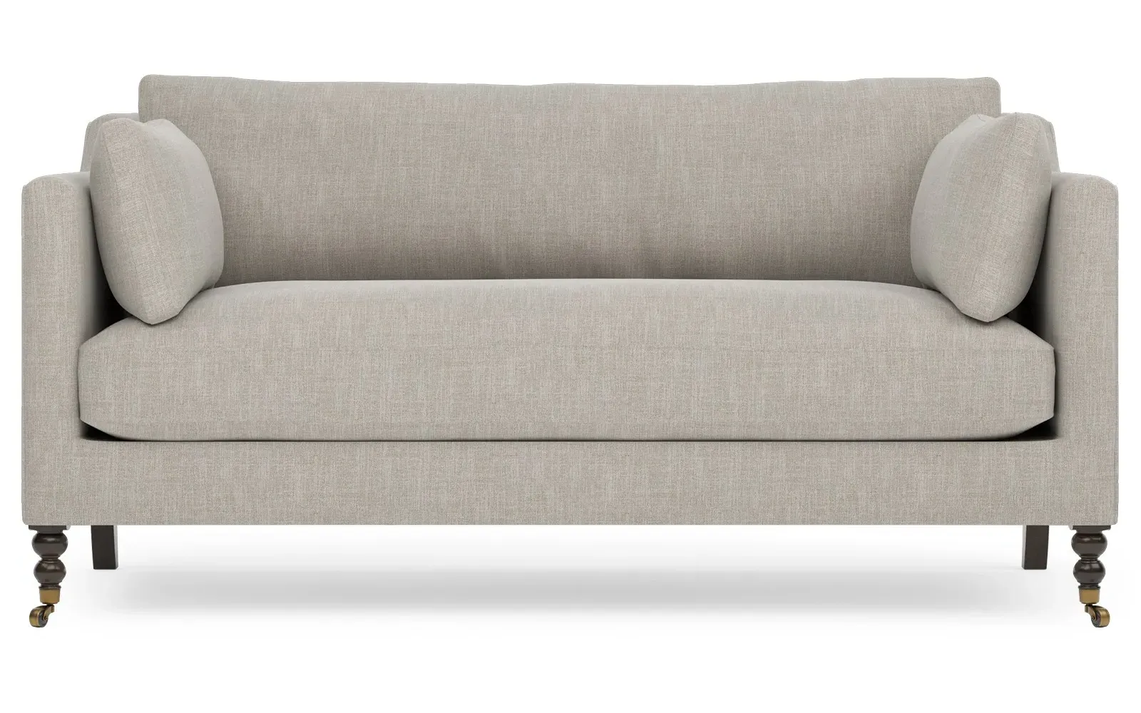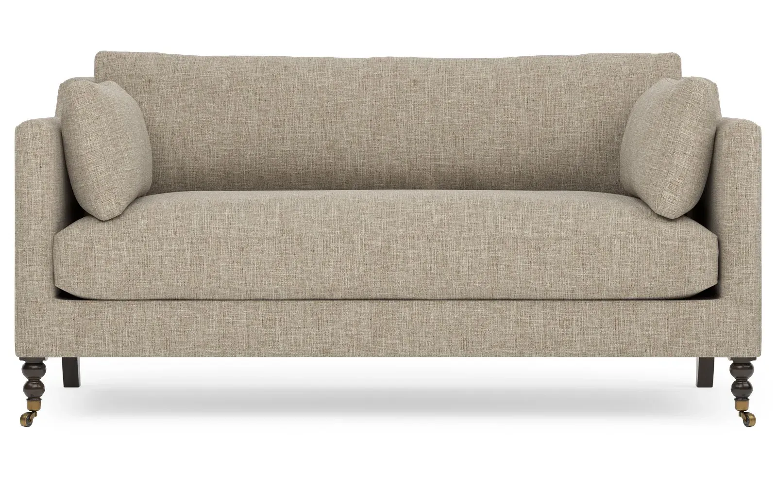 The 71" Madeline loveseat elevates any modern or traditional home. Turned wood legs with brass casters in the front pair beautifully with curved legs in the back, dressing up the silhouette. Soft yet supportive, the seat cushion is designed for supreme comfort, with a foam core surrounded by a blend of fiber, down, and feather fill. A pair of bolster pillows flanks the sophisticated bench seat. Choose from a variety of upholstery options, including linen, velvet, and performance fabrics. <b>Overall Dimensions:</b> 71" W x 40" D x 34" H. <b>Seat Dimensions:</b> 24” D x 21” H; <b>Distance Between Arms:</b> 49”; <b>Arm Height:</b> 29”; <b>Leg Height:</b> 7”. <b>Materials: </b>FSC®-certified, US-sourced, formaldehyde-free, solid kiln-dried hardwood and furniture-grade laminates, metal casters. <b>Material Finishes:</b> Espresso legs, brass casters. <b>Cushion Fill:</b> A CertiPUR-US® certified, high-resiliency foam core wrapped with a super soft foam layer then inserted into a channel-quilted casing filled with a blend of 50% fiber, 5% down, and 45% feather.