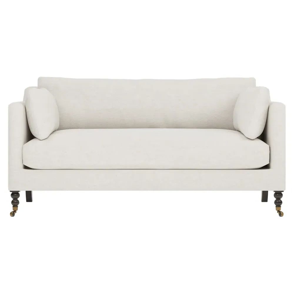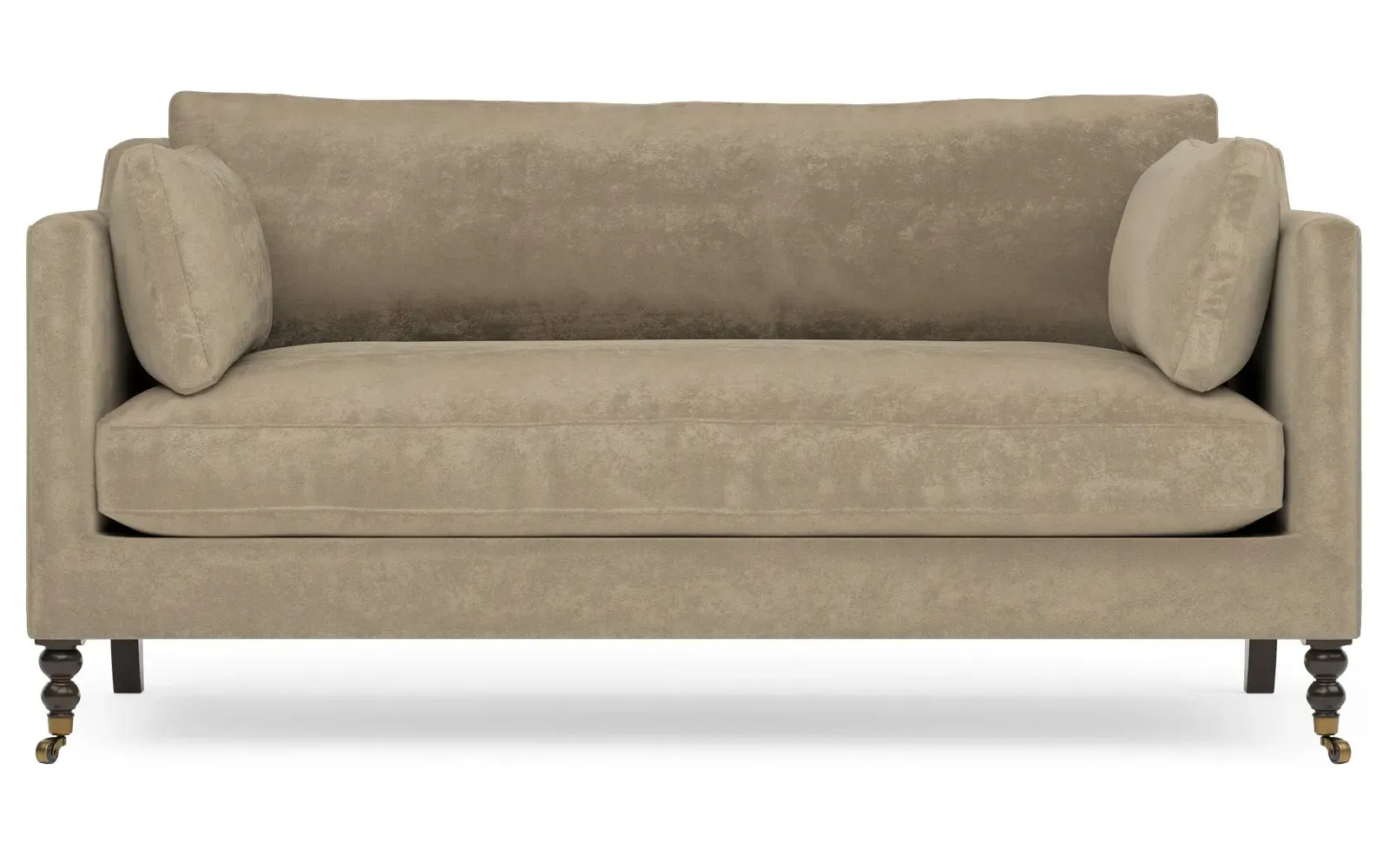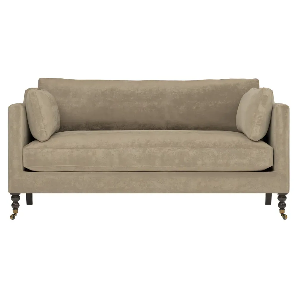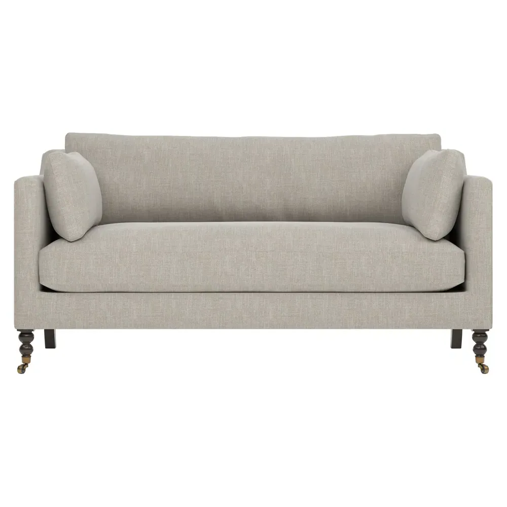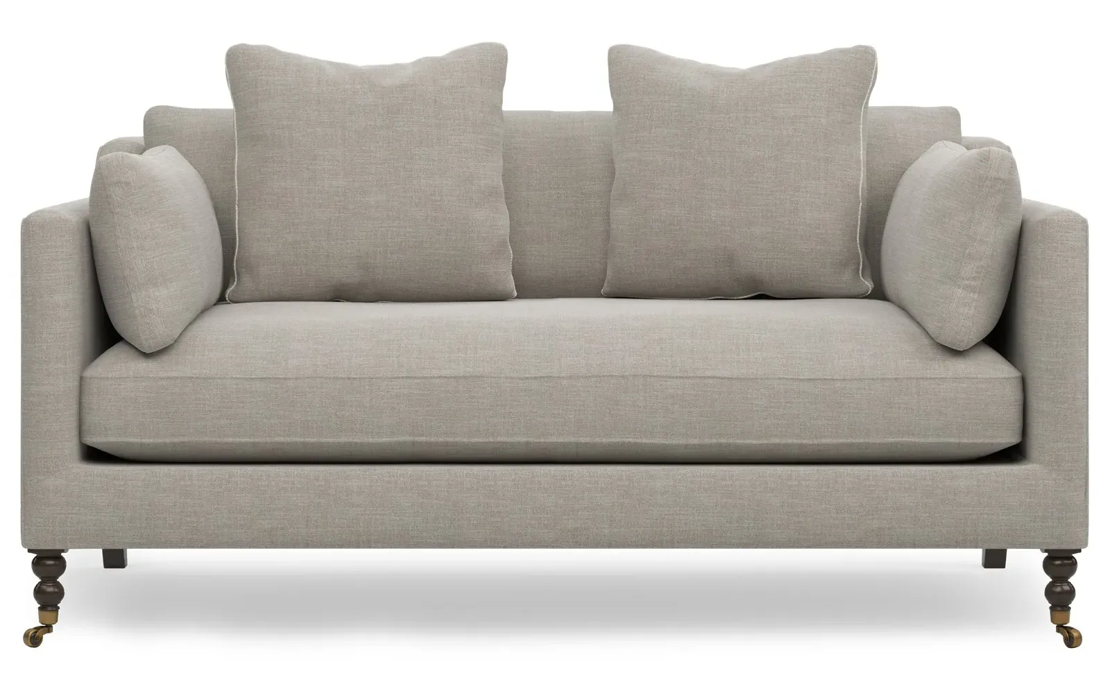 The 71" Madeline loveseat elevates any modern or traditional home. Turned wood legs with brass casters in the front pair beautifully with curved legs in the back, dressing up the silhouette. Soft yet supportive, the seat cushion is designed for supreme comfort, with a foam core surrounded by a blend of fiber, down, and feather fill. A pair of bolster pillows flanks the sophisticated bench seat. Choose from a variety of upholstery options, including linen, velvet, and performance fabrics. <b>Overall Dimensions:</b> 71" W x 40" D x 34" H. <b>Seat Dimensions:</b> 24” D x 21” H; <b>Distance Between Arms:</b> 49”; <b>Arm Height:</b> 29”; <b>Leg Height:</b> 7”. <b>Materials: </b>FSC®-certified, US-sourced, formaldehyde-free, solid kiln-dried hardwood and furniture-grade laminates, metal casters. <b>Material Finishes:</b> Espresso legs, brass casters. <b>Cushion Fill:</b> A CertiPUR-US® certified, high-resiliency foam core wrapped with a super soft foam layer then inserted into a channel-quilted casing filled with a blend of 50% fiber, 5% down, and 45% feather.