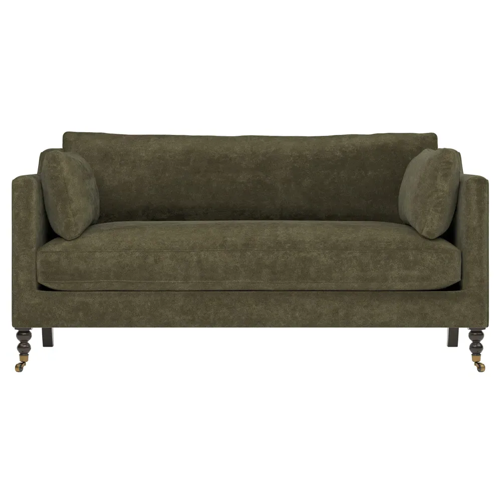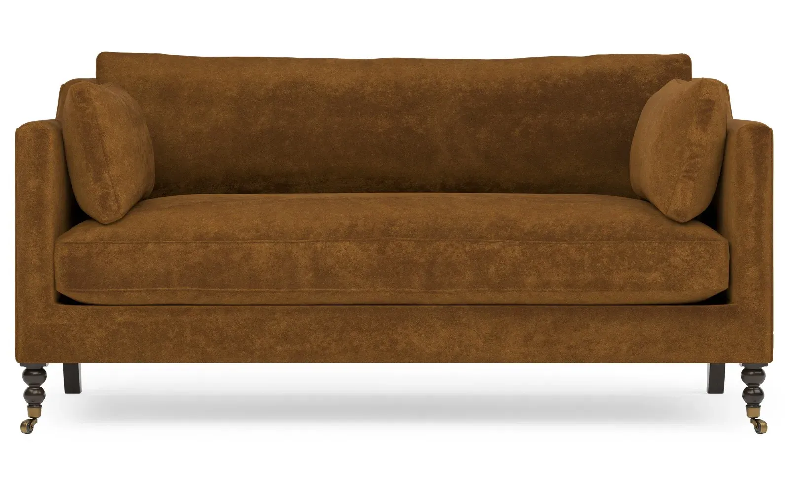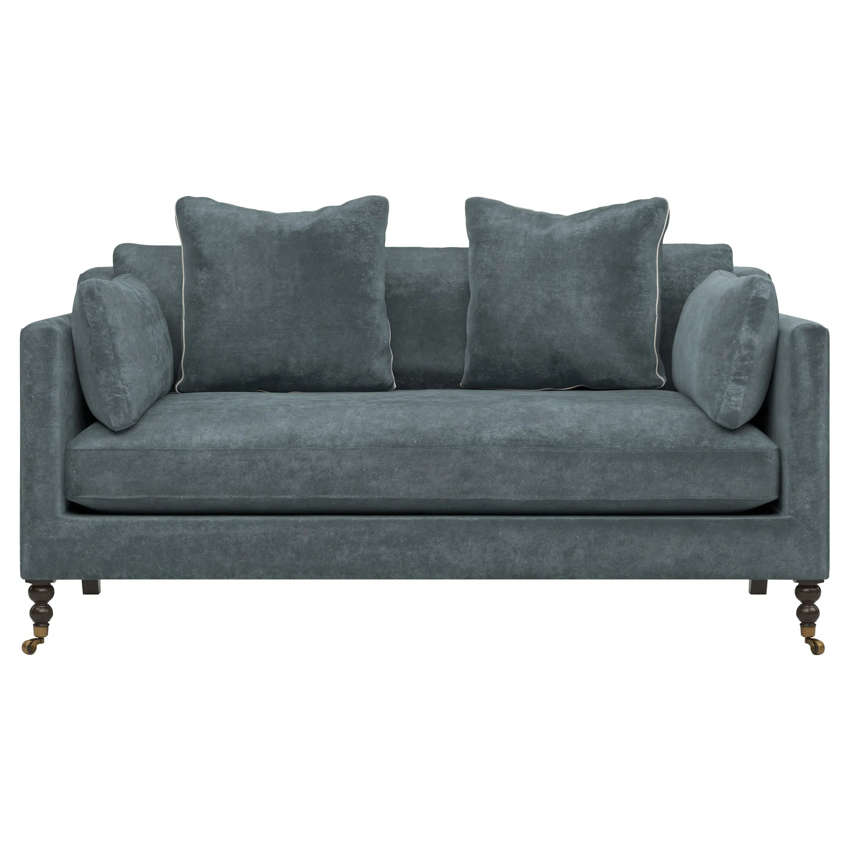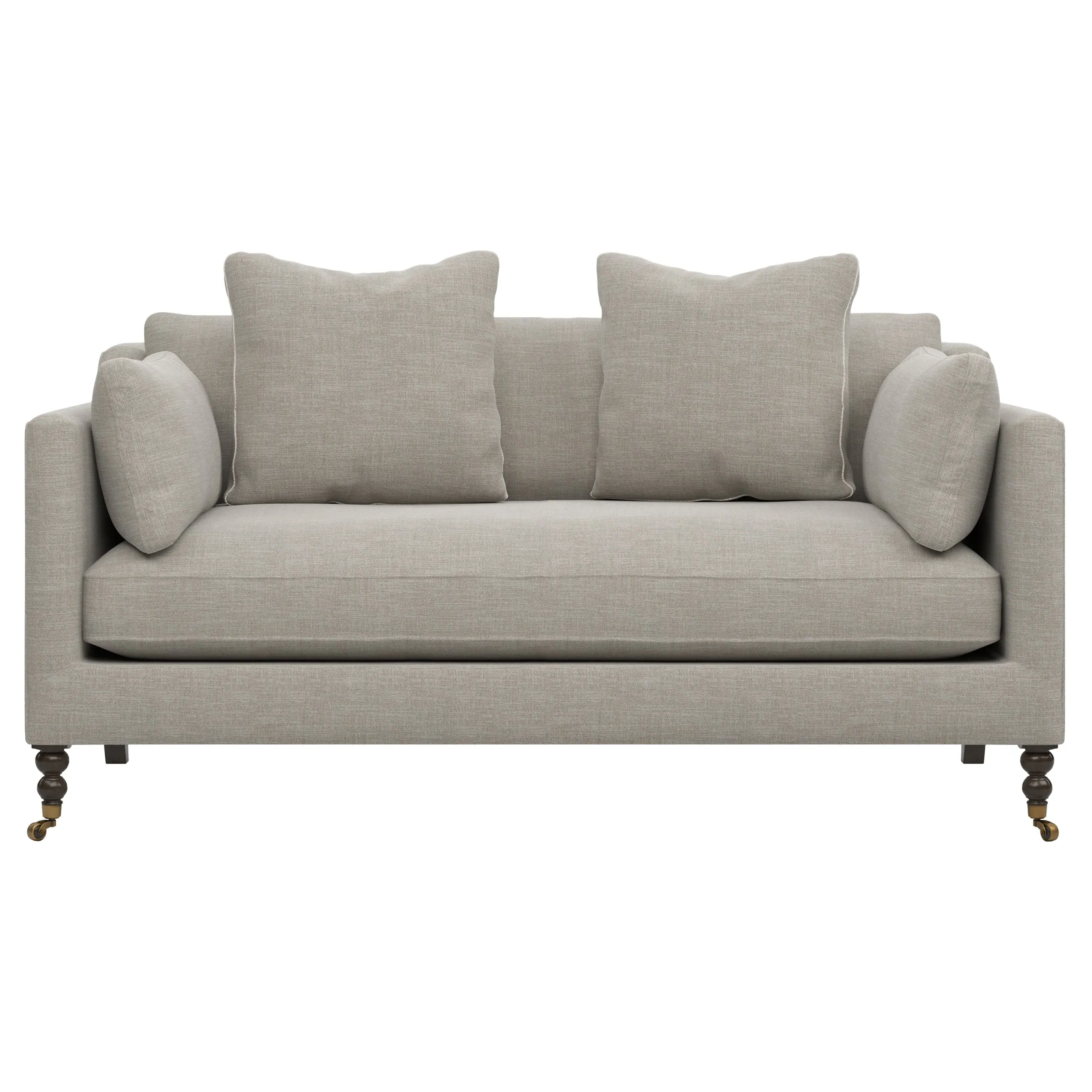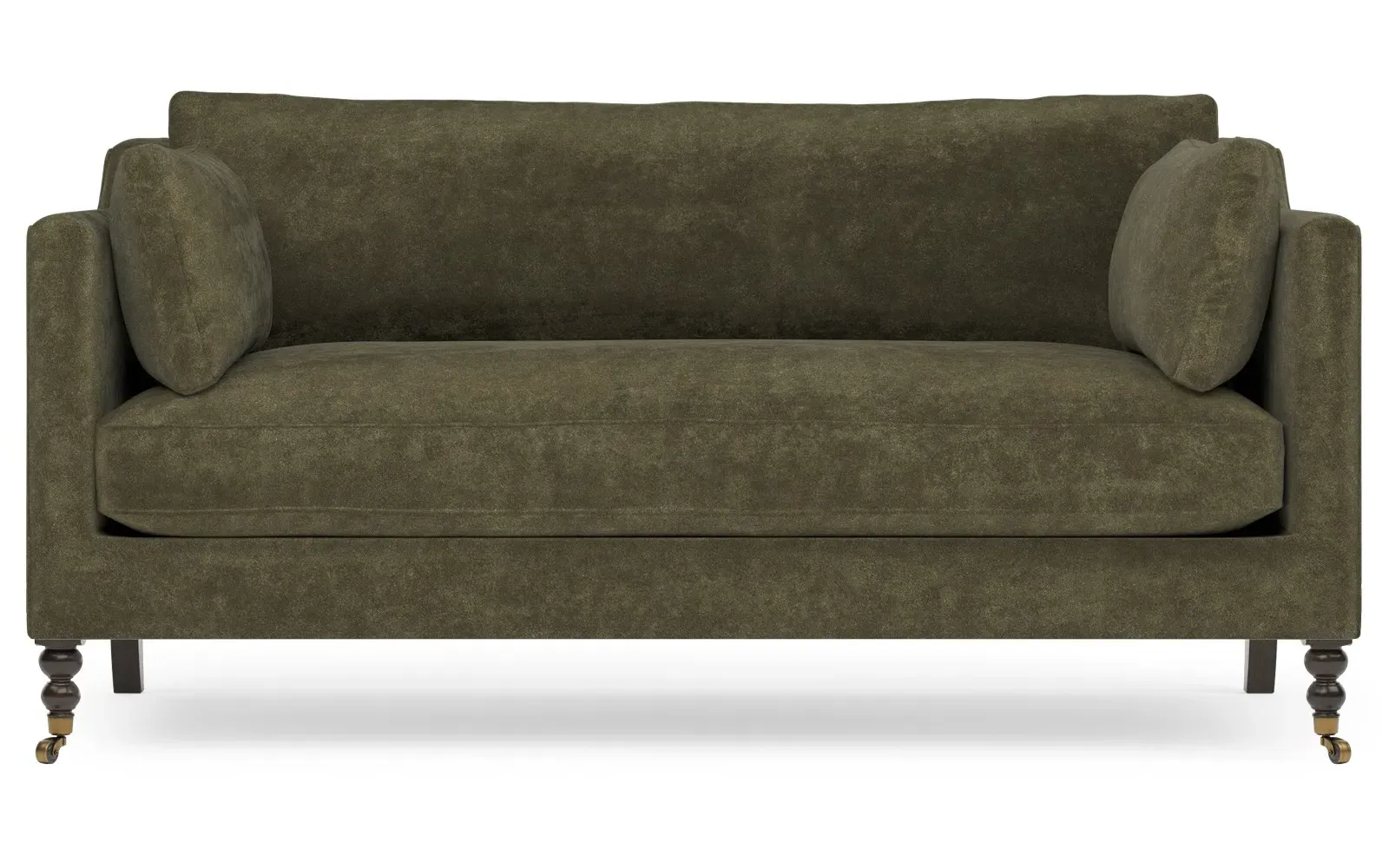 The 71" Madeline loveseat elevates any modern or traditional home. Turned wood legs with brass casters in the front pair beautifully with curved legs in the back, dressing up the silhouette. Soft yet supportive, the seat cushion is designed for supreme comfort, with a foam core surrounded by a blend of fiber, down, and feather fill. A pair of bolster pillows flanks the sophisticated bench seat. Choose from a variety of upholstery options, including linen, velvet, and performance fabrics. <b>Overall Dimensions:</b> 71" W x 40" D x 34" H. <b>Seat Dimensions:</b> 24” D x 21” H; <b>Distance Between Arms:</b> 49”; <b>Arm Height:</b> 29”; <b>Leg Height:</b> 7”. <b>Materials: </b>FSC®-certified, US-sourced, formaldehyde-free, solid kiln-dried hardwood and furniture-grade laminates, metal casters. <b>Material Finishes:</b> Espresso legs, brass casters. <b>Cushion Fill:</b> A CertiPUR-US® certified, high-resiliency foam core wrapped with a super soft foam layer then inserted into a channel-quilted casing filled with a blend of 50% fiber, 5% down, and 45% feather.