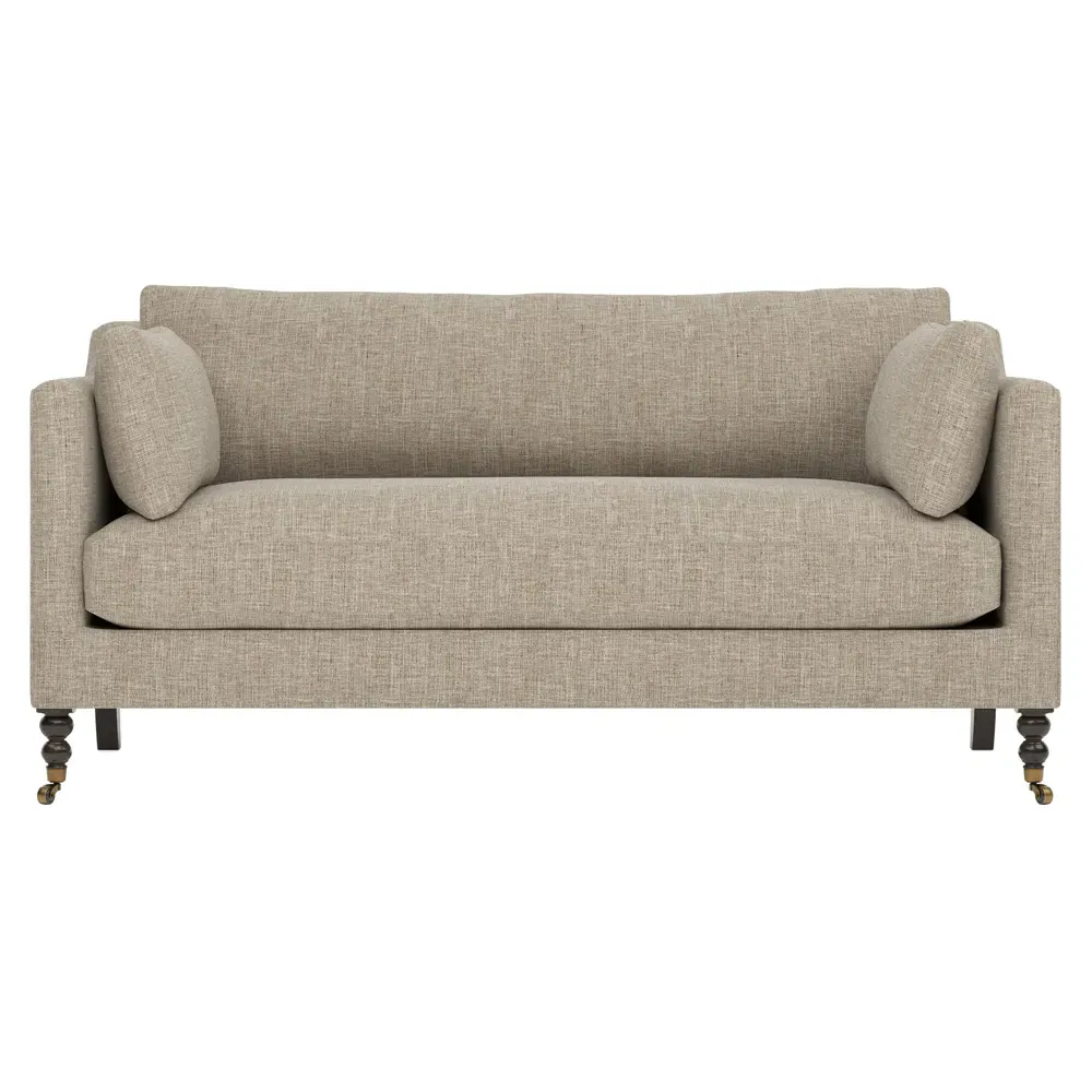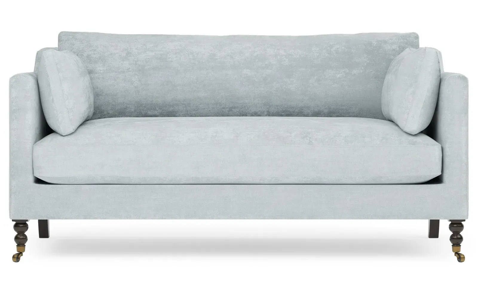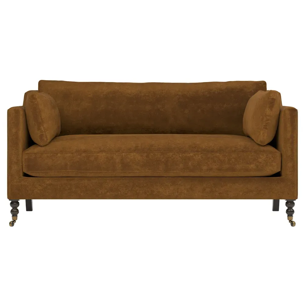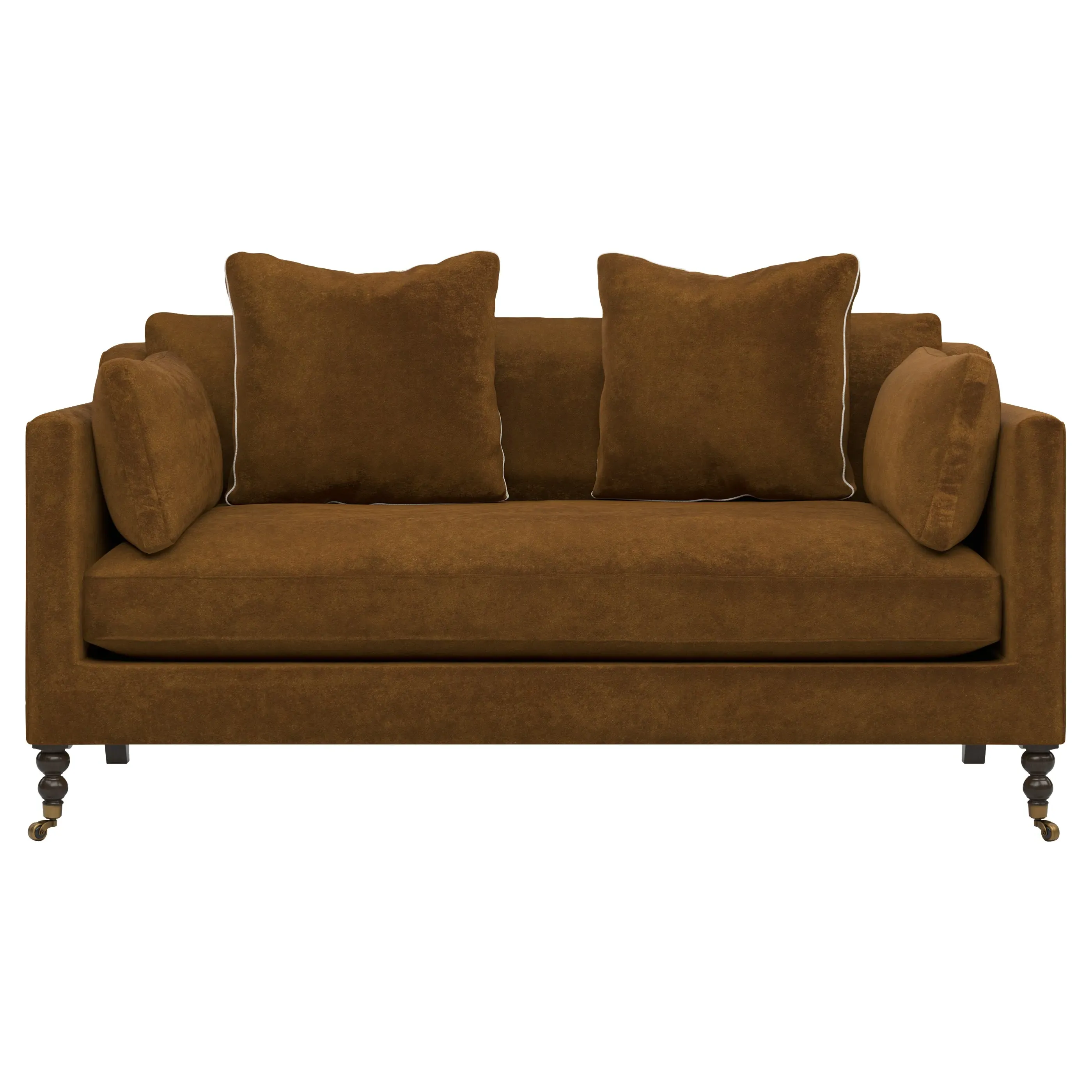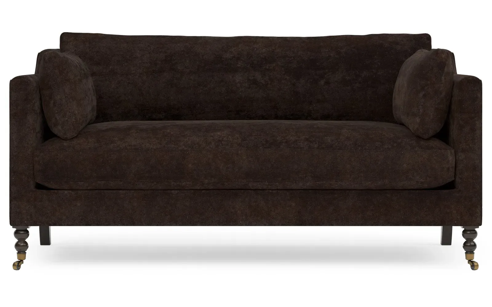 The 71" Madeline loveseat elevates any modern or traditional home. Turned wood legs with brass casters in the front pair beautifully with curved legs in the back, dressing up the silhouette. Soft yet supportive, the seat cushion is designed for supreme comfort, with a foam core surrounded by a blend of fiber, down, and feather fill. A pair of bolster pillows flanks the sophisticated bench seat. Choose from a variety of upholstery options, including linen, velvet, and performance fabrics. <b>Overall Dimensions:</b> 71" W x 40" D x 34" H. <b>Seat Dimensions:</b> 24” D x 21” H; <b>Distance Between Arms:</b> 49”; <b>Arm Height:</b> 29”; <b>Leg Height:</b> 7”. <b>Materials: </b>FSC®-certified, US-sourced, formaldehyde-free, solid kiln-dried hardwood and furniture-grade laminates, metal casters. <b>Material Finishes:</b> Espresso legs, brass casters. <b>Cushion Fill:</b> A CertiPUR-US® certified, high-resiliency foam core wrapped with a super soft foam layer then inserted into a channel-quilted casing filled with a blend of 50% fiber, 5% down, and 45% feather.