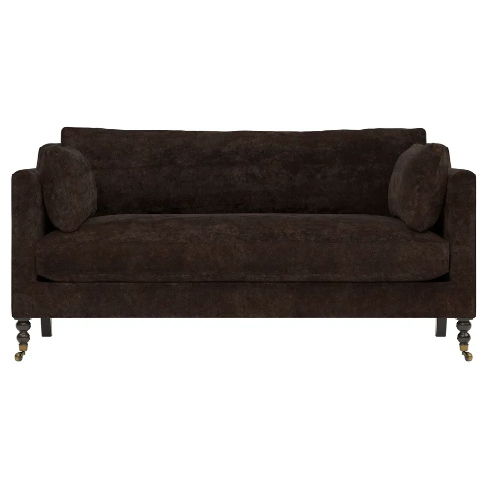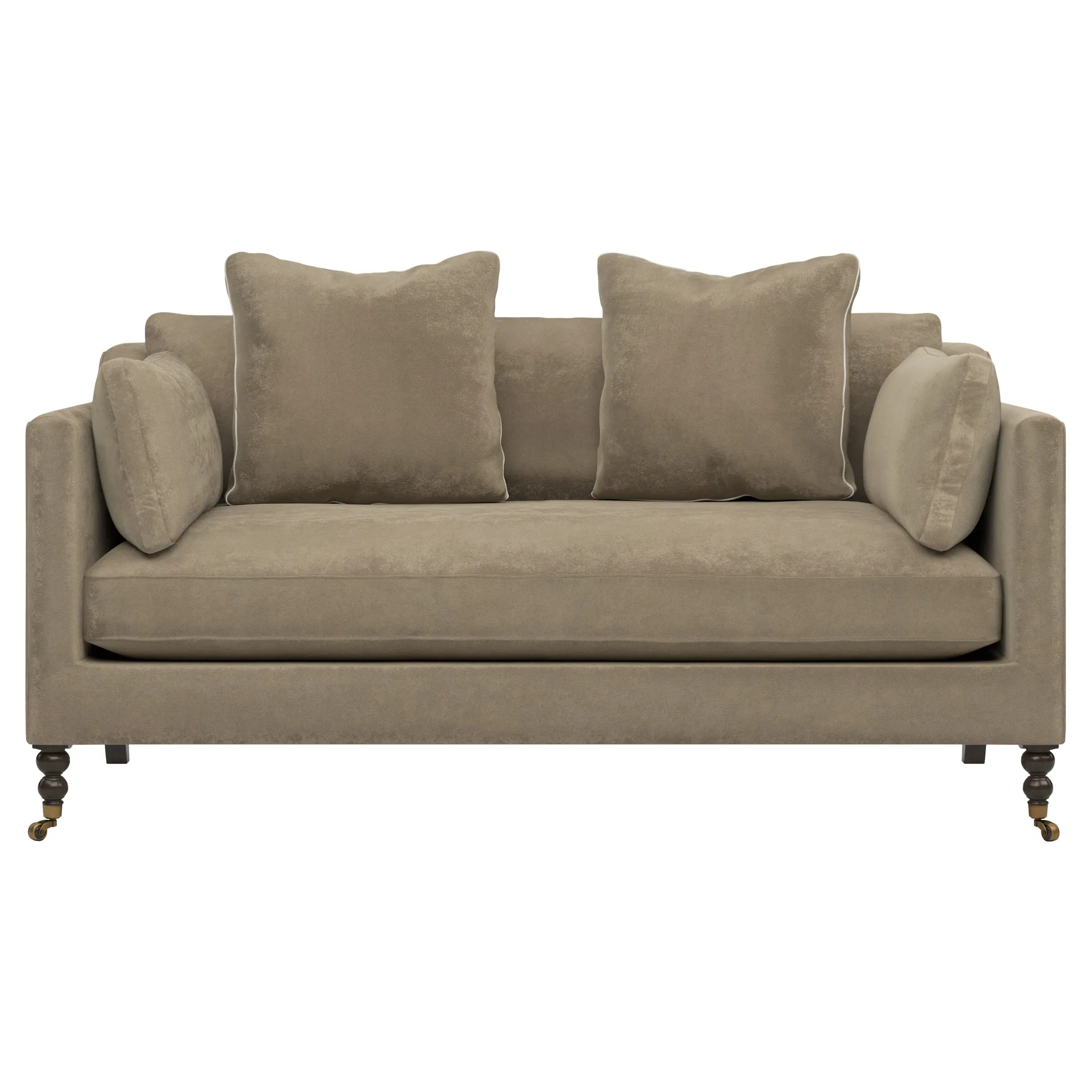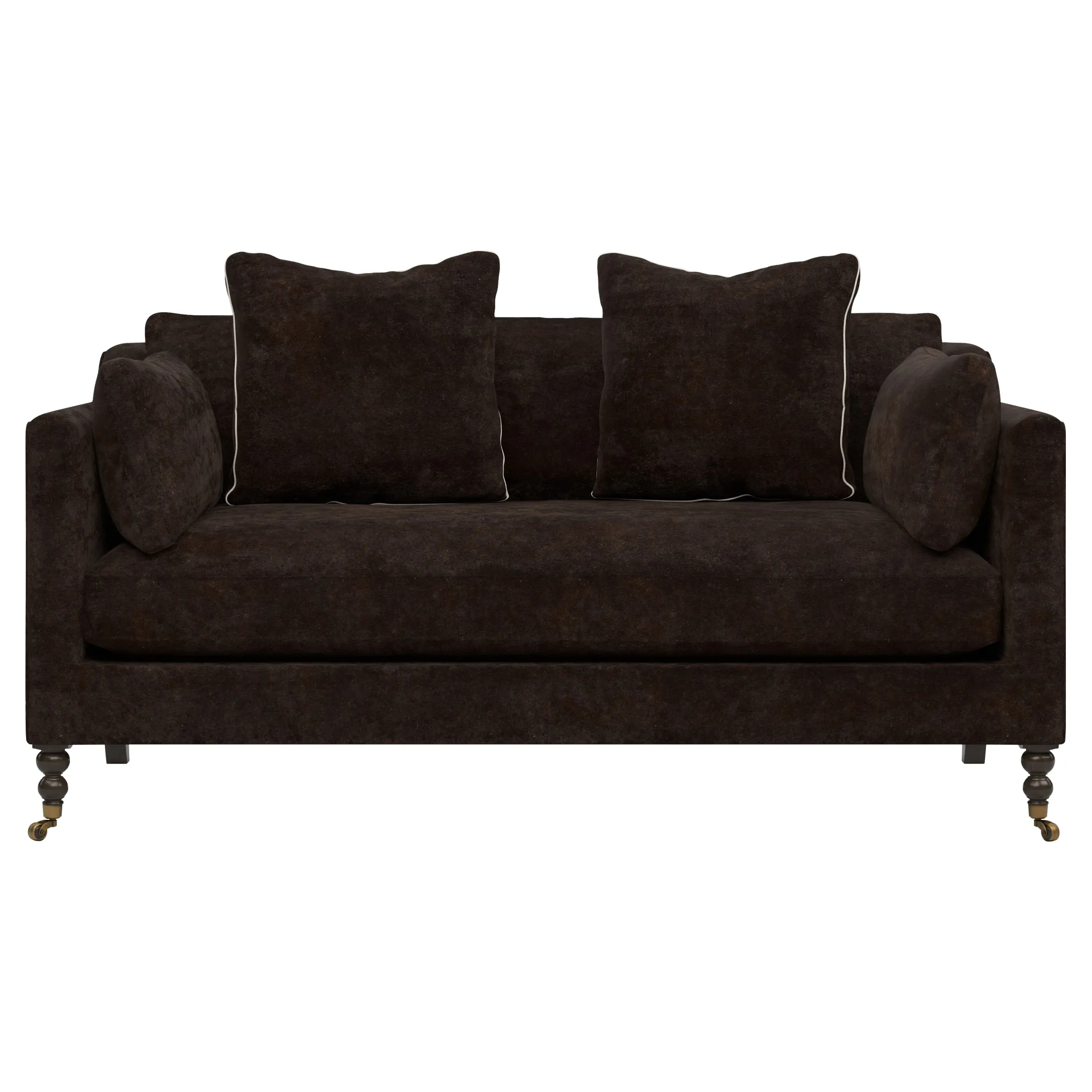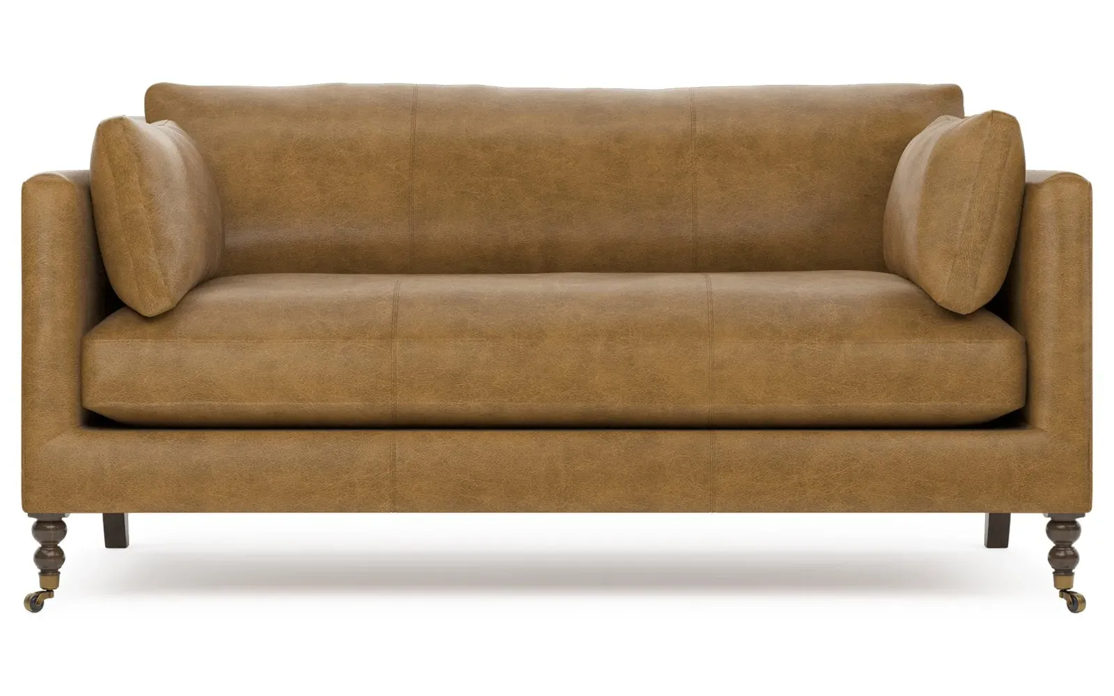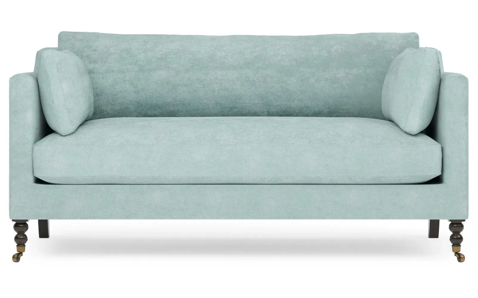The 71" Madeline loveseat elevates any modern or traditional home. Turned wood legs with brass casters in the front pair beautifully with curved legs in the back, dressing up the silhouette. Soft yet supportive, the seat cushion is designed for supreme comfort, with a foam core surrounded by a blend of fiber, down, and feather fill. A pair of bolster pillows flanks the sophisticated bench seat. Choose from a variety of upholstery options, including linen, velvet, and performance fabrics. <b>Overall Dimensions:</b> 71" W x 40" D x 34" H. <b>Seat Dimensions:</b> 24” D x 21” H; <b>Distance Between Arms:</b> 49”; <b>Arm Height:</b> 29”; <b>Leg Height:</b> 7”. <b>Materials: </b>FSC®-certified, US-sourced, formaldehyde-free, solid kiln-dried hardwood and furniture-grade laminates, metal casters. <b>Material Finishes:</b> Espresso legs, brass casters. <b>Cushion Fill:</b> A CertiPUR-US® certified, high-resiliency foam core wrapped with a super soft foam layer then inserted into a channel-quilted casing filled with a blend of 50% fiber, 5% down, and 45% feather.