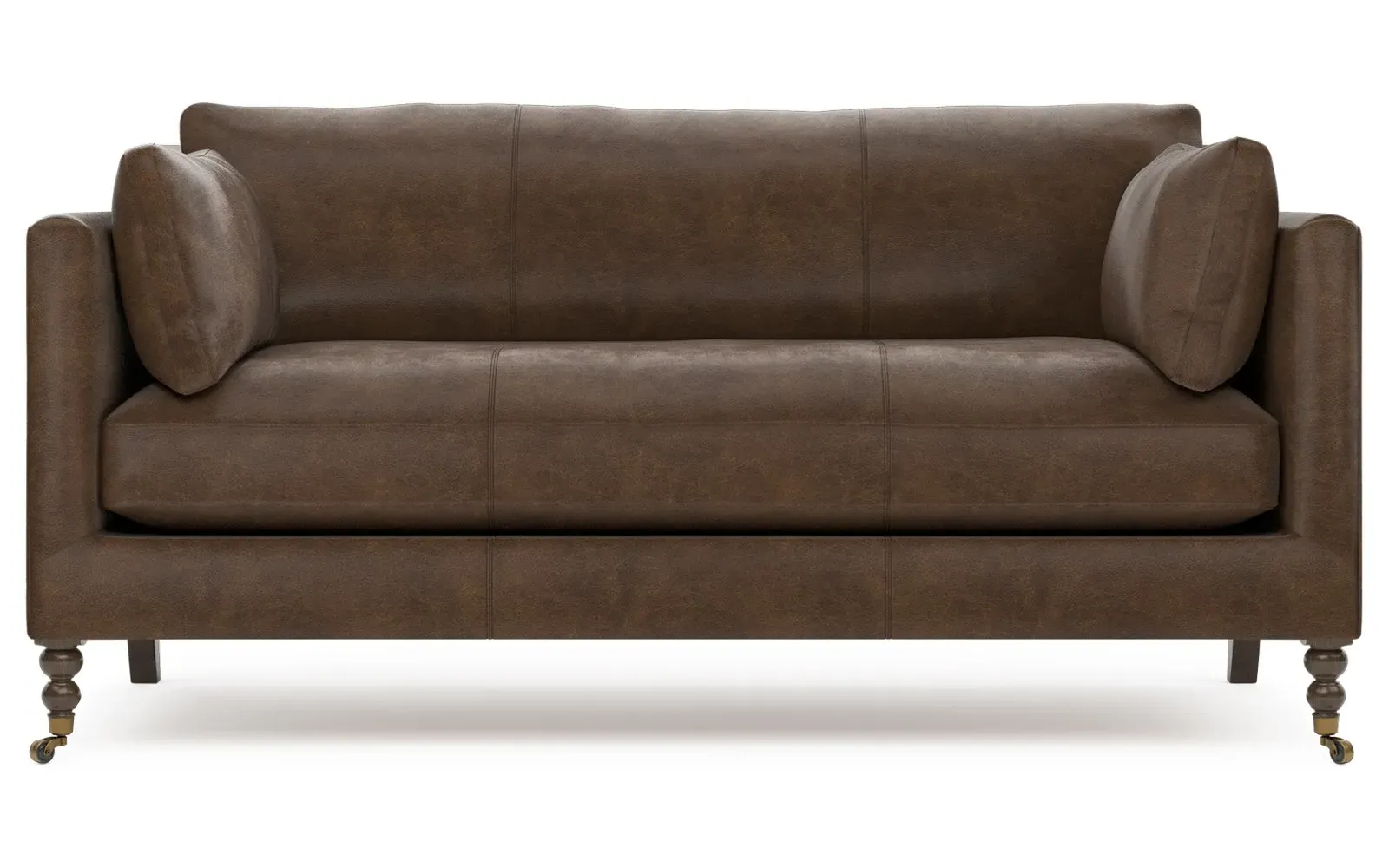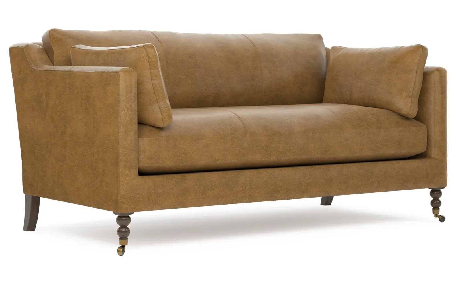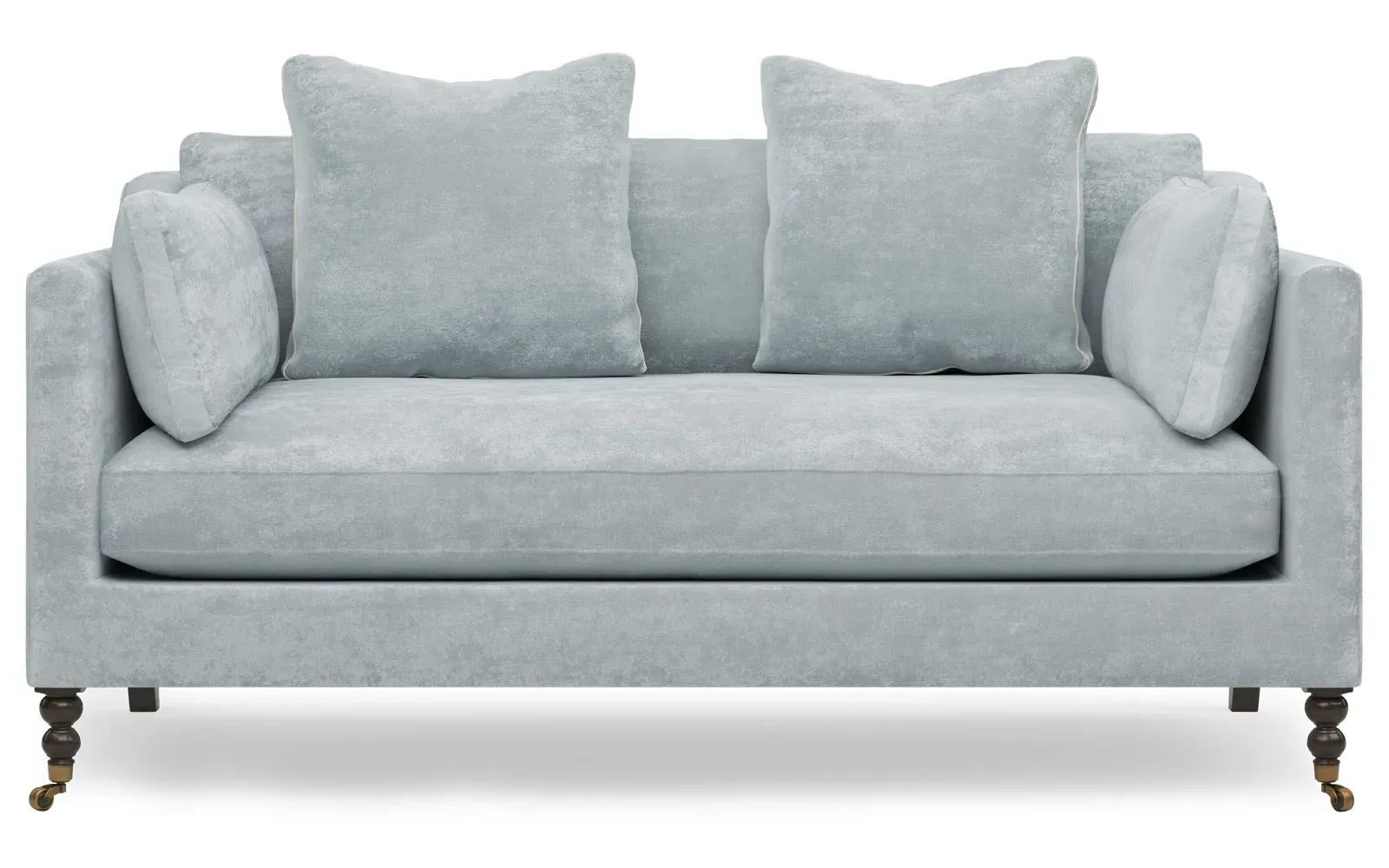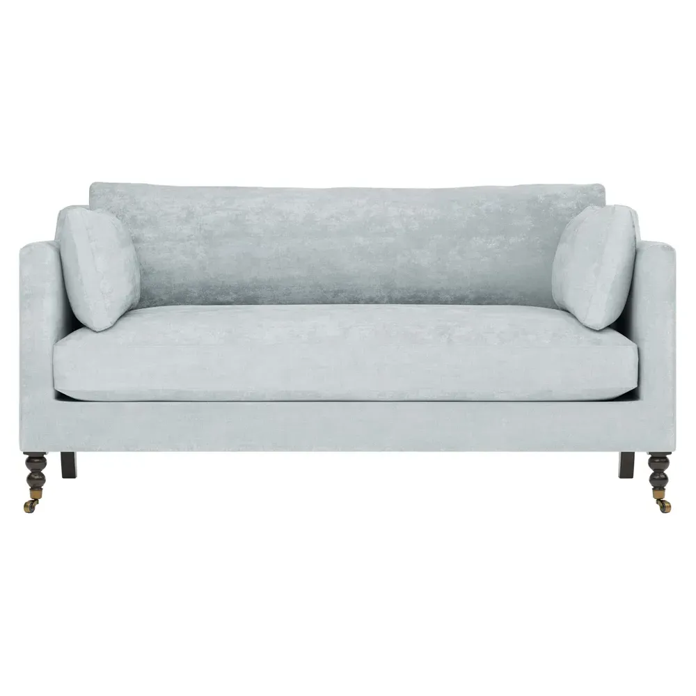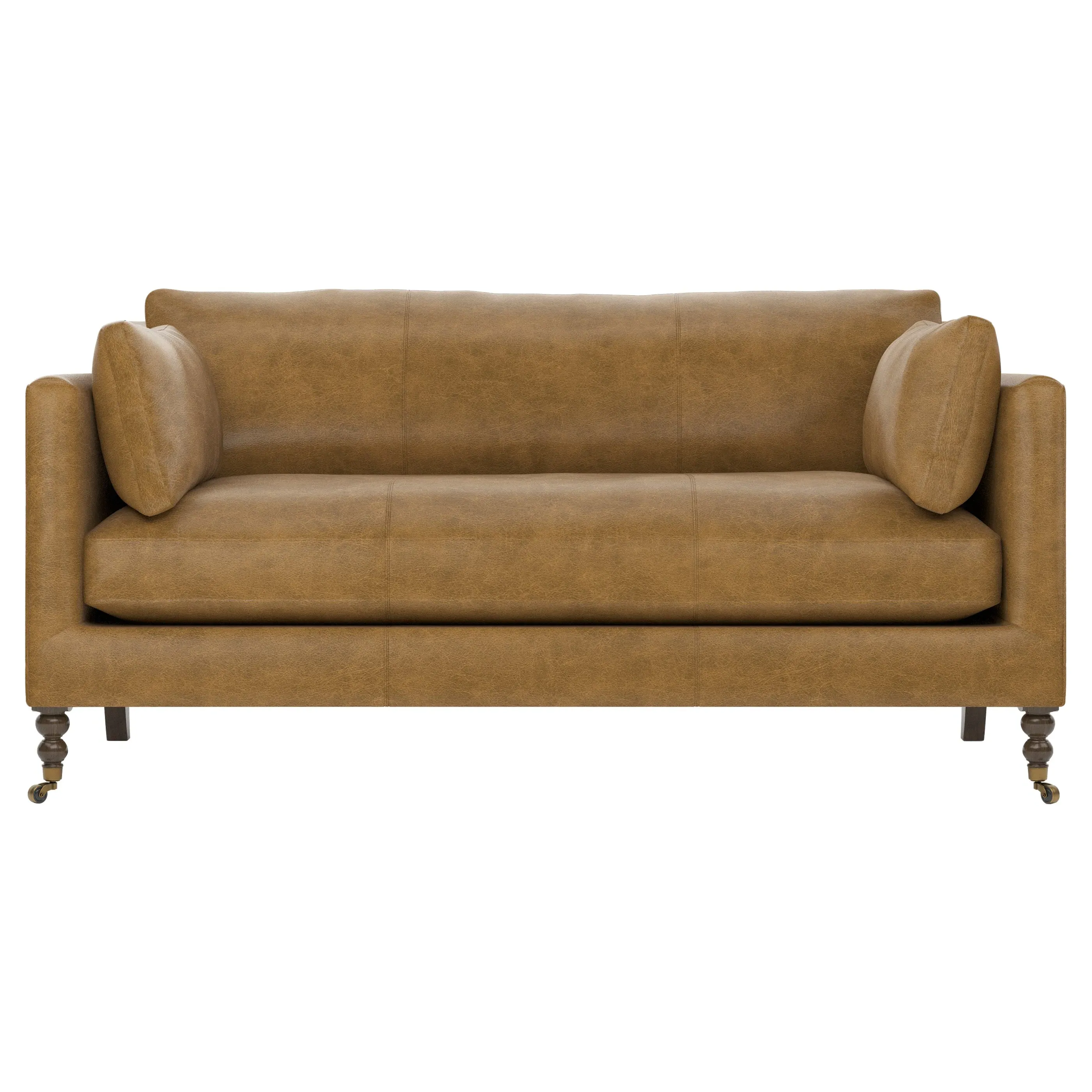 The 71" Madeline loveseat elevates any modern or traditional home. Turned wood legs with brass casters in the front pair beautifully with curved legs in the back, dressing up the silhouette. Soft yet supportive, the seat cushion is designed for supreme comfort, with a foam core surrounded by a blend of fiber, down, and feather fill. A pair of bolster pillows flanks the sophisticated bench seat. Choose from a variety of upholstery options, including linen, velvet, and performance fabrics. <b>Overall Dimensions:</b> 71" W x 40" D x 34" H. <b>Seat Dimensions:</b> 24” D x 21” H; <b>Distance Between Arms:</b> 49”; <b>Arm Height:</b> 29”; <b>Leg Height:</b> 7”. <b>Materials: </b>FSC®-certified, US-sourced, formaldehyde-free, solid kiln-dried hardwood and furniture-grade laminates, metal casters. <b>Material Finishes:</b> Espresso legs, brass casters. <b>Cushion Fill:</b> A CertiPUR-US® certified, high-resiliency foam core wrapped with a super soft foam layer then inserted into a channel-quilted casing filled with a blend of 50% fiber, 5% down, and 45% feather.