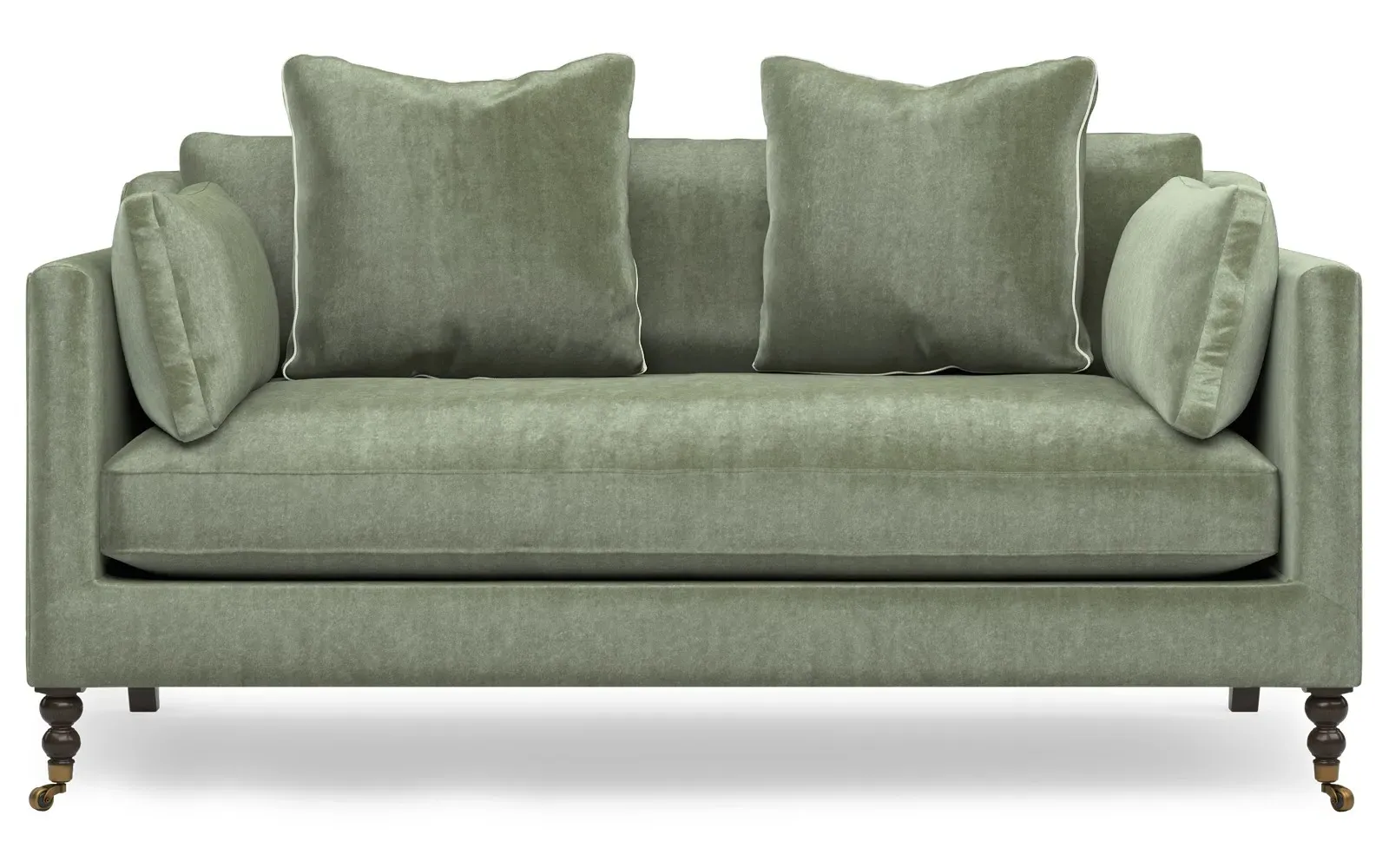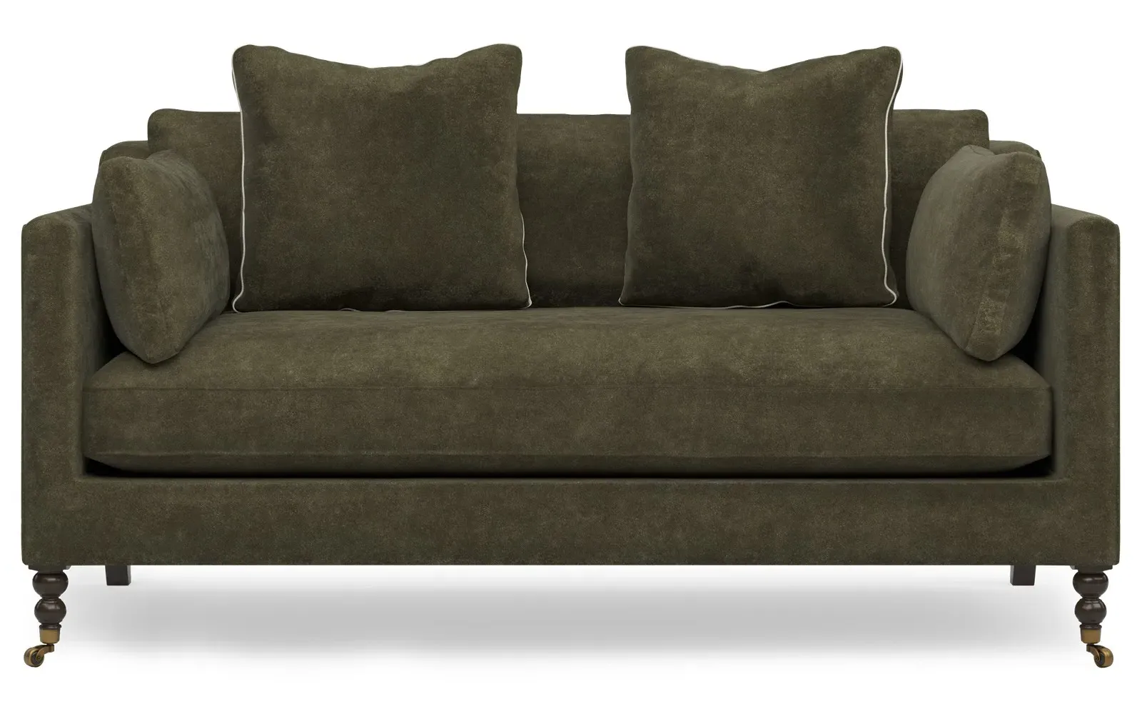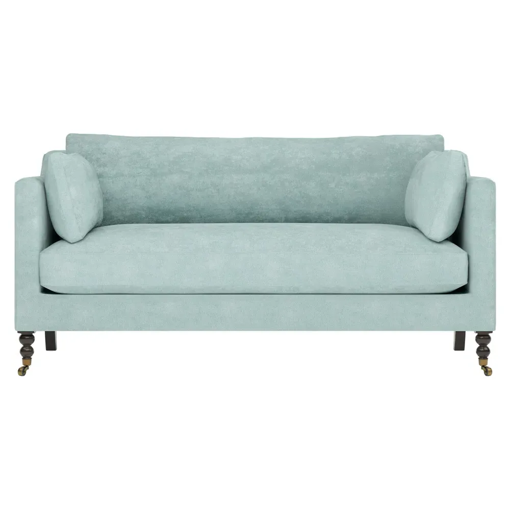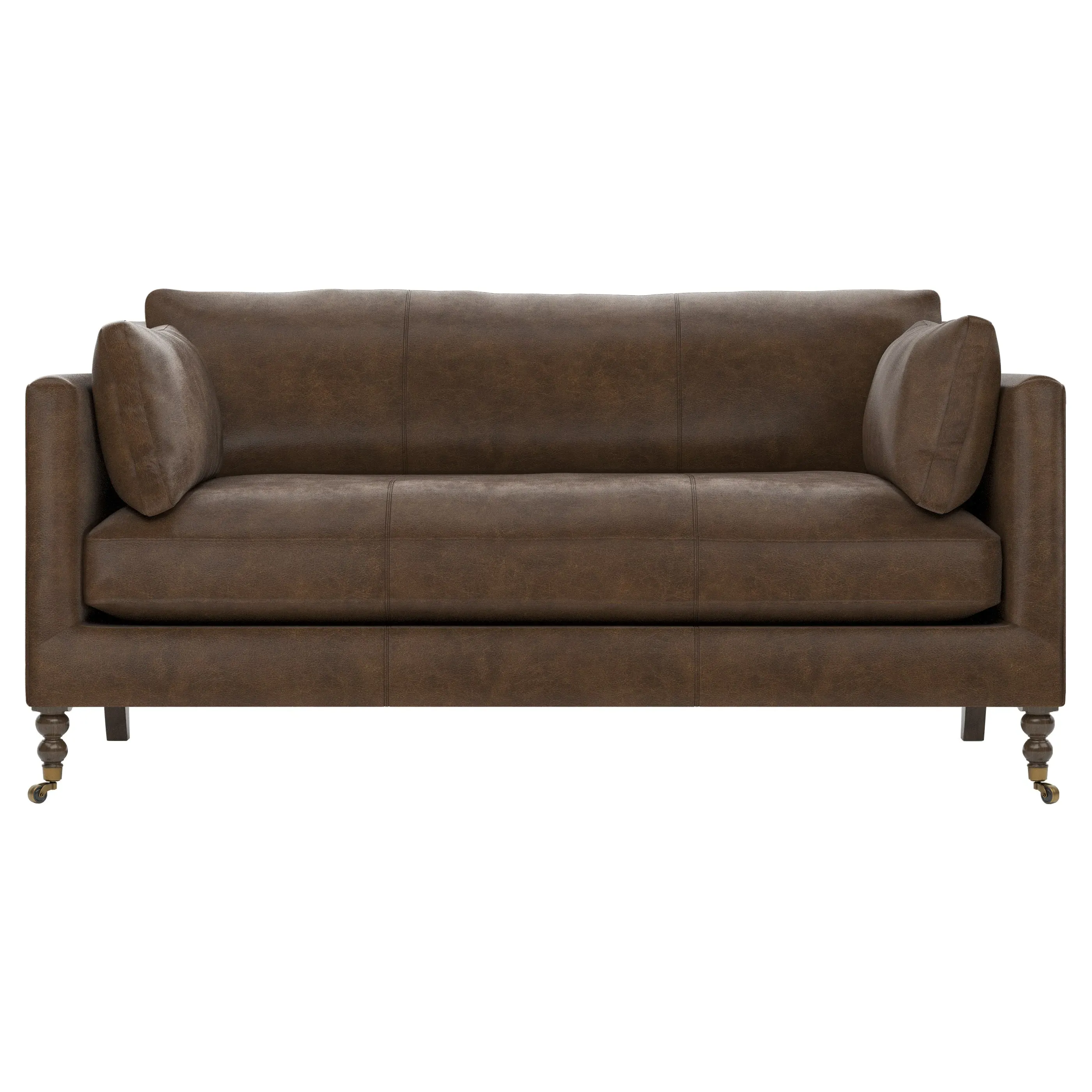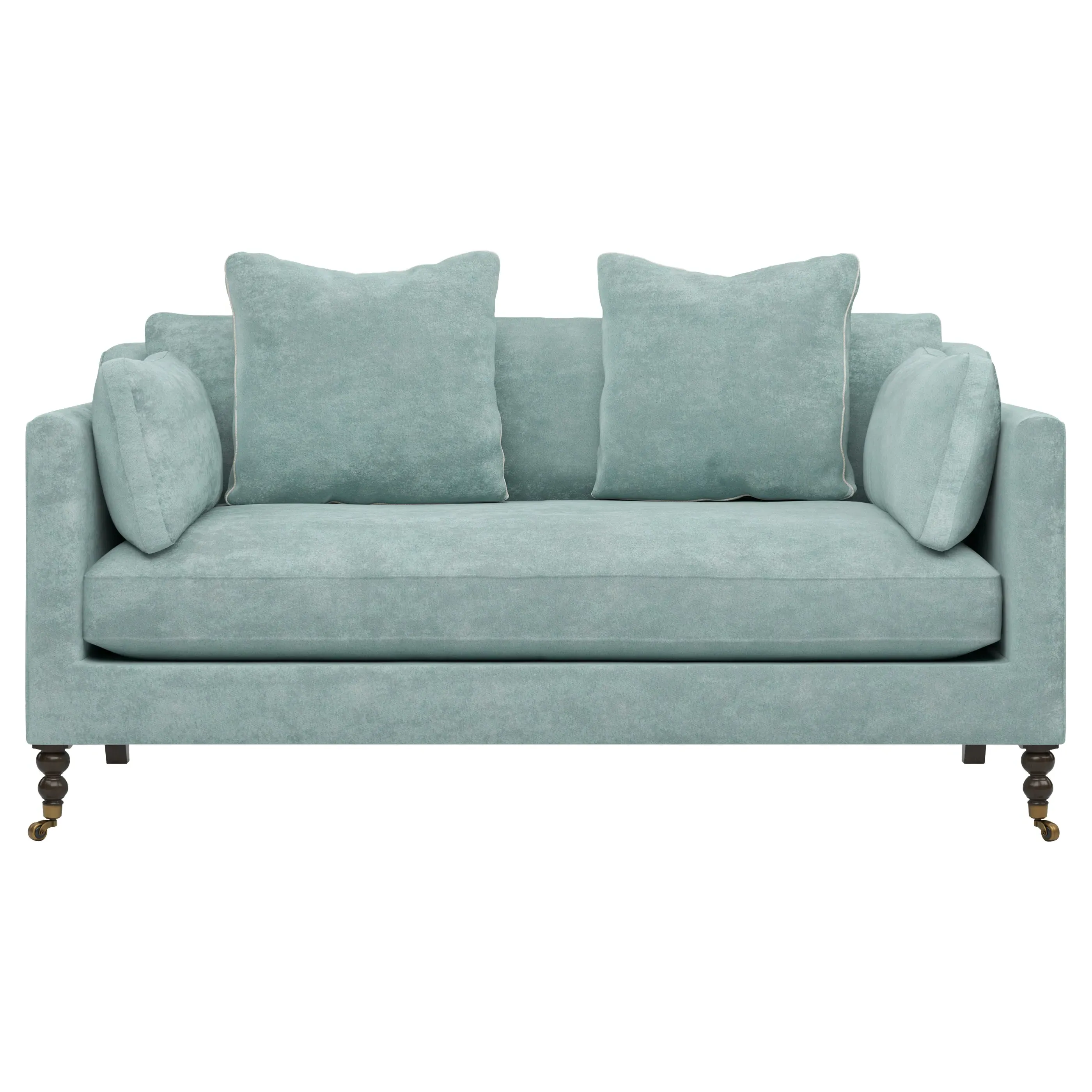 The 71" Madeline loveseat elevates any modern or traditional home. Turned wood legs with brass casters in the front pair beautifully with curved legs in the back, dressing up the silhouette. Soft yet supportive, the seat cushion is designed for supreme comfort, with a foam core surrounded by a blend of fiber, down, and feather fill. A pair of bolster pillows flanks the sophisticated bench seat. Choose from a variety of upholstery options, including linen, velvet, and performance fabrics. <b>Overall Dimensions:</b> 71" W x 40" D x 34" H. <b>Seat Dimensions:</b> 24” D x 21” H; <b>Distance Between Arms:</b> 49”; <b>Arm Height:</b> 29”; <b>Leg Height:</b> 7”. <b>Materials: </b>FSC®-certified, US-sourced, formaldehyde-free, solid kiln-dried hardwood and furniture-grade laminates, metal casters. <b>Material Finishes:</b> Espresso legs, brass casters. <b>Cushion Fill:</b> A CertiPUR-US® certified, high-resiliency foam core wrapped with a super soft foam layer then inserted into a channel-quilted casing filled with a blend of 50% fiber, 5% down, and 45% feather.